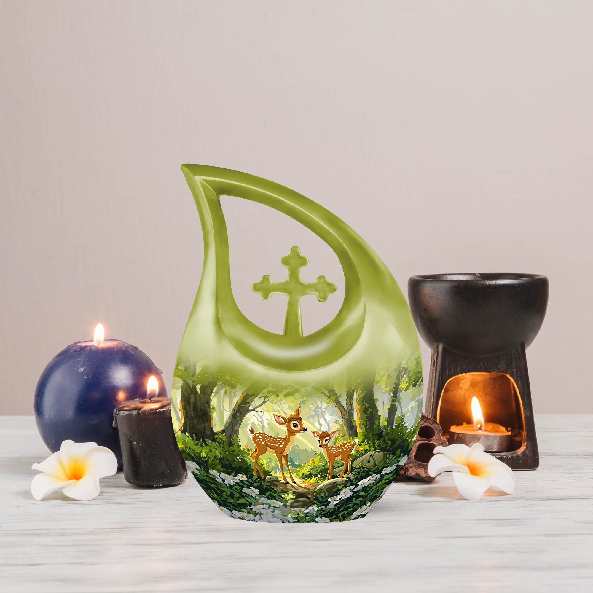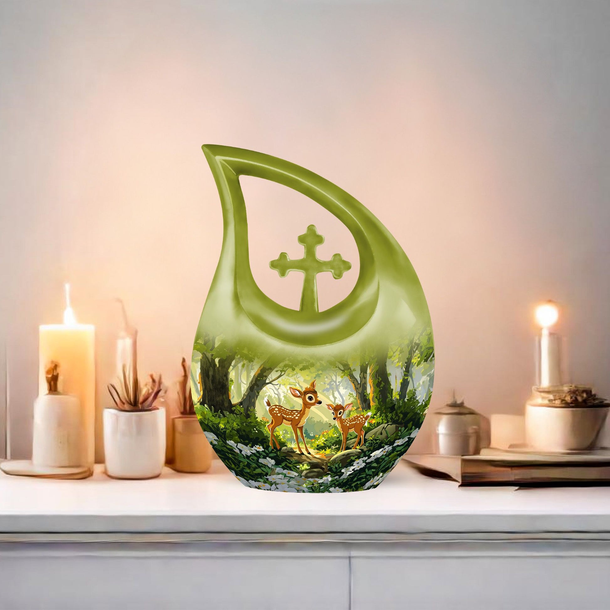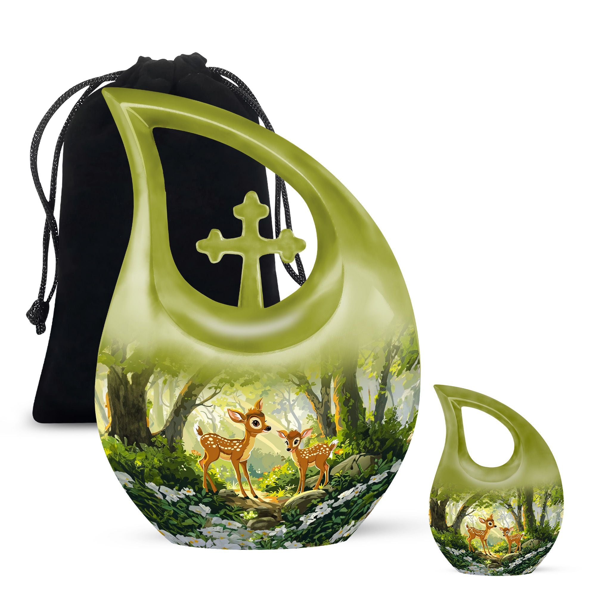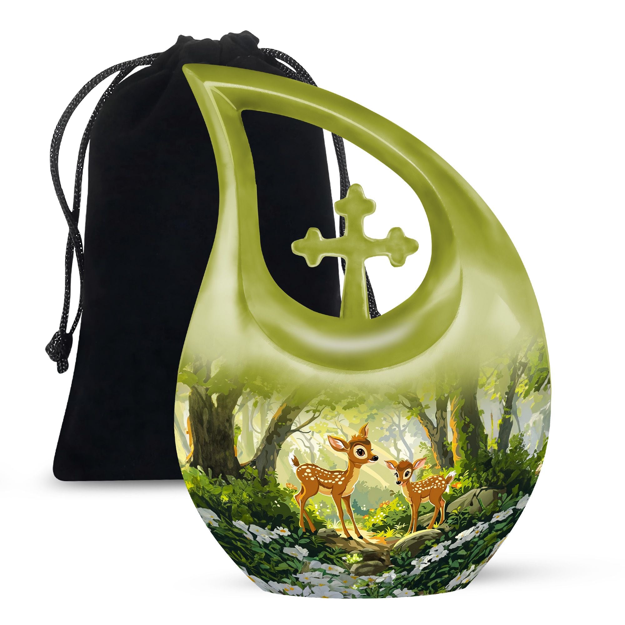 Cherish the memory of your loved ones with our Deer Urn, a unique piece from our collection of Extra Large Urns. This elegantly designed urn is crafted from high-quality Aluminium and features a Cross Drop motif to add a distinctive touch. With dimensions of 10 inches in height and a weight of 3.3 pounds, this remarkable urn has an ample capacity of 200 cubic inches. It comes with a soft velvet pouch for secure containment of ashes. Our Deer Urn not only serves as a resting place for your beloved but also as an ethereal piece reflecting reverence and remembrance. This sizeable urn can be personalized with engraved names, making it more meaningful. The Deer Theme creates a serene ambience that resonates with the tranquility of nature. Our assortment of Memorial Urns For Human Ashes, Customized Urns For Ashes For Adults, Personal Urns, and Unique Urns For Dad are diligently designed to respect your sentiments and honor the lives of those profoundly missed. Note: The product's design and size make it a fitting tribute for adults and seniors.