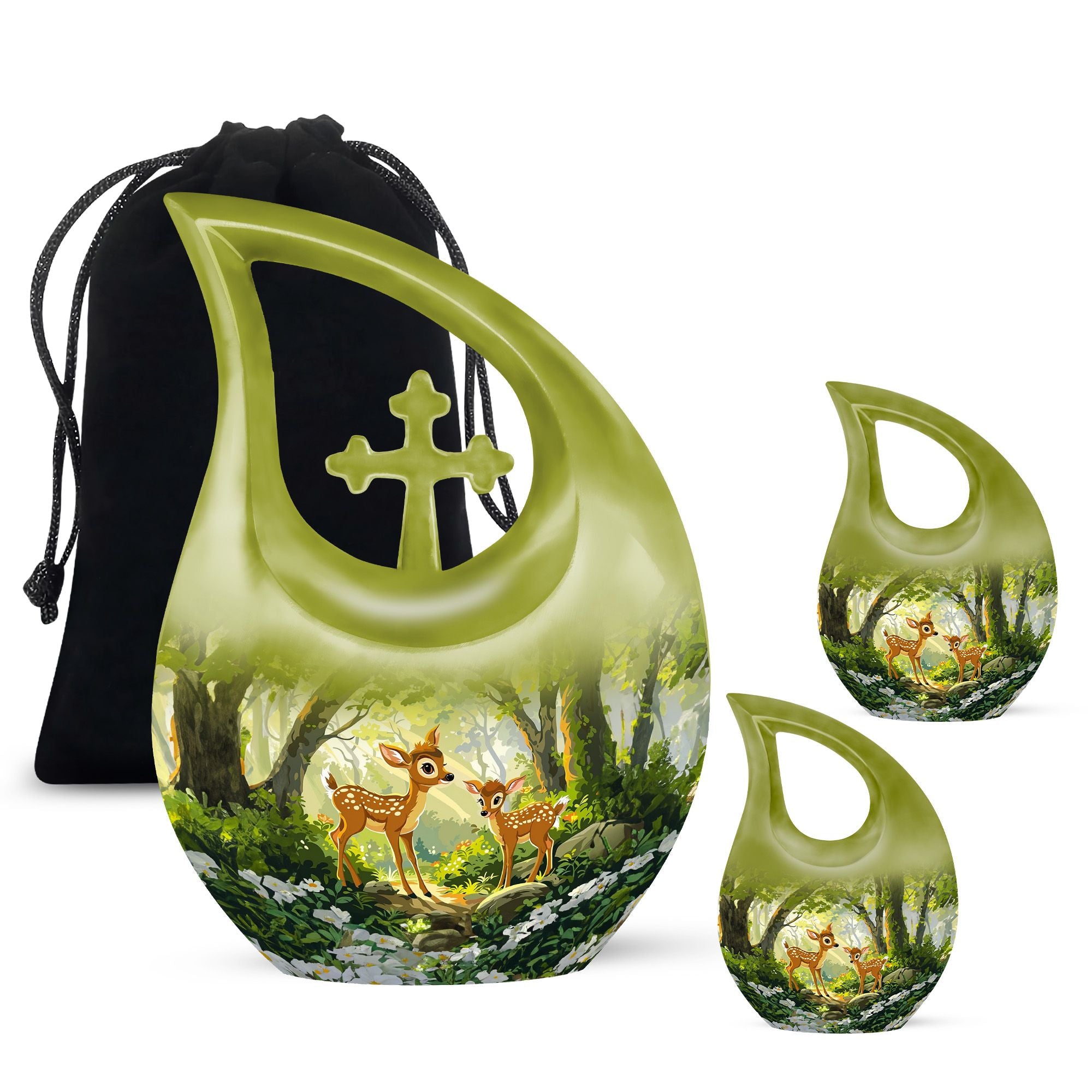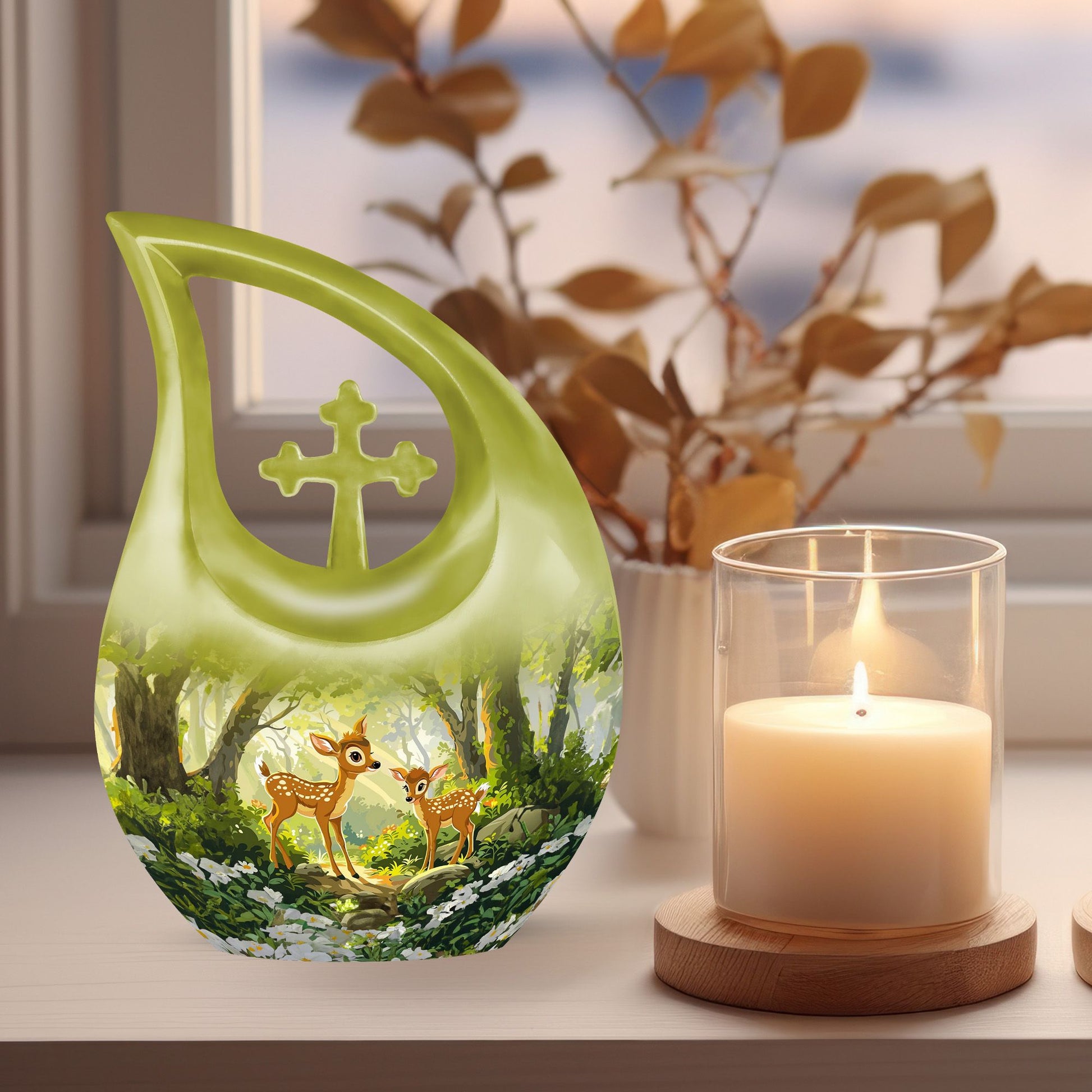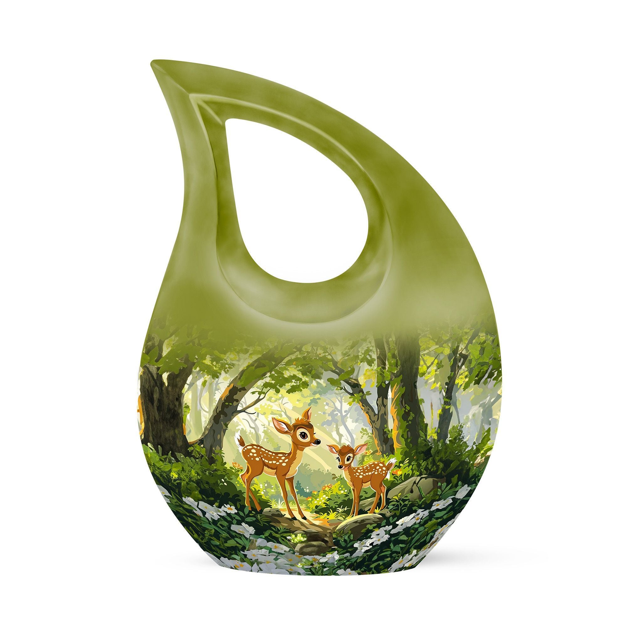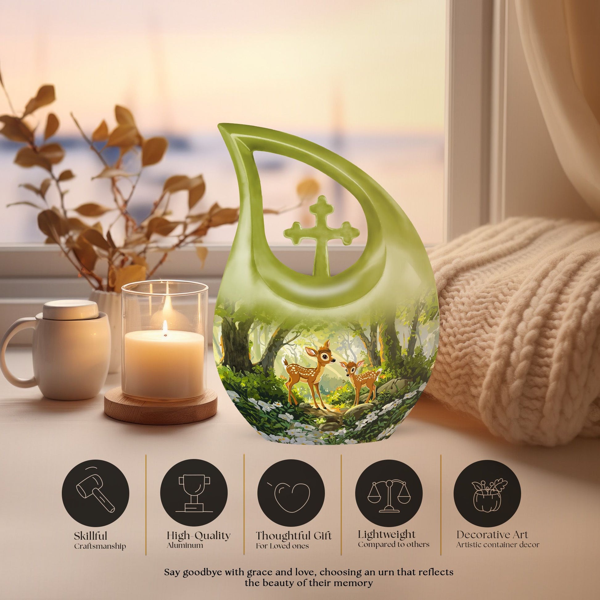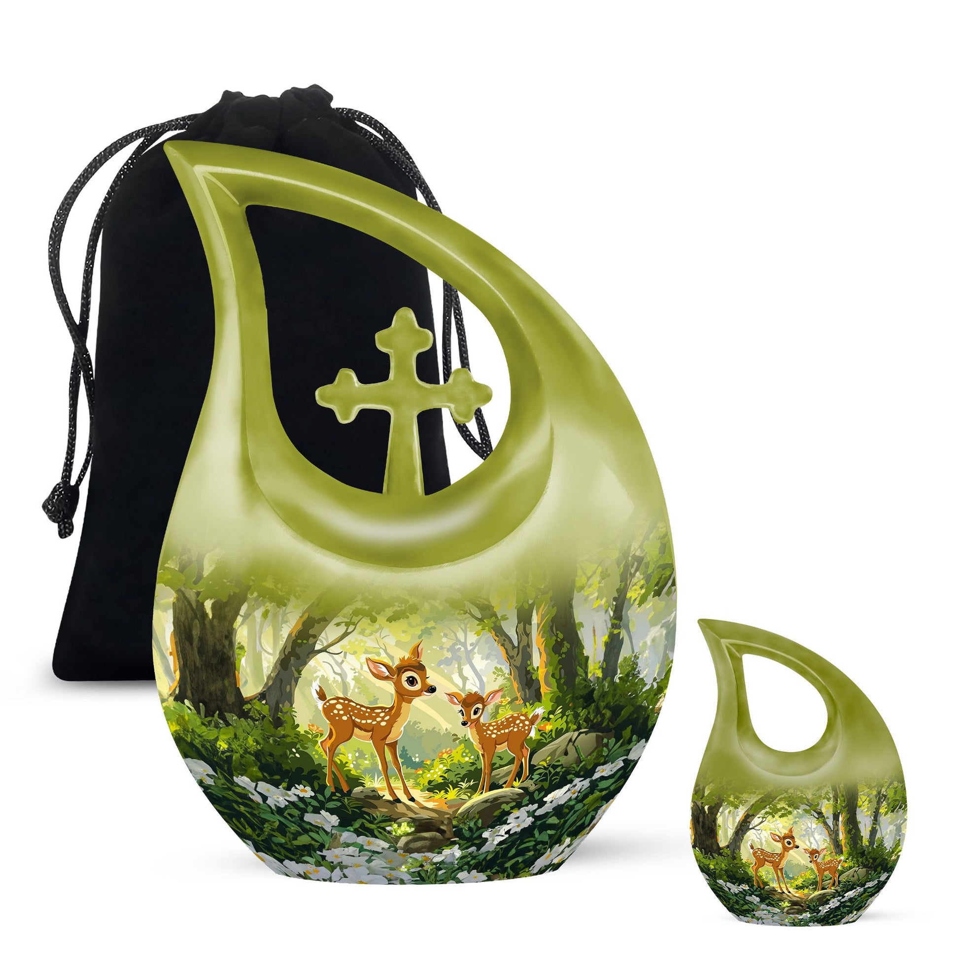Cherish the memory of your loved ones with our Deer Urn, a unique piece from our collection of Extra Large Urns. This elegantly designed urn is crafted from high-quality Aluminium and features a Cross Drop motif to add a distinctive touch. With dimensions of 10 inches in height and a weight of 3.3 pounds, this remarkable urn has an ample capacity of 200 cubic inches. It comes with a soft velvet pouch for secure containment of ashes. Our Deer Urn not only serves as a resting place for your beloved but also as an ethereal piece reflecting reverence and remembrance. This sizeable urn can be personalized with engraved names, making it more meaningful. The Deer Theme creates a serene ambience that resonates with the tranquility of nature. Our assortment of Memorial Urns For Human Ashes, Customized Urns For Ashes For Adults, Personal Urns, and Unique Urns For Dad are diligently designed to respect your sentiments and honor the lives of those profoundly missed. Note: The product's design and size make it a fitting tribute for adults and seniors.