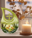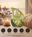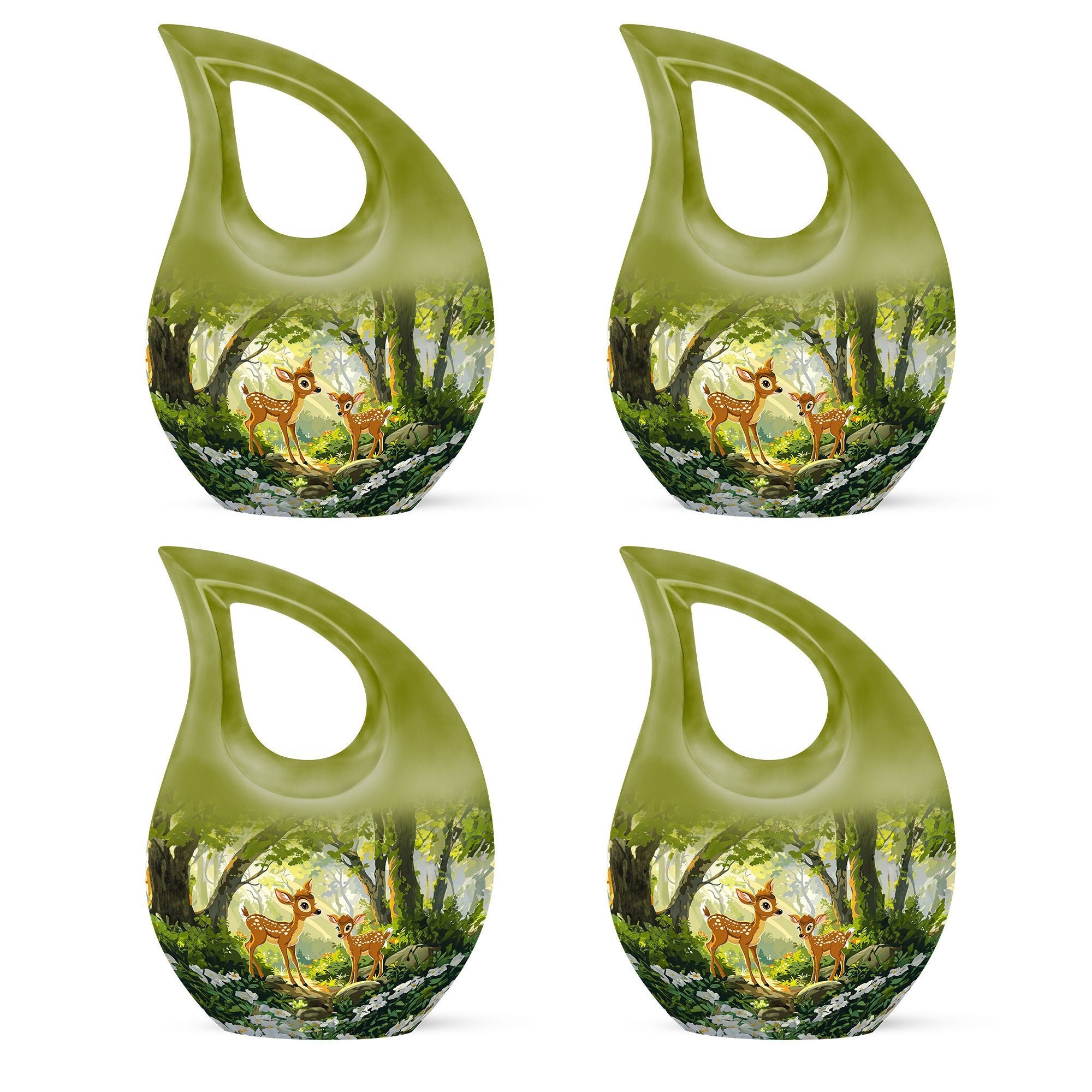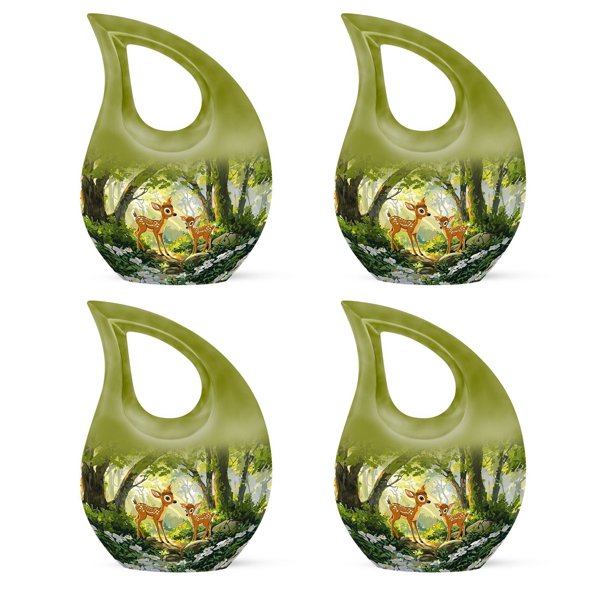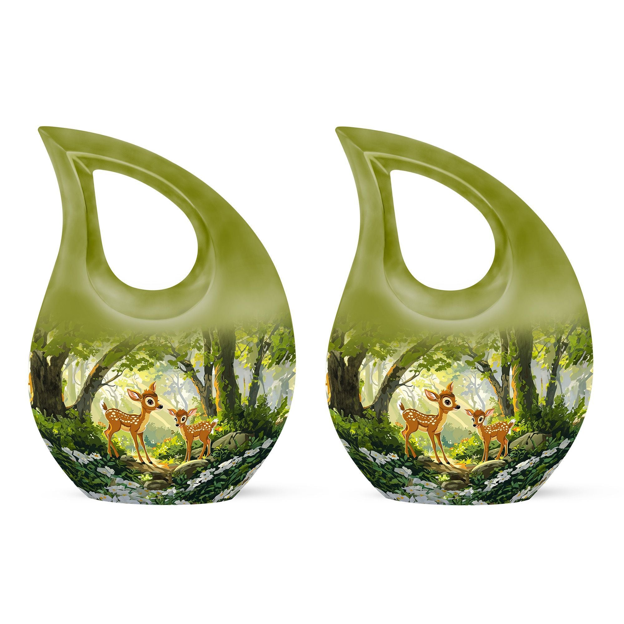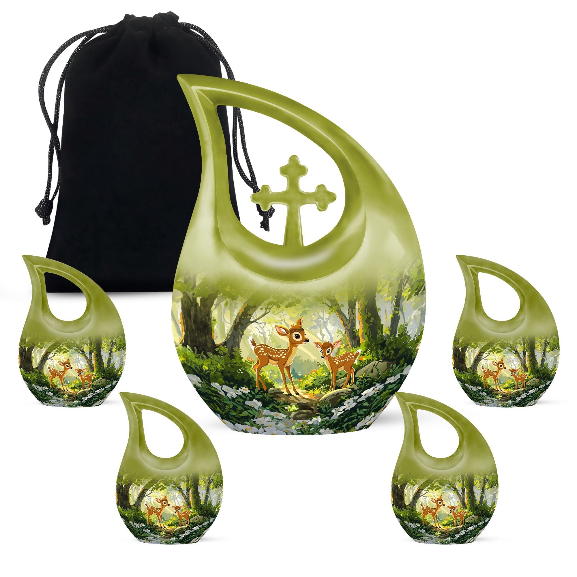 Cherish the memory of your loved ones with our Deer Urn, a unique piece from our collection of Extra Large Urns. This elegantly designed urn is crafted from high-quality Aluminium and features a Cross Drop motif to add a distinctive touch. With dimensions of 10 inches in height and a weight of 3.3 pounds, this remarkable urn has an ample capacity of 200 cubic inches. It comes with a soft velvet pouch for secure containment of ashes. Our Deer Urn not only serves as a resting place for your beloved but also as an ethereal piece reflecting reverence and remembrance. This sizeable urn can be personalized with engraved names, making it more meaningful. The Deer Theme creates a serene ambience that resonates with the tranquility of nature. Our assortment of Memorial Urns For Human Ashes, Customized Urns For Ashes For Adults, Personal Urns, and Unique Urns For Dad are diligently designed to respect your sentiments and honor the lives of those profoundly missed. Note: The product's design and size make it a fitting tribute for adults and seniors.