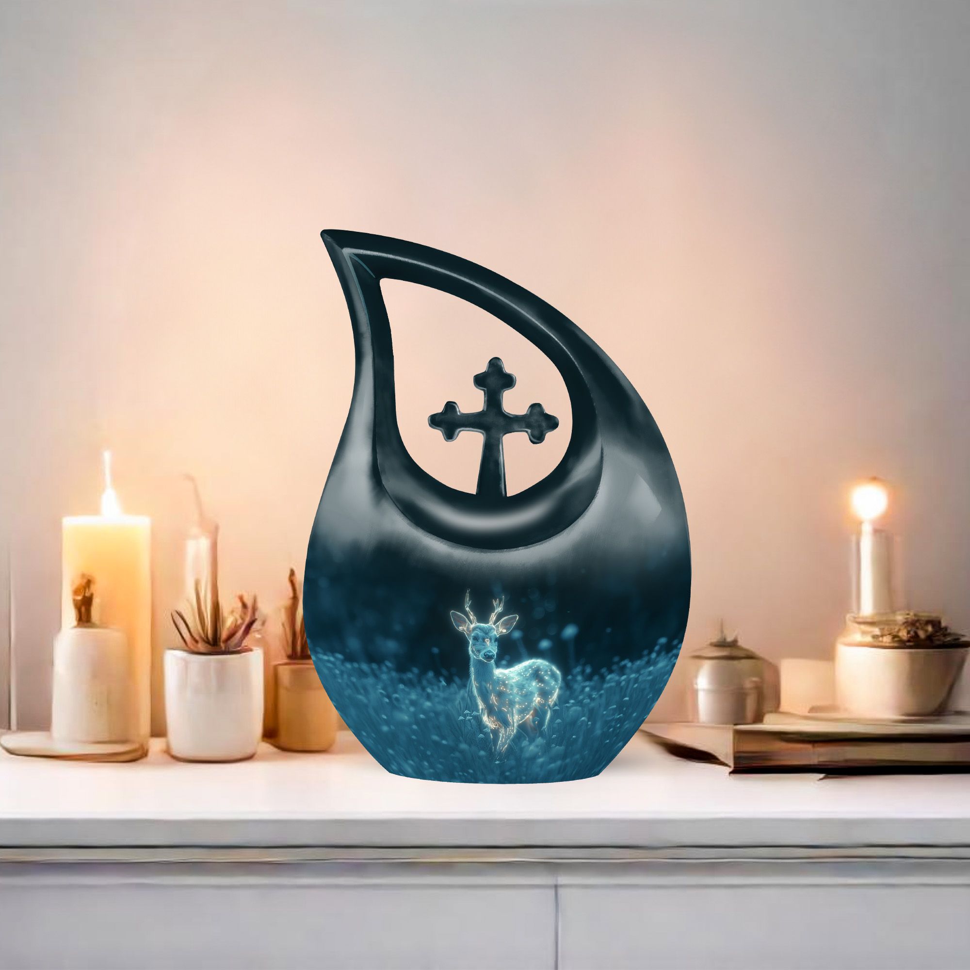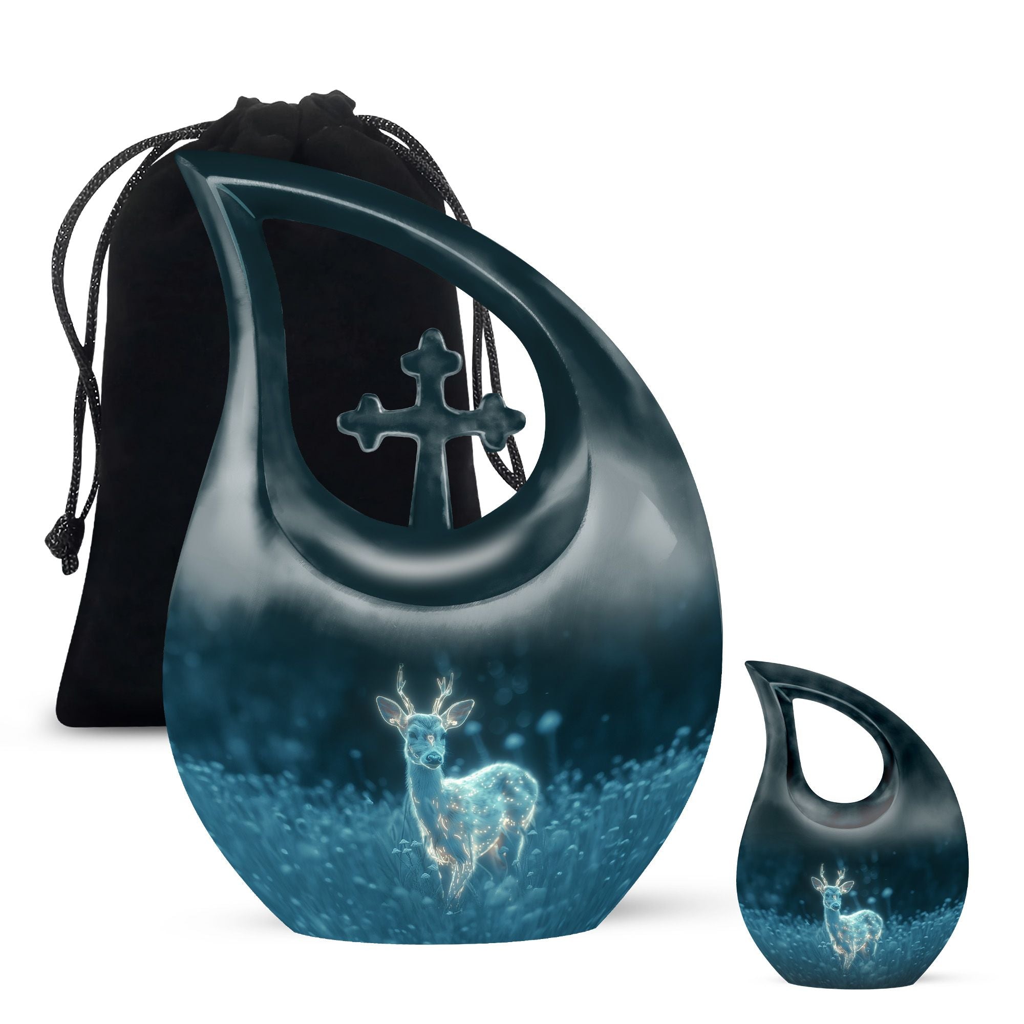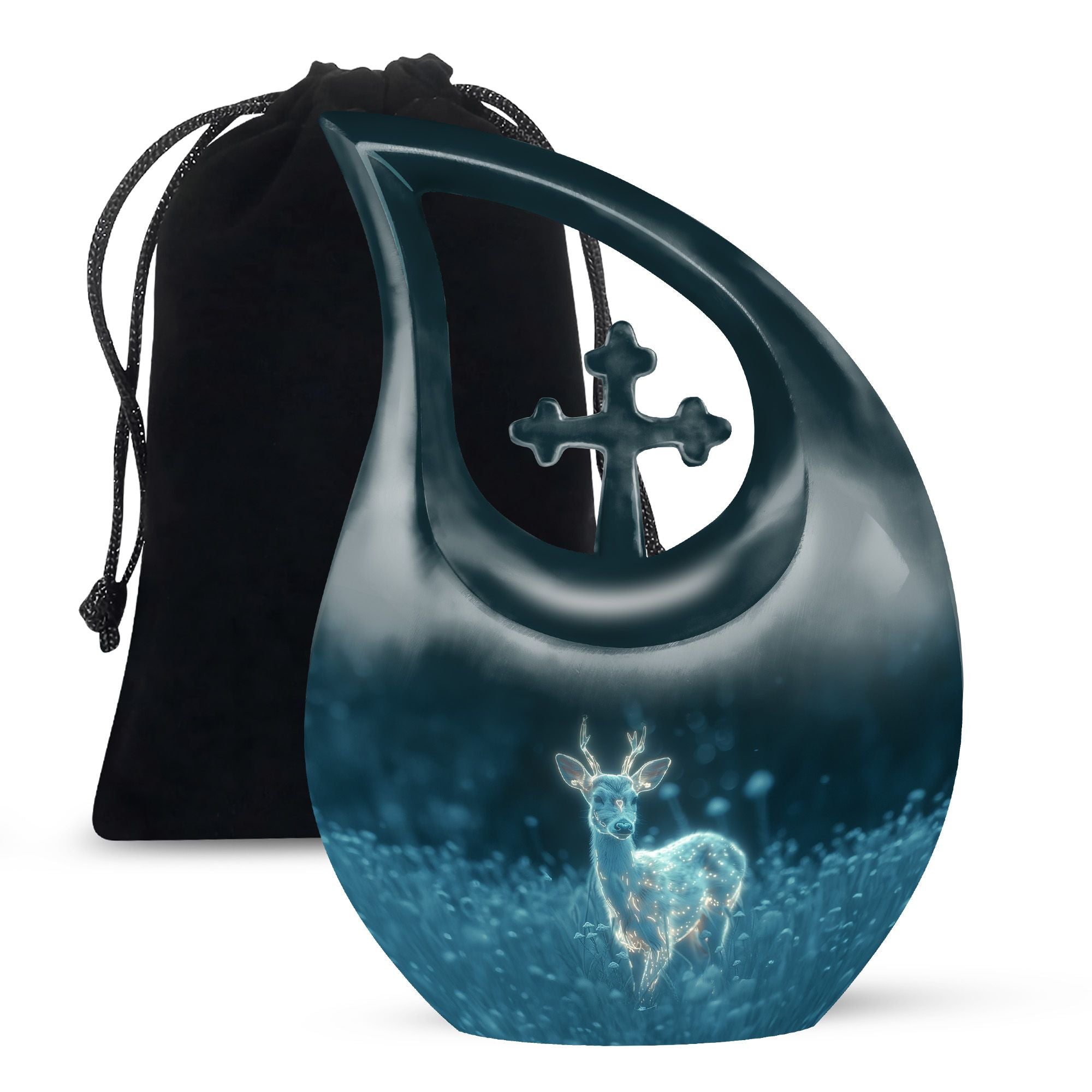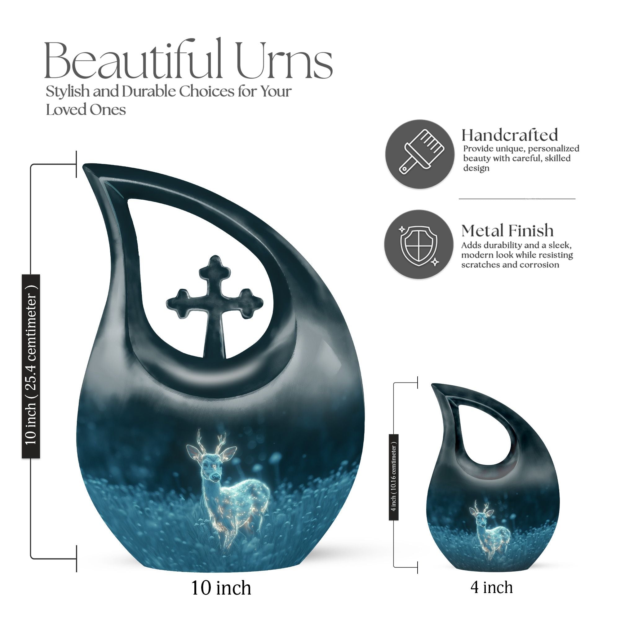 Elevate your memorial tribute with our 10-inch Deer Urn, exclusively designed for graceful and poignant remembrance. Fabricated from durable aluminum, this large urn has the dimensions of 10 inches in height and weighs 3.3 pounds. It gracefully holds up to 200 cubic inches of cremains. Our small urns for human ashes provide a beautiful homage to your loved ones. Adorned with a 'Cross Drop' theme, its aesthetic appeal embodies serenity and tranquility. Each urn exudes longevity and resilience, further making it an affordable cremation and burial solution. Customization options further add value, allowing you to personalize the urn with engraved names. It comes alongside a velvet pouch for containment and protection of the ashes. Essential for any cremation keepsakes collections, the deer urn is not just an item of remembrance, but a testament of endearing memories. Opt for our unique and warmly comforting deer urn, symbolizing eternal peace and love.