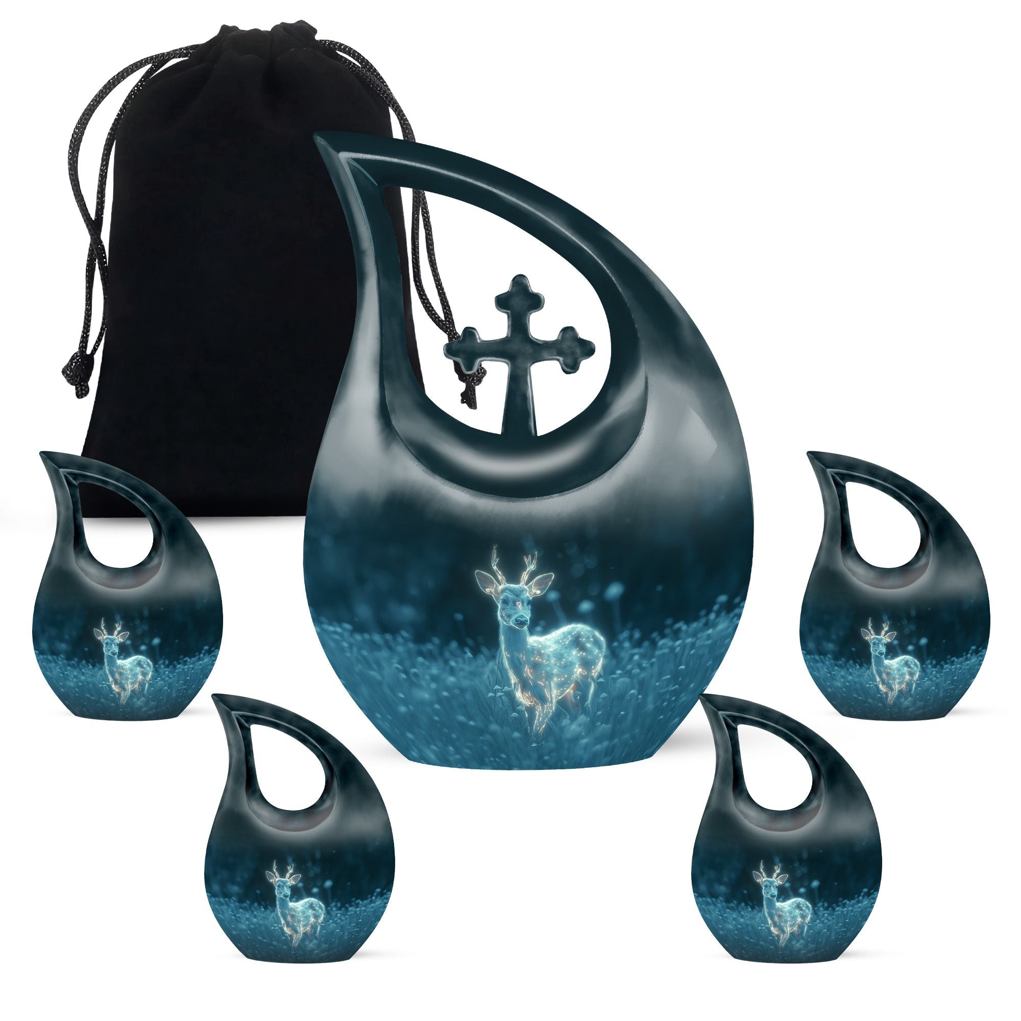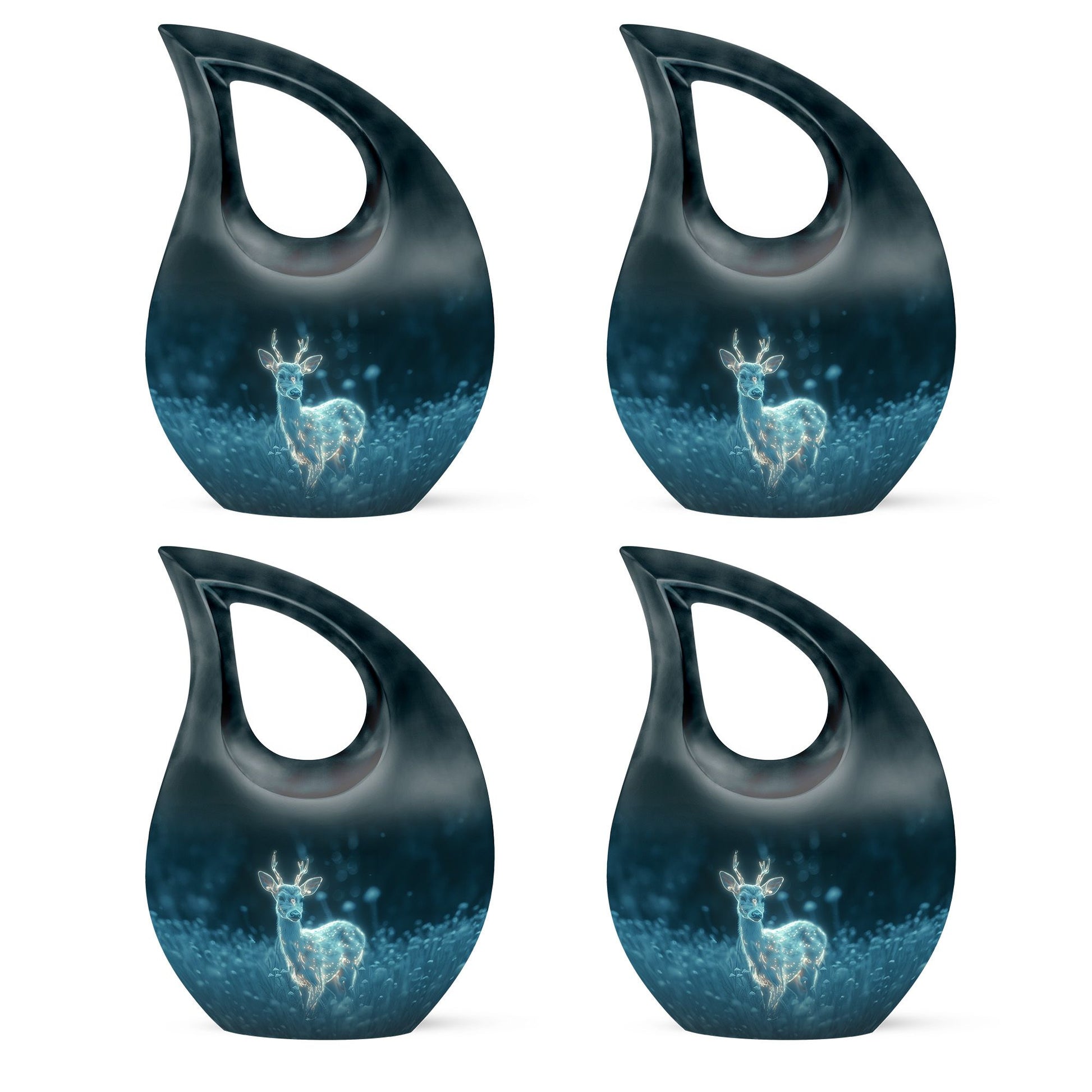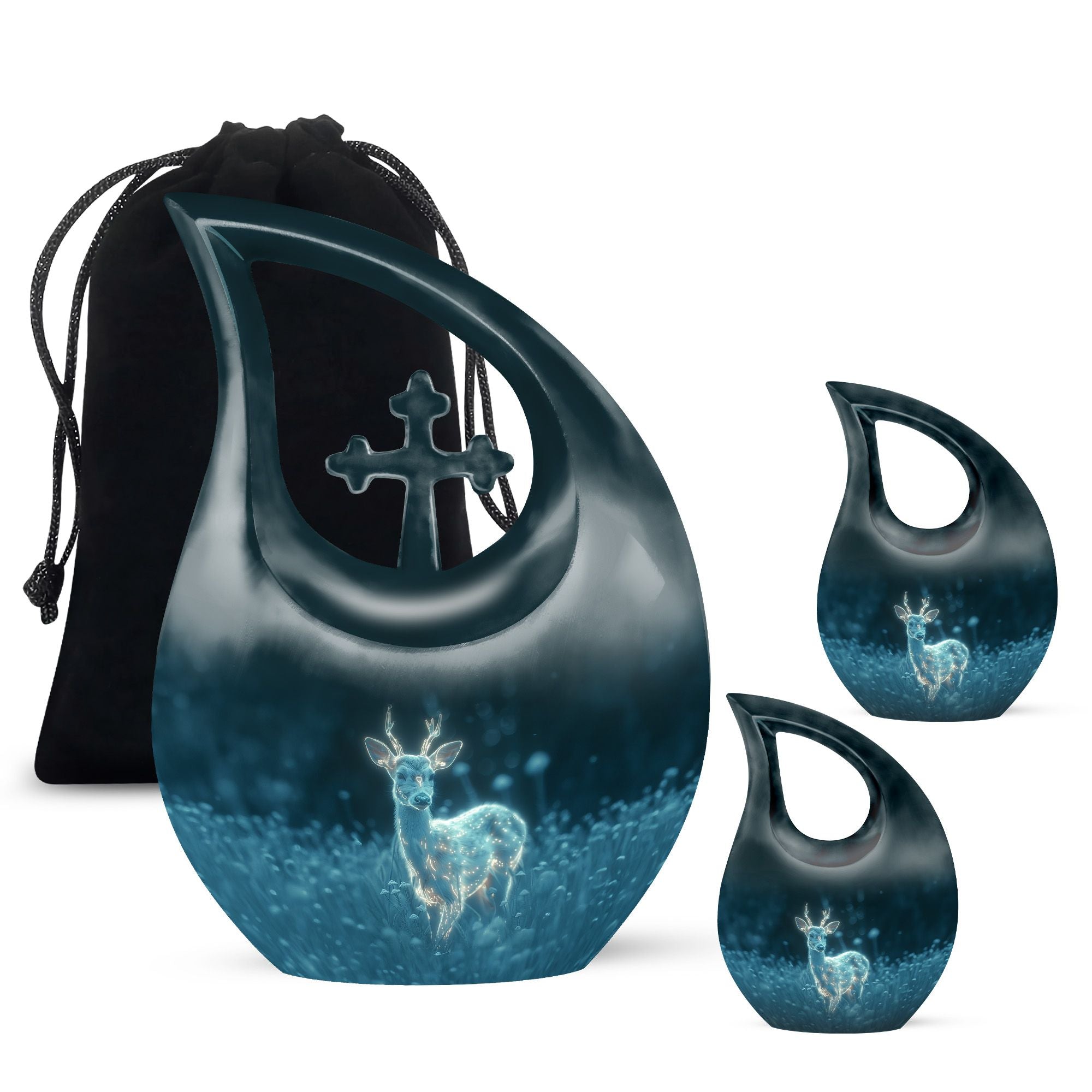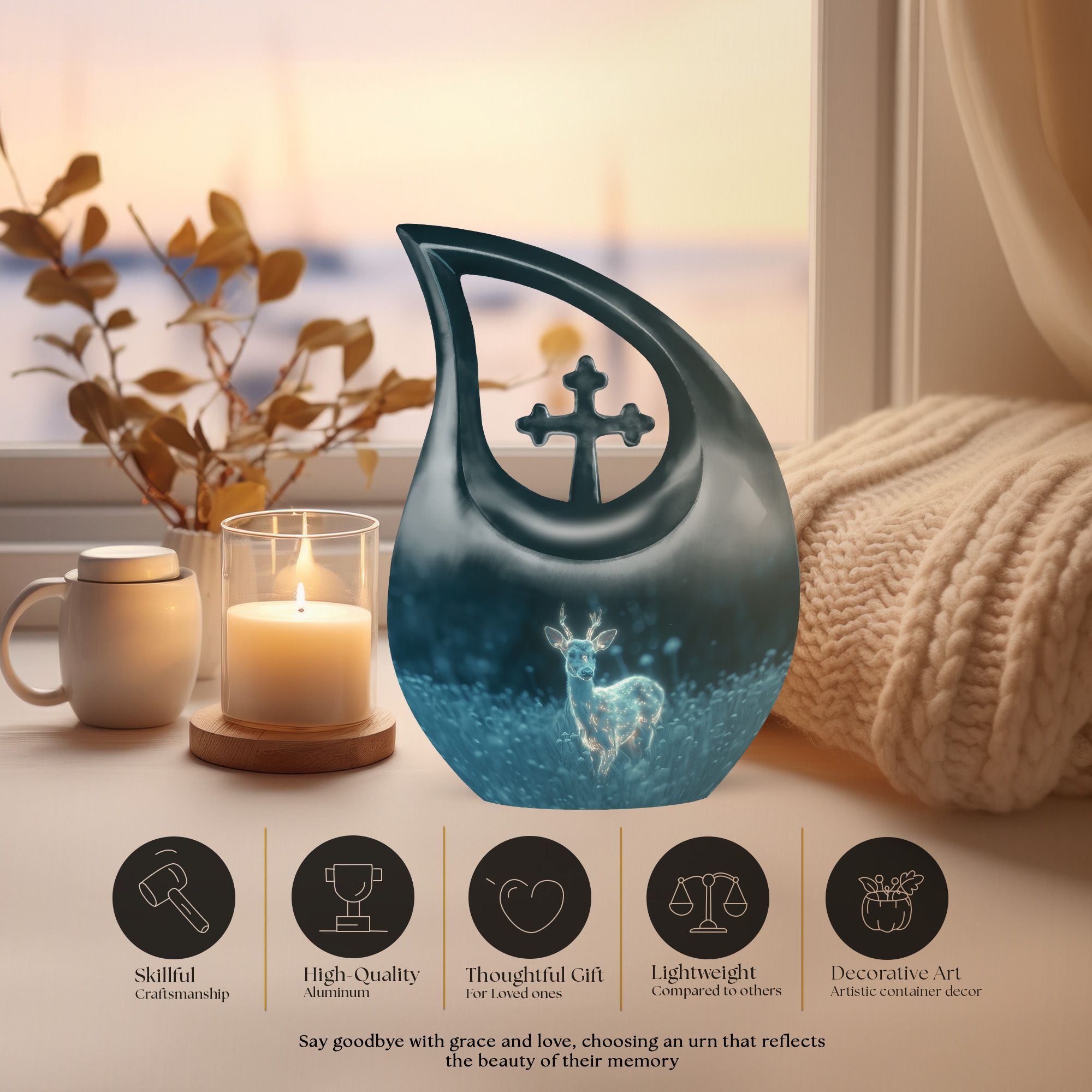 Elevate your memorial tribute with our 10-inch Deer Urn, exclusively designed for graceful and poignant remembrance. Fabricated from durable aluminum, this large urn has the dimensions of 10 inches in height and weighs 3.3 pounds. It gracefully holds up to 200 cubic inches of cremains. Our small urns for human ashes provide a beautiful homage to your loved ones. Adorned with a 'Cross Drop' theme, its aesthetic appeal embodies serenity and tranquility. Each urn exudes longevity and resilience, further making it an affordable cremation and burial solution. Customization options further add value, allowing you to personalize the urn with engraved names. It comes alongside a velvet pouch for containment and protection of the ashes. Essential for any cremation keepsakes collections, the deer urn is not just an item of remembrance, but a testament of endearing memories. Opt for our unique and warmly comforting deer urn, symbolizing eternal peace and love.