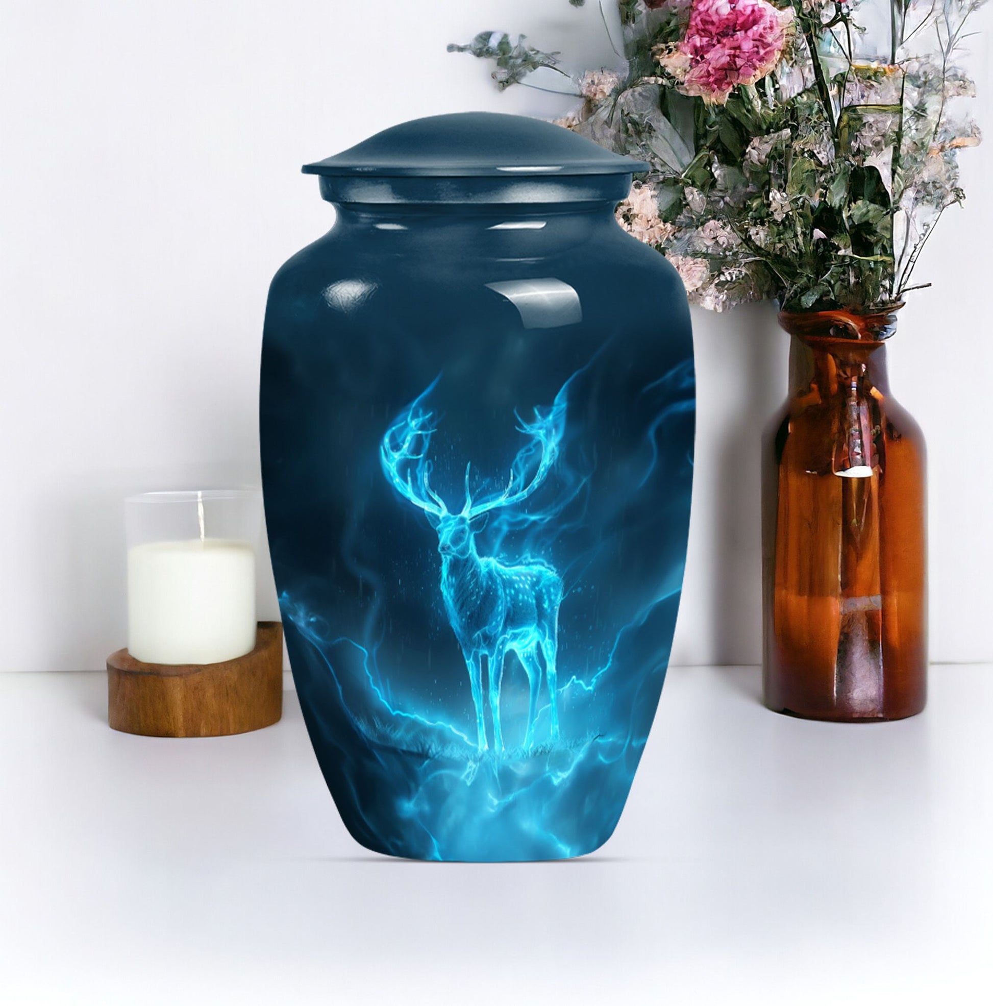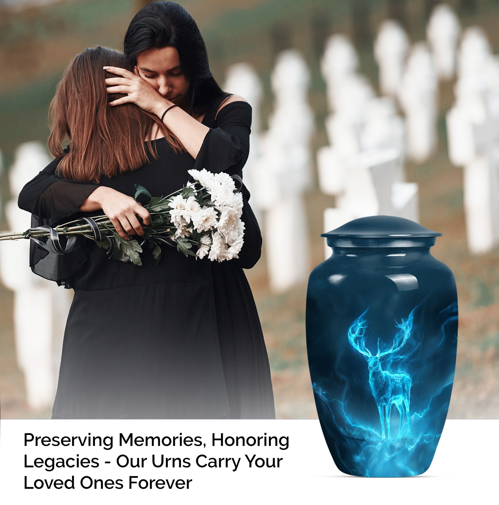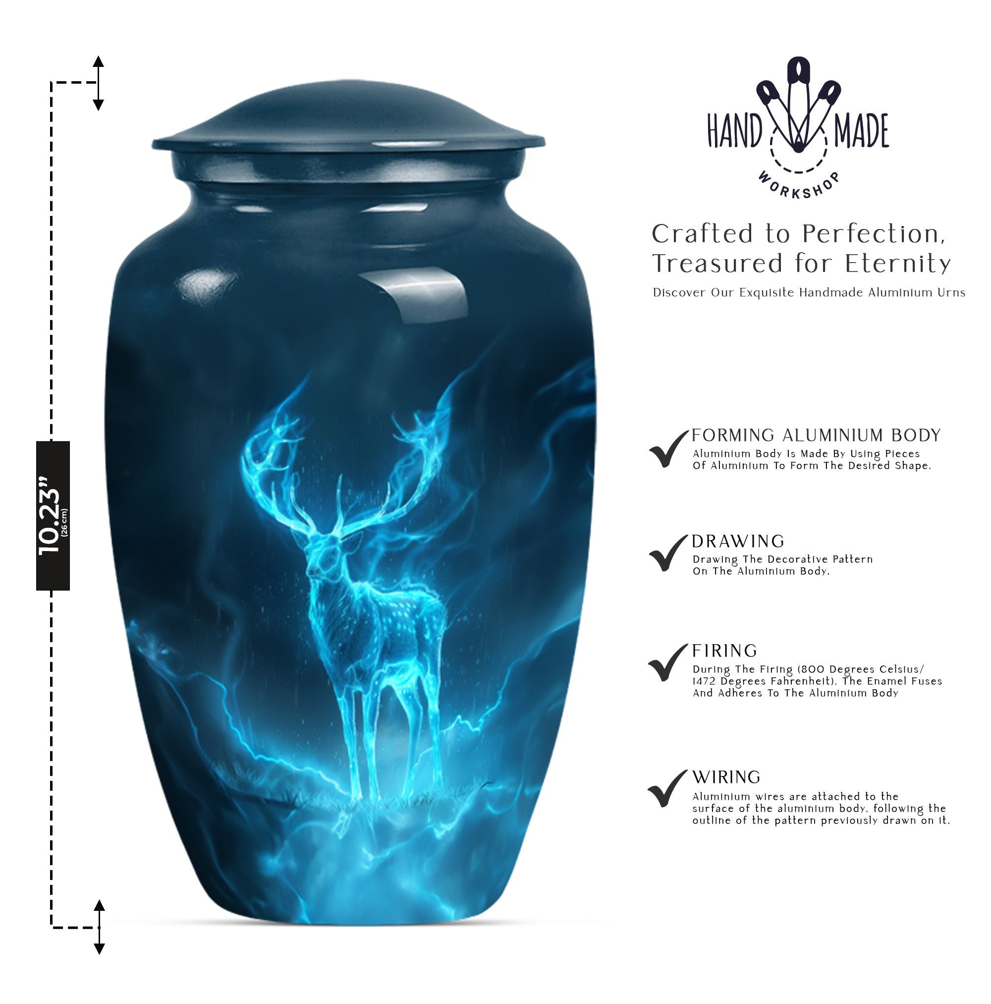 Preserve the loving memories of your departed loved ones with our Deer Urn, a burial urn designed for men but also entirely suitable for women. This large urn, weighing 3.3 pounds and standing at 10 inches tall, boasts a symbolic Wolf Howling theme that can bring dignity and resilience in such a time of sorrow. Crafted from robust and well-polished Aluminium, the urn has a unique ability to stand the test of time and weather. Each urn has a capacity of 200 cubic inches and comes with a charming velvet pouch for convenient containment and safeguarding of the ashes. Moreover, personalize this memorial urn with engraved names to make it truly special and one-of-a-kind. When you opt for the Deer Urn, you're not just picking an urn for ashes; you're choosing a fitting homage to the life of your loved one. Keywords: Cremation large urn for ashes, ash adult ashes women, earn cremation, metal urns for burial in ground.