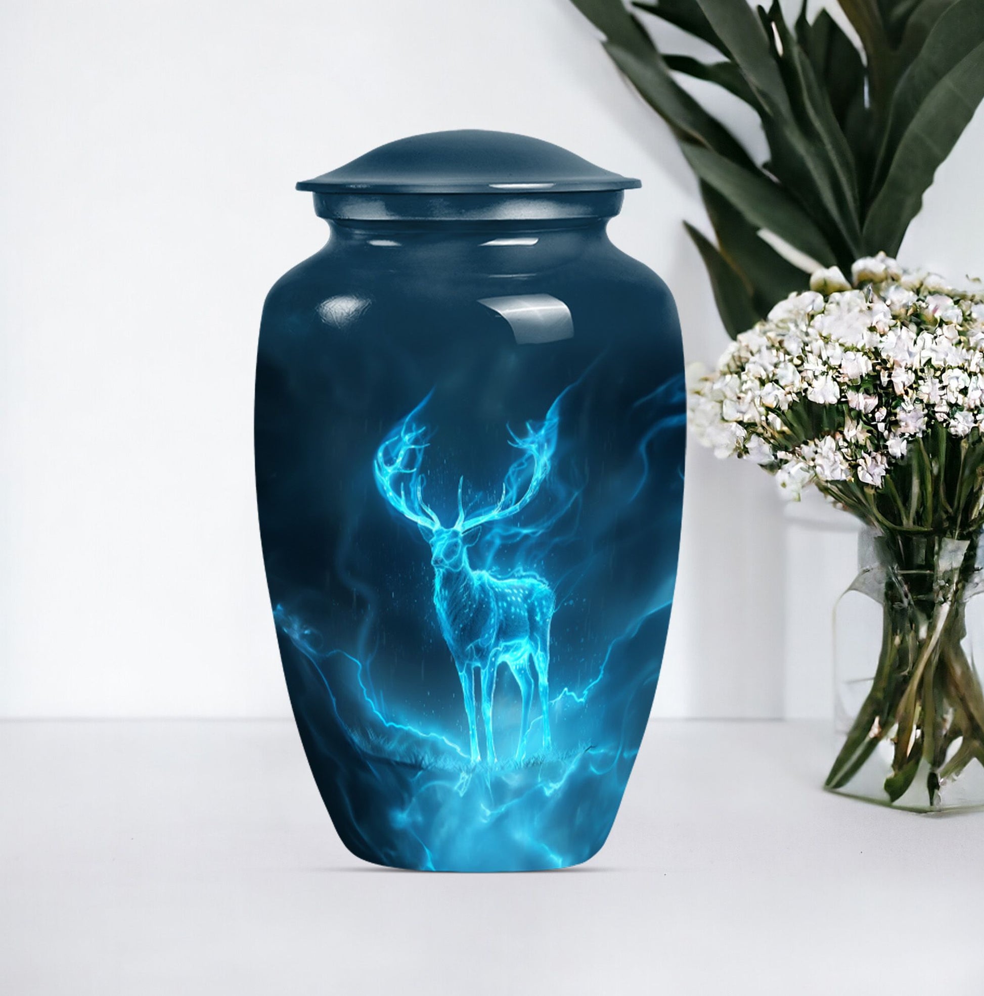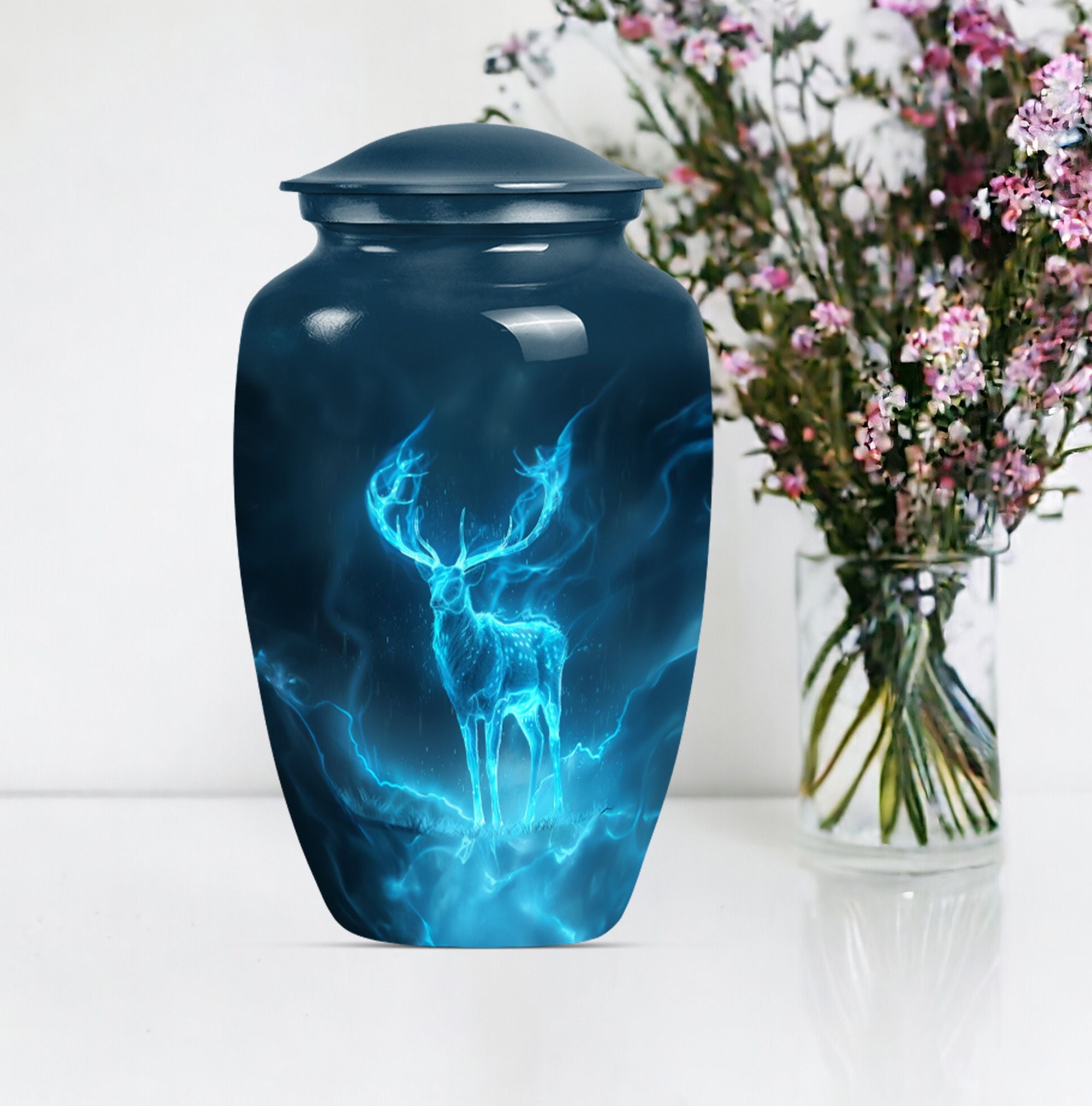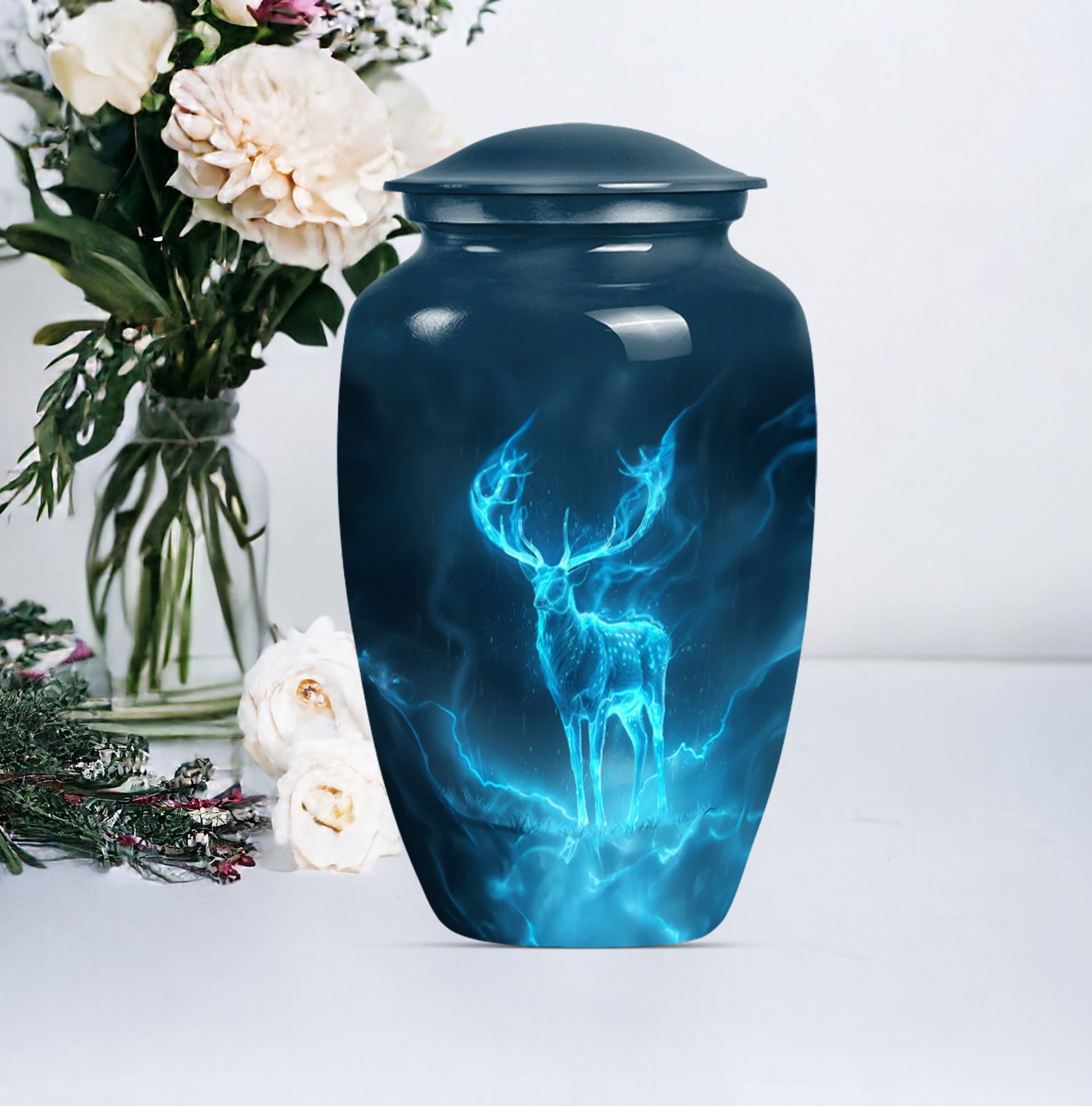 Preserve the loving memories of your departed loved ones with our Deer Urn, a burial urn designed for men but also entirely suitable for women. This large urn, weighing 3.3 pounds and standing at 10 inches tall, boasts a symbolic Wolf Howling theme that can bring dignity and resilience in such a time of sorrow. Crafted from robust and well-polished Aluminium, the urn has a unique ability to stand the test of time and weather. Each urn has a capacity of 200 cubic inches and comes with a charming velvet pouch for convenient containment and safeguarding of the ashes. Moreover, personalize this memorial urn with engraved names to make it truly special and one-of-a-kind. When you opt for the Deer Urn, you're not just picking an urn for ashes; you're choosing a fitting homage to the life of your loved one. Keywords: Cremation large urn for ashes, ash adult ashes women, earn cremation, metal urns for burial in ground.