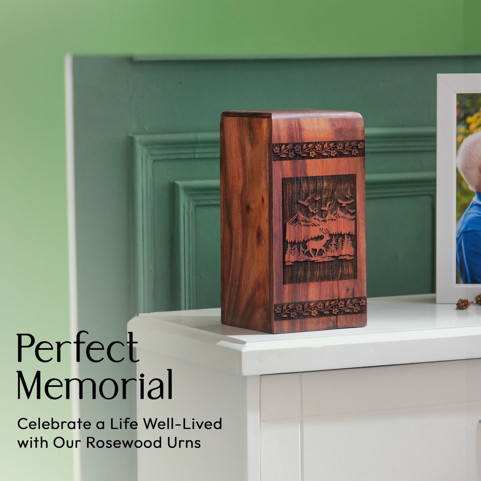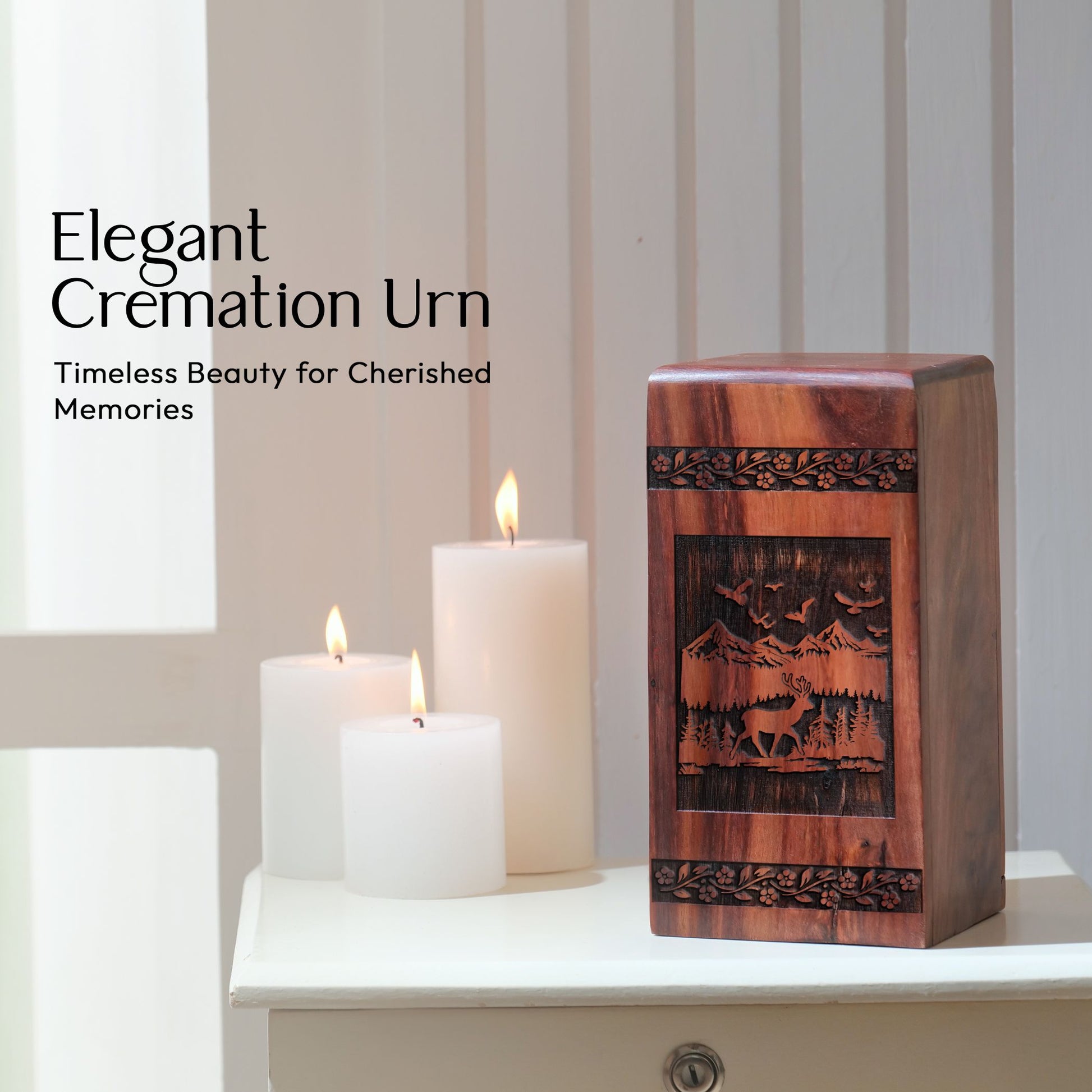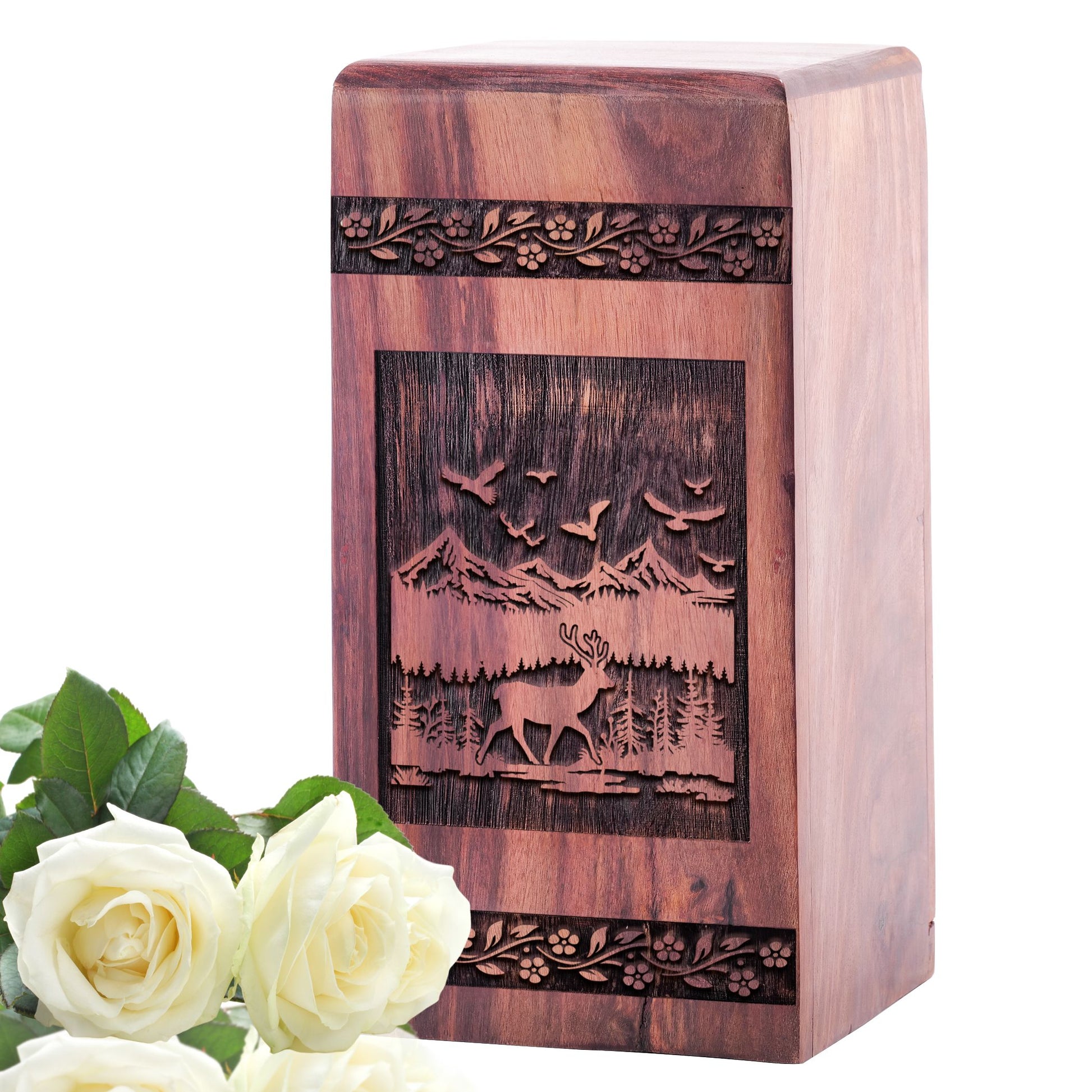Celebrate the memory of your dear one with this exquisite Deer Urn. Beautifully crafted from high-quality wood, this urn for ashes adds a touch of elegance to any memorial ceremony. This large urn, capable of holding a significant amount of ashes, perfectly symbolizes the grandeur of a life well-lived, making it an ideal ash holder for adults. Its exquisite deer motif adds a unique element of serenity and grace. Unlike common urns, our Deer Urn boasts an uncommon charm that sets it apart. Be it to remember a loved one or to honor their journey, this urn provides a comforting presence. Discover the peace of remembrance with this Deer Urn, an urn for ashes designed with utmost care and reverence. Opt for this wooden urn and keep your cherished memories close to your heart.