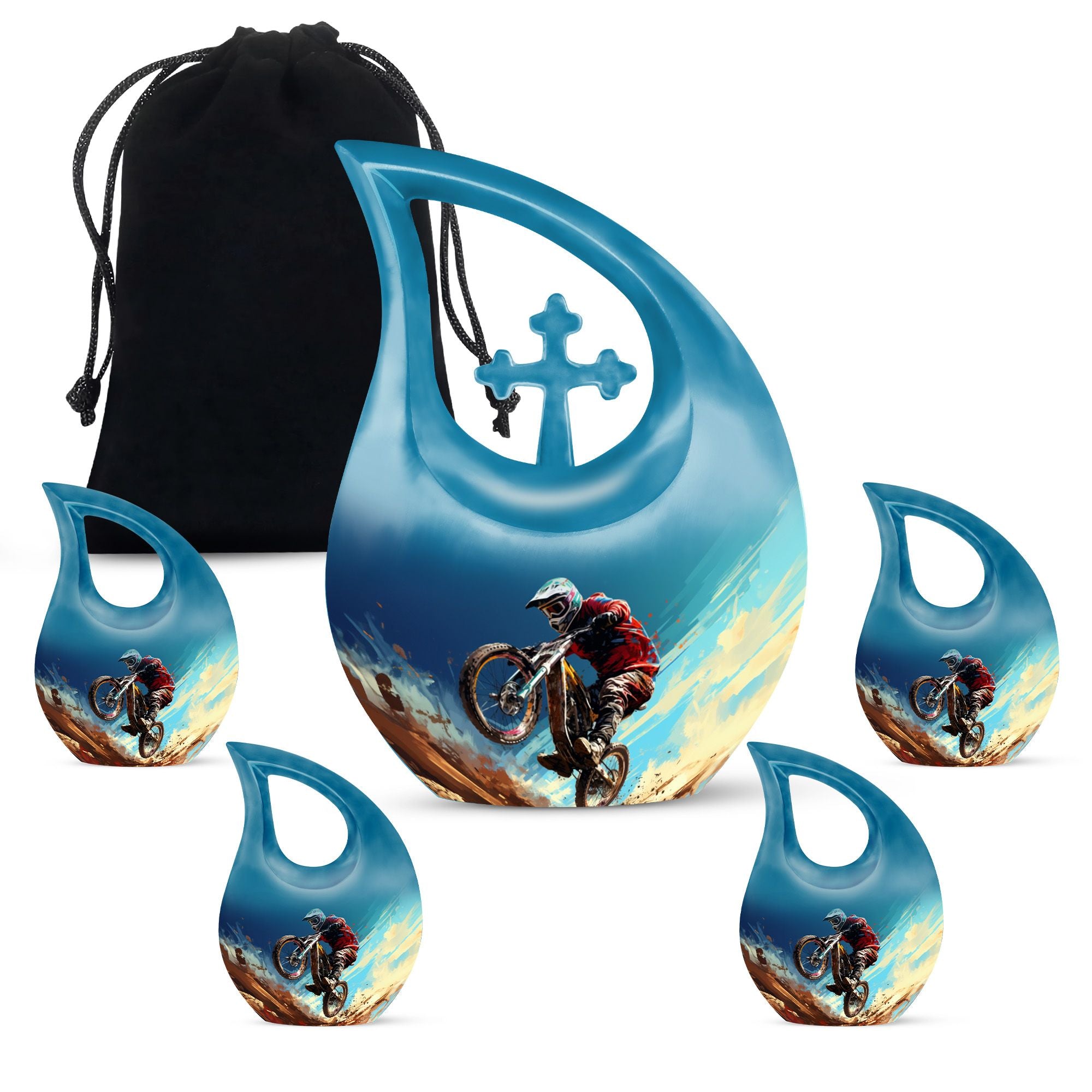 Crafted from durable aluminum, this motorcycle-themed urn features bold motocross artwork reflecting freedom, resilience, and unforgettable memories. Its secure screw-top lid provides long-term protection, while the full adult capacity makes it ideal for cremation urn for adults, adult size cremation urns, or cremation urn mom. Families who wish to share ashes can pair this urn with small urns for cremation ashes, mini cremation urns, urns for cremation ashes small, or keepsake cremation urns for human ashes. It also works beautifully with cremation keepsakes urns or a cremation urn keepsake for coordinated memorial displays.