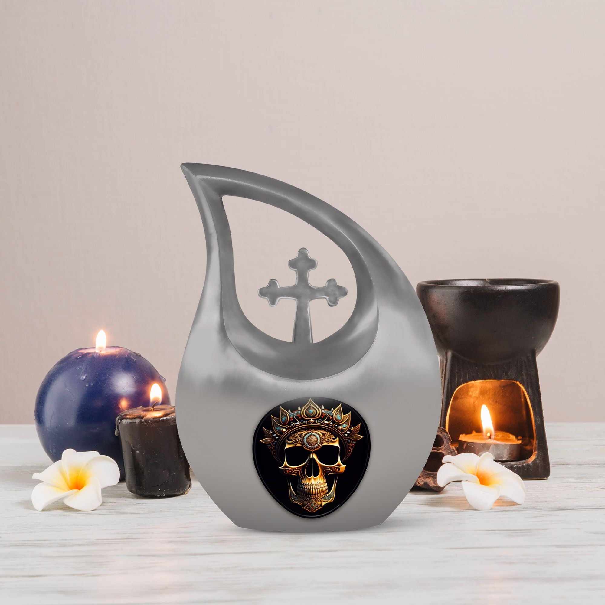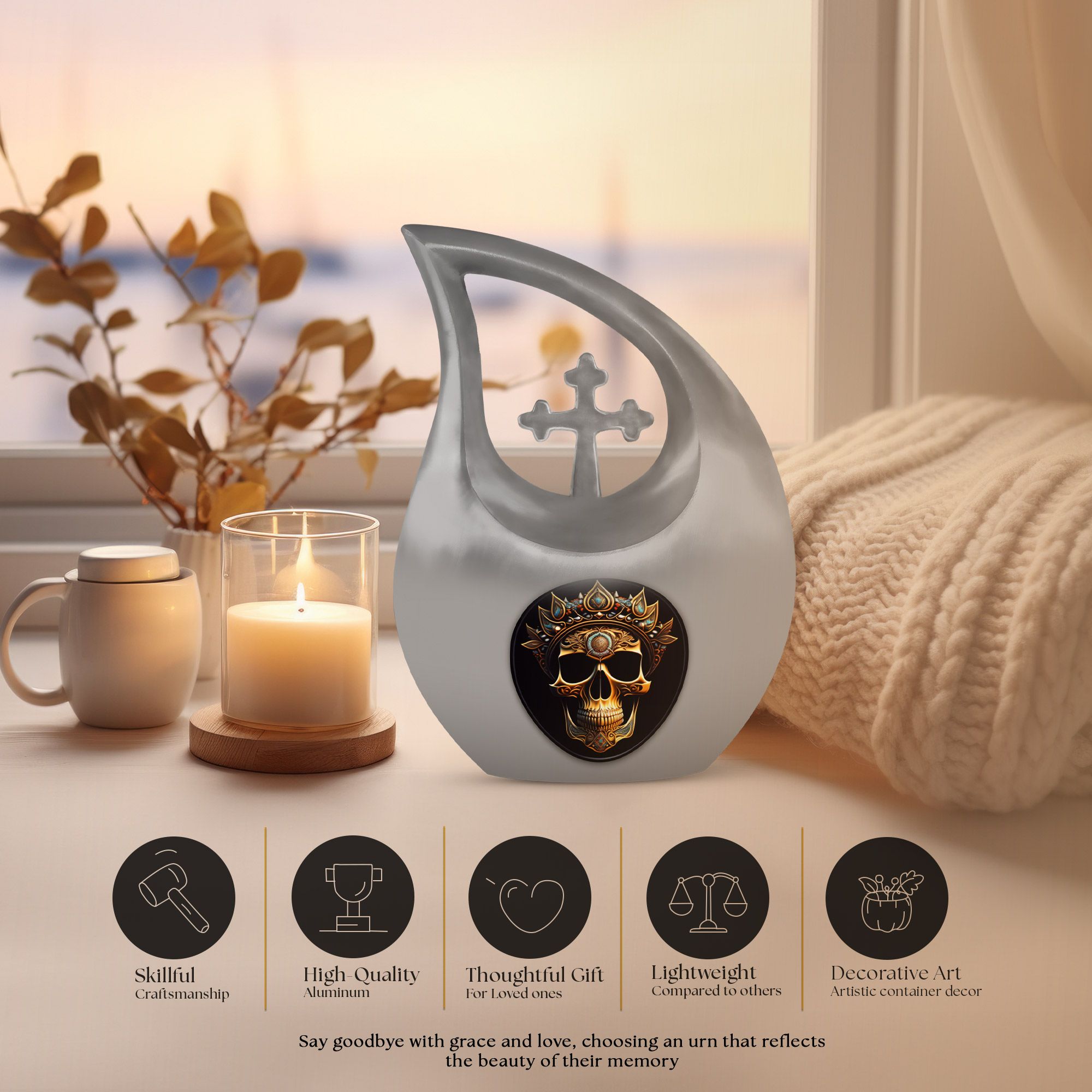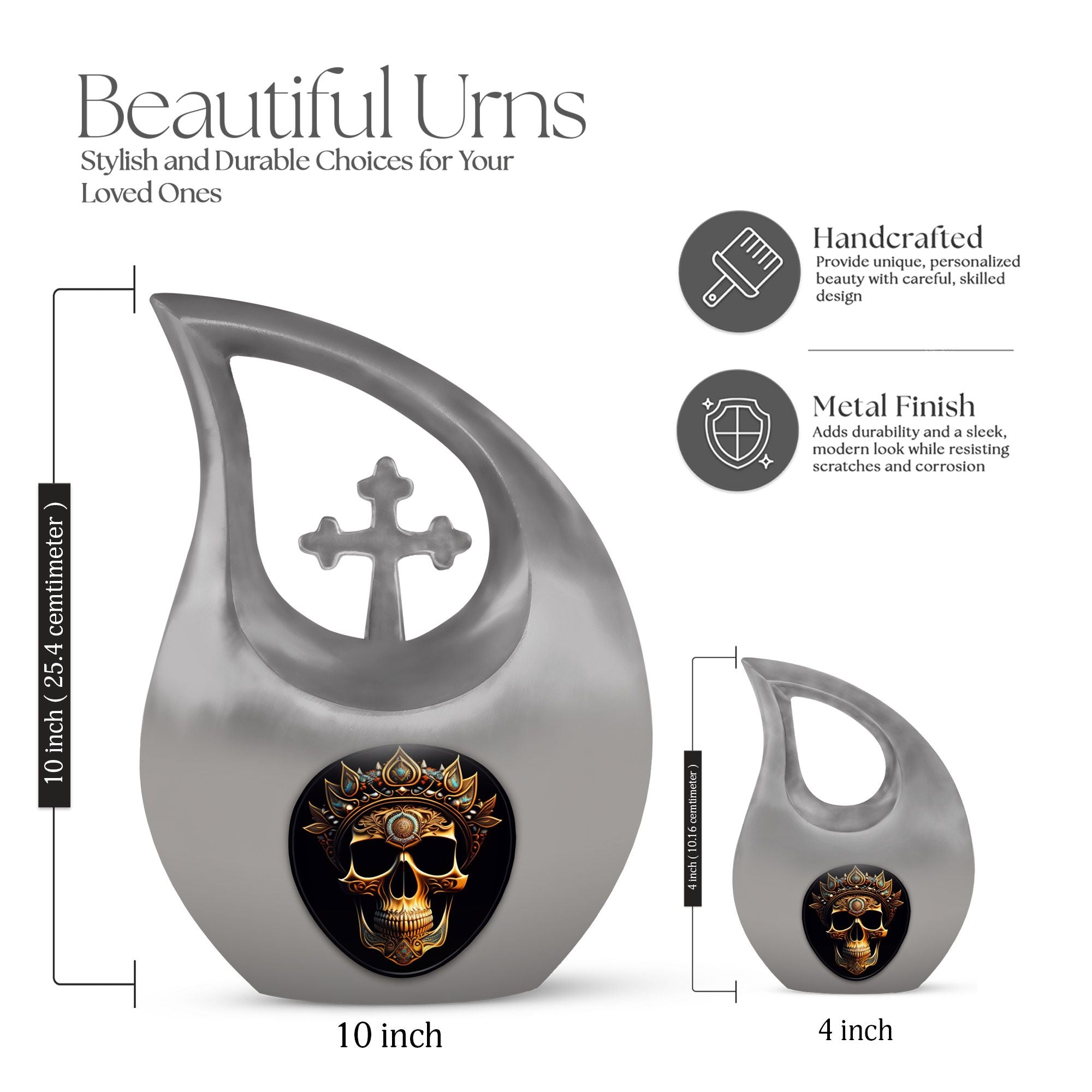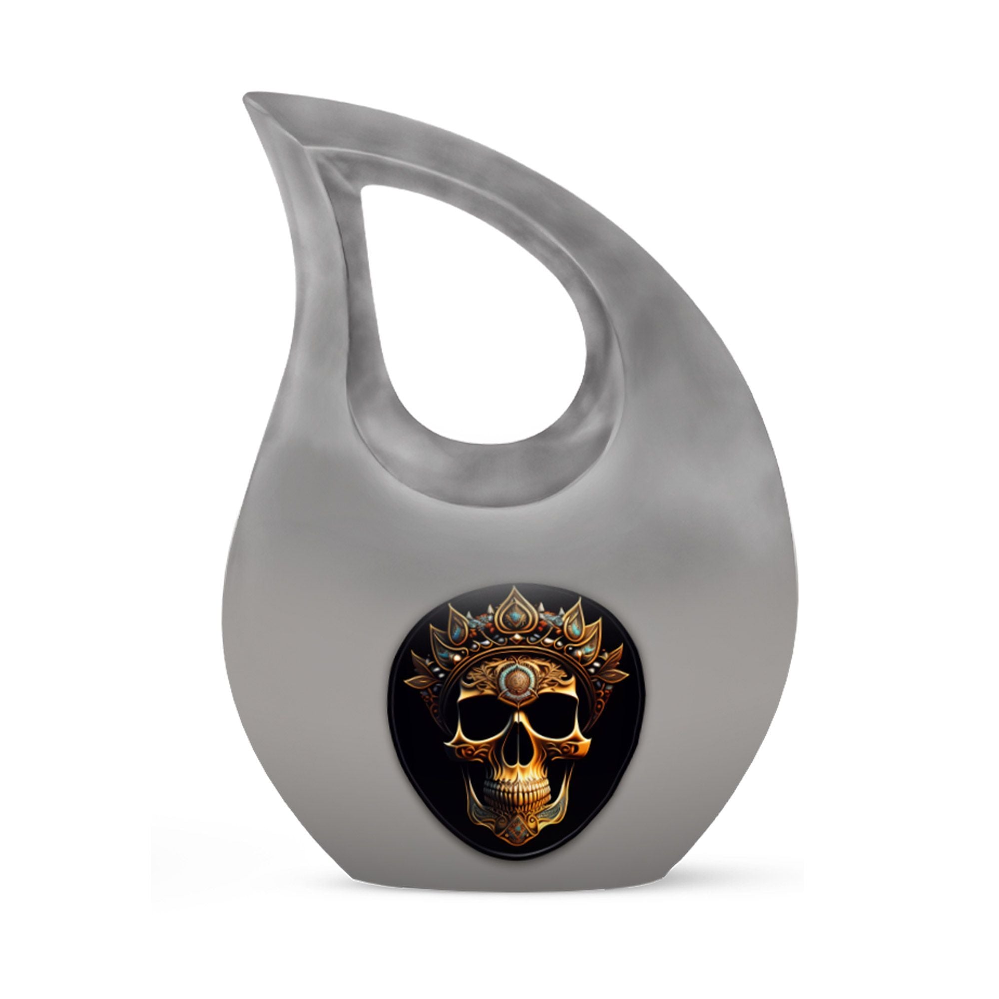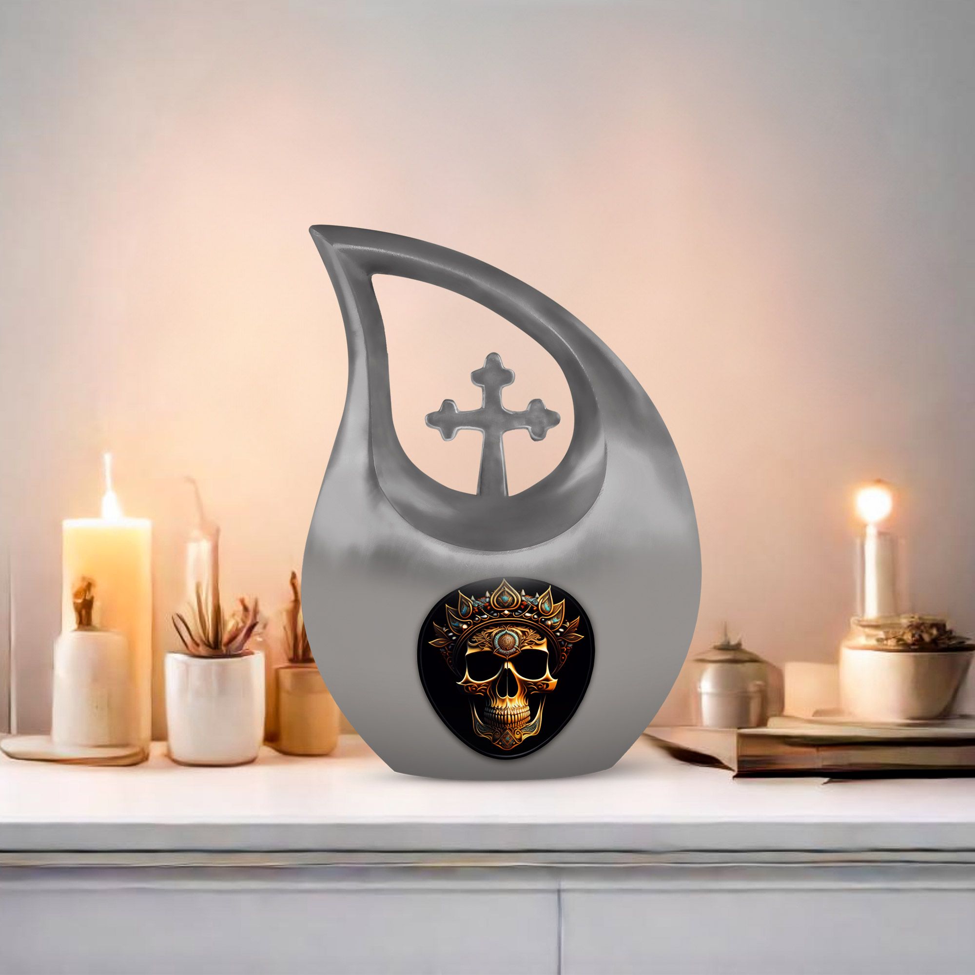 Expertly handcrafted, this adult funeral urn features a stunning crowned skull motif against a sleek metallic surface, symbolizing dignity, transformation, and eternal strength. Made from premium-grade aluminum, it’s built to last with a secure screw-top lid for safe ash containment. Its striking design and craftsmanship make it one of the most unique urns for ashes available, ideal for display or urn for burial in ground ceremonies.