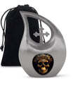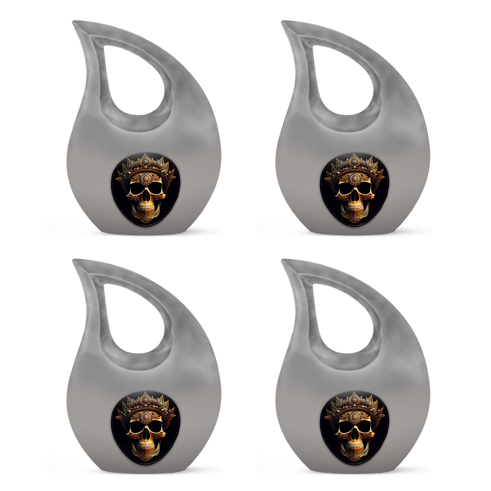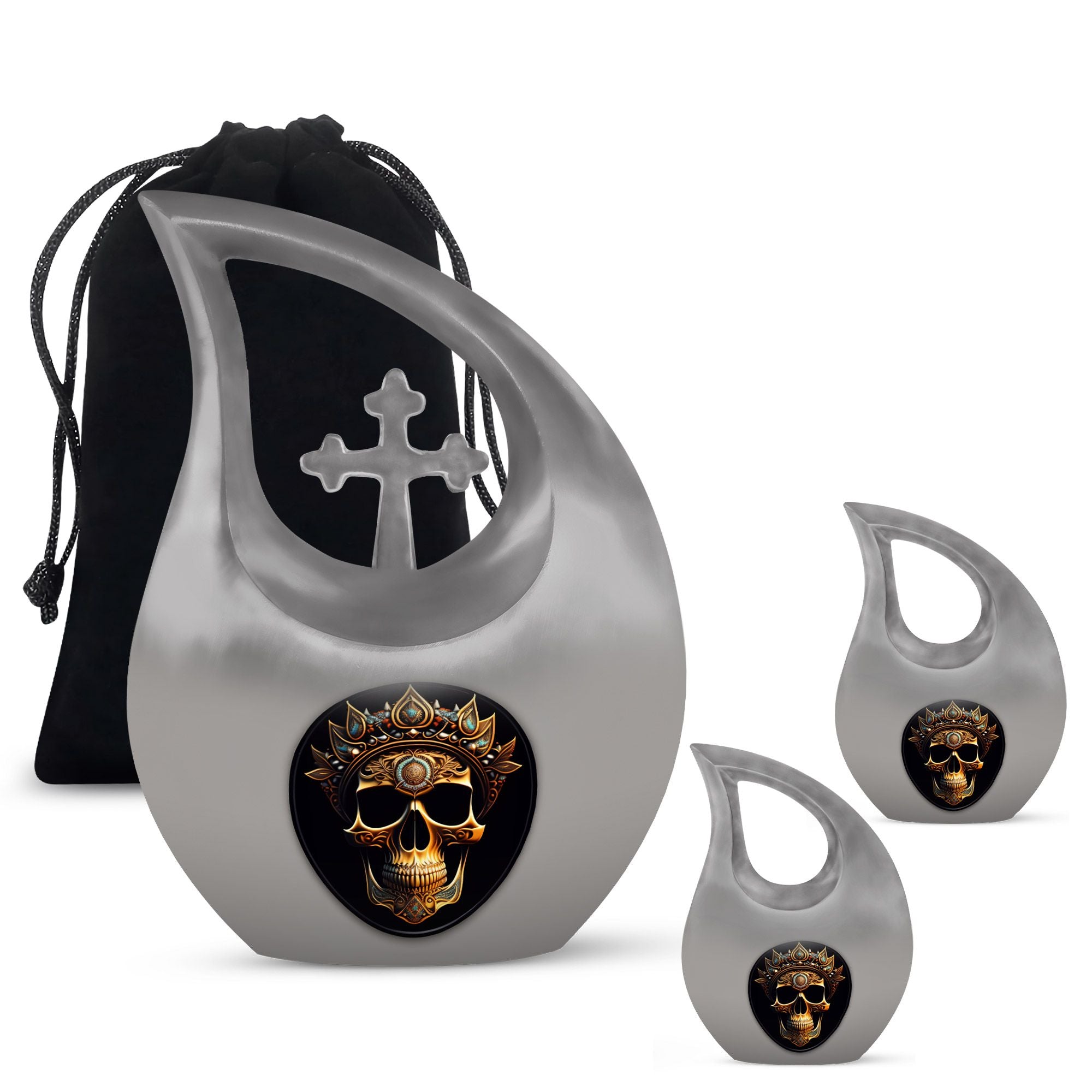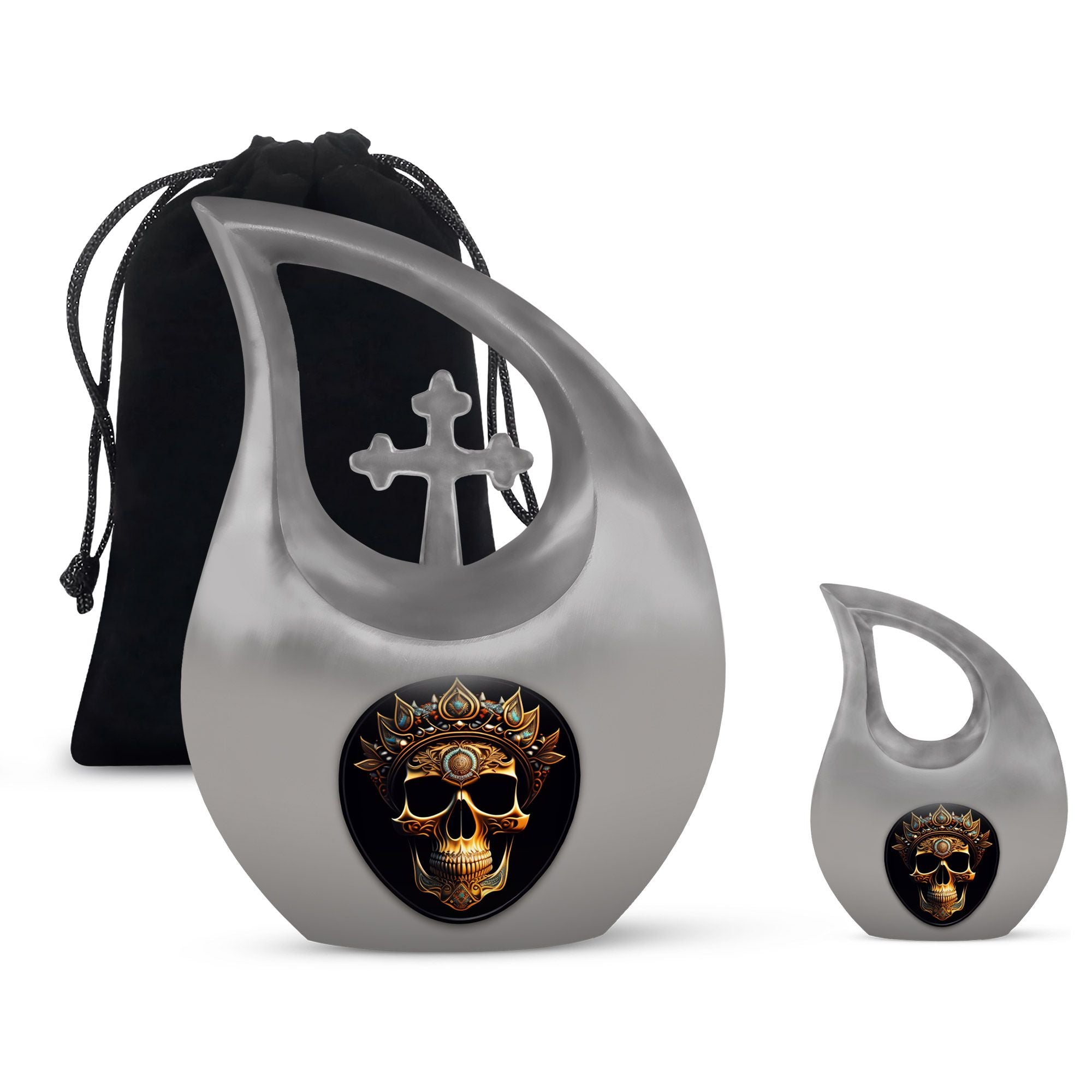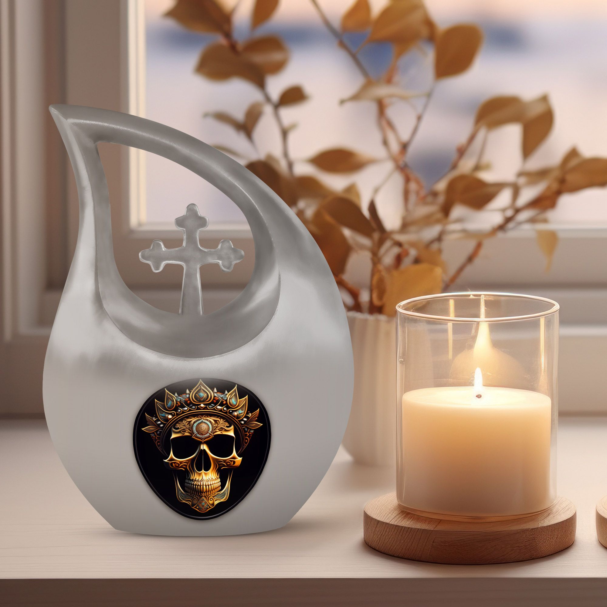 Expertly handcrafted, this adult funeral urn features a stunning crowned skull motif against a sleek metallic surface, symbolizing dignity, transformation, and eternal strength. Made from premium-grade aluminum, it’s built to last with a secure screw-top lid for safe ash containment. Its striking design and craftsmanship make it one of the most unique urns for ashes available, ideal for display or urn for burial in ground ceremonies.