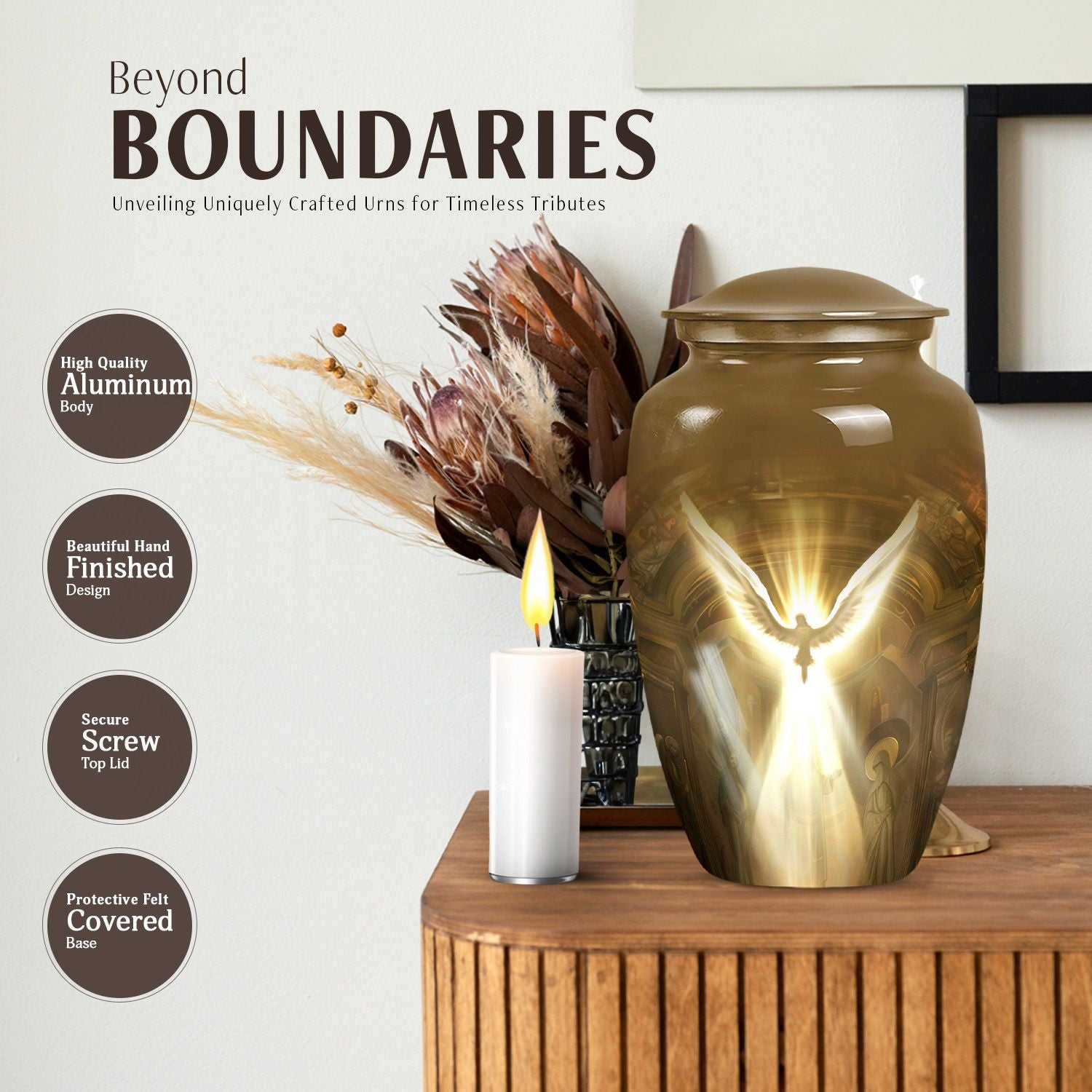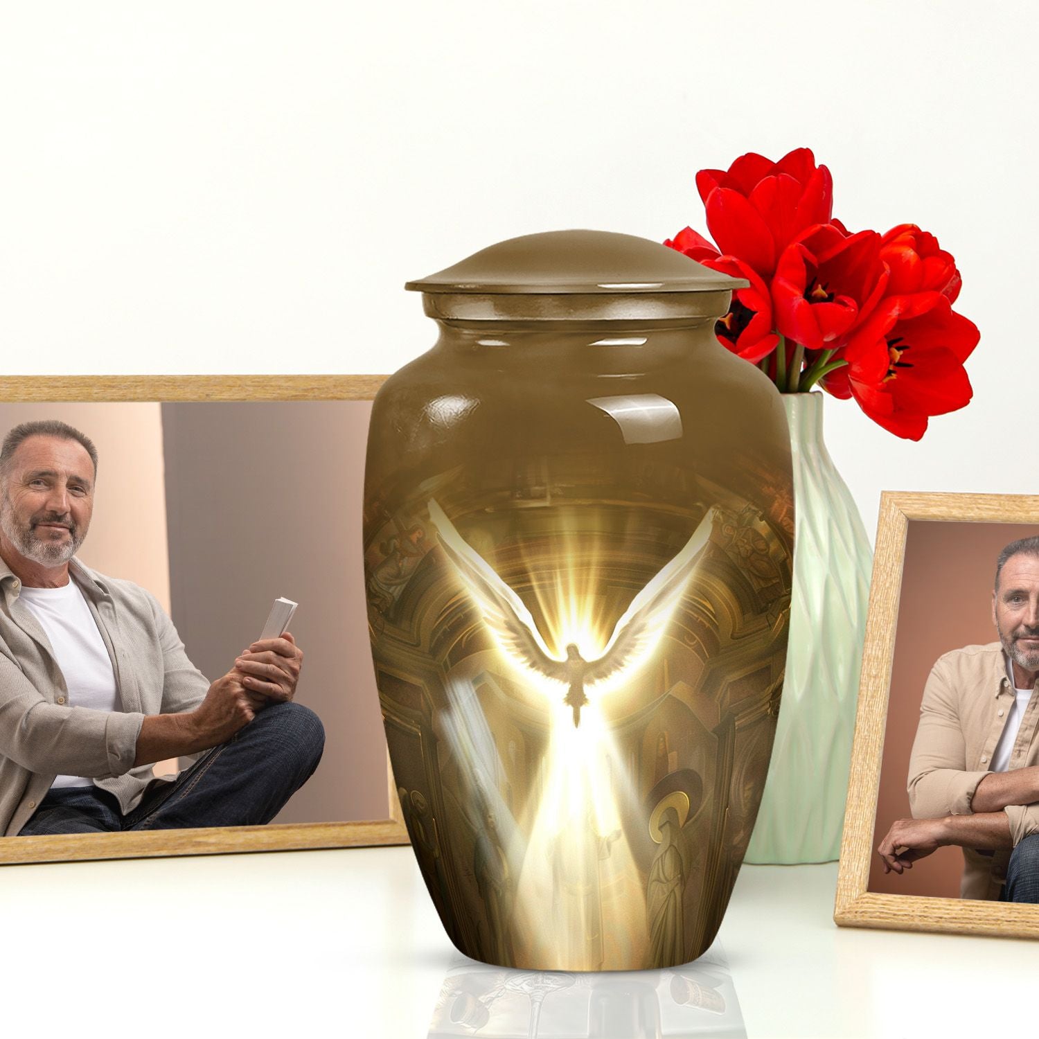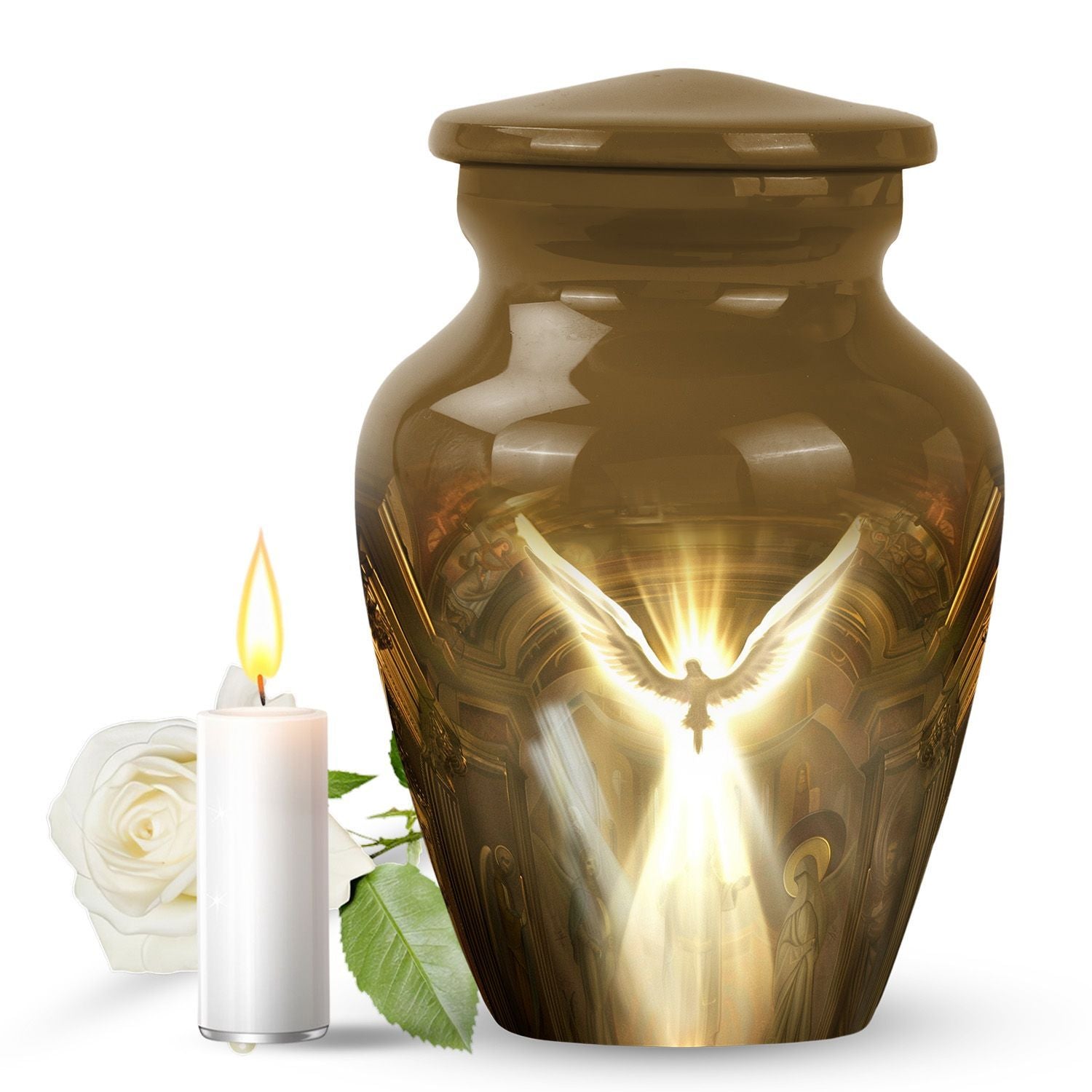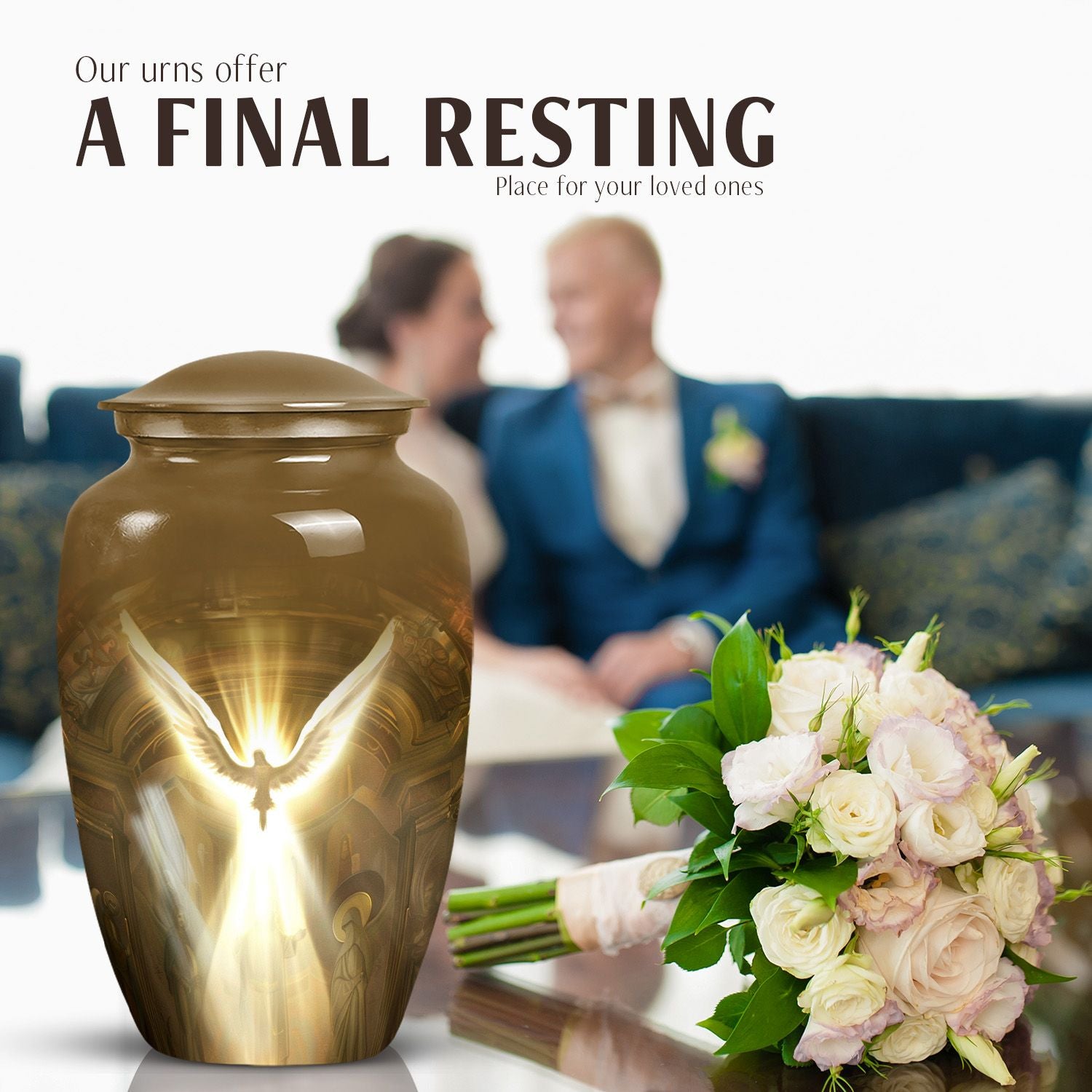 Experience a dignified and respectful memorial with the 'Abstract' themed Large Urn, specially crafted for Catholic rites. This cremation urn is fashioned from robust aluminium, with a classic design that brings tranquillity and comfort during moments of remembrance. Sized at 10 inches, this urn weighs a sturdy 3.3 pounds, designed to etch its presence permanently in your memories as a sublime representation of your loved one's life. With a capacity of 200 cubic inches, it effortlessly accommodates the ashes and offers a velvet pouch for their containment. Notably, this urn opens space for personalizing with engraved names, introducing a unique touch to each urn, which goes beyond the conventional cremation medium urns for human ashes. Catering to its universal appeal, it makes an excellent inclusion in the array of burial cremation urns for human ashes. This product signifies a heartfelt blend of respect, love, and remembrance in the face of human cremation. This product transcends the reverence of Christianity and makes a poignant statement in memory of your loved one, proving to be a significant addition to your memorial ceremony supplies.