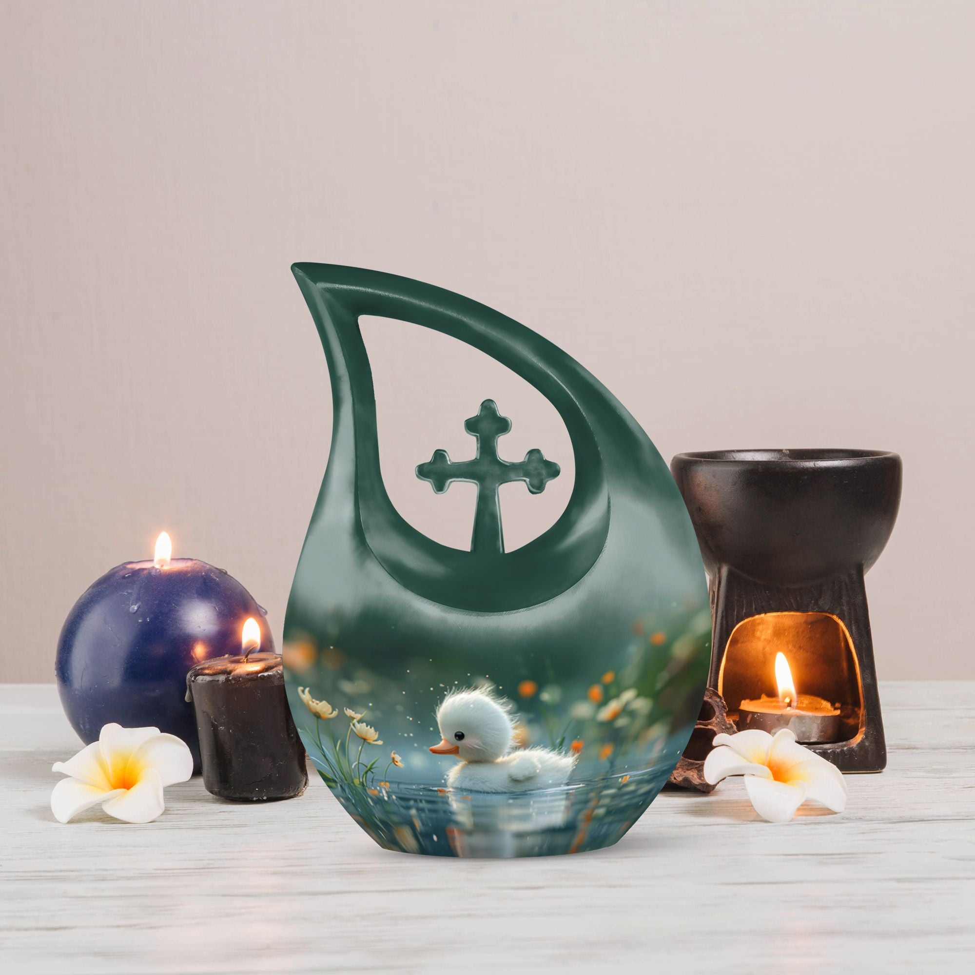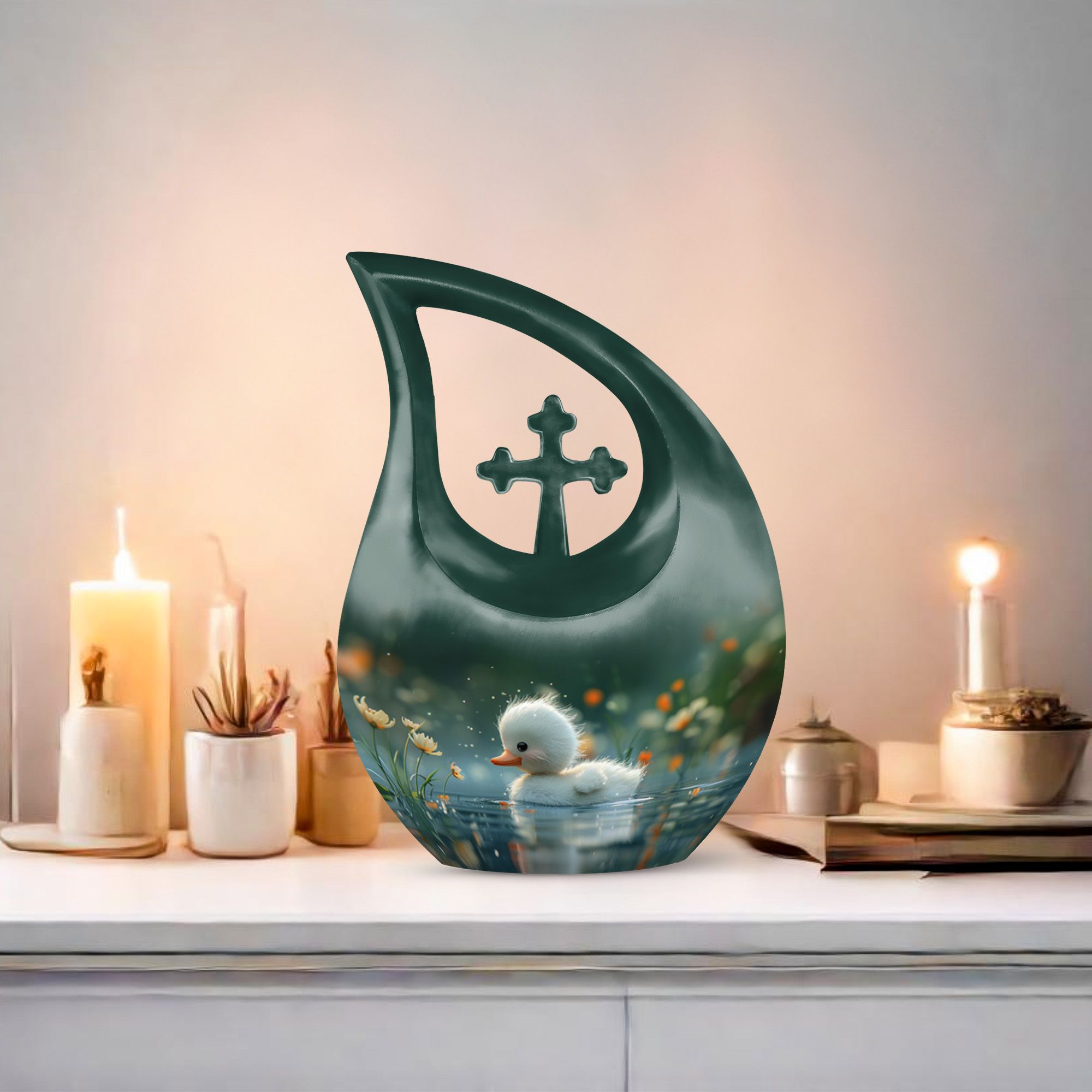 Experience an intimate connection with your beloved one, as you safely store their remains in our Dewy Dawn Duckling Urn, a small urn crafted for preserving memories. Emanating a thematic charm of dewy dawn, this large urn stands tall at 10 inches, showcasing a symbolic Cross Drop pattern. The construction material is premium aluminum, known for its durability and lightweight characteristics, making the urn weigh only 3.3 pounds. The urn provides adequate storage for remains, possessing a capacity of 200 cubic inches. The package contains a velvet pouch for tastefully containing the ashes. For that personal touch, buyers have an option to personalize the urn with engraved names, fostering a unique, sentimental attachment. This urn is not just a resting place for our loved ones, but a testament to their life. Uncommonly searched as Extra Large Companion Urns or Large Urns for Mother's Ashes, this burial urn makes ideal memorial ceremony supplies. Prioritize remembrance and tribute with our Dewy Dawn Duckling Urn.