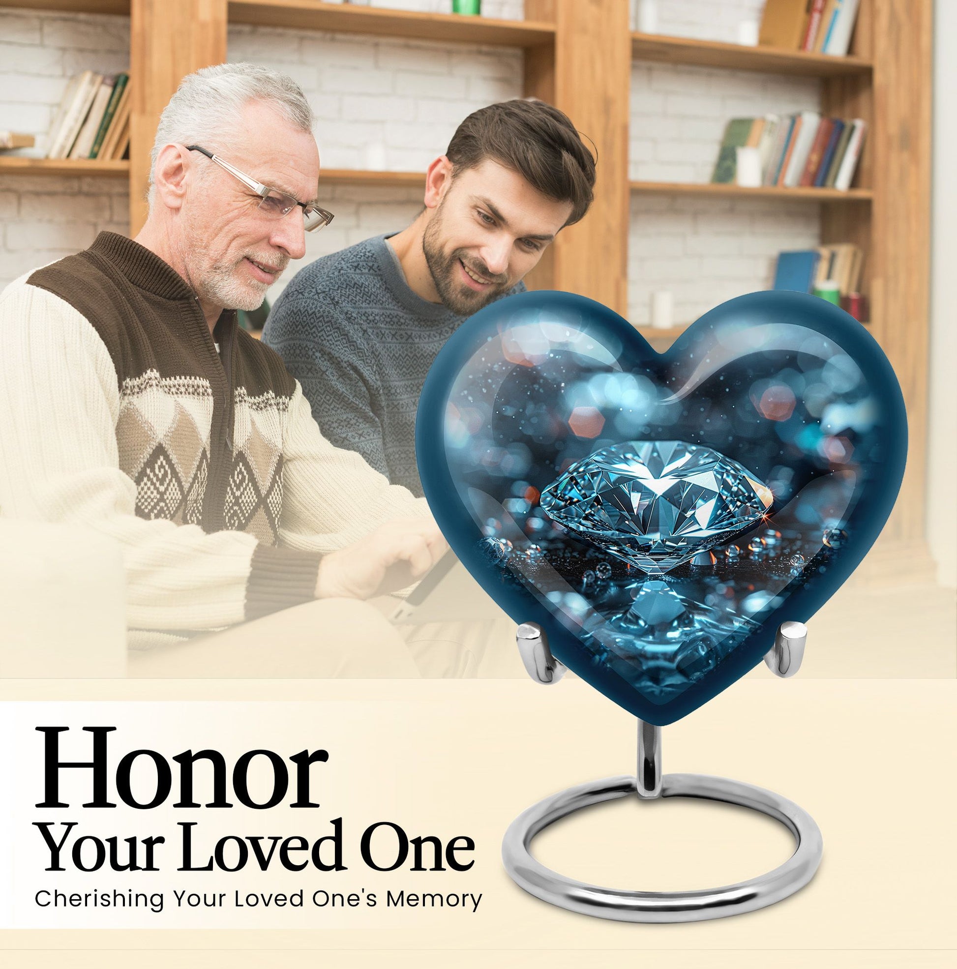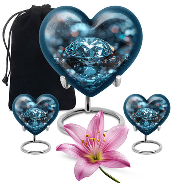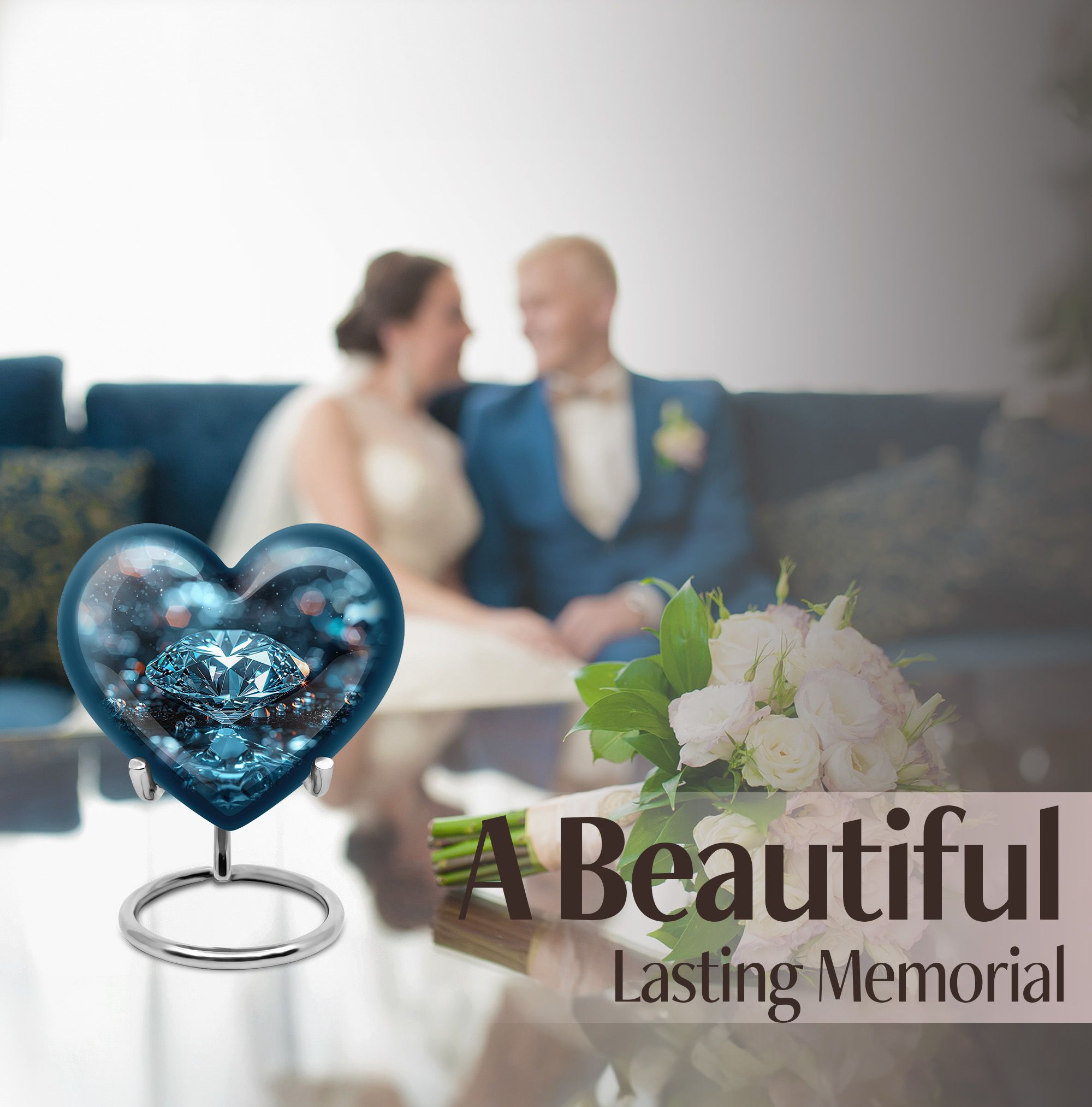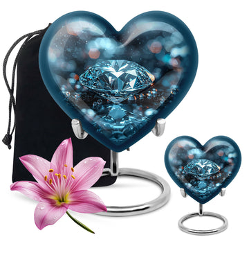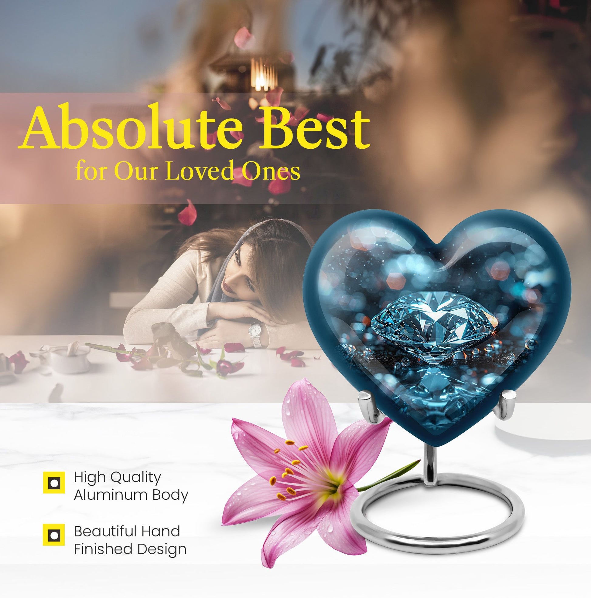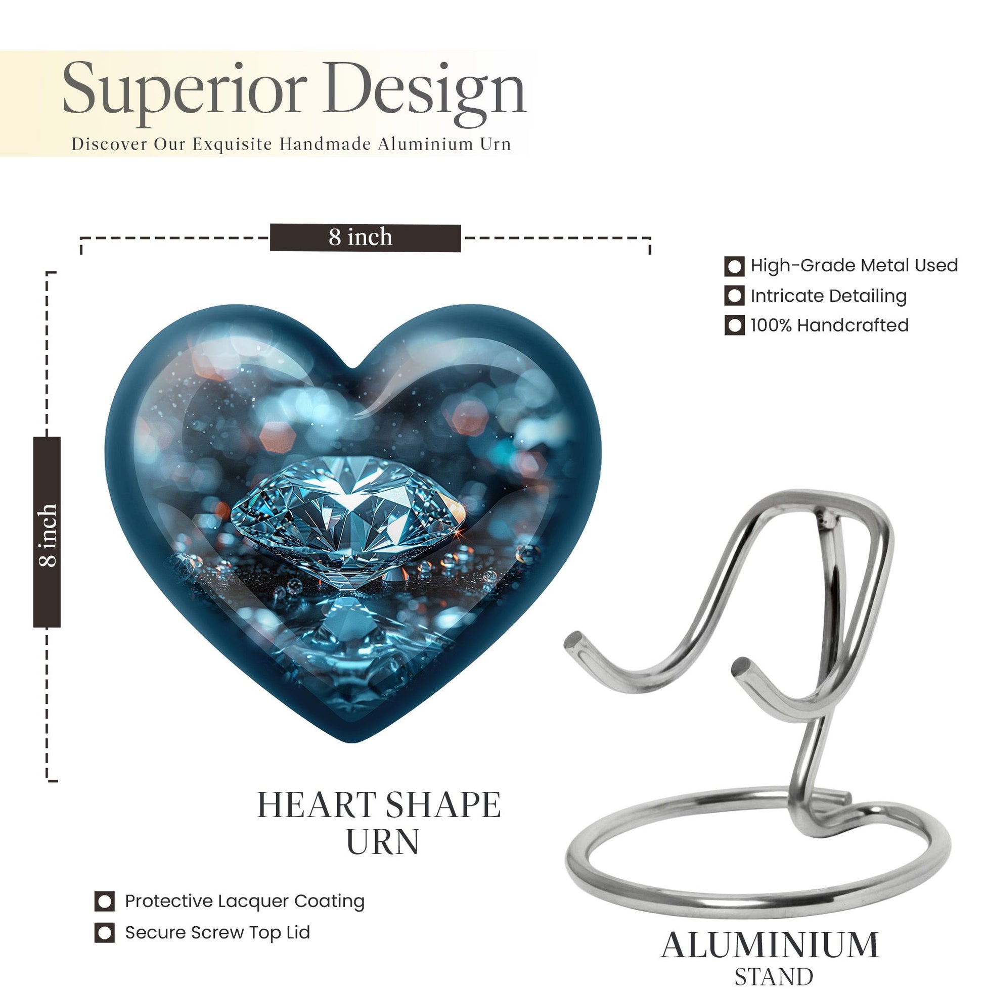 Immerse in the spiritual serenity of this remarkable 'Heart Urn', a cremation urn designed respecting your loved one's memory. This 10-inch cremation urn, skillfully crafted from high-grade aluminium, boasts a significant weight of 3.3 pounds. The heartful urn maintains a unique abstract theme, underscoring its large size that can accommodate up to 200 cubic inches of ashes. The urn is complementarily provided with a velvet pouch ensuring reliable containment and respecting your needs for a funeral ceremony. For a meaningful touch, we offer further customization where you can personalize this urn with engraved names. Enhance your ceremonial accessory collection, our cremation urn has a multipurpose advantage as it can also be utilized as a burial urn for cremation or even a Photo Frame. Resonate the memories with our urn, constructed with utmost authenticity and passion. Religiously acknowledging the diamond urn aspect, our urn serves as a reminder of the eternal connection with your loved ones.