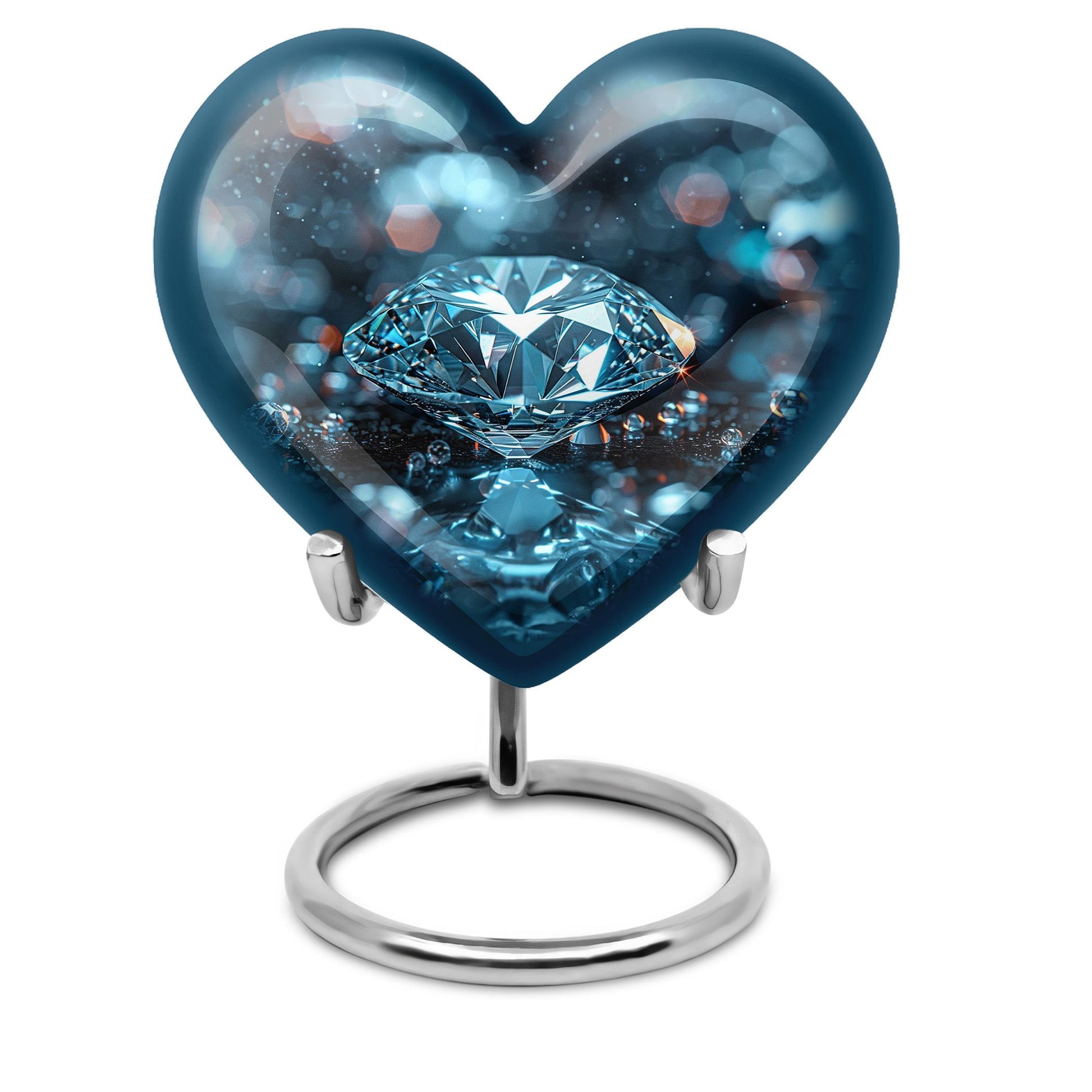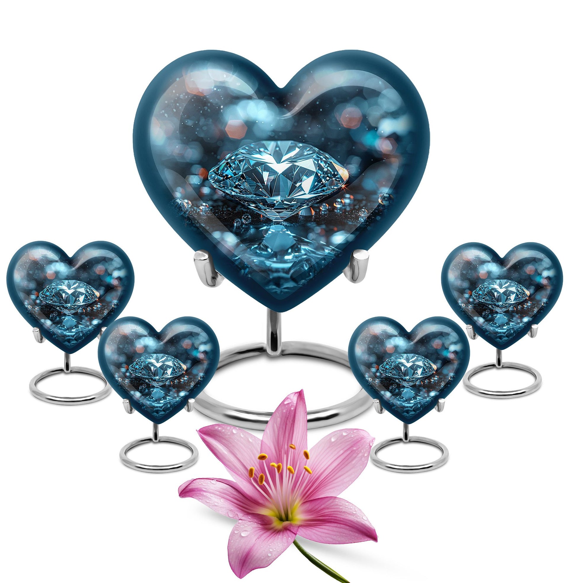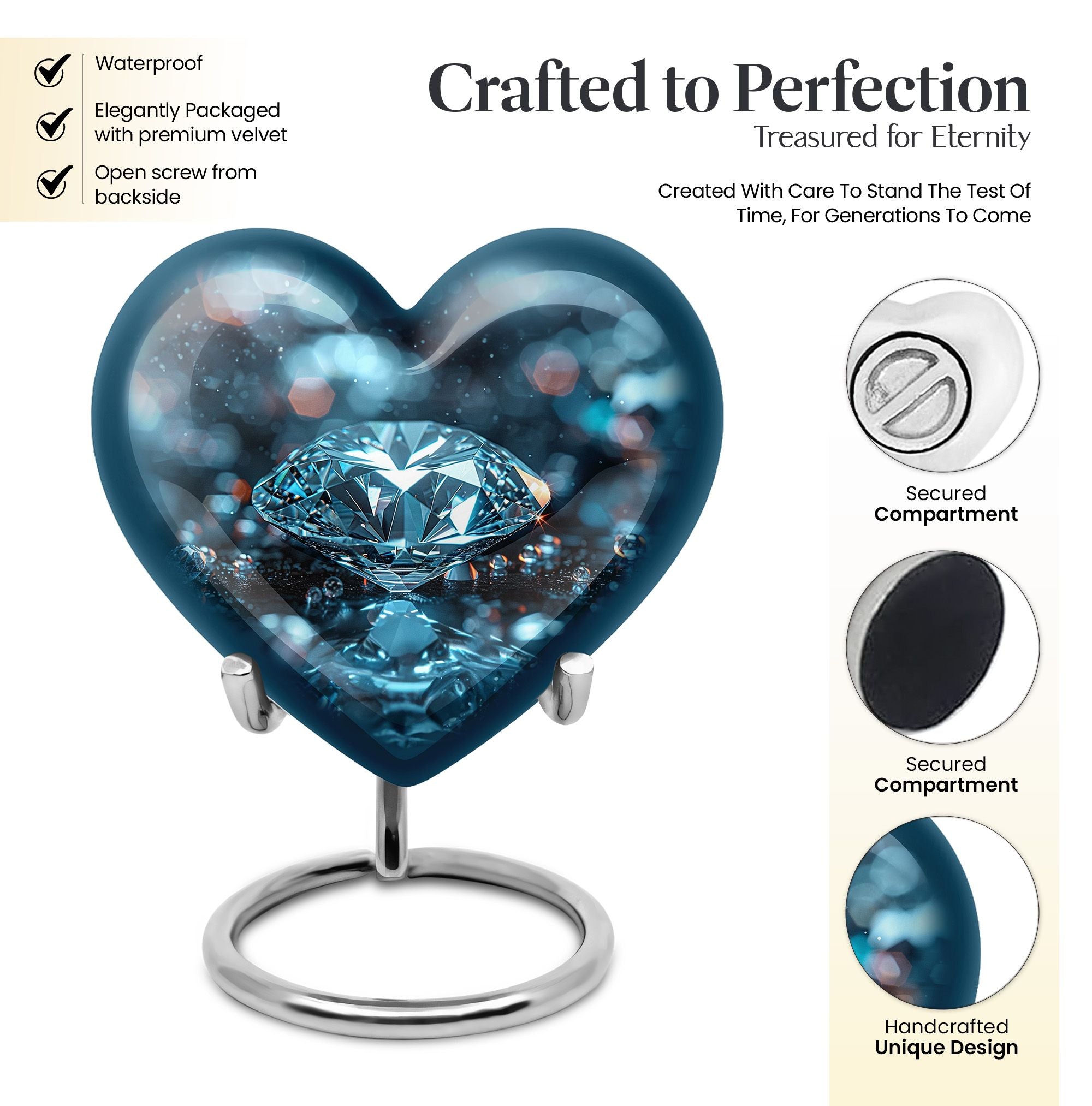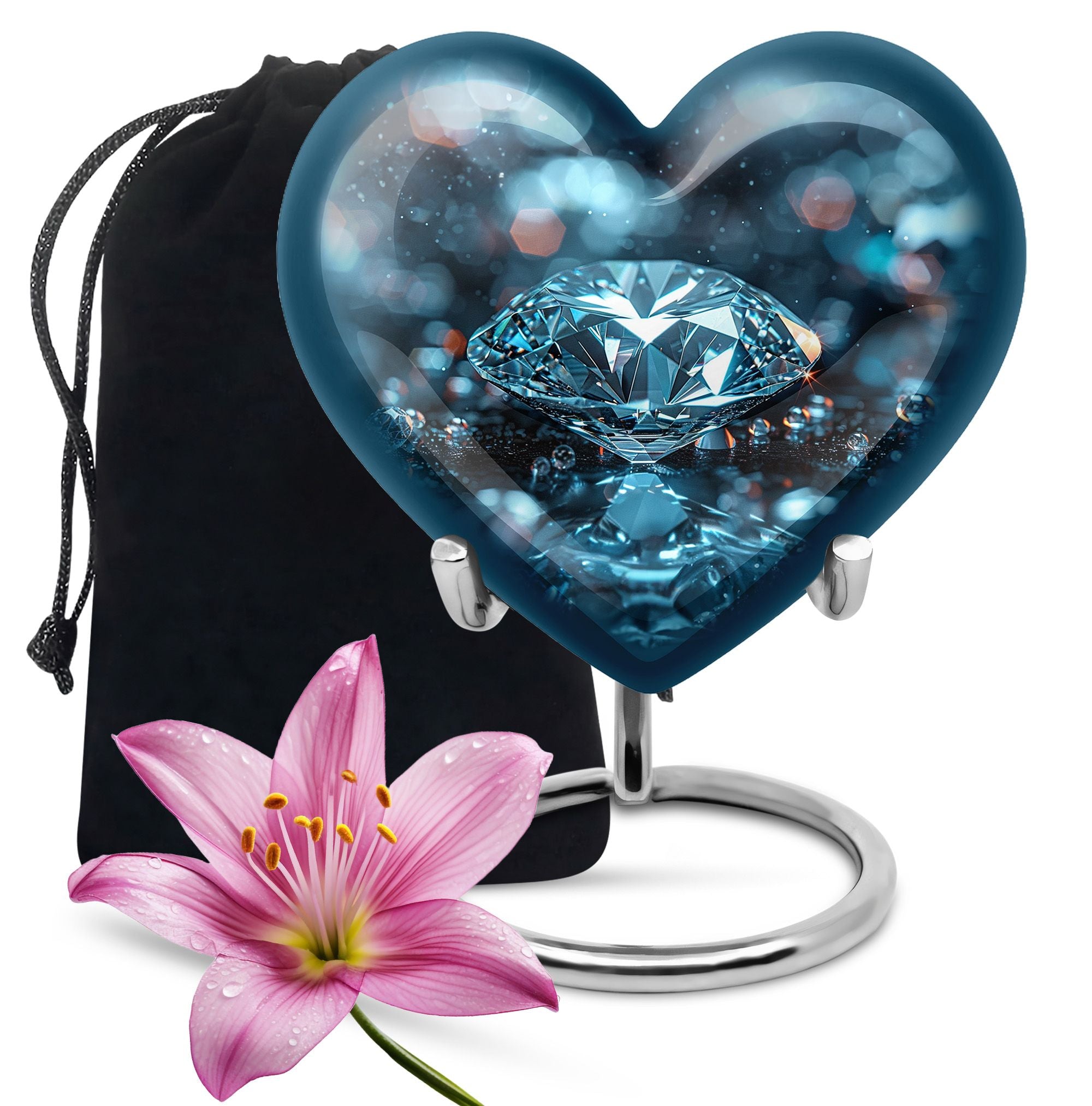 Immerse in the spiritual serenity of this remarkable 'Heart Urn', a cremation urn designed respecting your loved one's memory. This 10-inch cremation urn, skillfully crafted from high-grade aluminium, boasts a significant weight of 3.3 pounds. The heartful urn maintains a unique abstract theme, underscoring its large size that can accommodate up to 200 cubic inches of ashes. The urn is complementarily provided with a velvet pouch ensuring reliable containment and respecting your needs for a funeral ceremony. For a meaningful touch, we offer further customization where you can personalize this urn with engraved names. Enhance your ceremonial accessory collection, our cremation urn has a multipurpose advantage as it can also be utilized as a burial urn for cremation or even a Photo Frame. Resonate the memories with our urn, constructed with utmost authenticity and passion. Religiously acknowledging the diamond urn aspect, our urn serves as a reminder of the eternal connection with your loved ones.