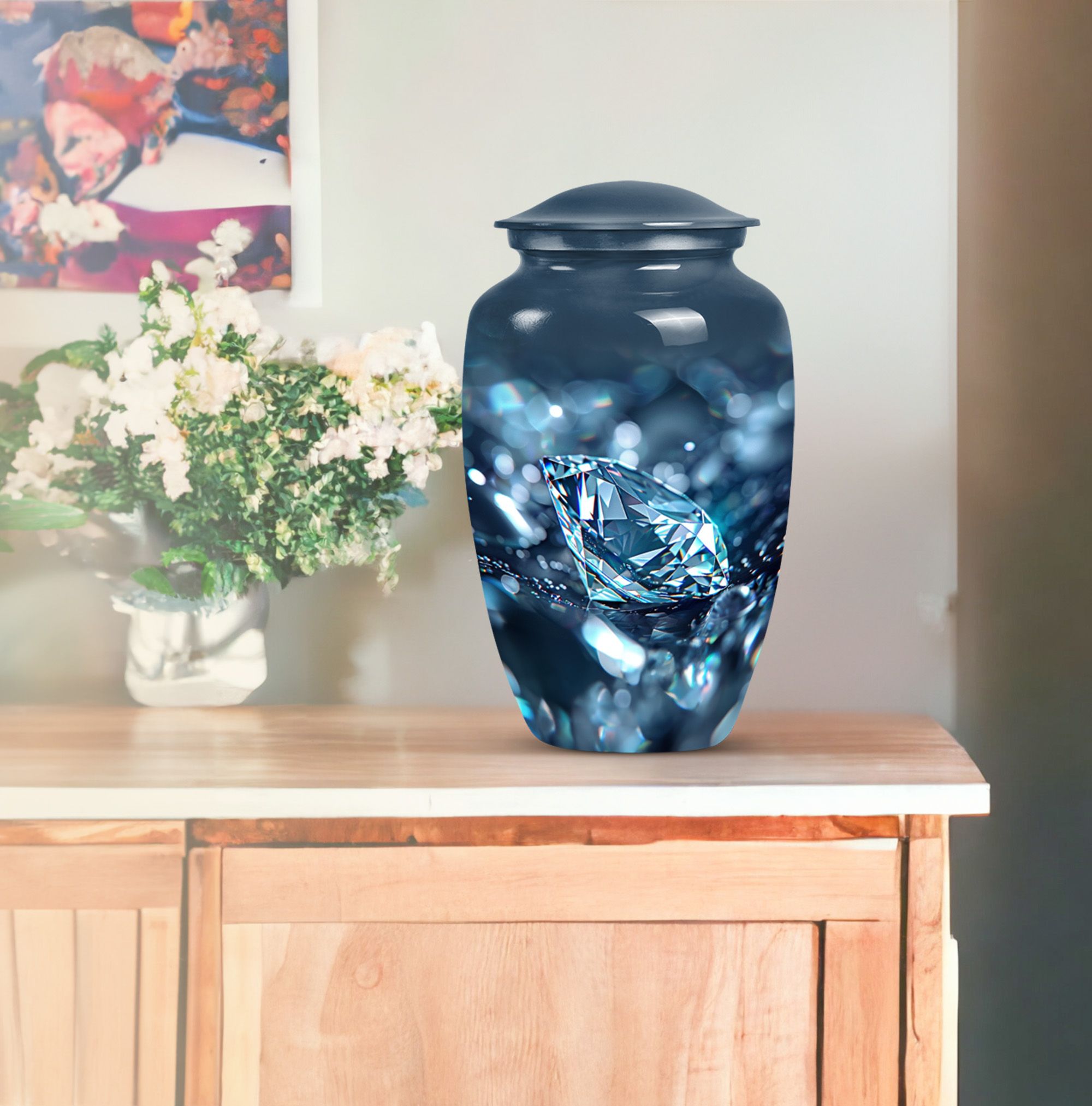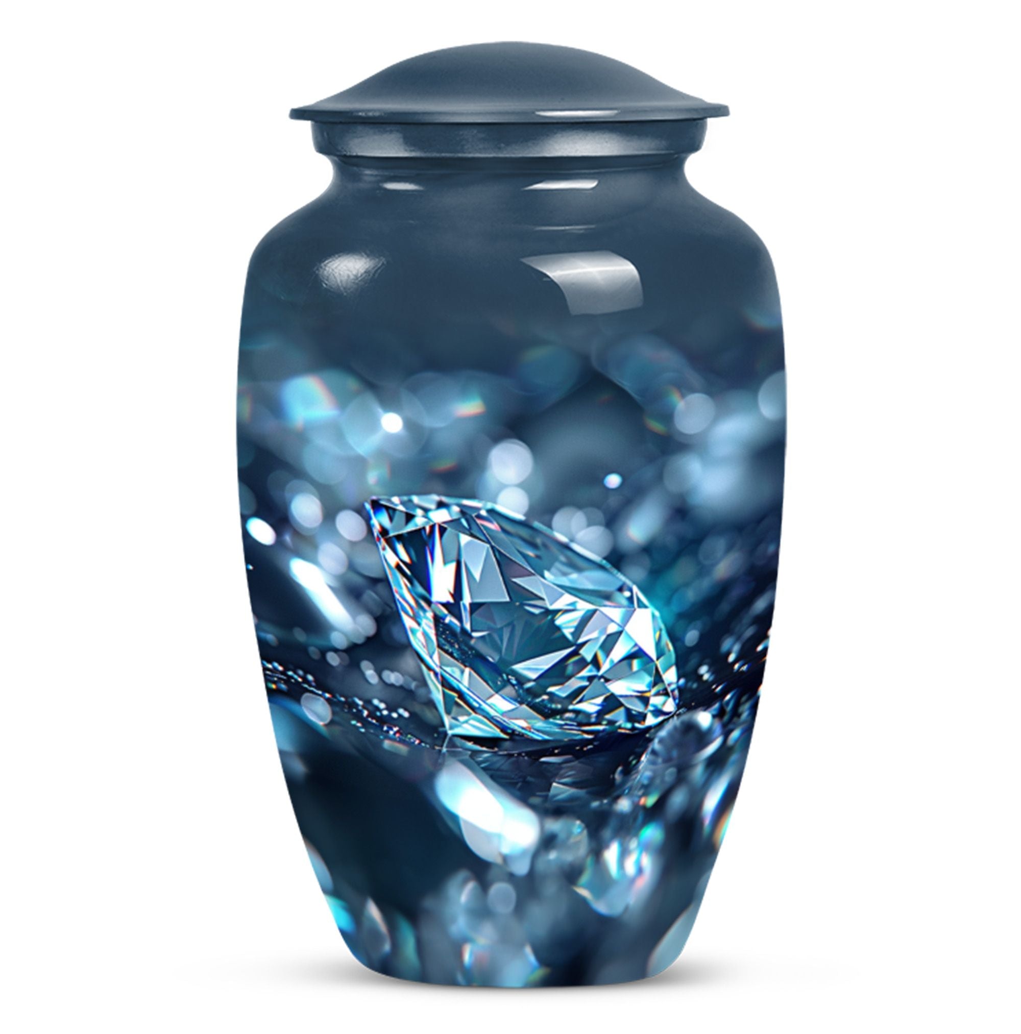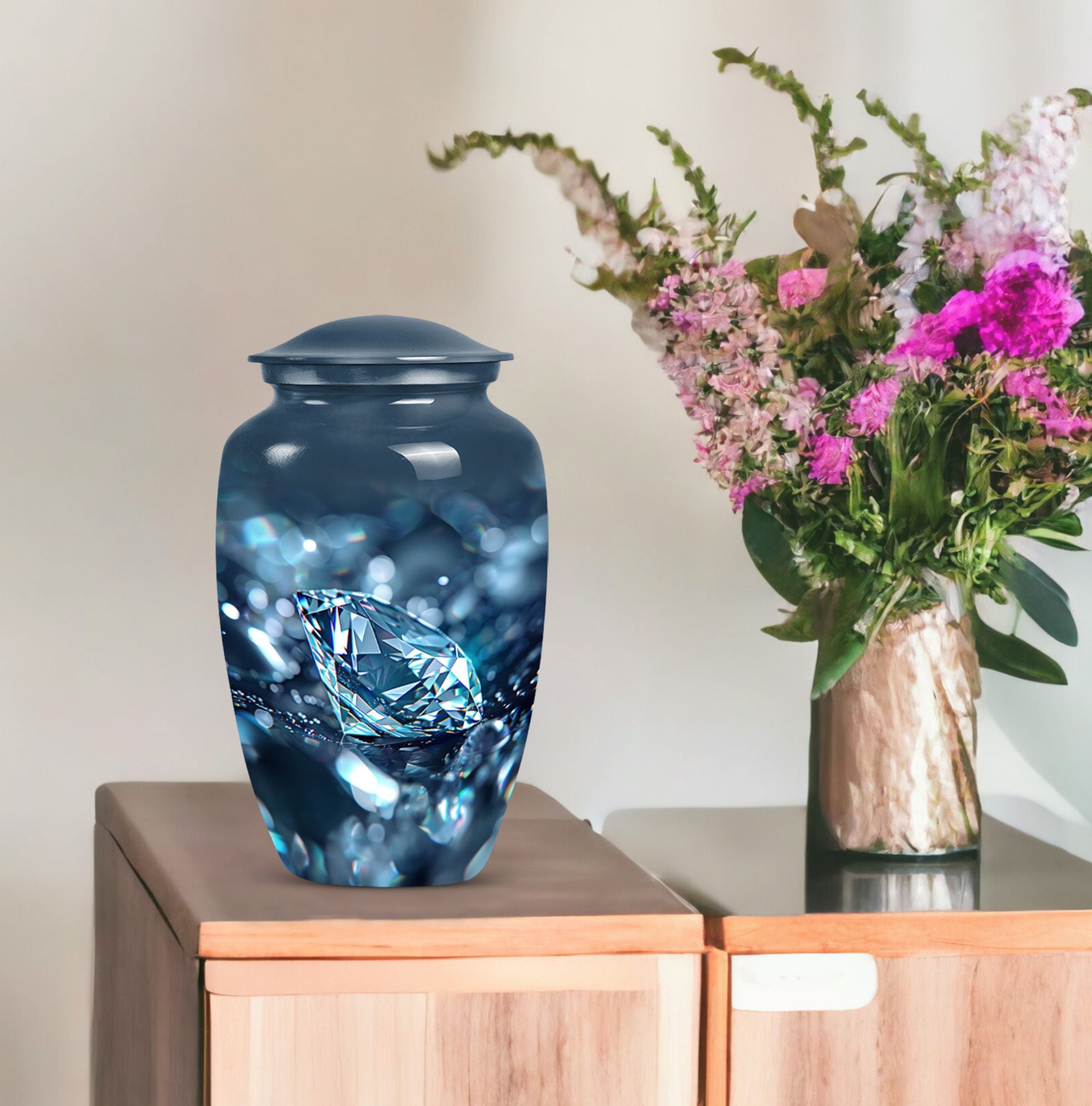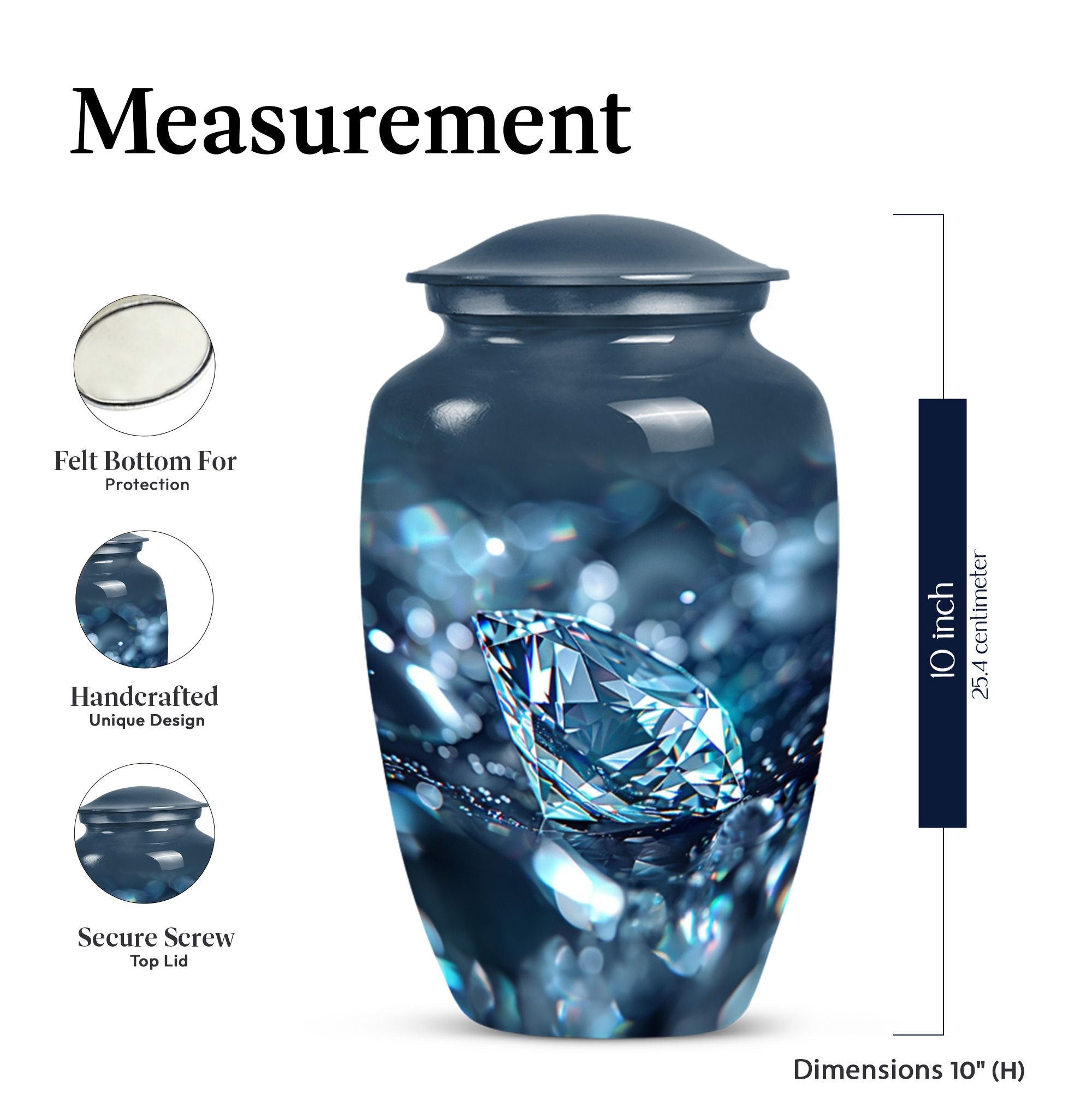 Elegantly constructed, this 10-inch diamond urn is an ideal solution for safekeeping your loving mother's cremation ashes. Highlighting its uniqueness, this classic urn radiates with a trendy abstract theme, blending perfectly with urban homes' decor. Crafted from robust aluminium, the urn weighs a sturdy 3.3 pounds, assuring its longevity and durability. With a generous capacity of 200 cubic inches, this large urn is suitable for adult male ashes, meeting diverse requirements. Adorned with the ability for personalization, you can engrave cherished names, binding memories closer to the heart. The set includes a soft velvet pouch for reliable containment and protection of ashes. Uplifting the reverence of ceremonial memorials, this compact urn turns the journey of remembering your loved ones into a personal sanctuary of remembrance. Suitable keywords for this product include 'cremation urn', 'burial urns for cremation ashes mother' and 'man metal cremation urn'.