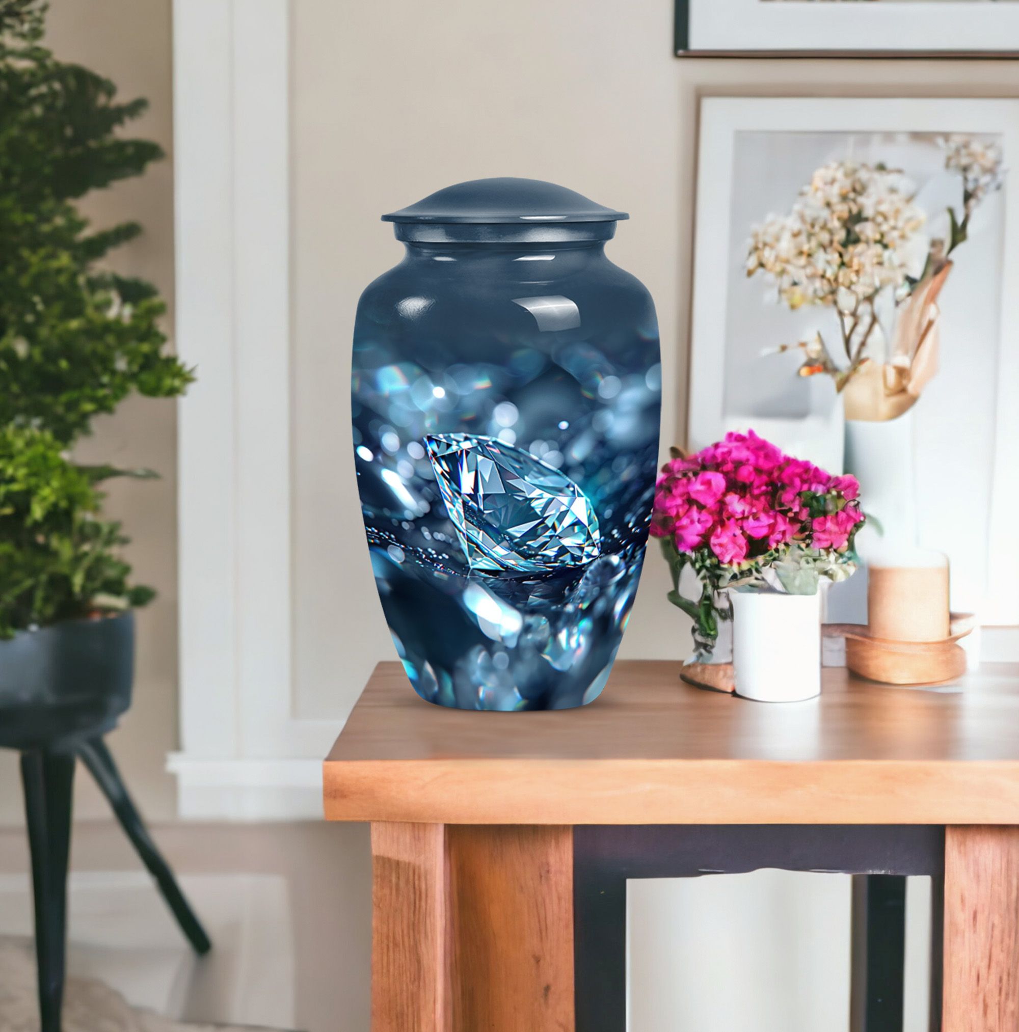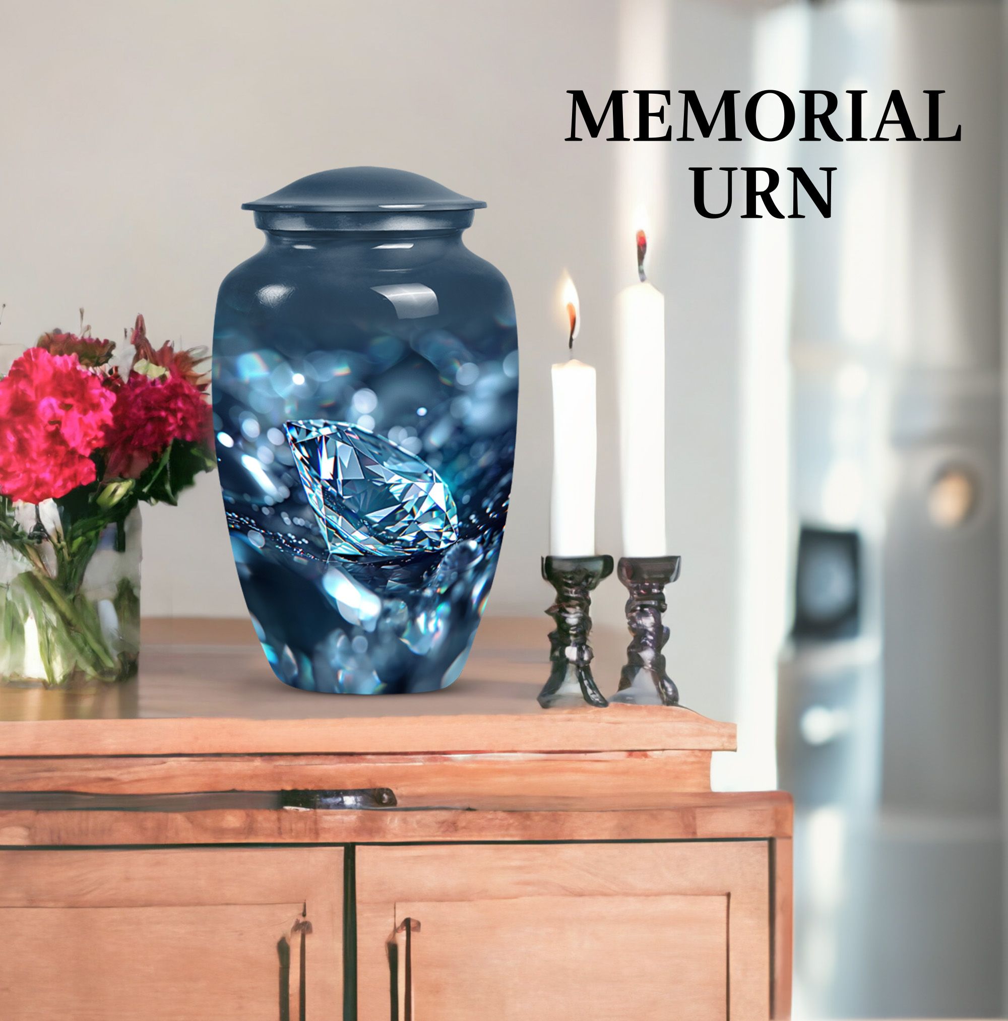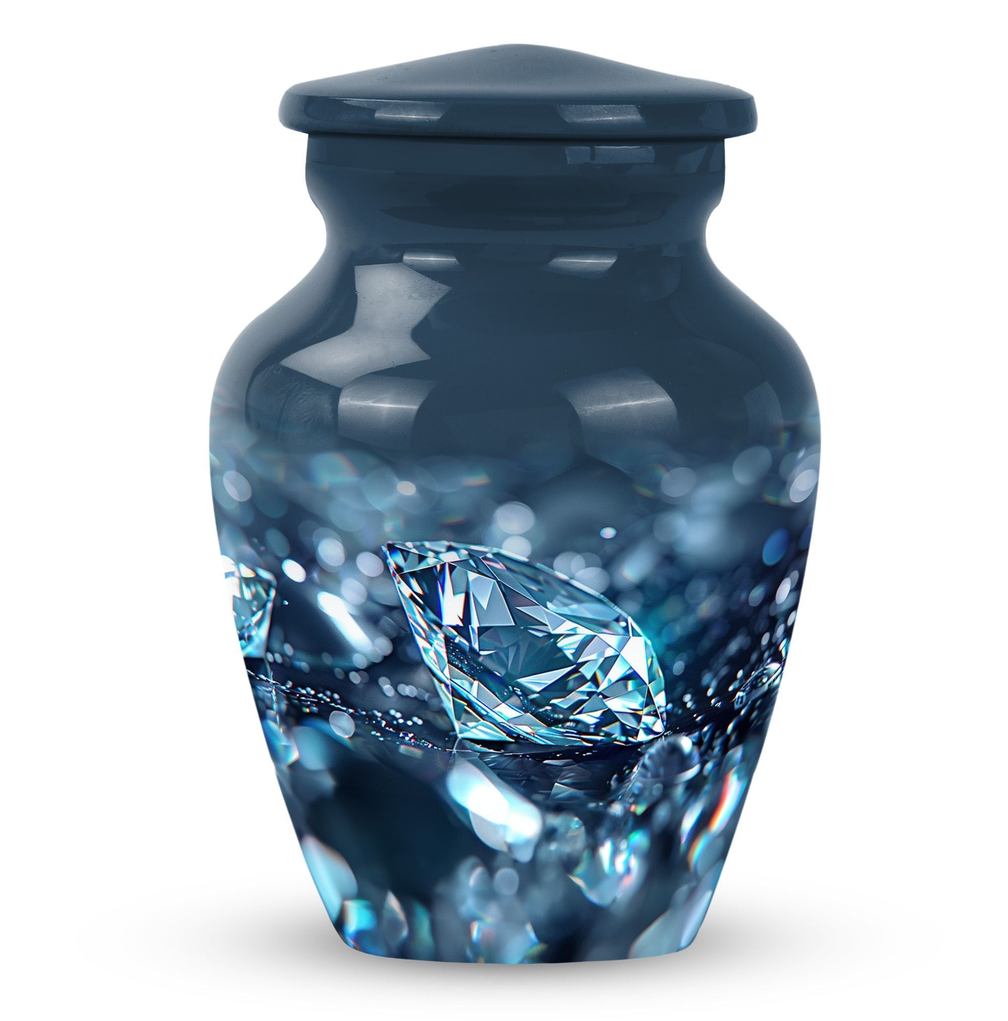 Elegantly constructed, this 10-inch diamond urn is an ideal solution for safekeeping your loving mother's cremation ashes. Highlighting its uniqueness, this classic urn radiates with a trendy abstract theme, blending perfectly with urban homes' decor. Crafted from robust aluminium, the urn weighs a sturdy 3.3 pounds, assuring its longevity and durability. With a generous capacity of 200 cubic inches, this large urn is suitable for adult male ashes, meeting diverse requirements. Adorned with the ability for personalization, you can engrave cherished names, binding memories closer to the heart. The set includes a soft velvet pouch for reliable containment and protection of ashes. Uplifting the reverence of ceremonial memorials, this compact urn turns the journey of remembering your loved ones into a personal sanctuary of remembrance. Suitable keywords for this product include 'cremation urn', 'burial urns for cremation ashes mother' and 'man metal cremation urn'.