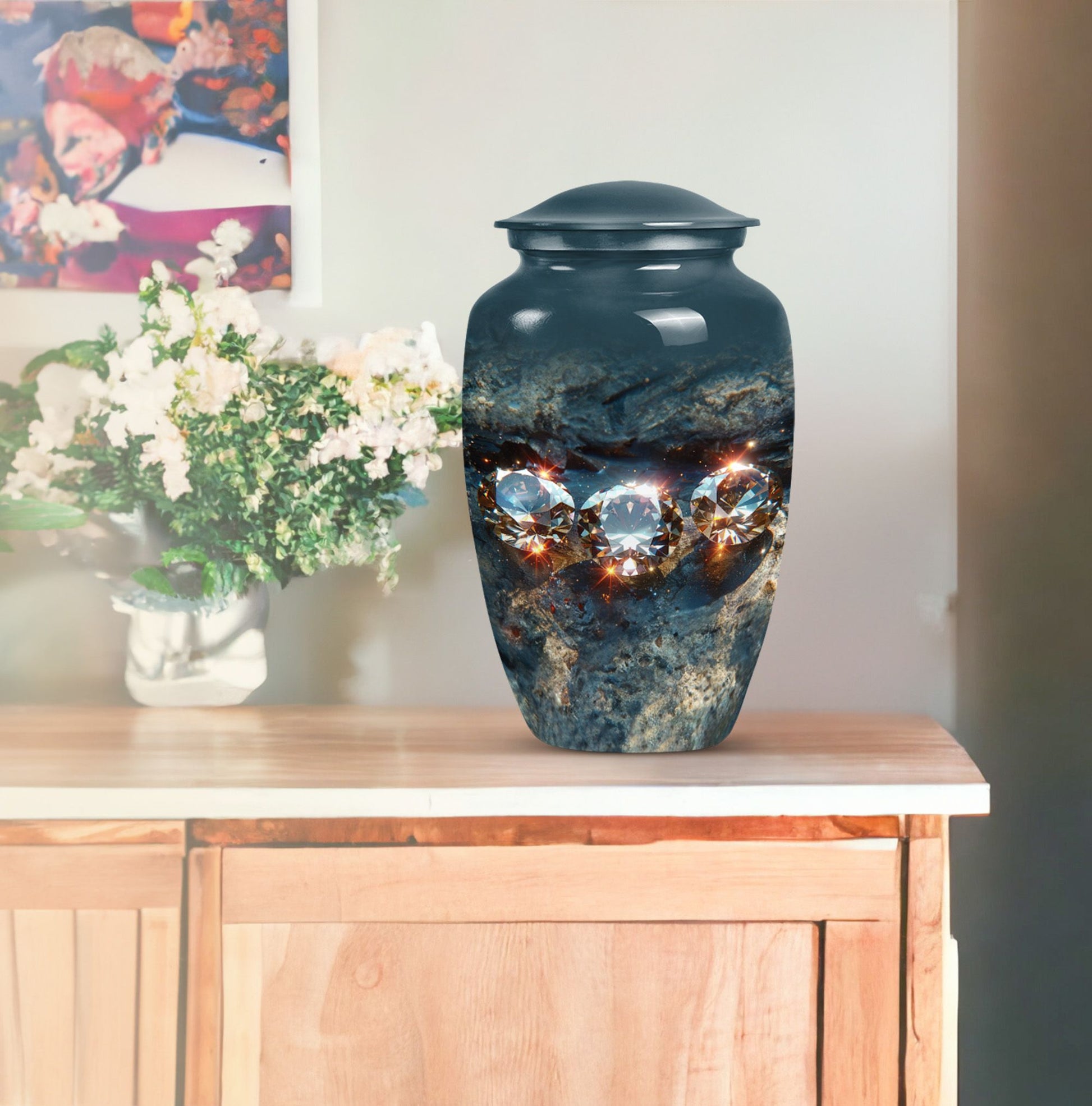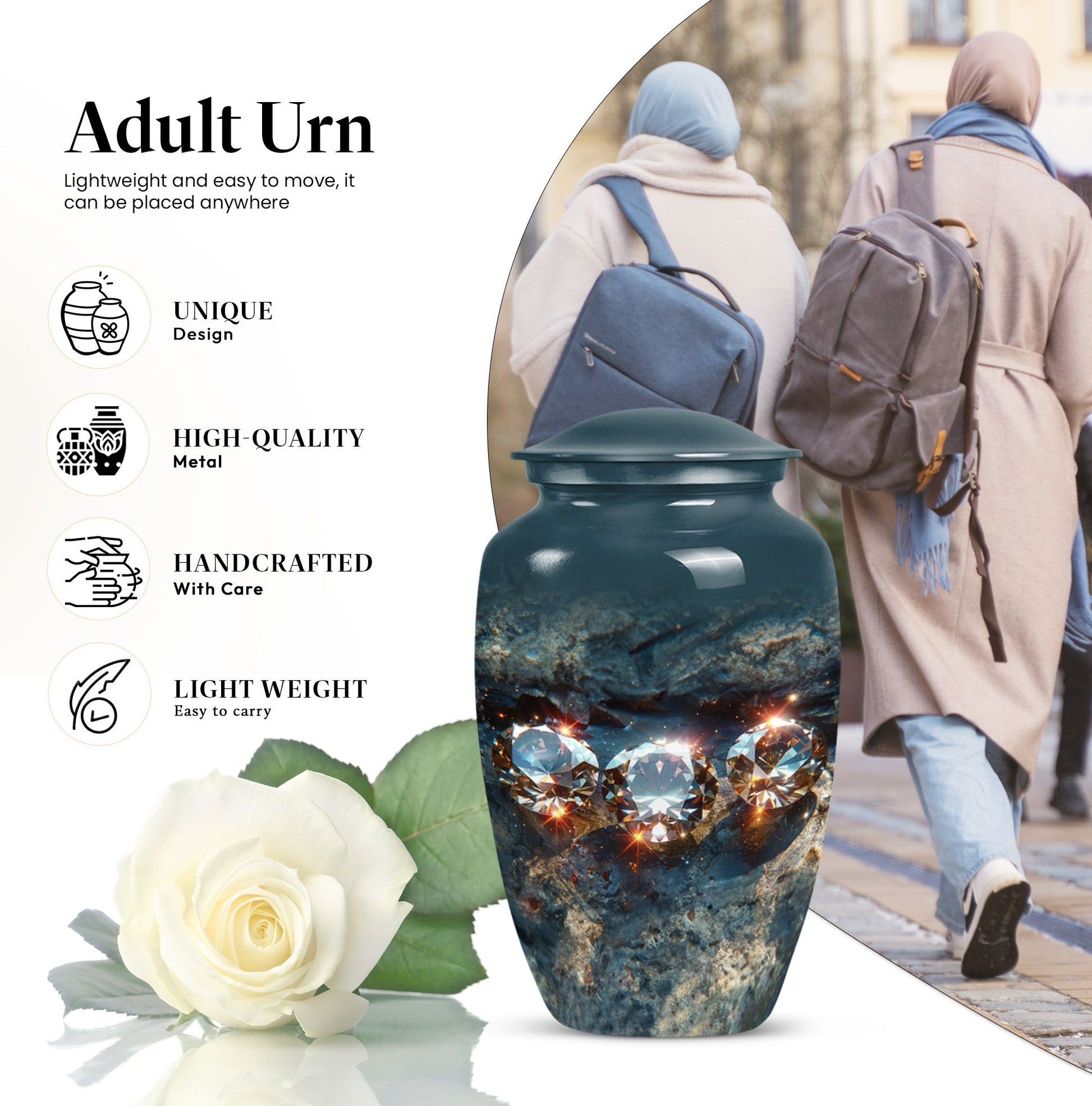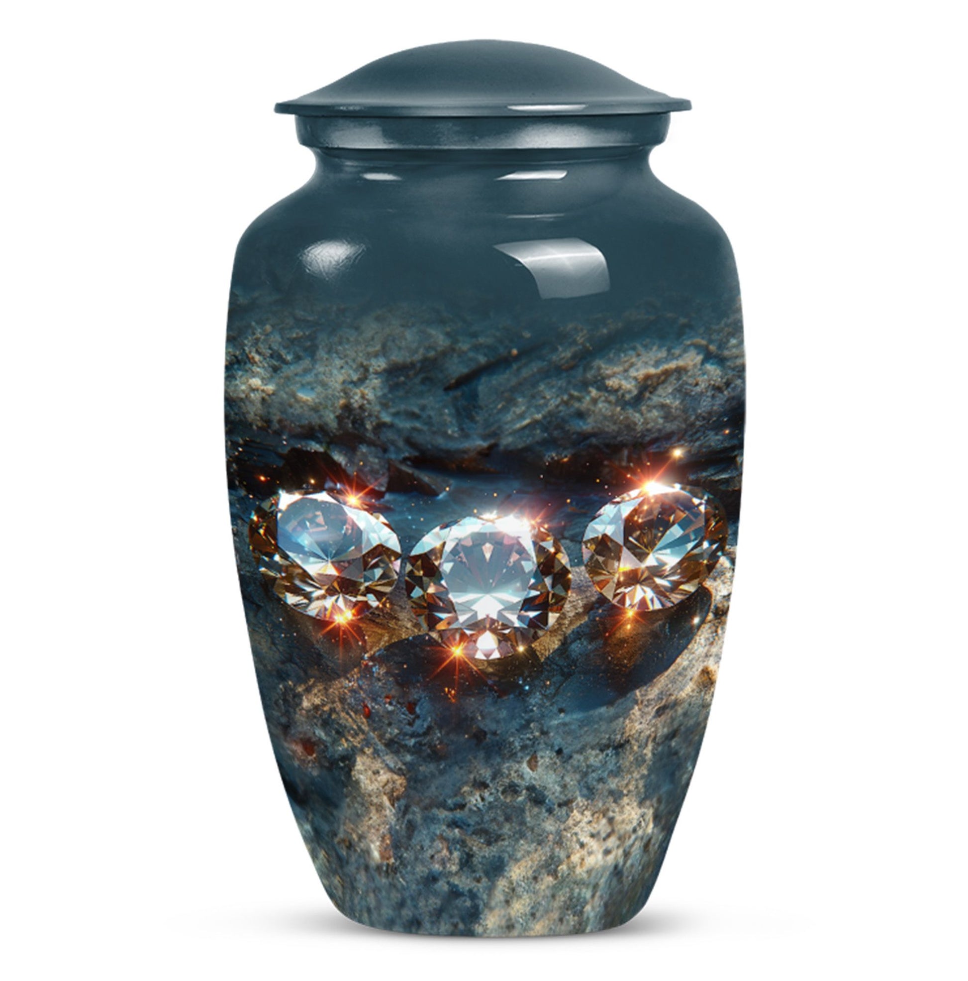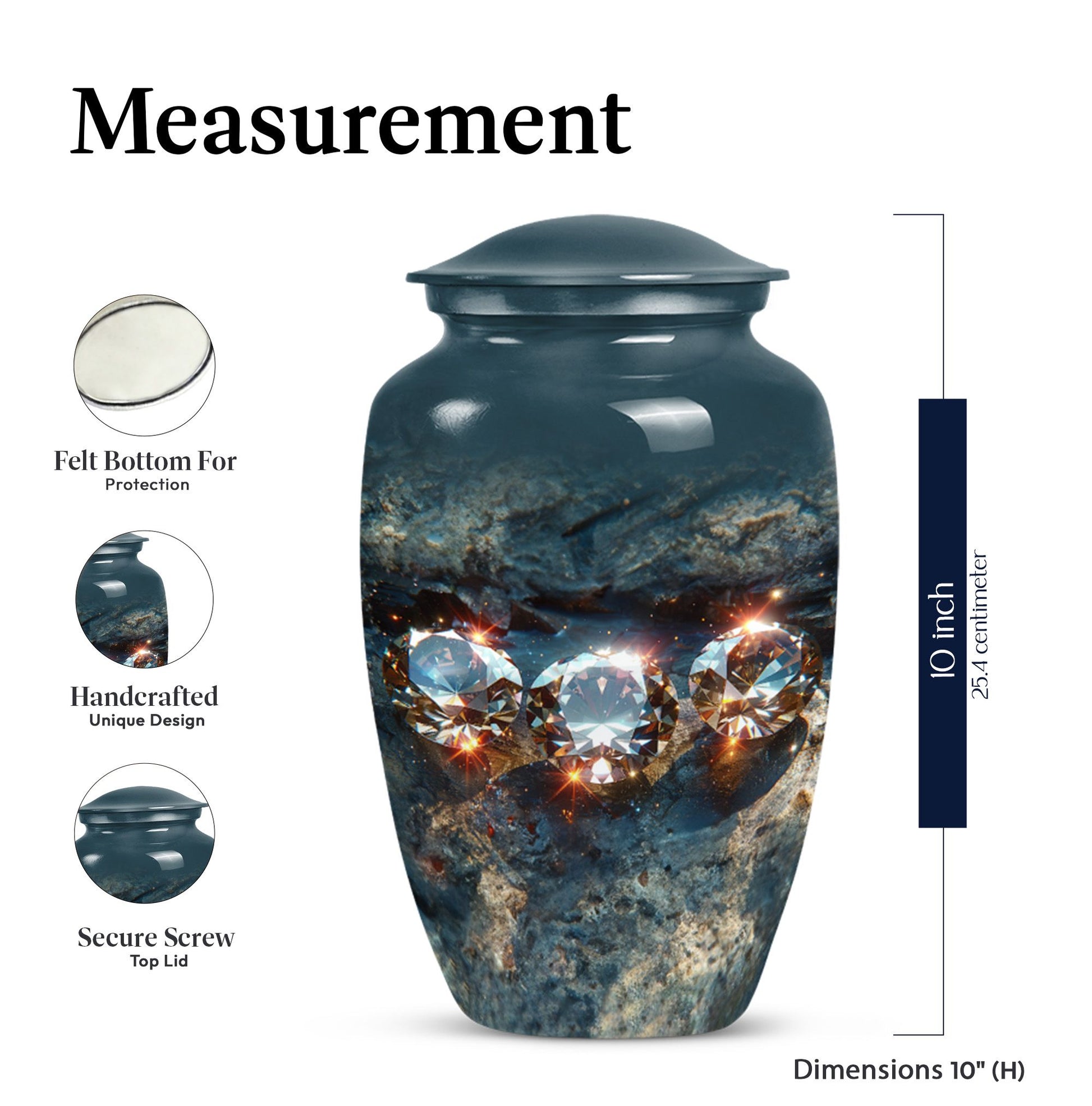 Celebrate the life of your beloved father with this reverent 10-inch diamond urn, a perfect tribute reflecting enduring love and memory. These expertly crafted cremation dad urns weighs 3.3 pounds, showcasing a style that is distinctive, yet traditional. The classic urn has an exquisite abstract theme, constructed from durable aluminium whose strength symbolizes the unbreakable bond between you and your dearly departed. Featuring a sizable capacity of 200 cubic inches, it safeguards your precious memories, as sizeable as life itself. Our human urns come with a soft velvet pouch that delicately cradles the ashes, adding an extra layer of respect. If you're looking for large, affordable burial urns for adult men's ashes, our urns are iridescent and certain to gently capture the light, further symbolizing the eternal spirit of your loved one. Plus, our urns can be personalized with engraved names—a heartwarming reminder of the unique bond shared. This cremation urn is a fitting memorial to keep your loved ones closest to you.