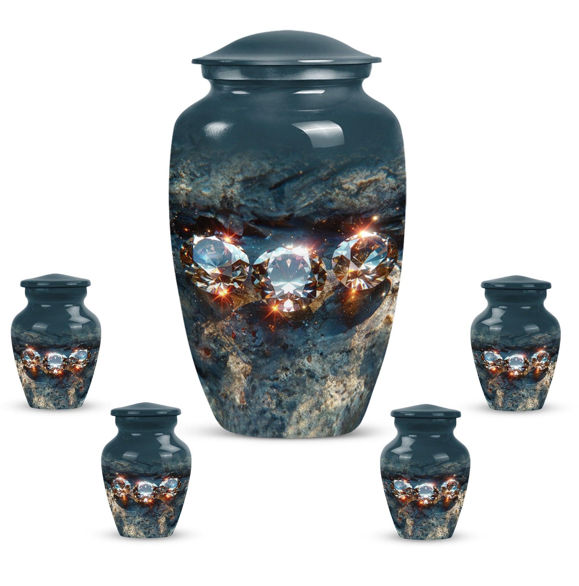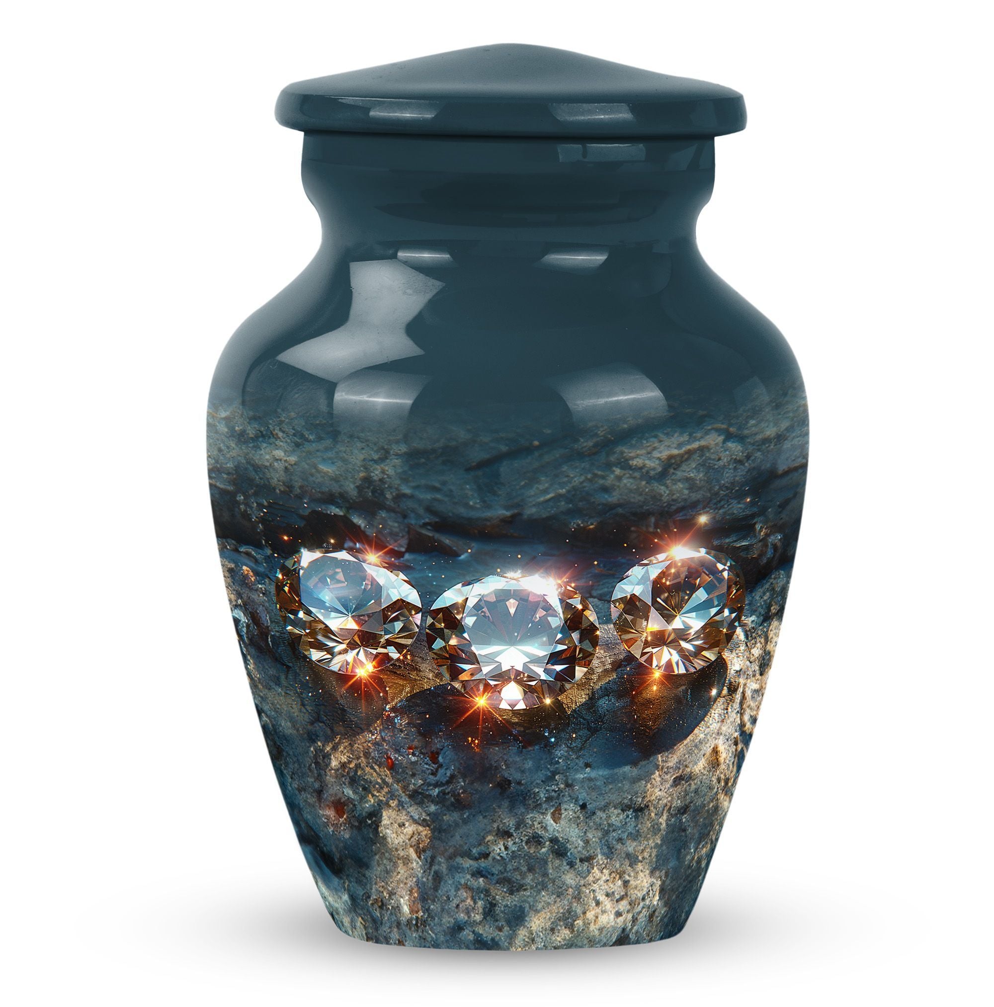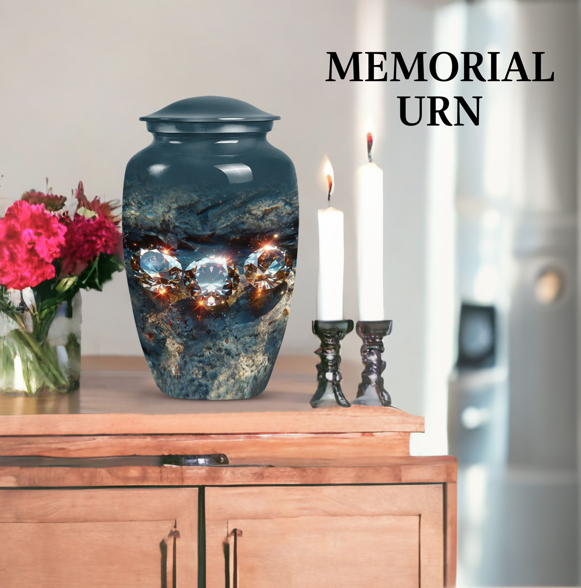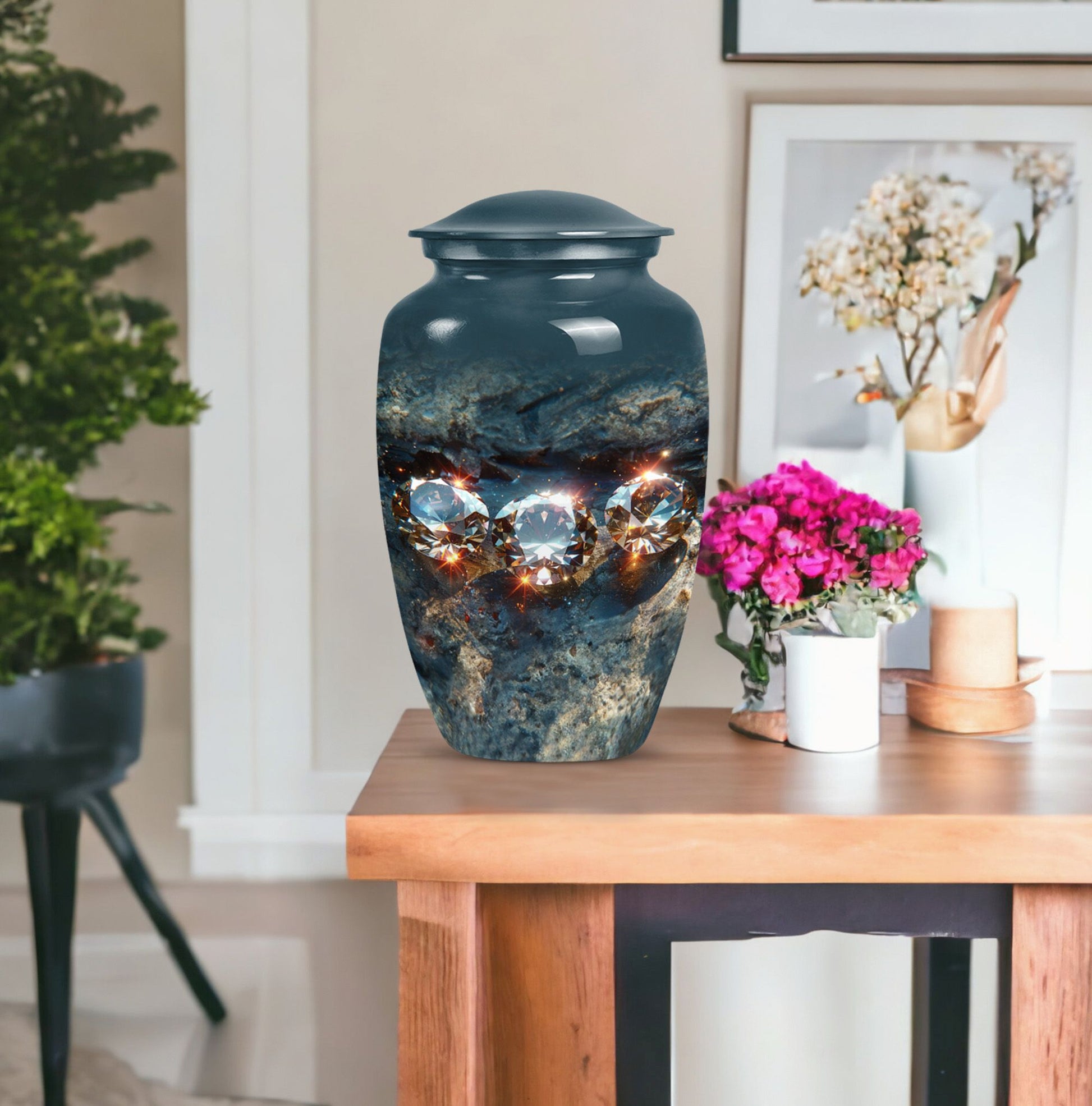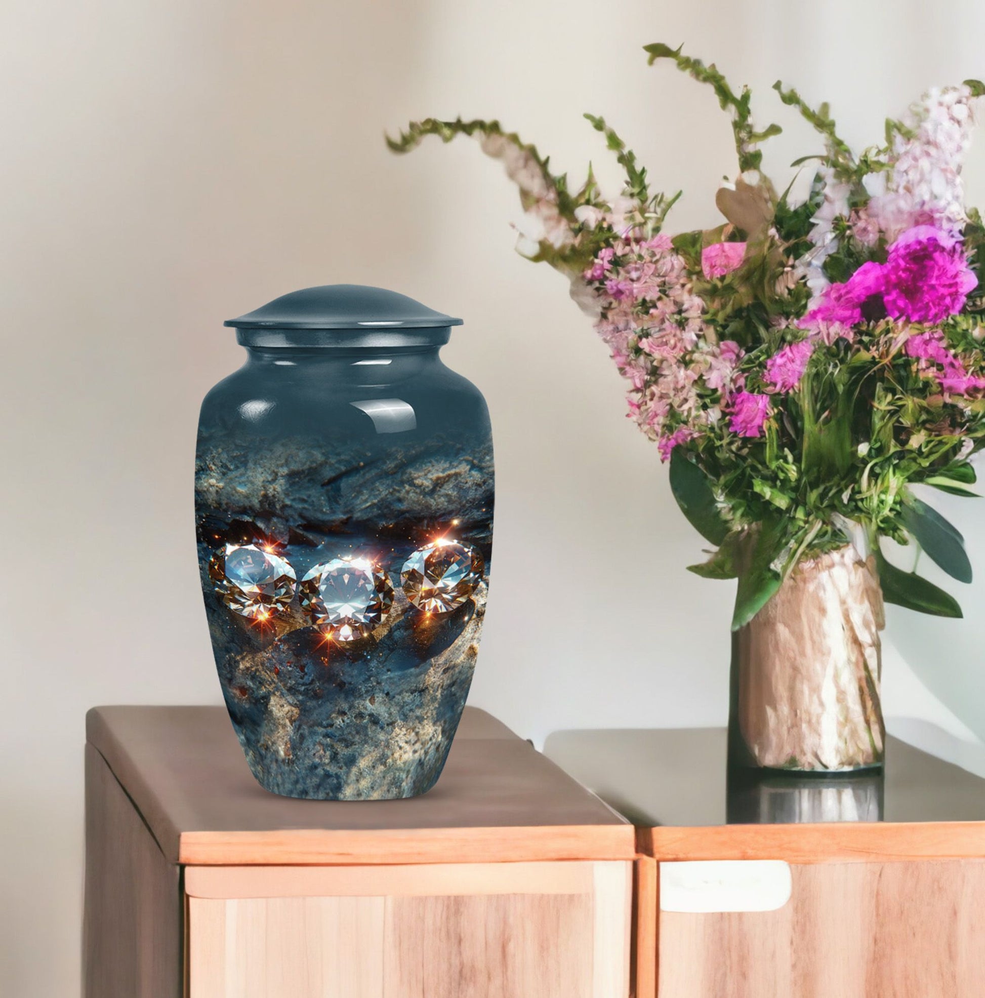 Celebrate the life of your beloved father with this reverent 10-inch diamond urn, a perfect tribute reflecting enduring love and memory. These expertly crafted cremation dad urns weighs 3.3 pounds, showcasing a style that is distinctive, yet traditional. The classic urn has an exquisite abstract theme, constructed from durable aluminium whose strength symbolizes the unbreakable bond between you and your dearly departed. Featuring a sizable capacity of 200 cubic inches, it safeguards your precious memories, as sizeable as life itself. Our human urns come with a soft velvet pouch that delicately cradles the ashes, adding an extra layer of respect. If you're looking for large, affordable burial urns for adult men's ashes, our urns are iridescent and certain to gently capture the light, further symbolizing the eternal spirit of your loved one. Plus, our urns can be personalized with engraved names—a heartwarming reminder of the unique bond shared. This cremation urn is a fitting memorial to keep your loved ones closest to you.