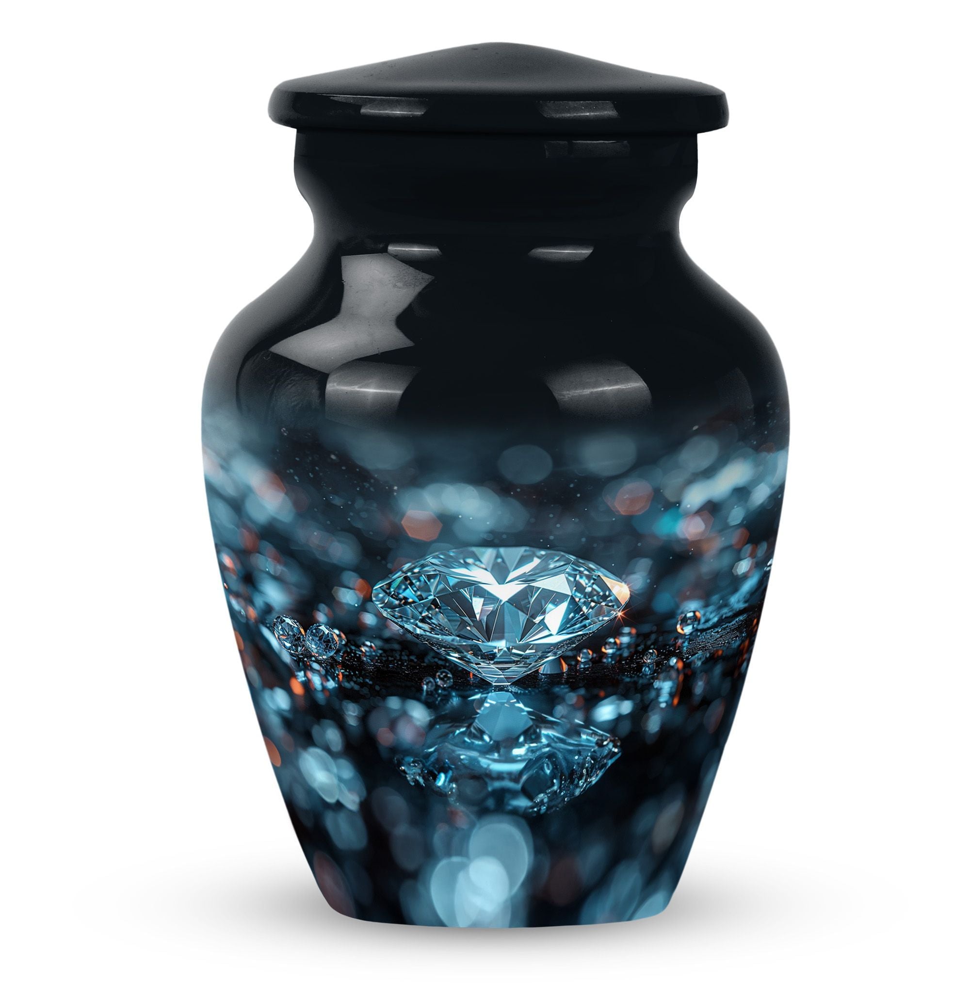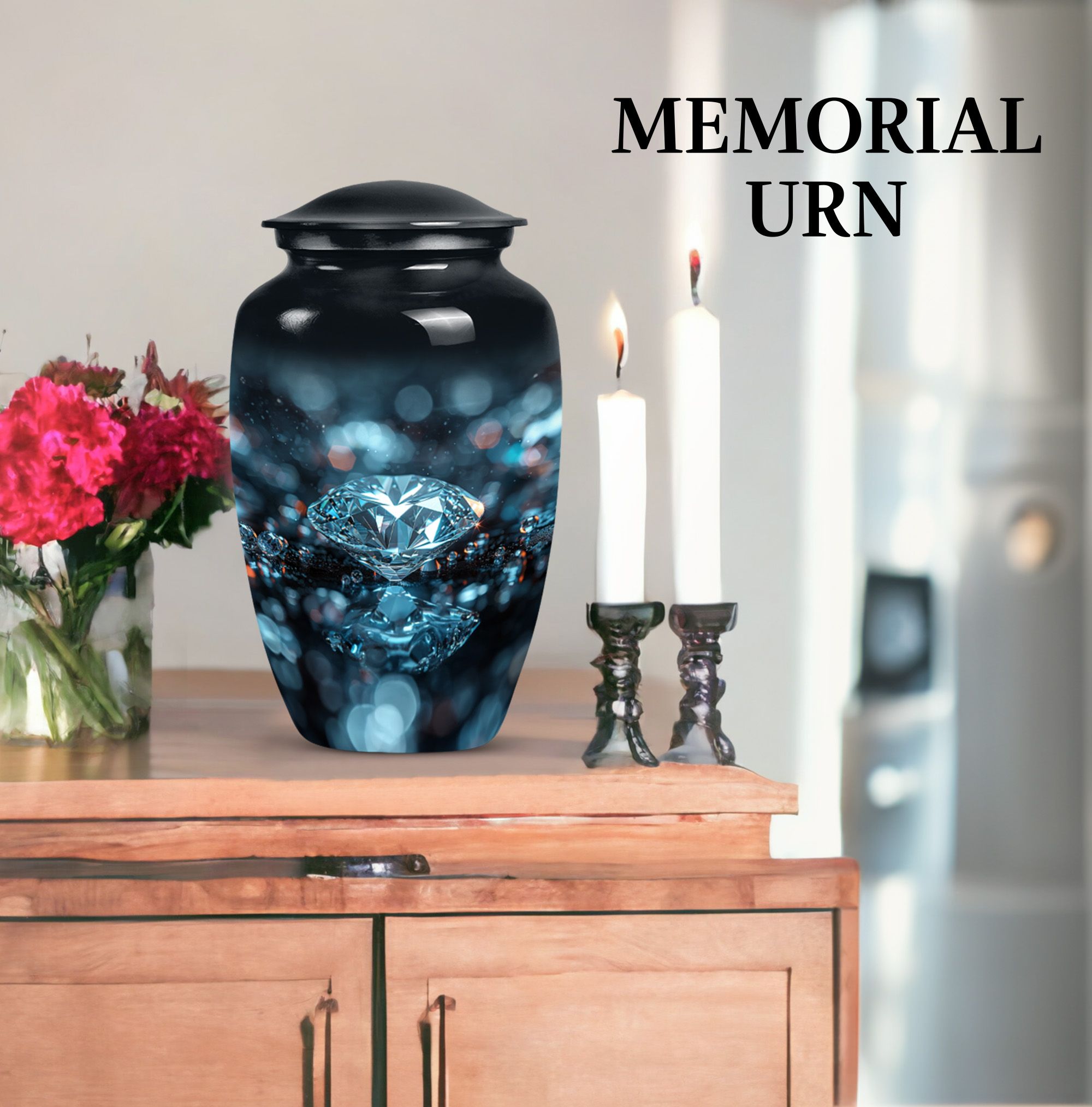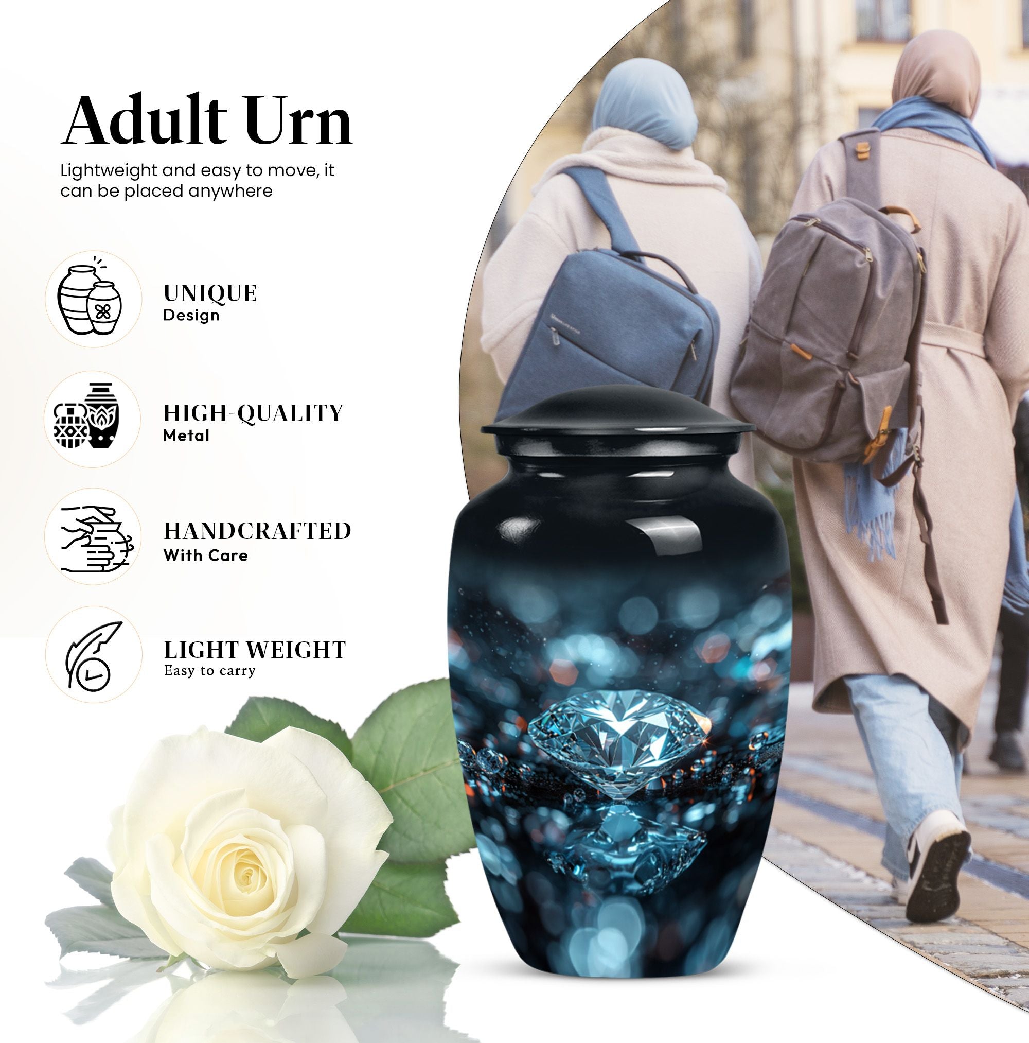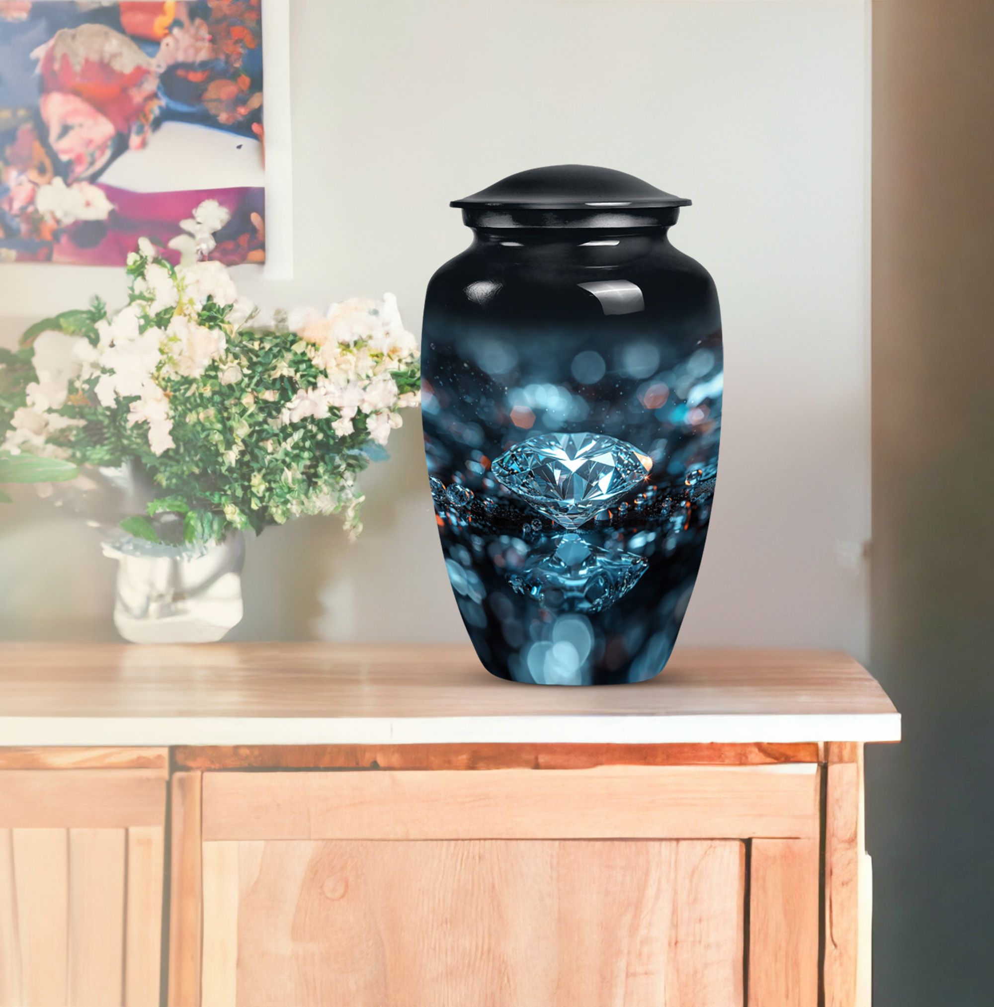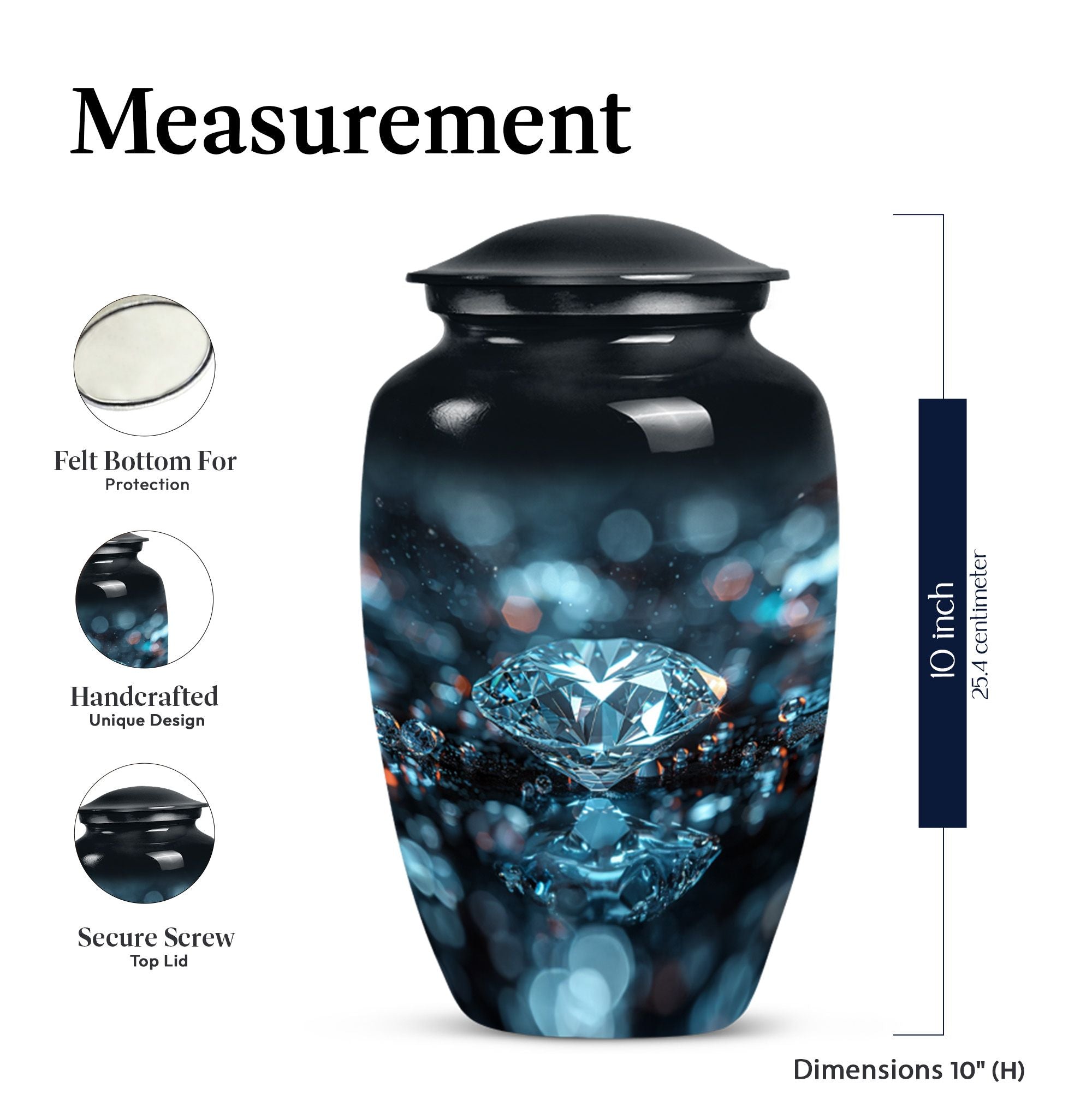 Experience serenity during times of loss with the uniquely-styled abstract-themed diamond urn, ideal for memorial ceremonies. Crafted from durable aluminum, this 10-inch cremation urn for ashes balances grace with tradition, creating a lasting homage for your loved one. Its total capacity of 200 cubic inches comfortably contains the cremated remains, weighing approximately 3.3 pounds. In addition, it accommodates simple personalization through name engraving, enhancing its sentimental value. The urn is packaged along with a velvet pouch, ensuring secure containment of the ashes. This meticulously designed, large-sized urn serves multiple purposes, including as a burial urn for cremation or a funeral urn for adult ashes. Stand out with the unique shape, turn tender moments into treasured memories, and bring a comforting sense of peace to your grieving heart. Note that although the design is excluded, the allure of the classic urn aesthetic remains intact.