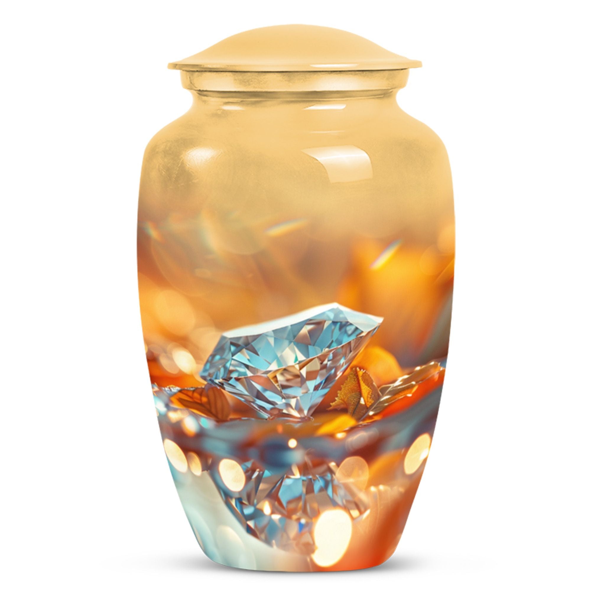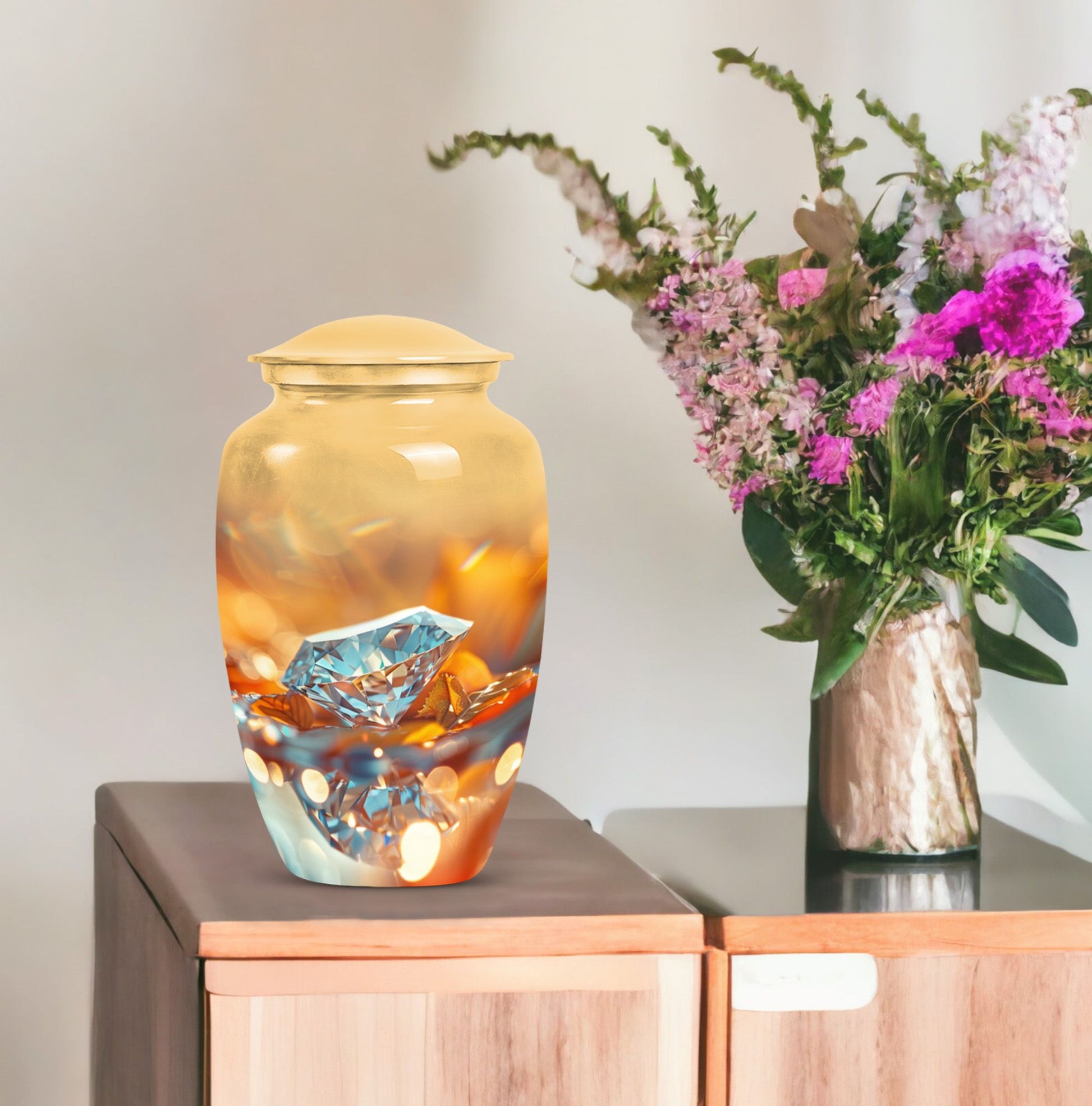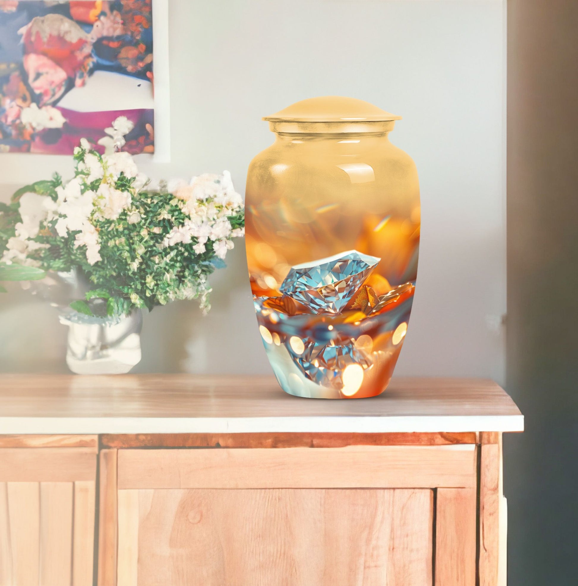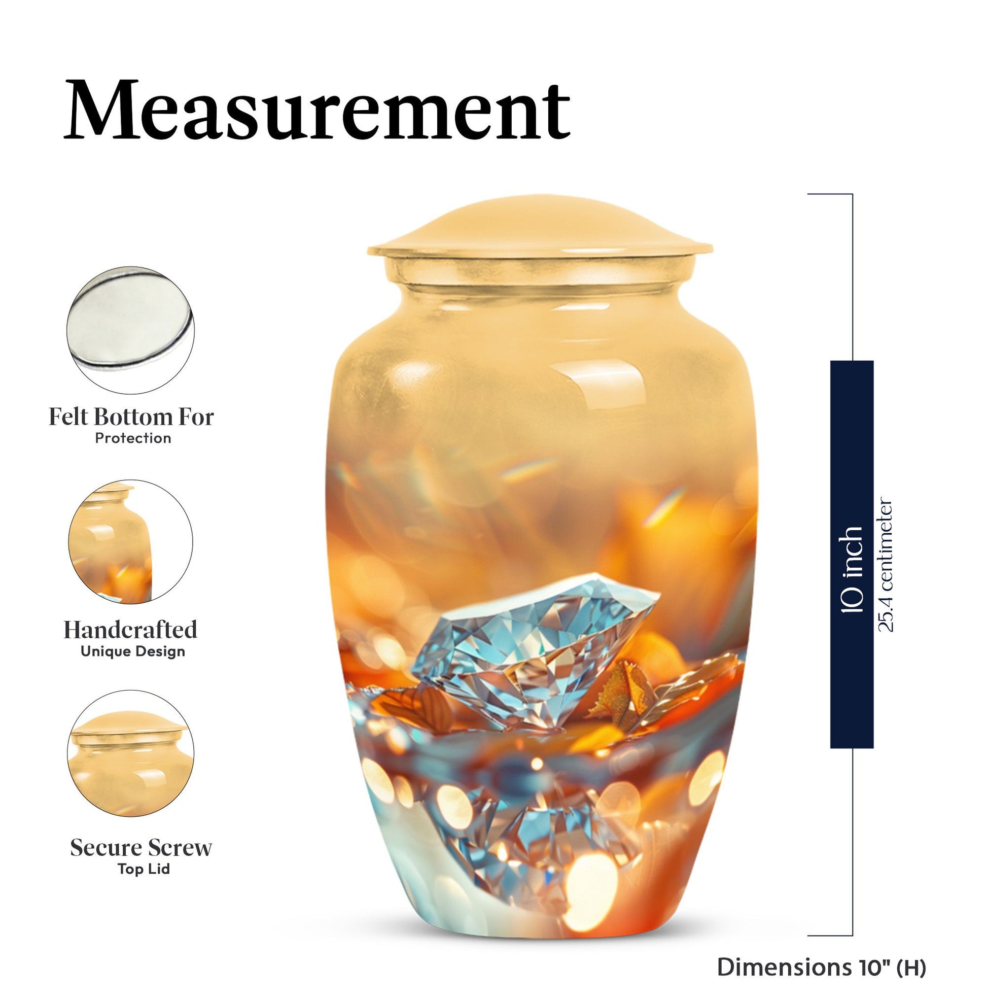 For those seeking a dignified and respectful memorial for a lost loved one, this meticulously-crafted diamond urn is an ideal choice. Thoughtfully designed to hold the ashes of an adult male, the large urn offers a capacity of 200 cubic inches. Every aspect of this cremation urn for human ashes is forged with attention to detail from sturdy Aluminium, weighing a solid 3.3 pounds and standing 10 inches tall. The unique Abstract theme enhances the classic urn character, adding an elegant touch to its aura. Take advantage of the personalization option by engraving names to create a truly unique memorial. The package comes complete with a plush velvet pouch for safekeeping of the ashes. Uncommonly significant, this product seamlessly bridges the gap between 'cremation urns for human ashes adult' and 'burial medium size urns' while being relevant in your 'urn human ash cremation urn' and 'funeral urns for adult ashes women' searches. This urn is not just a vessel, but a testament of love and remembrance.