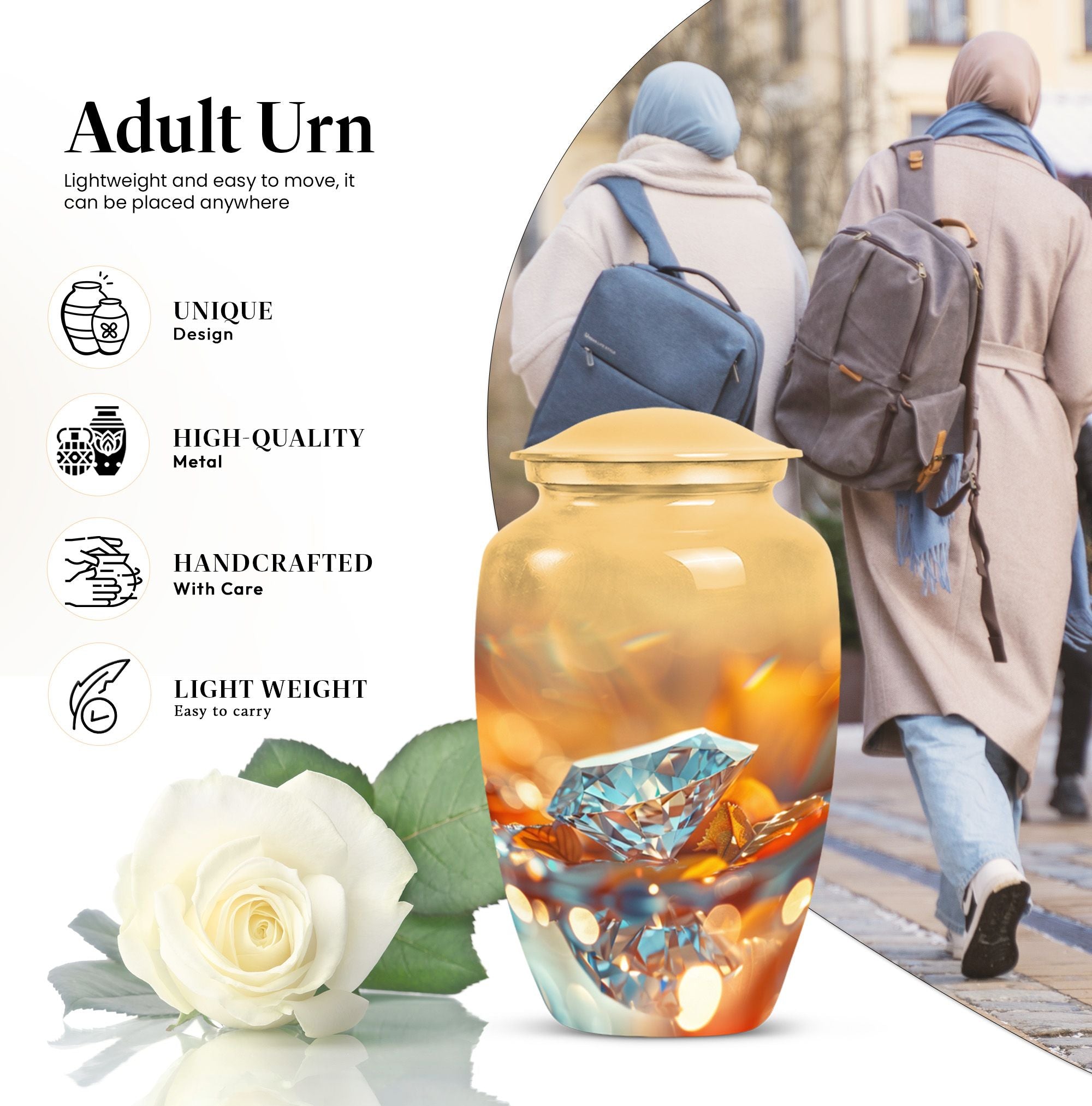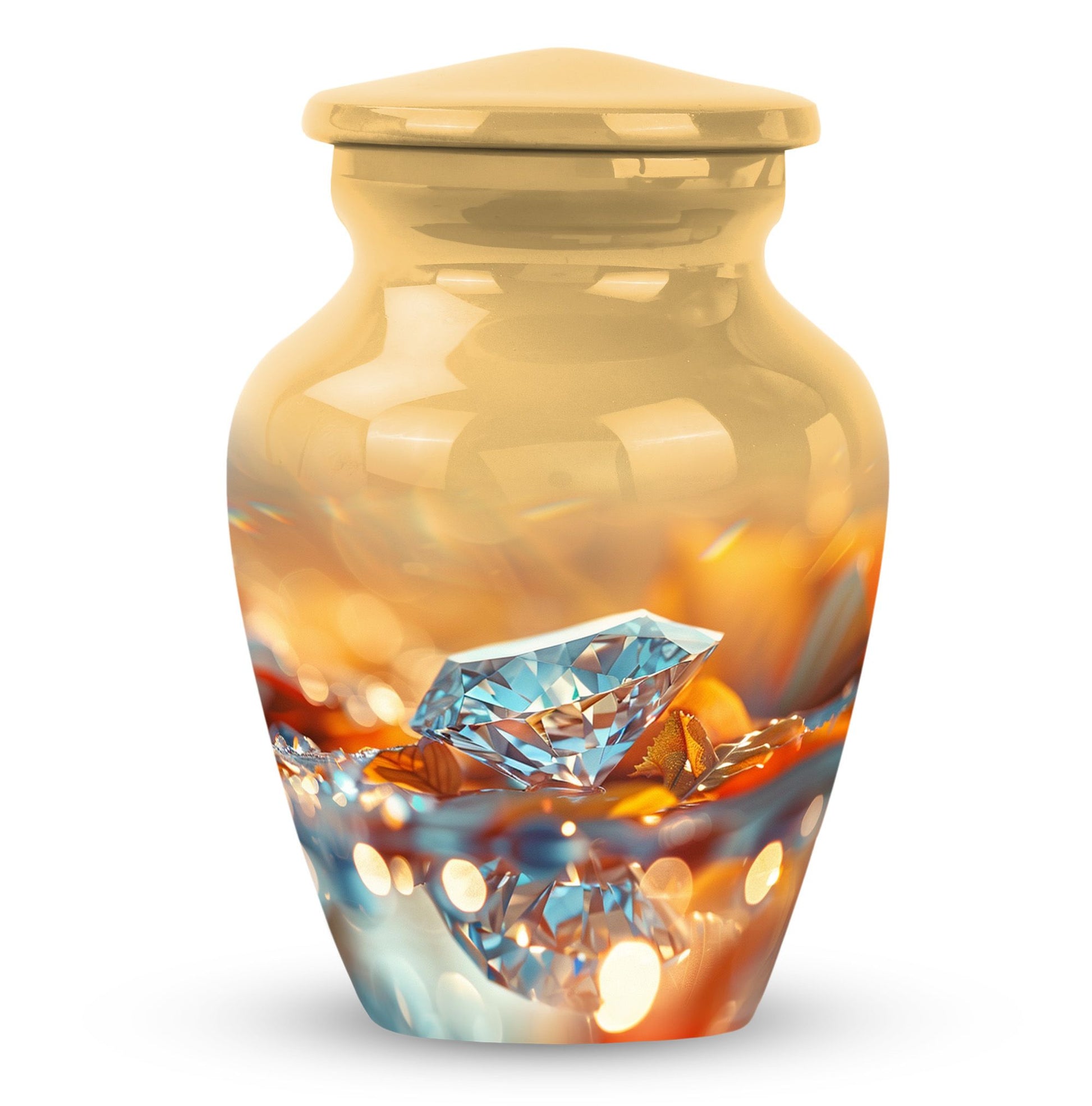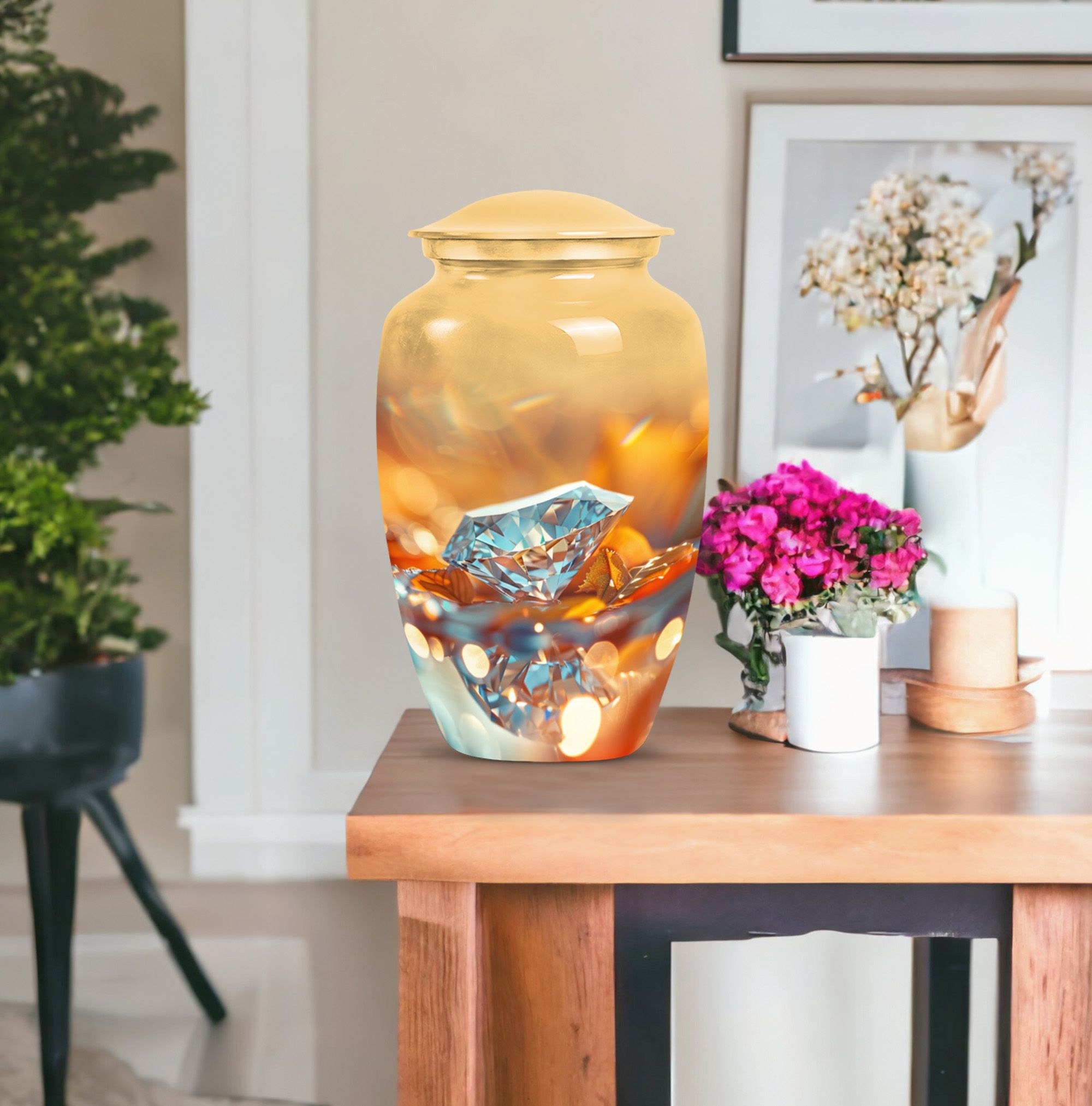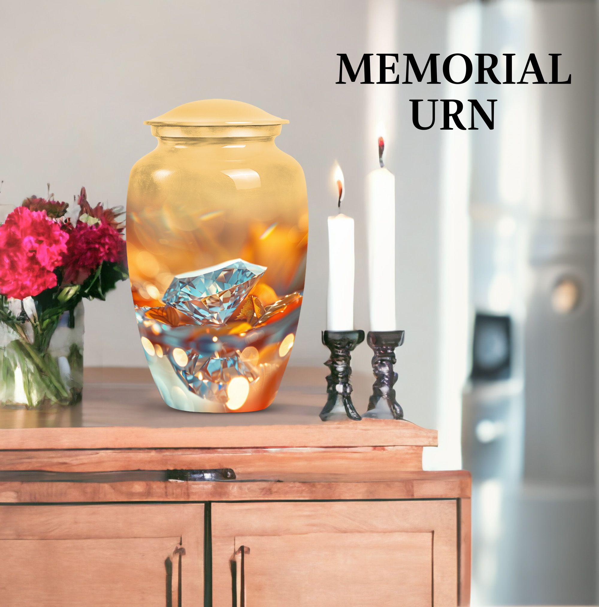 For those seeking a dignified and respectful memorial for a lost loved one, this meticulously-crafted diamond urn is an ideal choice. Thoughtfully designed to hold the ashes of an adult male, the large urn offers a capacity of 200 cubic inches. Every aspect of this cremation urn for human ashes is forged with attention to detail from sturdy Aluminium, weighing a solid 3.3 pounds and standing 10 inches tall. The unique Abstract theme enhances the classic urn character, adding an elegant touch to its aura. Take advantage of the personalization option by engraving names to create a truly unique memorial. The package comes complete with a plush velvet pouch for safekeeping of the ashes. Uncommonly significant, this product seamlessly bridges the gap between 'cremation urns for human ashes adult' and 'burial medium size urns' while being relevant in your 'urn human ash cremation urn' and 'funeral urns for adult ashes women' searches. This urn is not just a vessel, but a testament of love and remembrance.