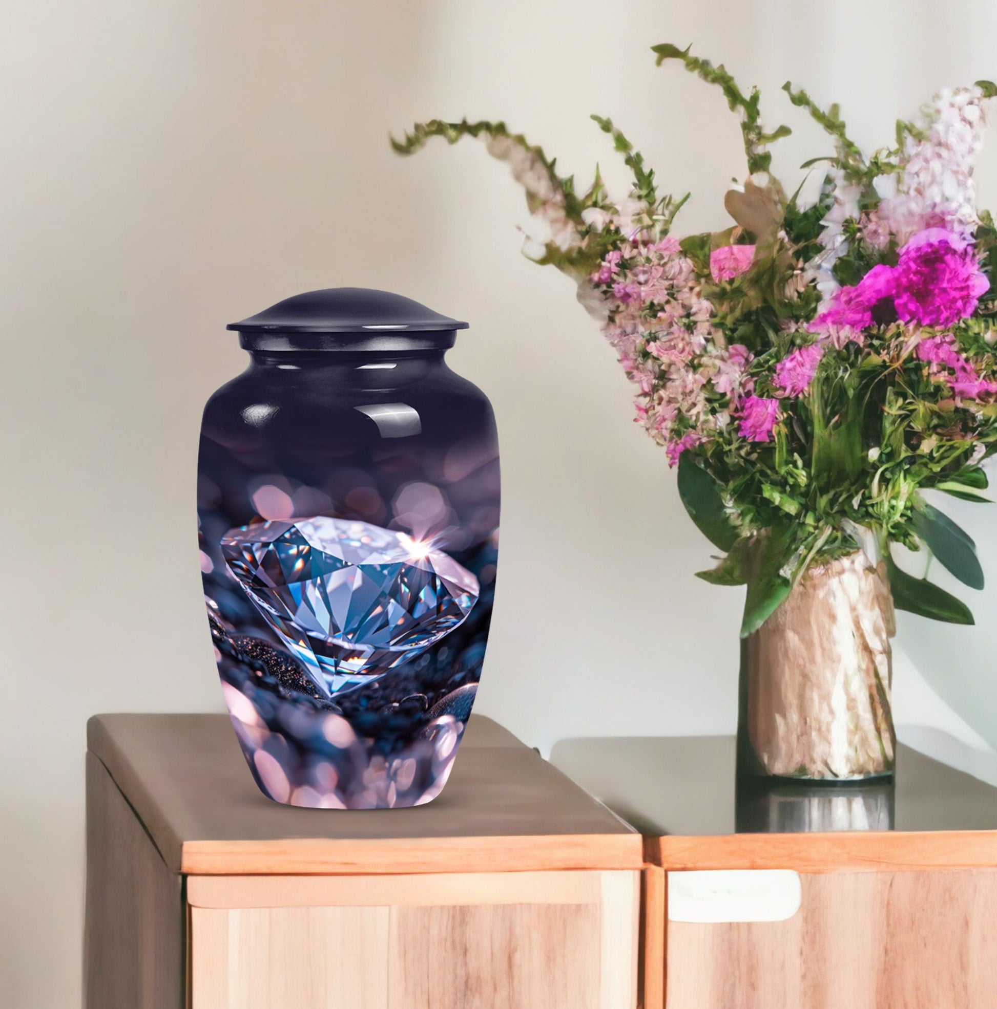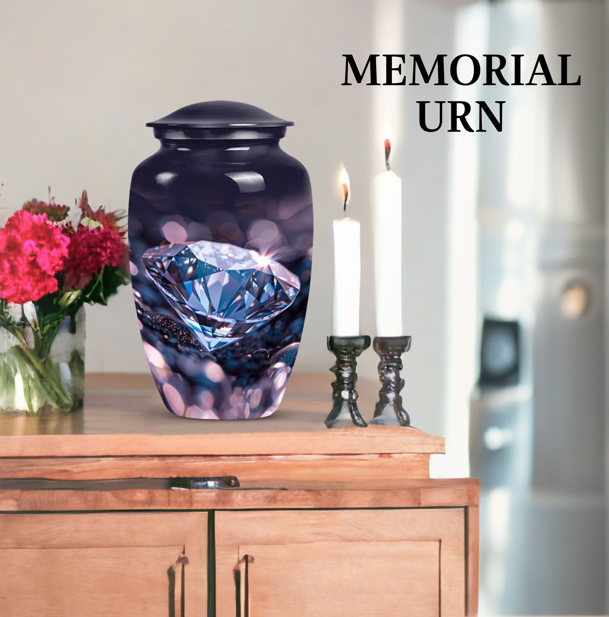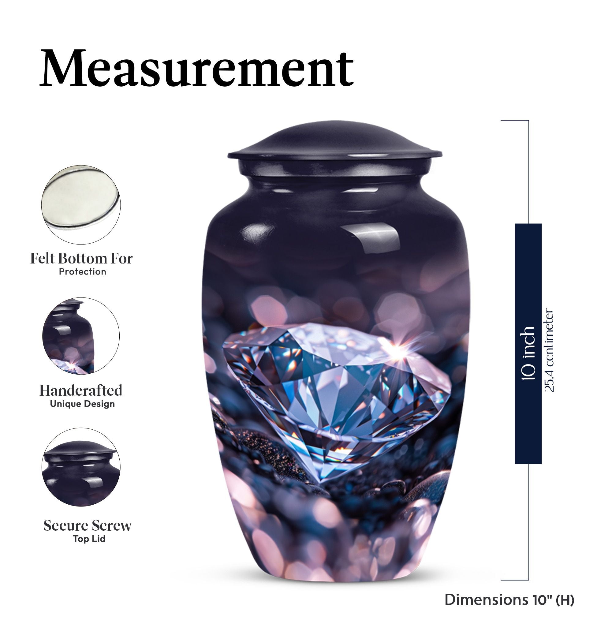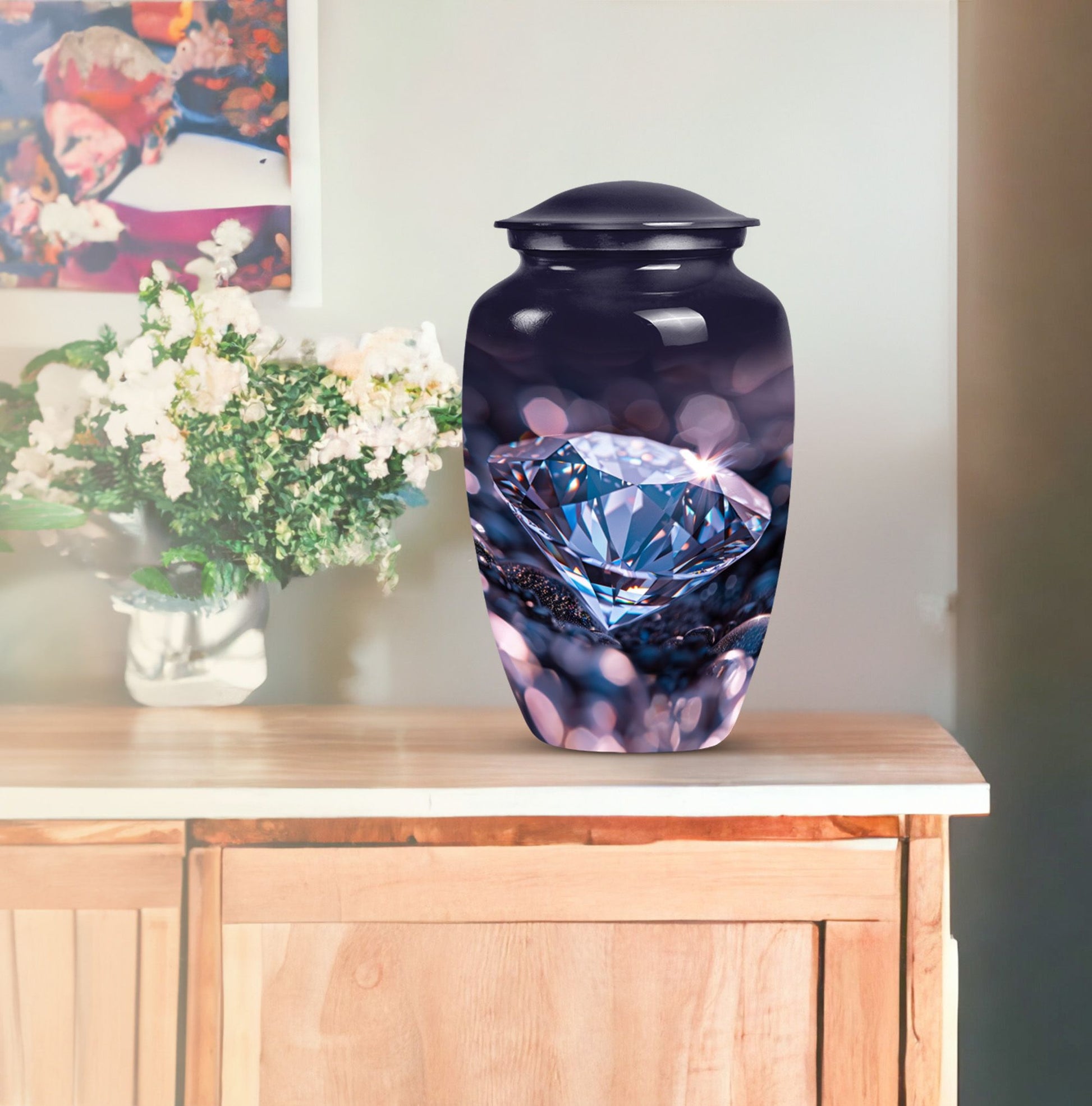 Remember and honor your loved ones with our exquisite diamond urn, specially designed for memorial large urns for ashes. This large, cremation urn, standing at 10 inches in height has enough capacity of 200 cubic inches, making it ideal to store the ashes of your beloved adults. It is a handcrafted, carefully shaped into a classic urn style, accentuating the expression of love and remembrance of an irreplaceable soul in a high aesthetic appeal. The beautifully abstract theme of the urn is poised to resonate with the artistic souls who seek uncommon treasures. Our aluminium urn, weighing at just 3.3 pounds, is enduring and corrosion-resistant, ensuring a long-lasting tribute. The package comes with a soft, velvet pouch for containment of the ashes, providing an embracing touch of dignity and respect. Add a personalized touch with engraved names on the urn. Opt for our funeral urn for women's ashes or simply as a memorial urn, either way, it showcases a mark of sublime craftsmanship.