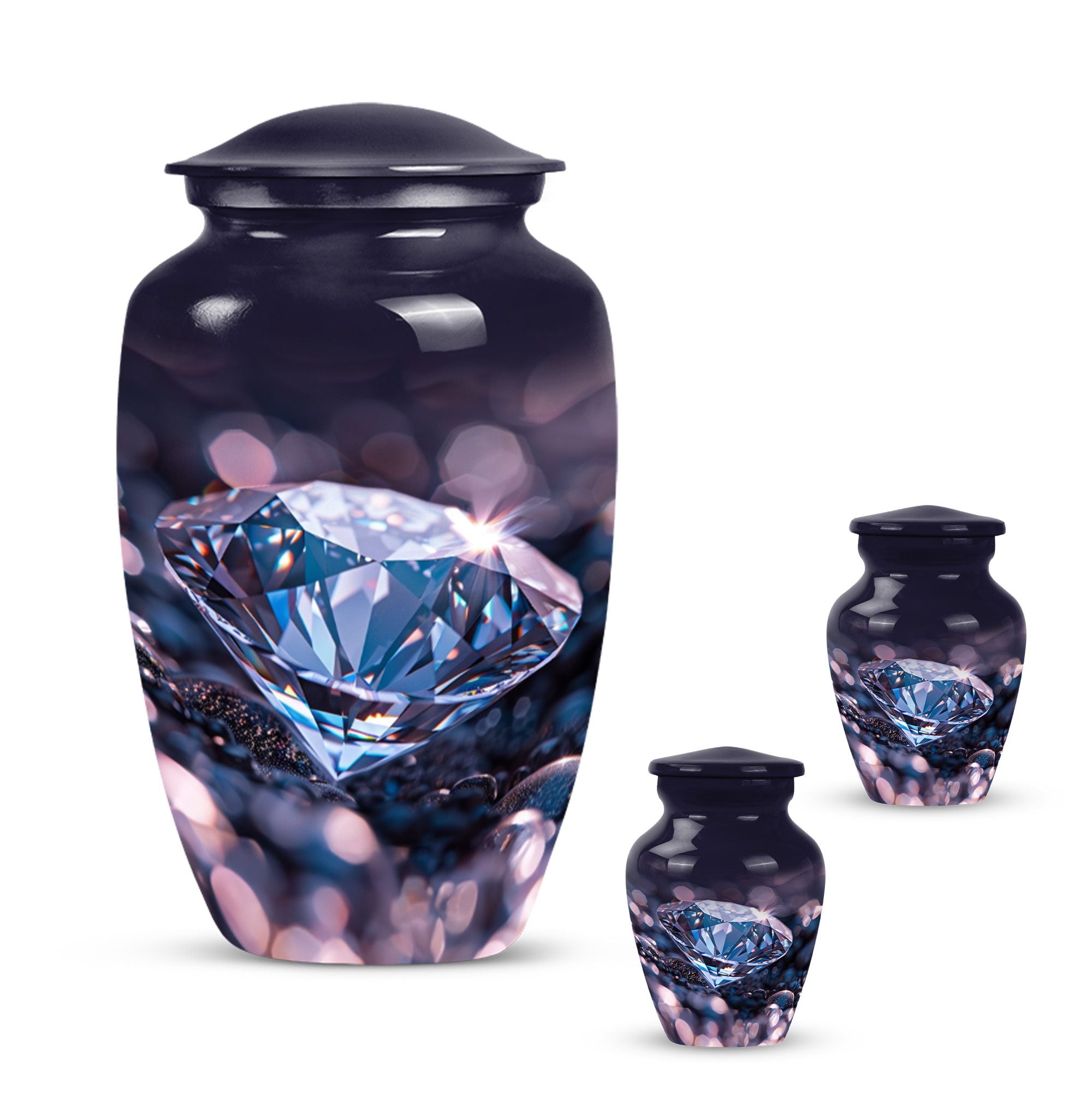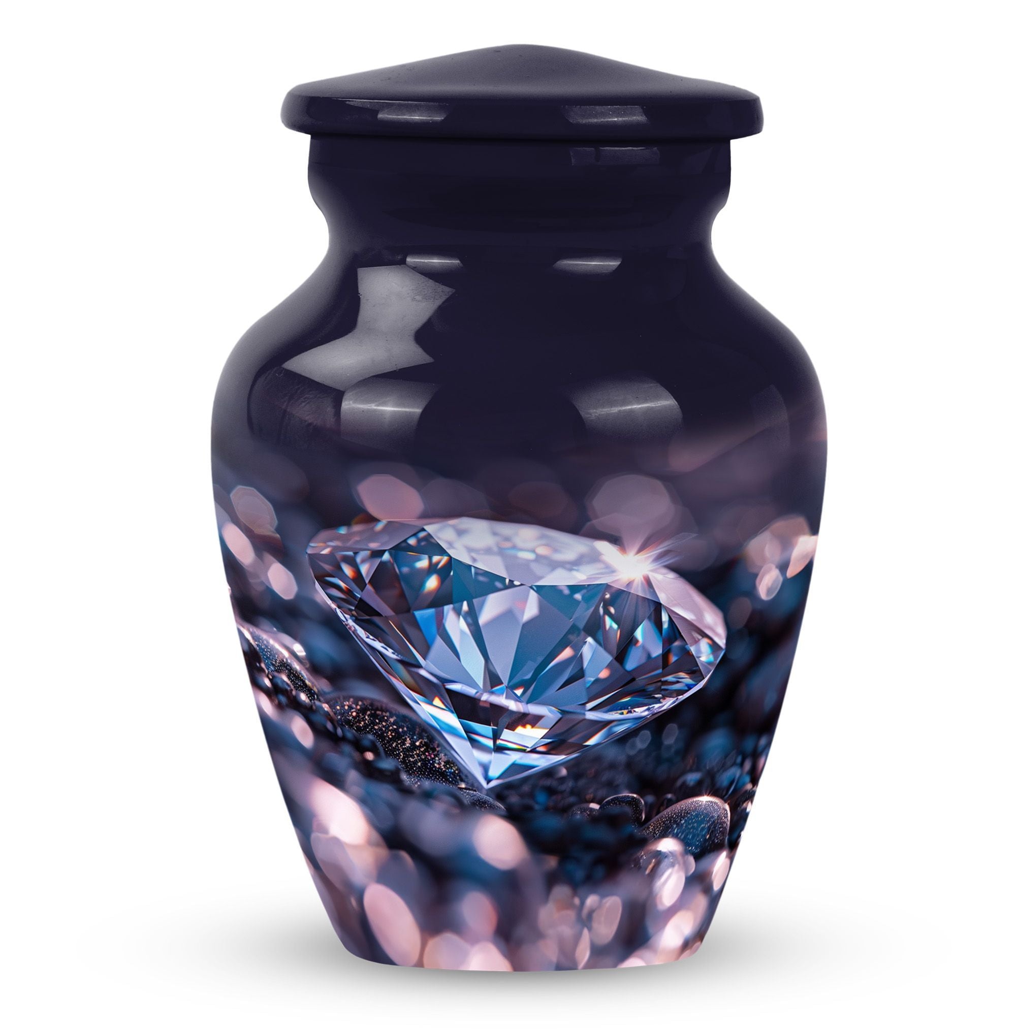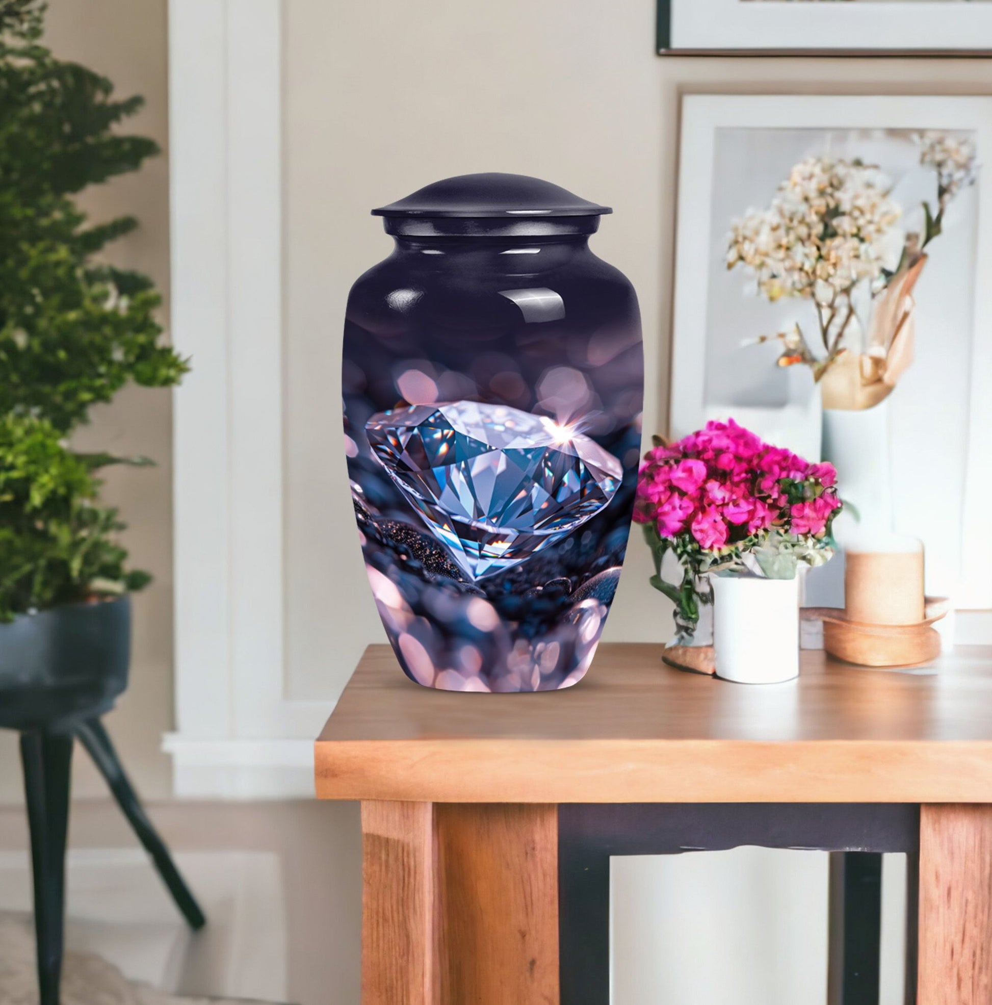 Remember and honor your loved ones with our exquisite diamond urn, specially designed for memorial large urns for ashes. This large, cremation urn, standing at 10 inches in height has enough capacity of 200 cubic inches, making it ideal to store the ashes of your beloved adults. It is a handcrafted, carefully shaped into a classic urn style, accentuating the expression of love and remembrance of an irreplaceable soul in a high aesthetic appeal. The beautifully abstract theme of the urn is poised to resonate with the artistic souls who seek uncommon treasures. Our aluminium urn, weighing at just 3.3 pounds, is enduring and corrosion-resistant, ensuring a long-lasting tribute. The package comes with a soft, velvet pouch for containment of the ashes, providing an embracing touch of dignity and respect. Add a personalized touch with engraved names on the urn. Opt for our funeral urn for women's ashes or simply as a memorial urn, either way, it showcases a mark of sublime craftsmanship.