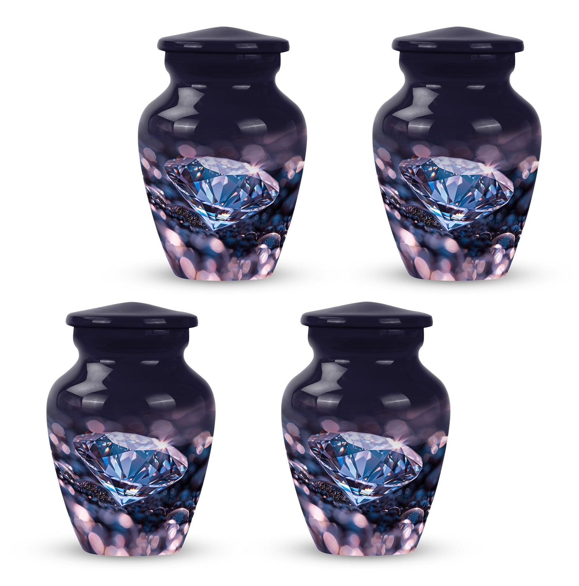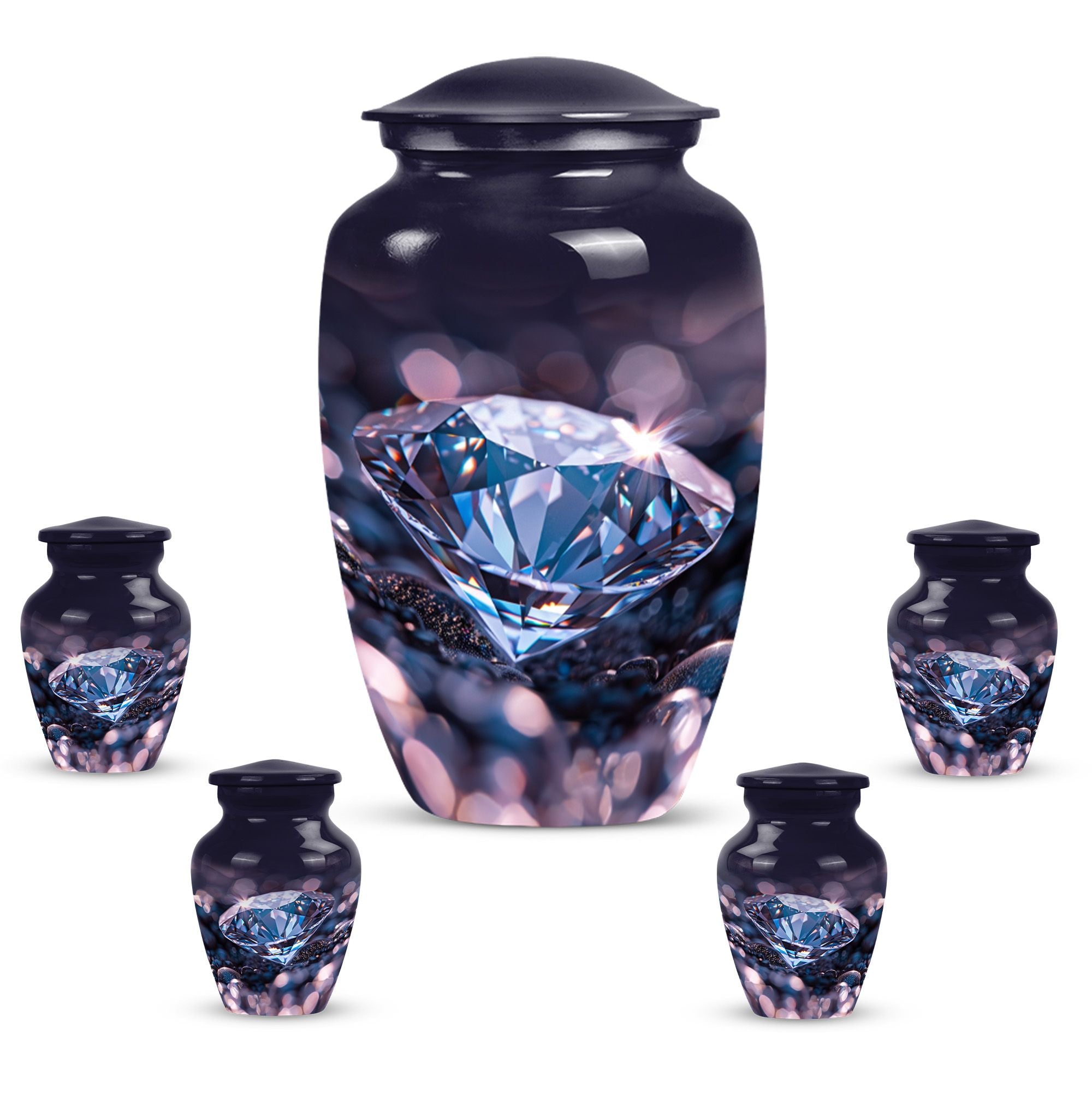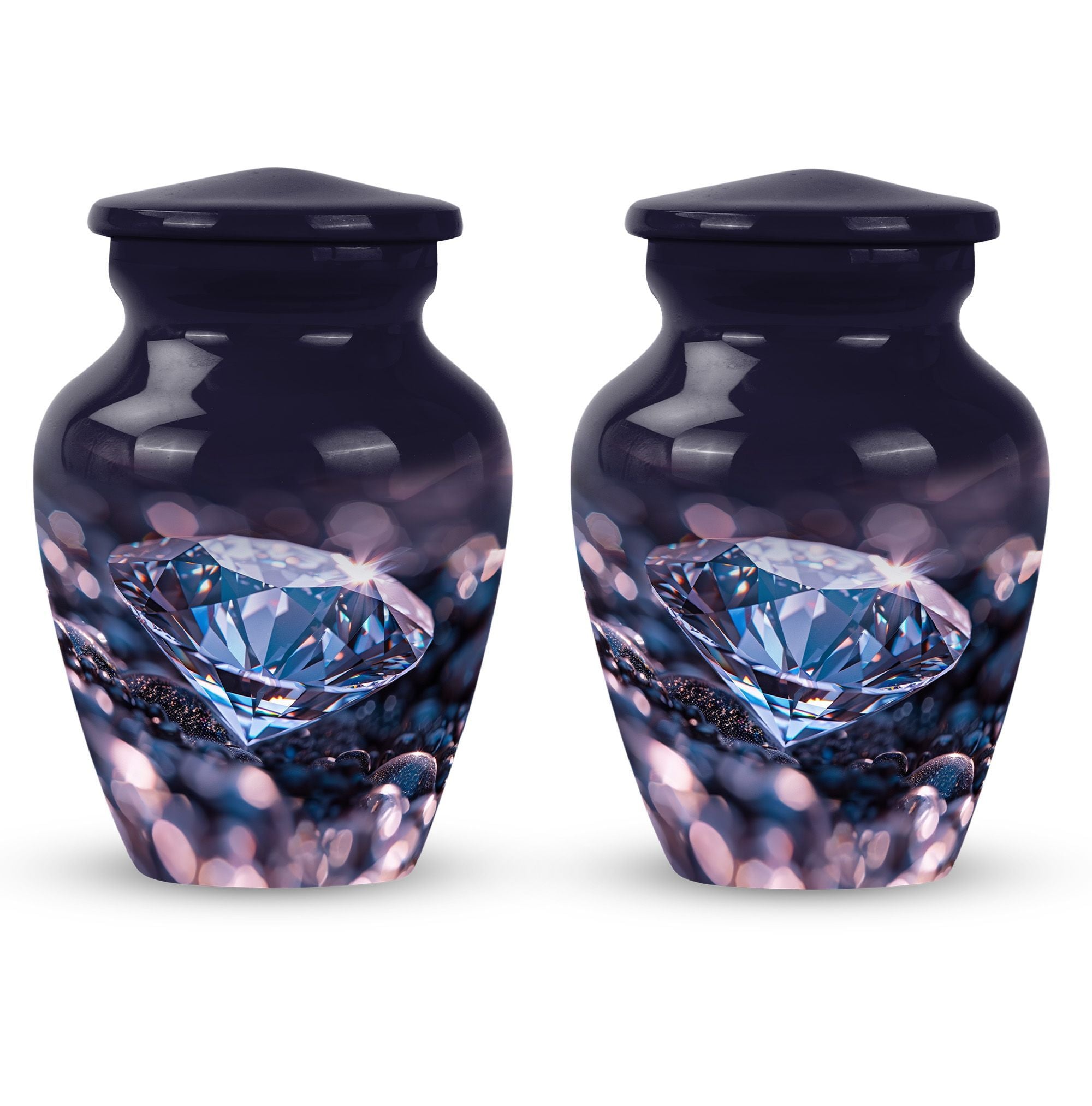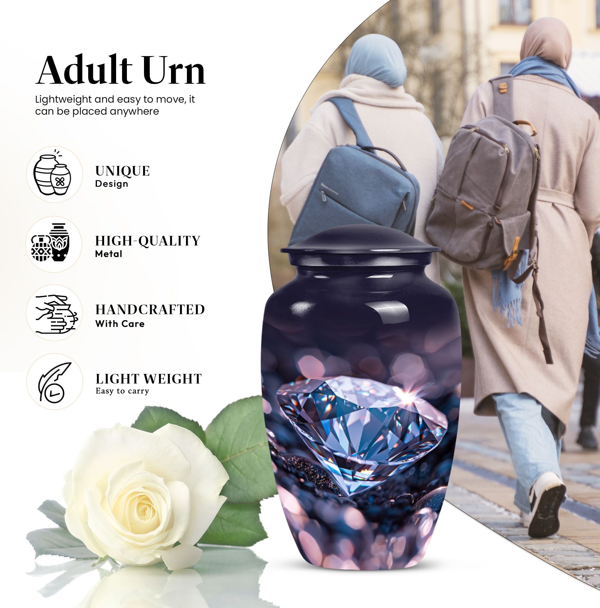Remember and honor your loved ones with our exquisite diamond urn, specially designed for memorial large urns for ashes. This large, cremation urn, standing at 10 inches in height has enough capacity of 200 cubic inches, making it ideal to store the ashes of your beloved adults. It is a handcrafted, carefully shaped into a classic urn style, accentuating the expression of love and remembrance of an irreplaceable soul in a high aesthetic appeal. The beautifully abstract theme of the urn is poised to resonate with the artistic souls who seek uncommon treasures. Our aluminium urn, weighing at just 3.3 pounds, is enduring and corrosion-resistant, ensuring a long-lasting tribute. The package comes with a soft, velvet pouch for containment of the ashes, providing an embracing touch of dignity and respect. Add a personalized touch with engraved names on the urn. Opt for our funeral urn for women's ashes or simply as a memorial urn, either way, it showcases a mark of sublime craftsmanship.