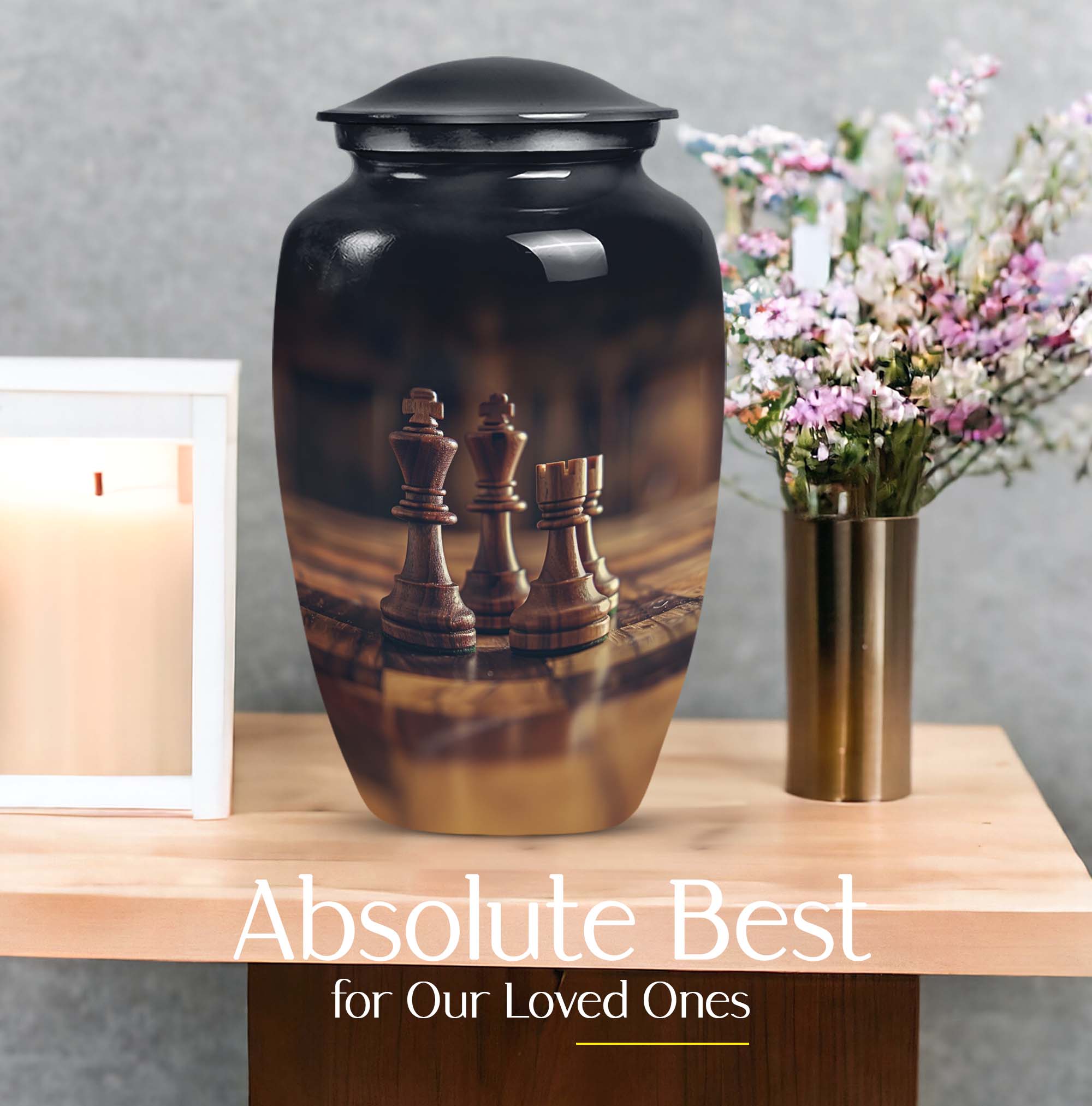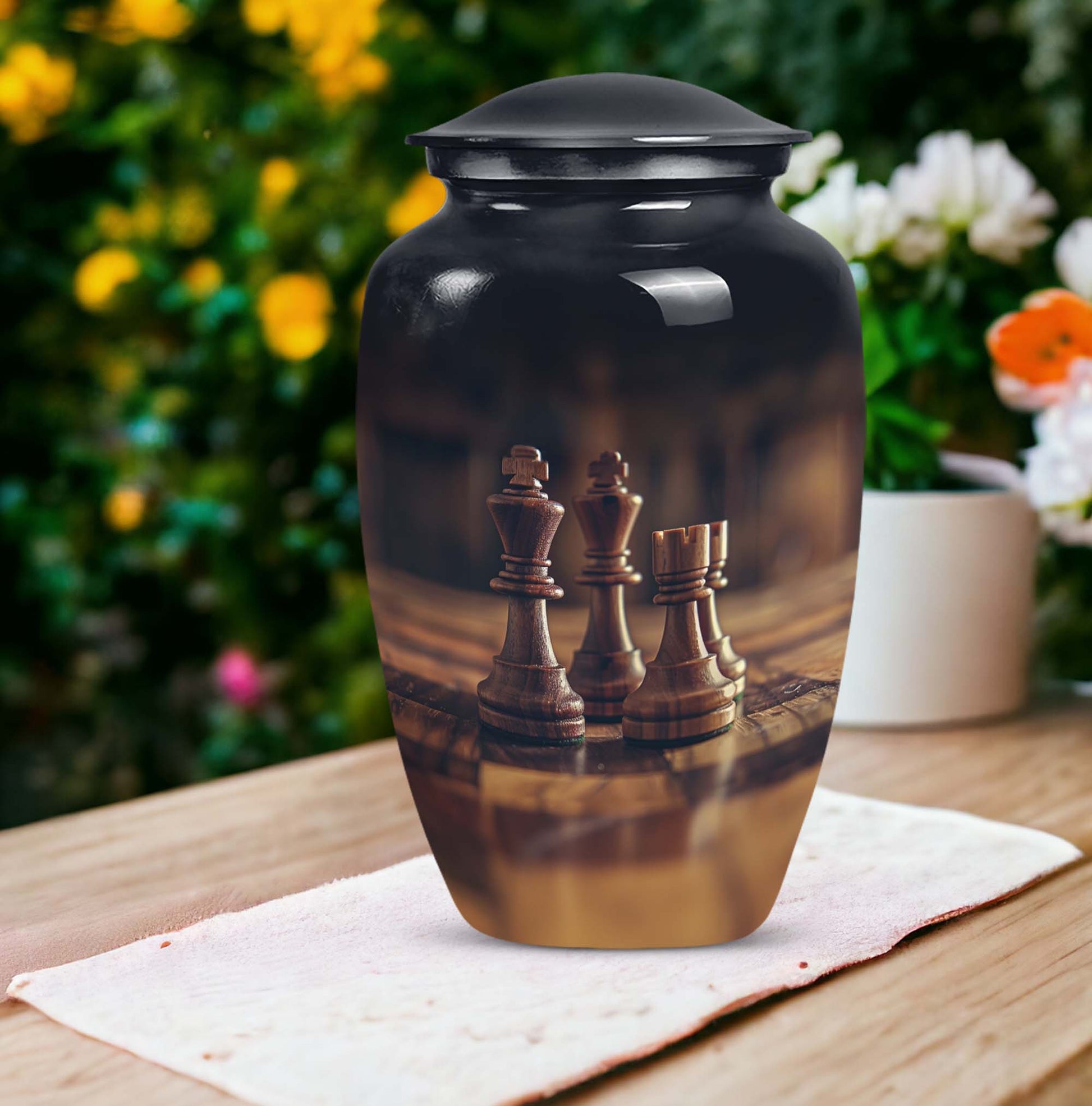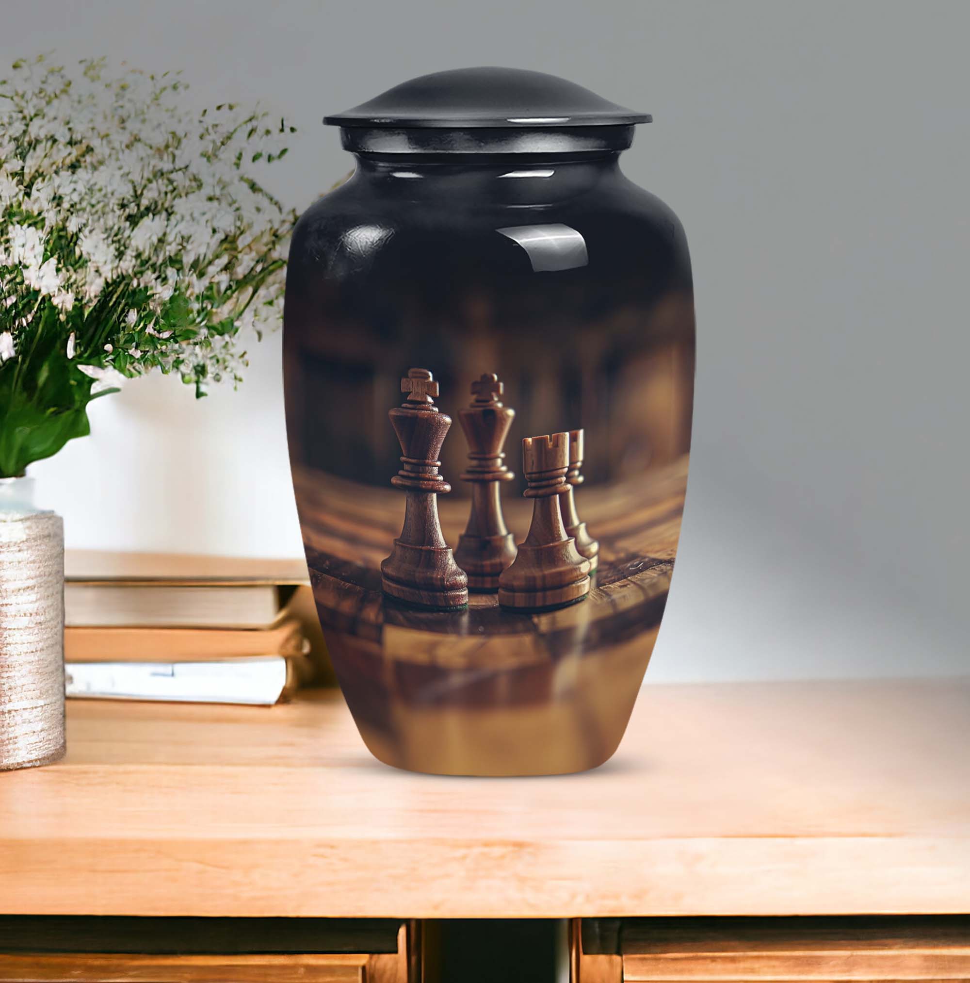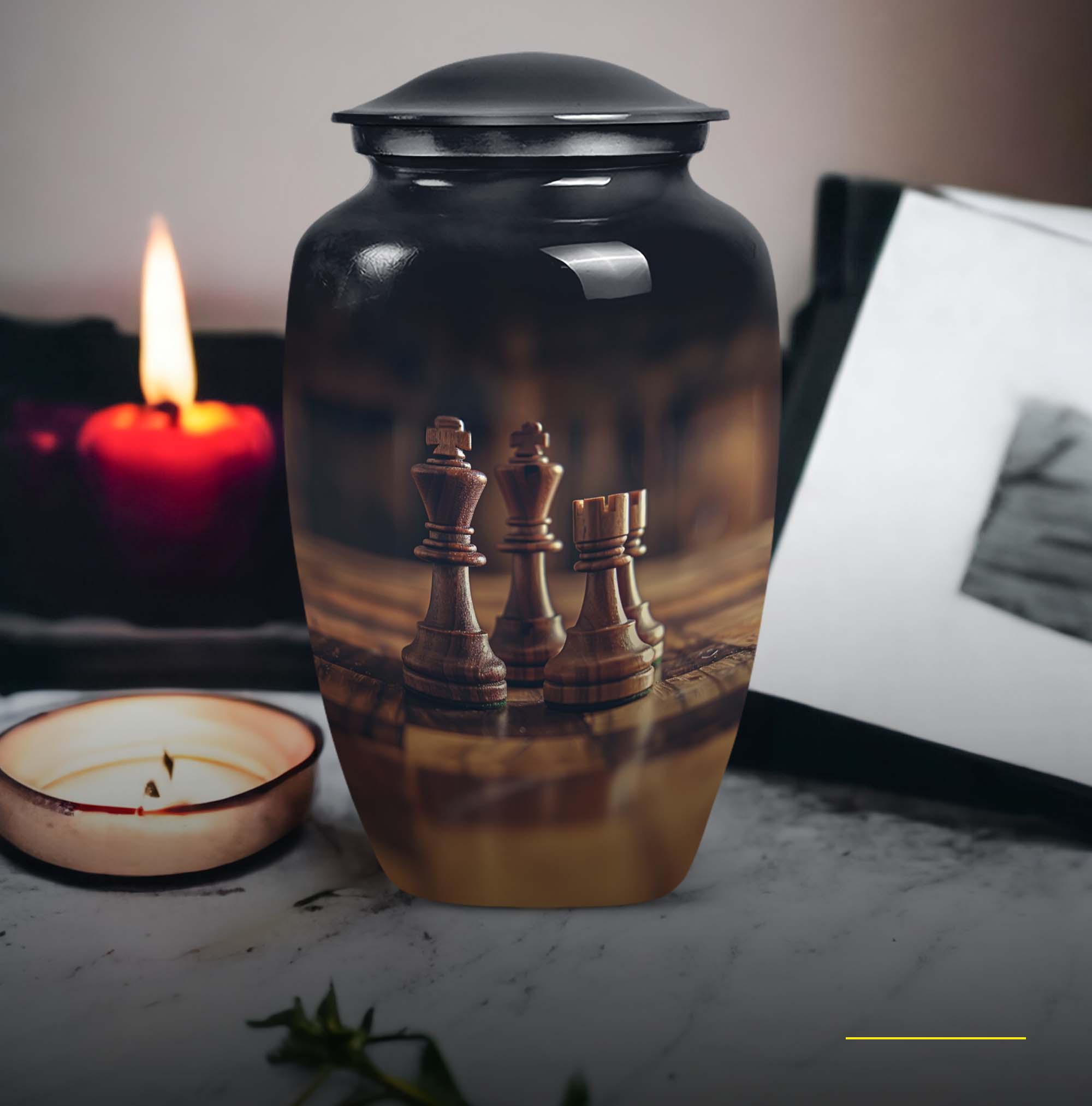 Our one-of-a-kind Chess Urn, perfect for those who appreciate a game of wits, brings a unique touch to memorial supplies. Crafted from durable Aluminium, this urn weighs 3.3 pounds and stands at 10 inches in height, making it an ideal large metal urn for ashes. Intricately designed in the Classic Urn form, it effortlessly suits both male and female adults, gracefully blending in any memory shelf. The urn can comfortably contain 200 cubic inches of ashes. Moreover, it comes with a velvet pouch to provide further dignity and respect to your loved ones' remains. One significant feature of this urn is its customization; you can personalize it with engraved names, adding a more intimate touch. Not just another entry in our range of memorial urns, this Chess Urn on our Shopify channel seamlessly combines memorial and personal interests, marking the memory of a loved one with a chess theme.