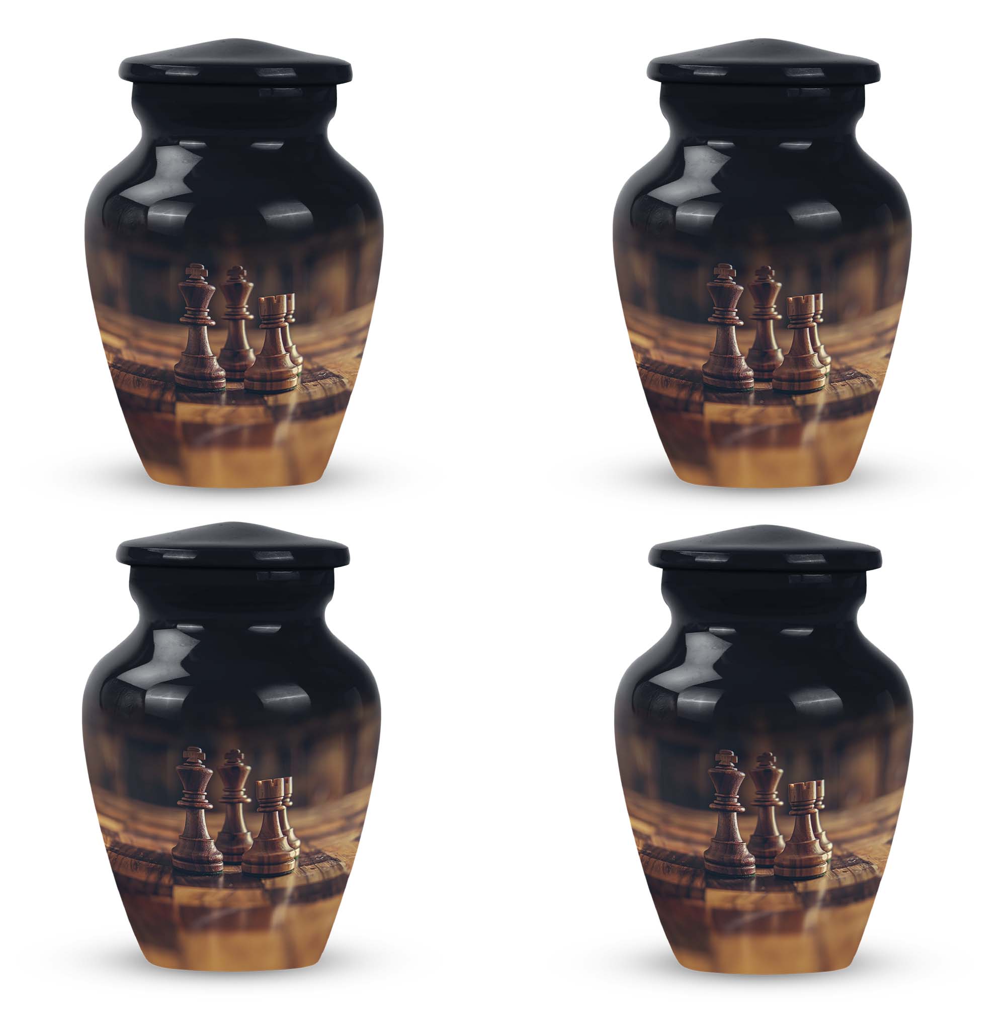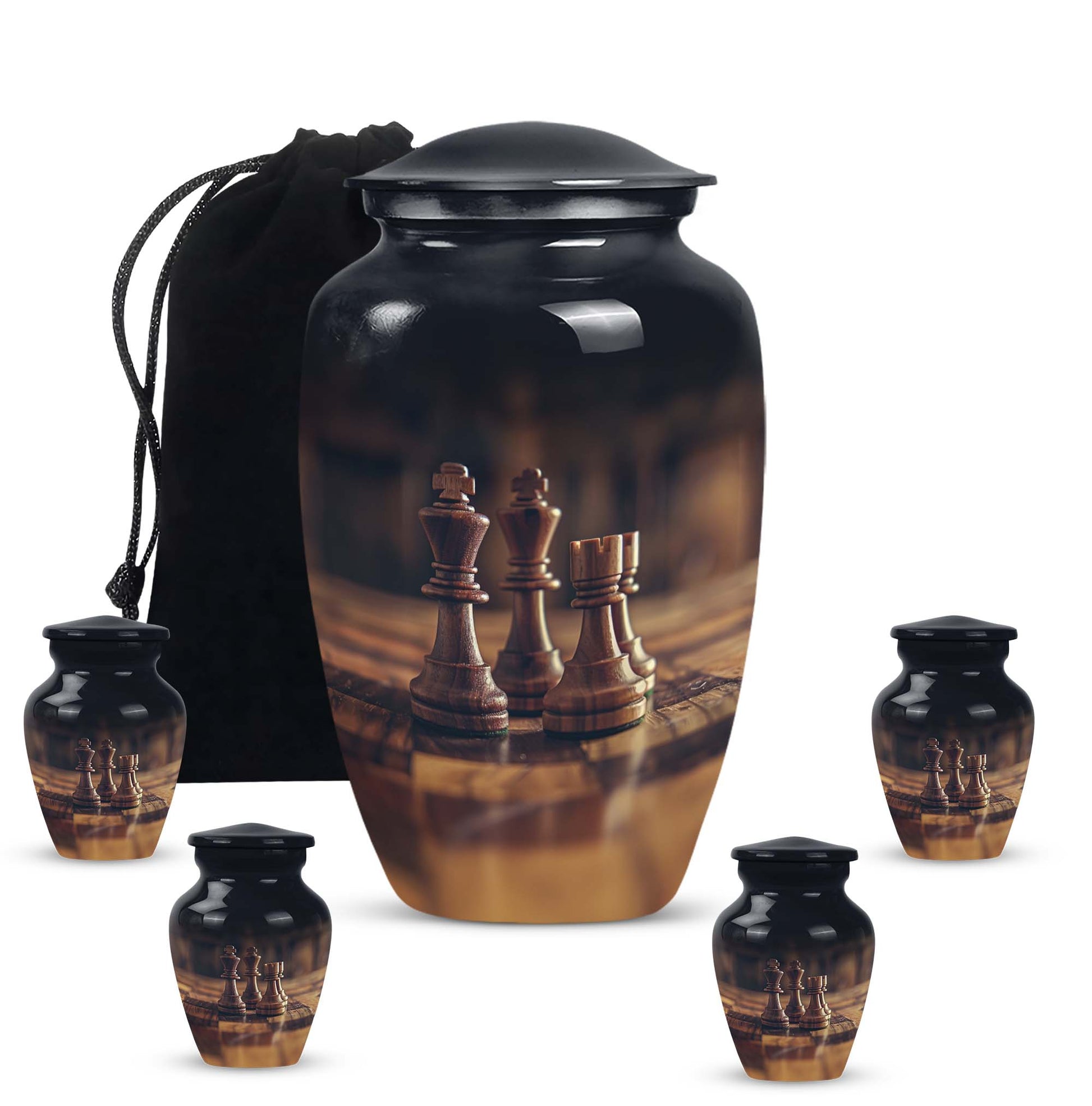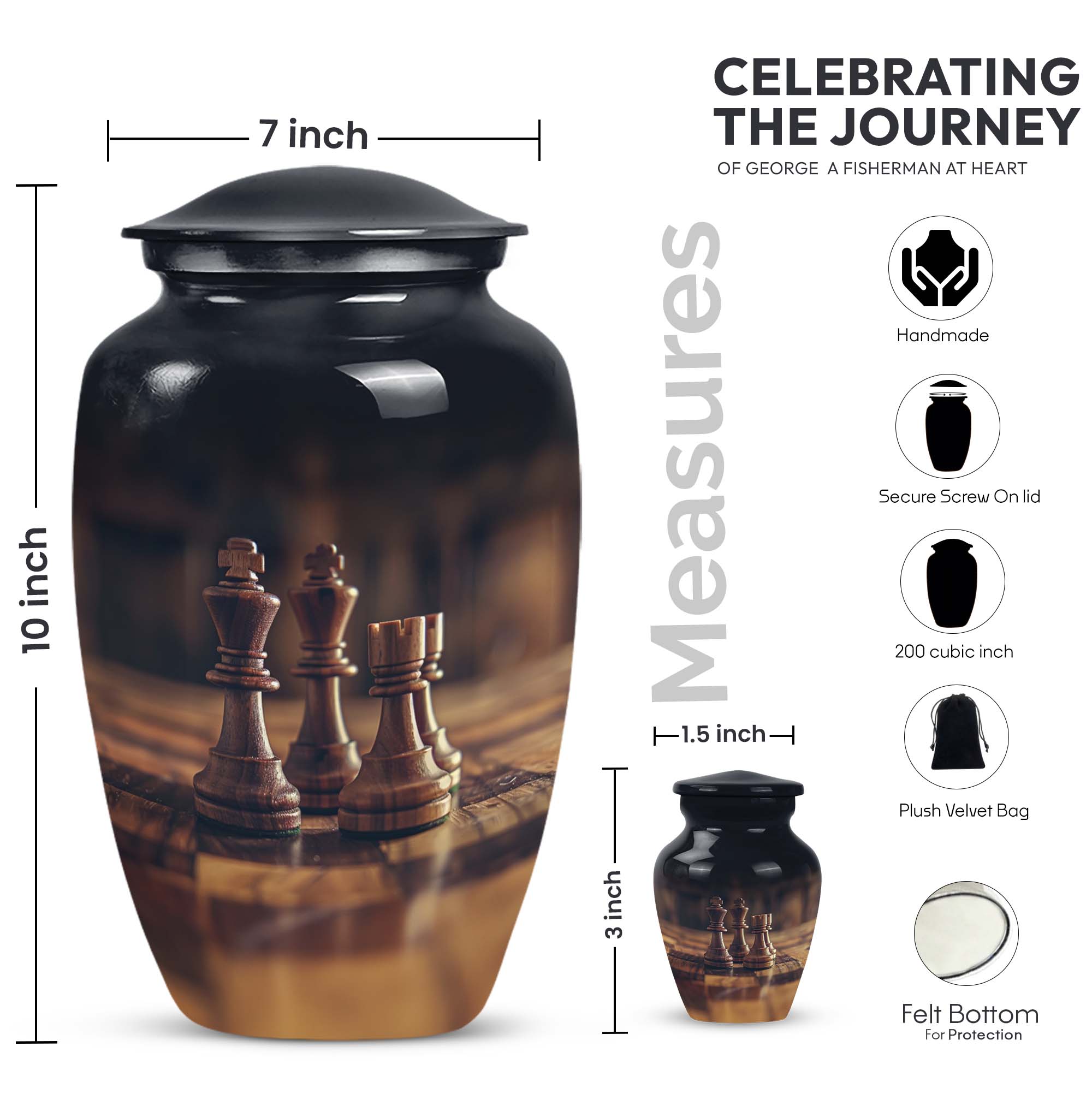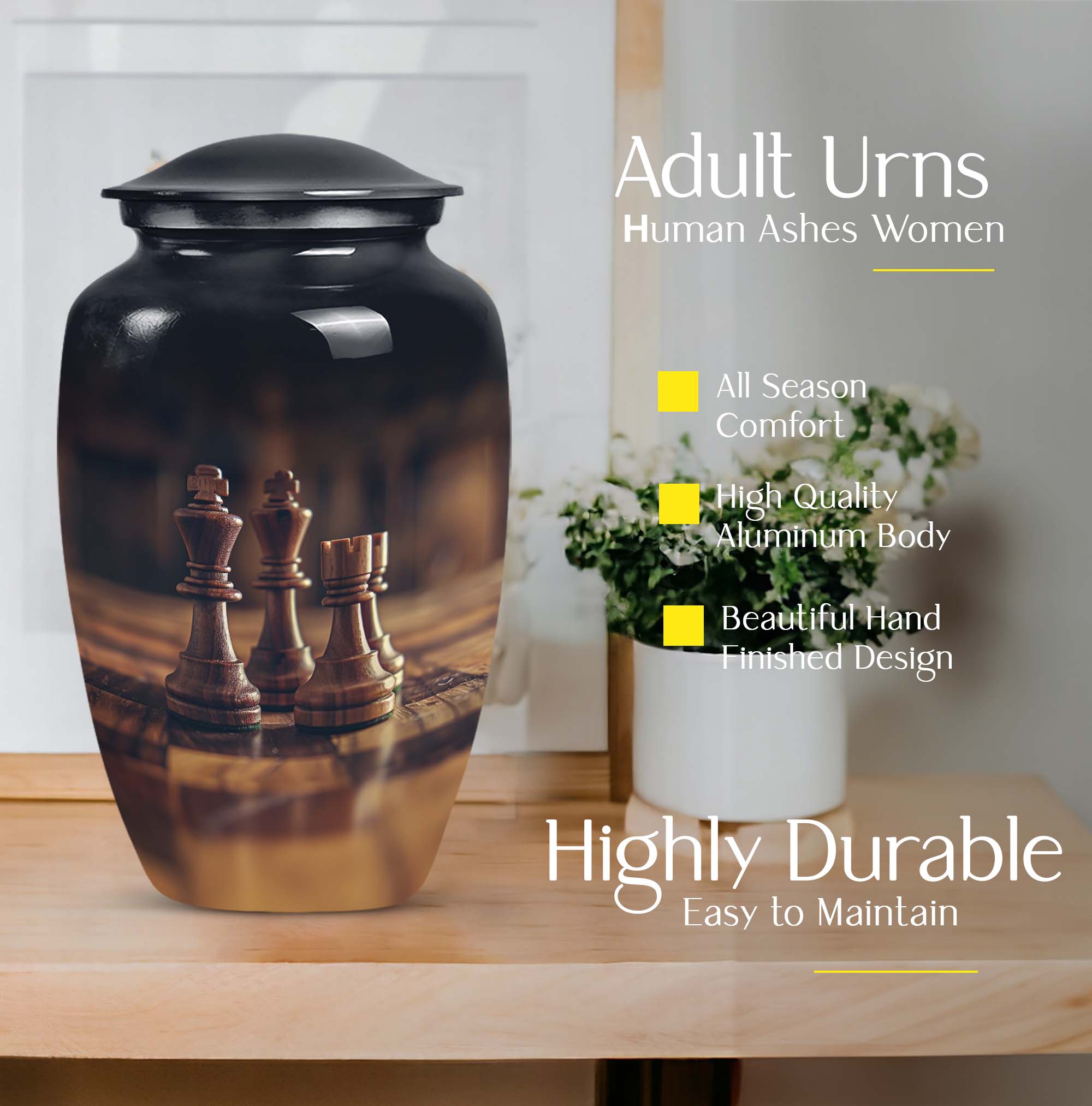 Our one-of-a-kind Chess Urn, perfect for those who appreciate a game of wits, brings a unique touch to memorial supplies. Crafted from durable Aluminium, this urn weighs 3.3 pounds and stands at 10 inches in height, making it an ideal large metal urn for ashes. Intricately designed in the Classic Urn form, it effortlessly suits both male and female adults, gracefully blending in any memory shelf. The urn can comfortably contain 200 cubic inches of ashes. Moreover, it comes with a velvet pouch to provide further dignity and respect to your loved ones' remains. One significant feature of this urn is its customization; you can personalize it with engraved names, adding a more intimate touch. Not just another entry in our range of memorial urns, this Chess Urn on our Shopify channel seamlessly combines memorial and personal interests, marking the memory of a loved one with a chess theme.