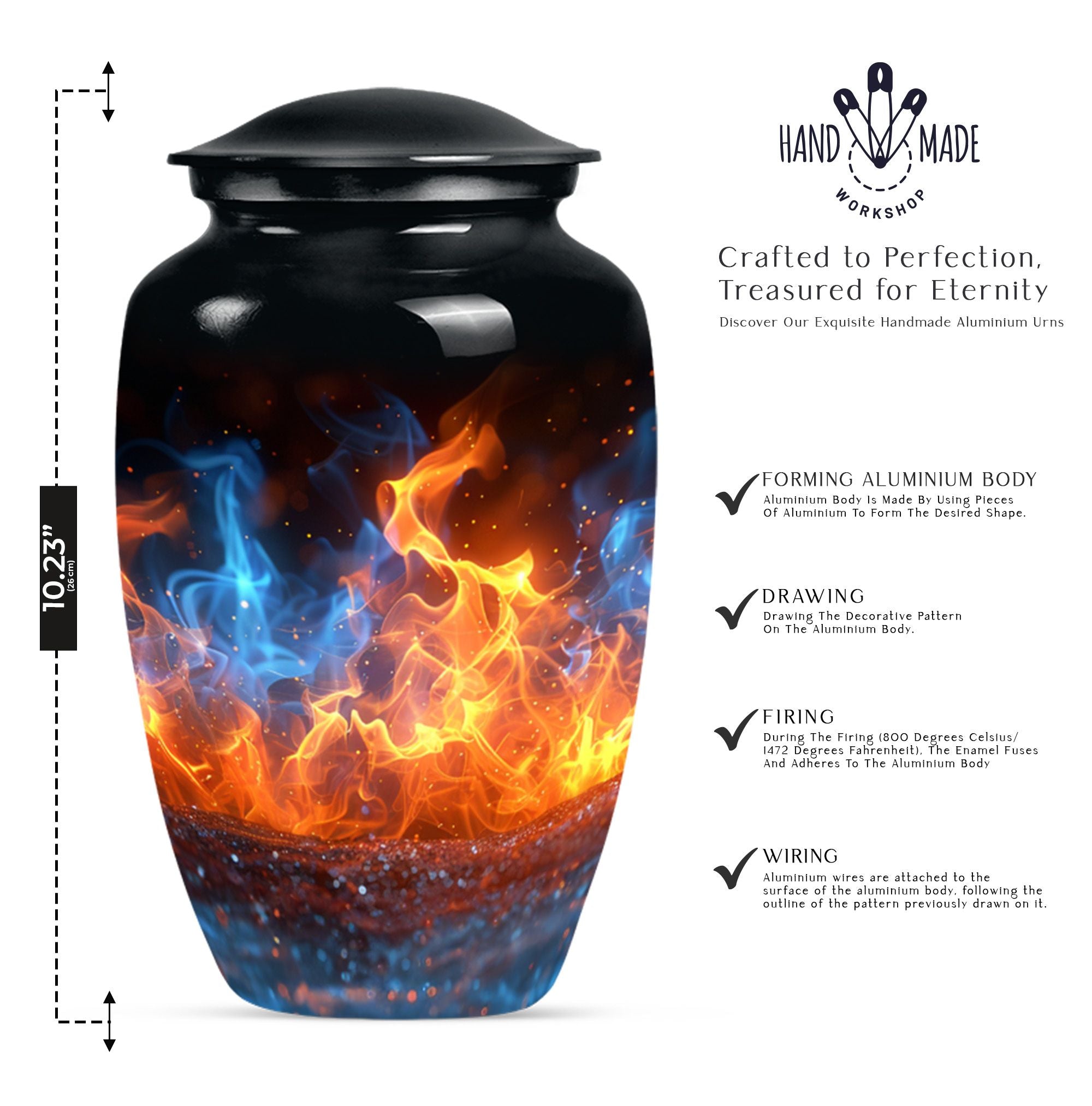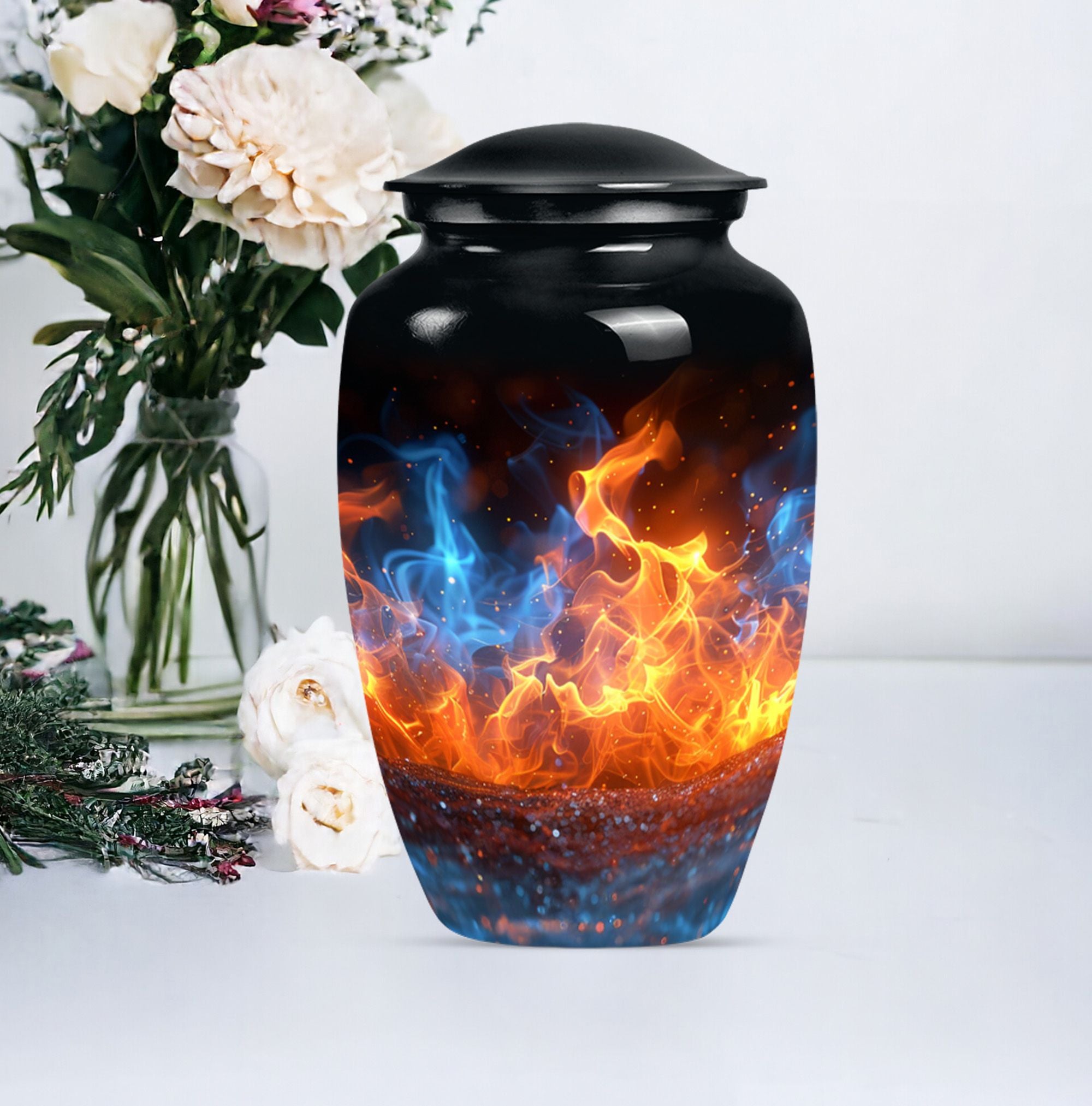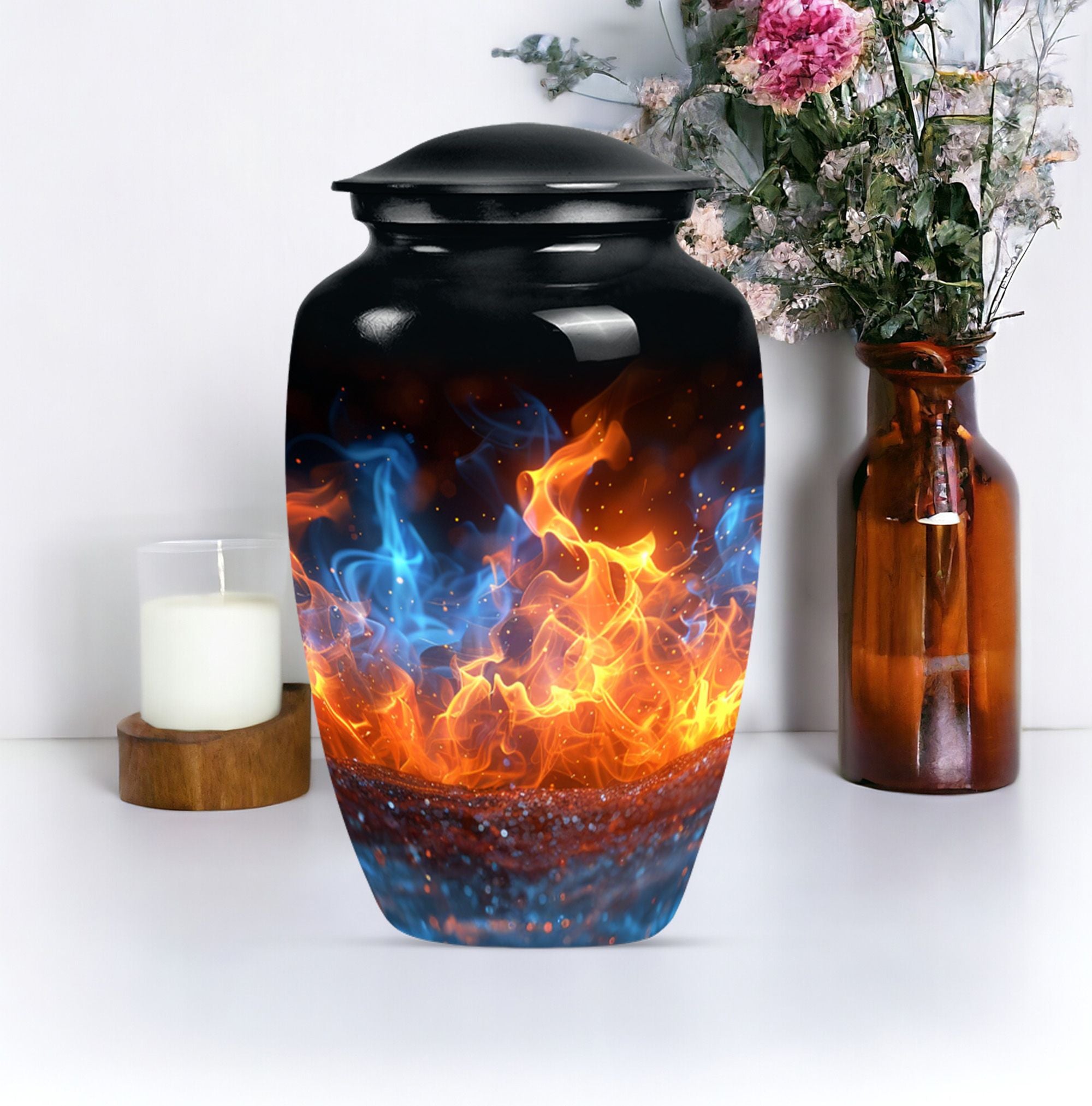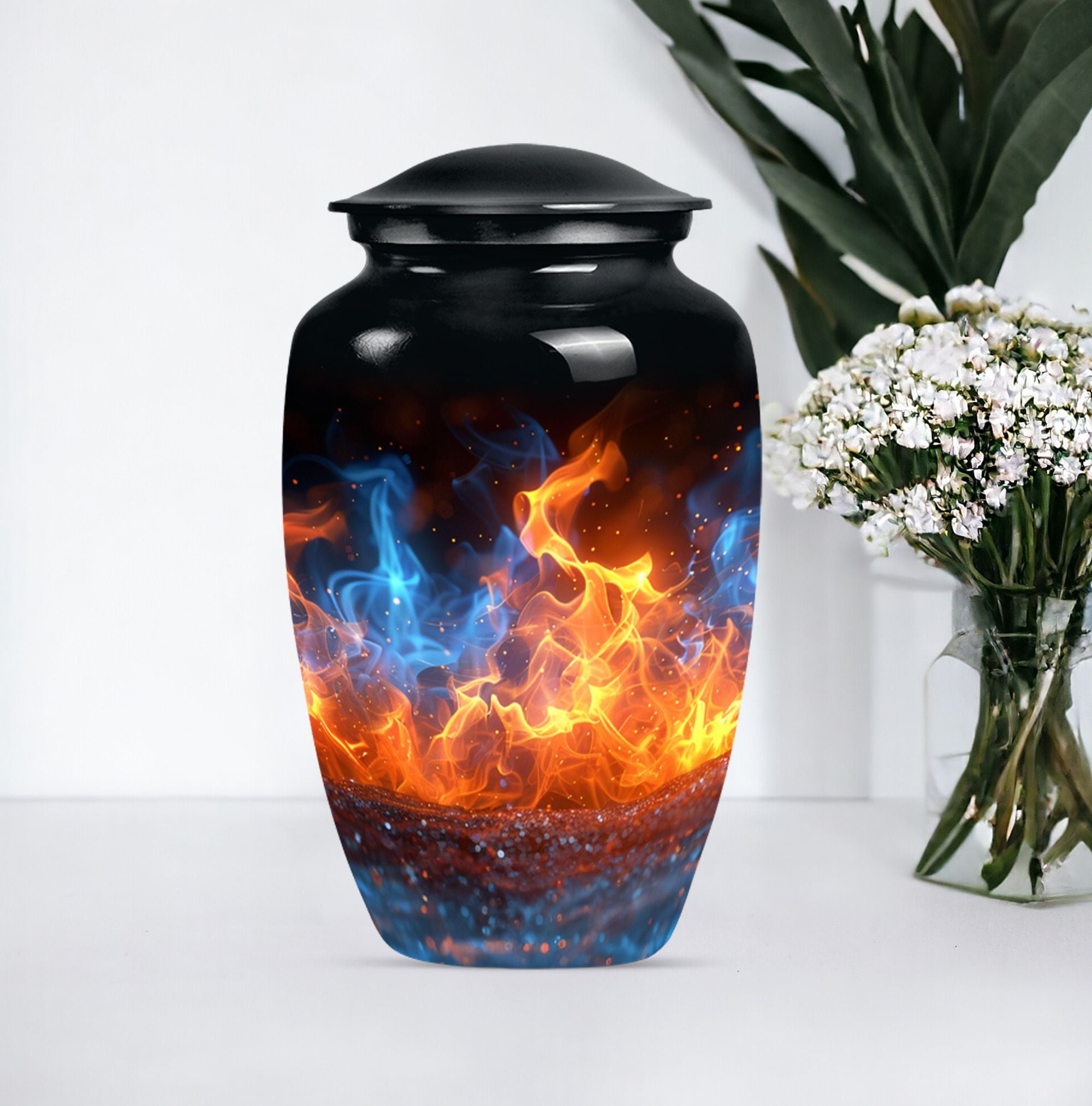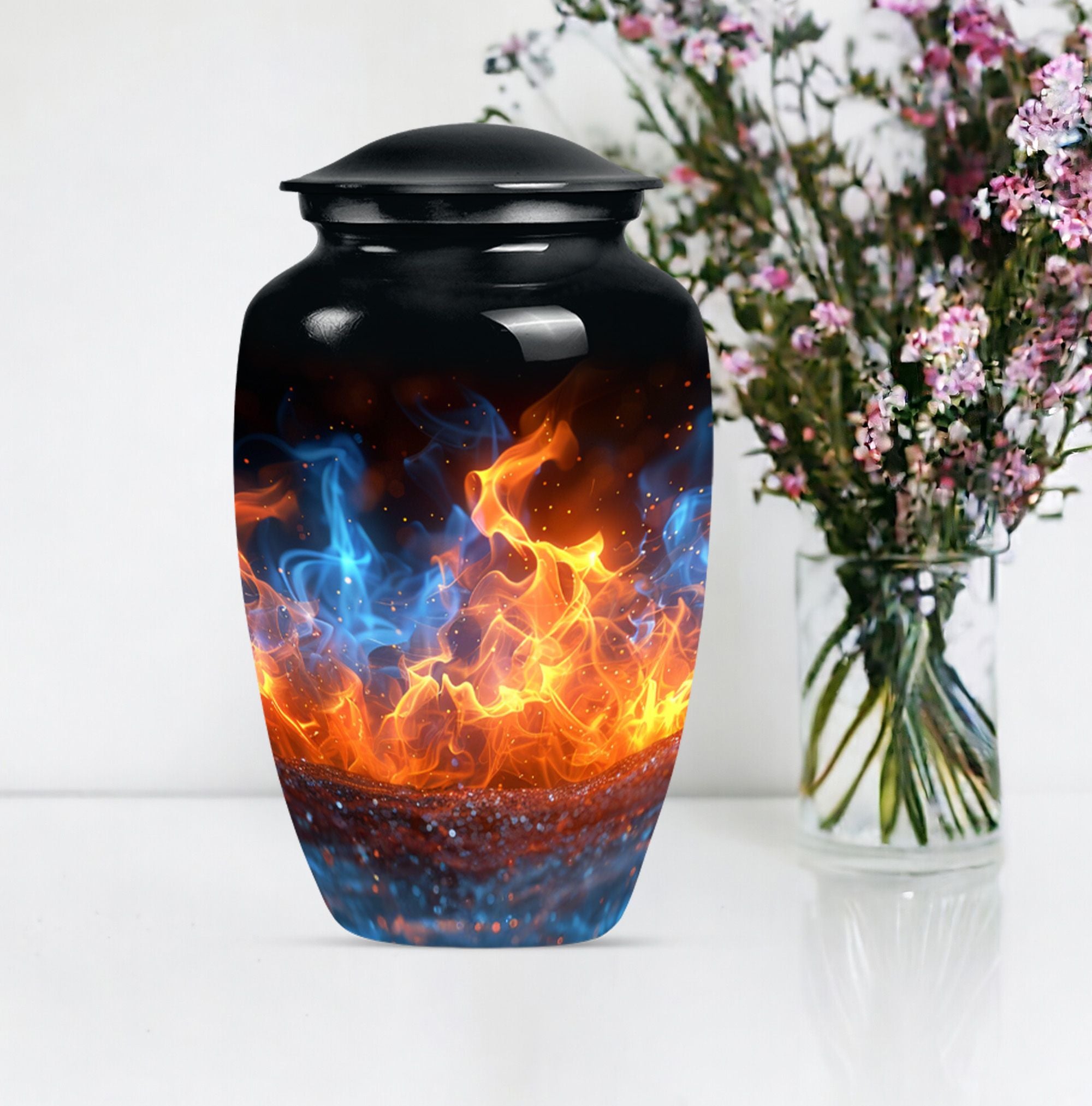 Immerse in the abiding tribute to your loved ones with this fire urn, a dignified memorial urn for ashes. Fashioned in a 'Classic Urn' theme, this large, abstract urn engages with its unique design and impactful presence. Offering a capacity of 200 cubic inches, it ensures a comprehensive containment. Constructed from durable aluminium, it stands solid and timeless, just like those memories. The 10-inch size and a weight of 3.3 pounds make it a substantial addition to your memorial ceremony supply. As a part of the package, we offer a lovely velvet pouch that respectfully secures the ashes. We recognize the importance of making it personal; thus, we offer customization with engraved names. The fire Urn harmoniously merges with your ceremony's solemn ambiance. It goes beyond being a cremation urn; it serves as an urn for burial, a funeral metal urn, and a tastefully shaped ashes urn, reflecting your feelings and respect. Its immortality also extends its usability as a decorative item, subtly maintaining its purpose.