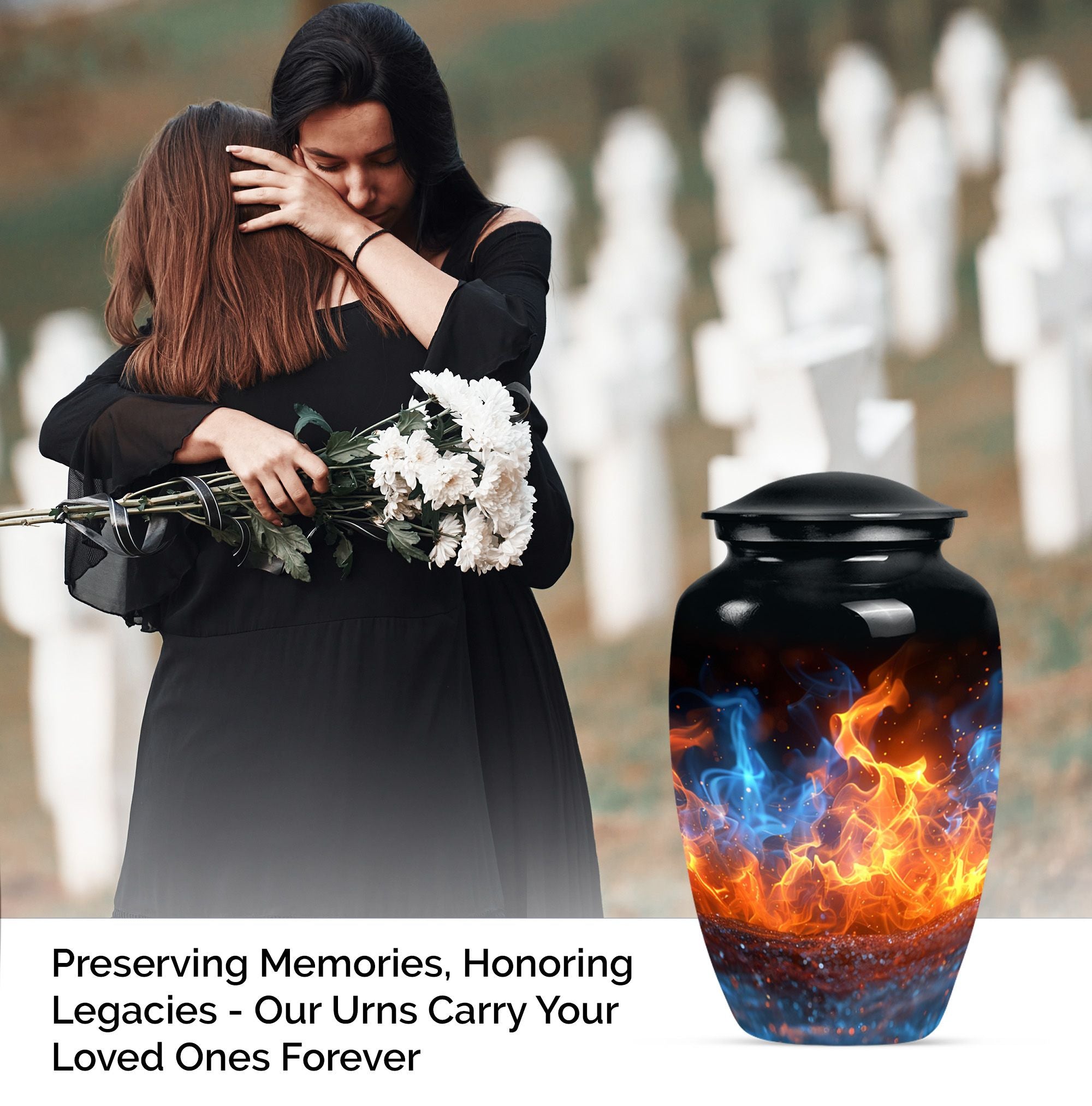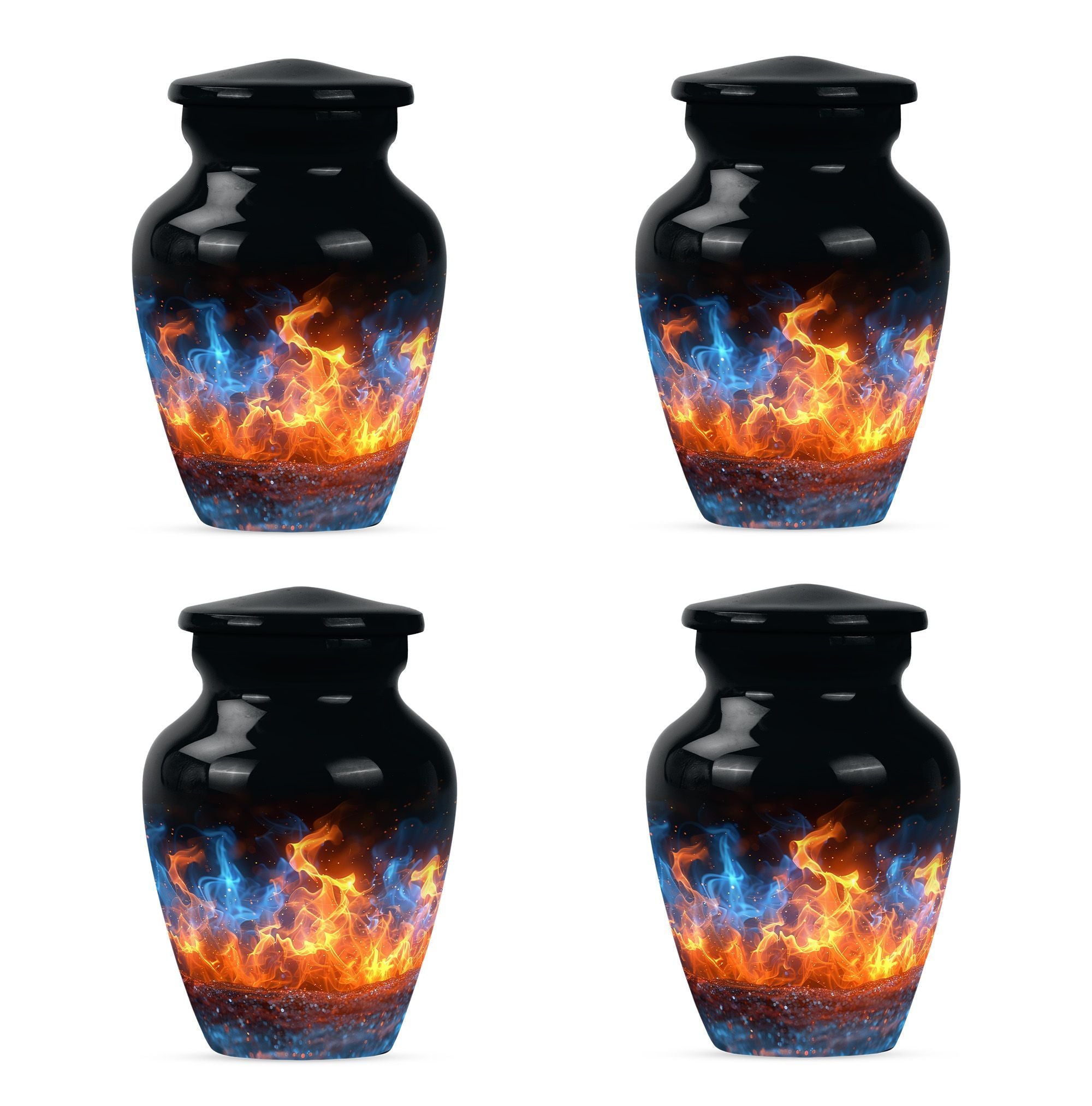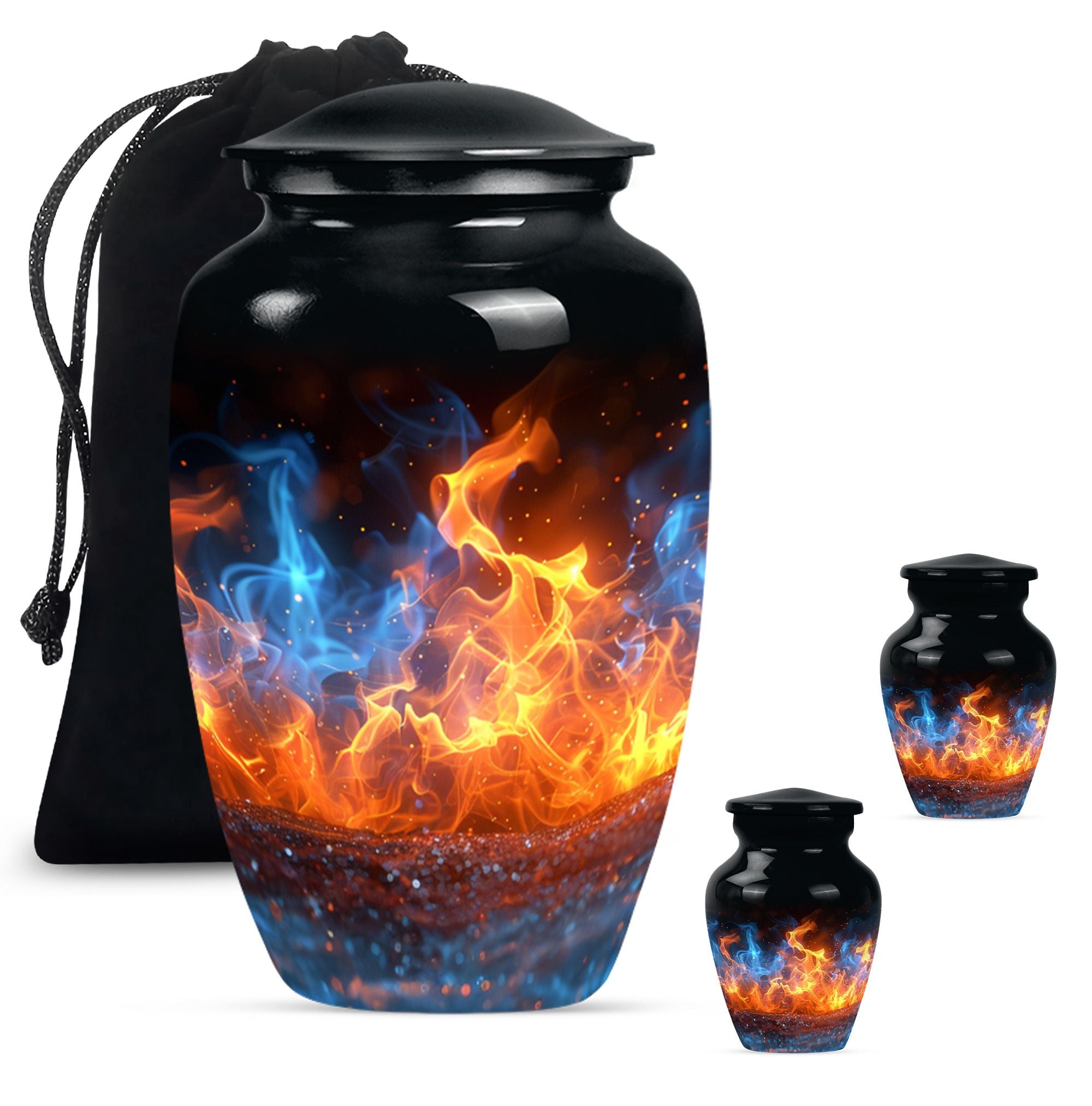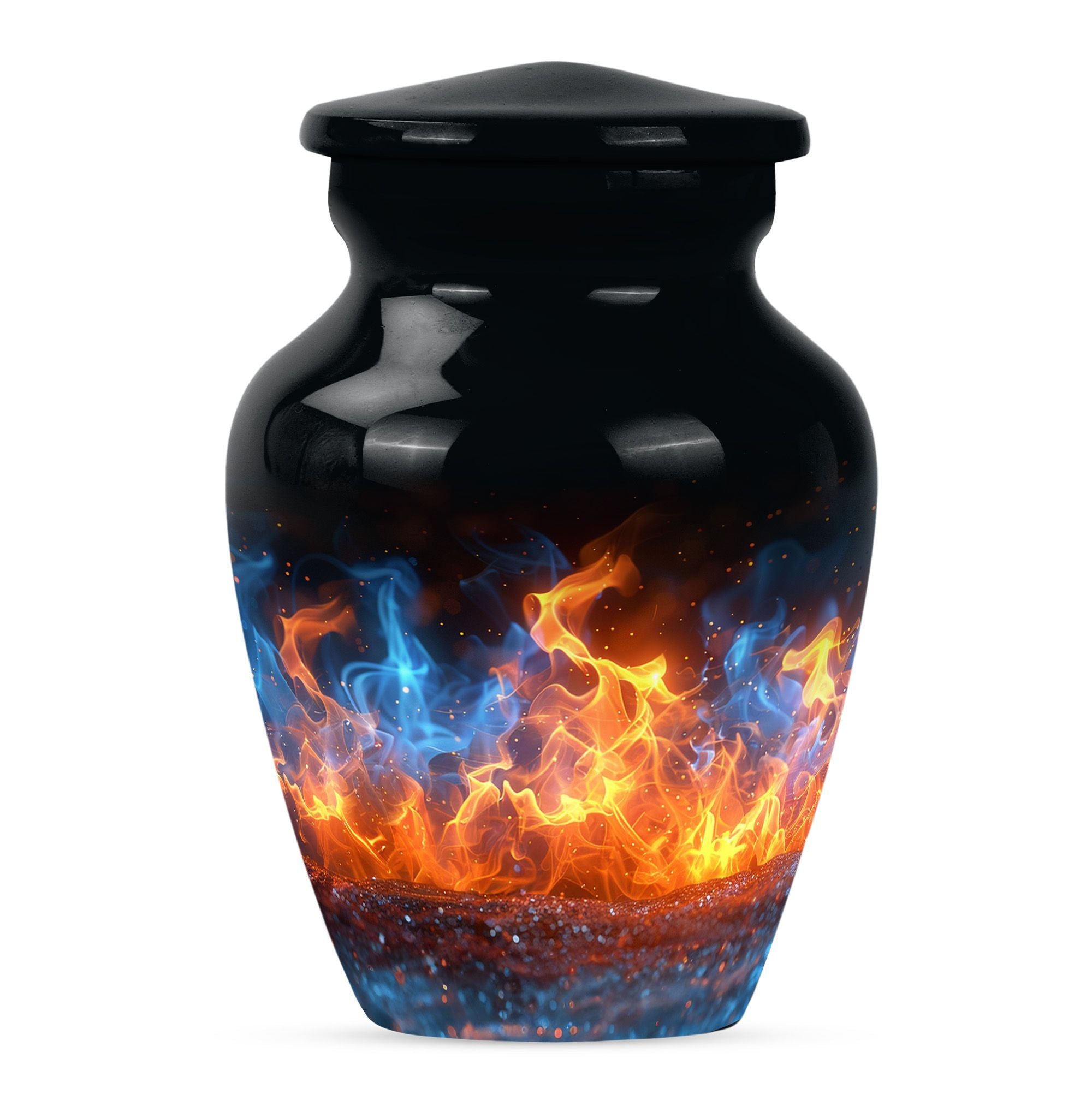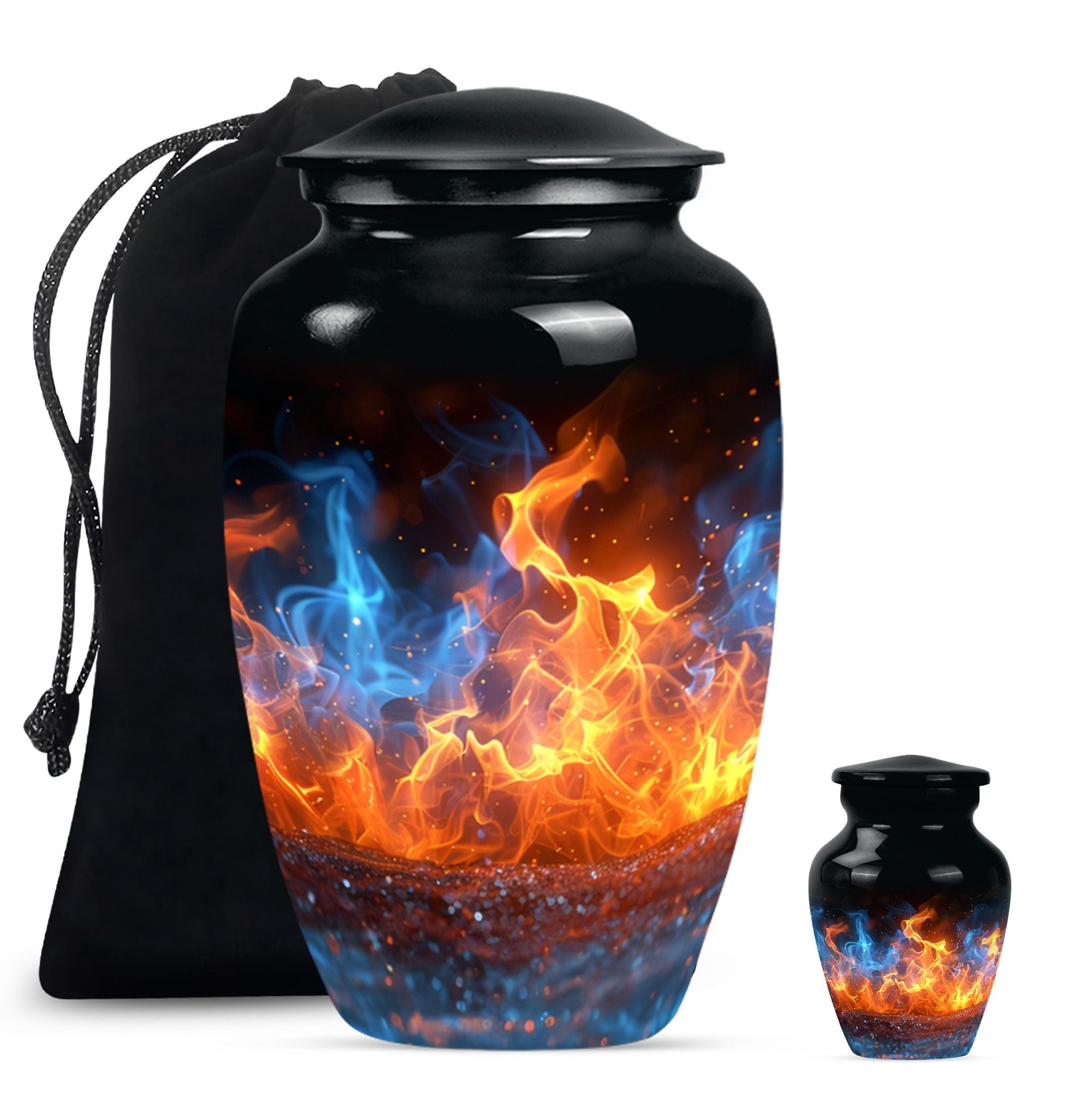 Immerse in the abiding tribute to your loved ones with this fire urn, a dignified memorial urn for ashes. Fashioned in a 'Classic Urn' theme, this large, abstract urn engages with its unique design and impactful presence. Offering a capacity of 200 cubic inches, it ensures a comprehensive containment. Constructed from durable aluminium, it stands solid and timeless, just like those memories. The 10-inch size and a weight of 3.3 pounds make it a substantial addition to your memorial ceremony supply. As a part of the package, we offer a lovely velvet pouch that respectfully secures the ashes. We recognize the importance of making it personal; thus, we offer customization with engraved names. The fire Urn harmoniously merges with your ceremony's solemn ambiance. It goes beyond being a cremation urn; it serves as an urn for burial, a funeral metal urn, and a tastefully shaped ashes urn, reflecting your feelings and respect. Its immortality also extends its usability as a decorative item, subtly maintaining its purpose.