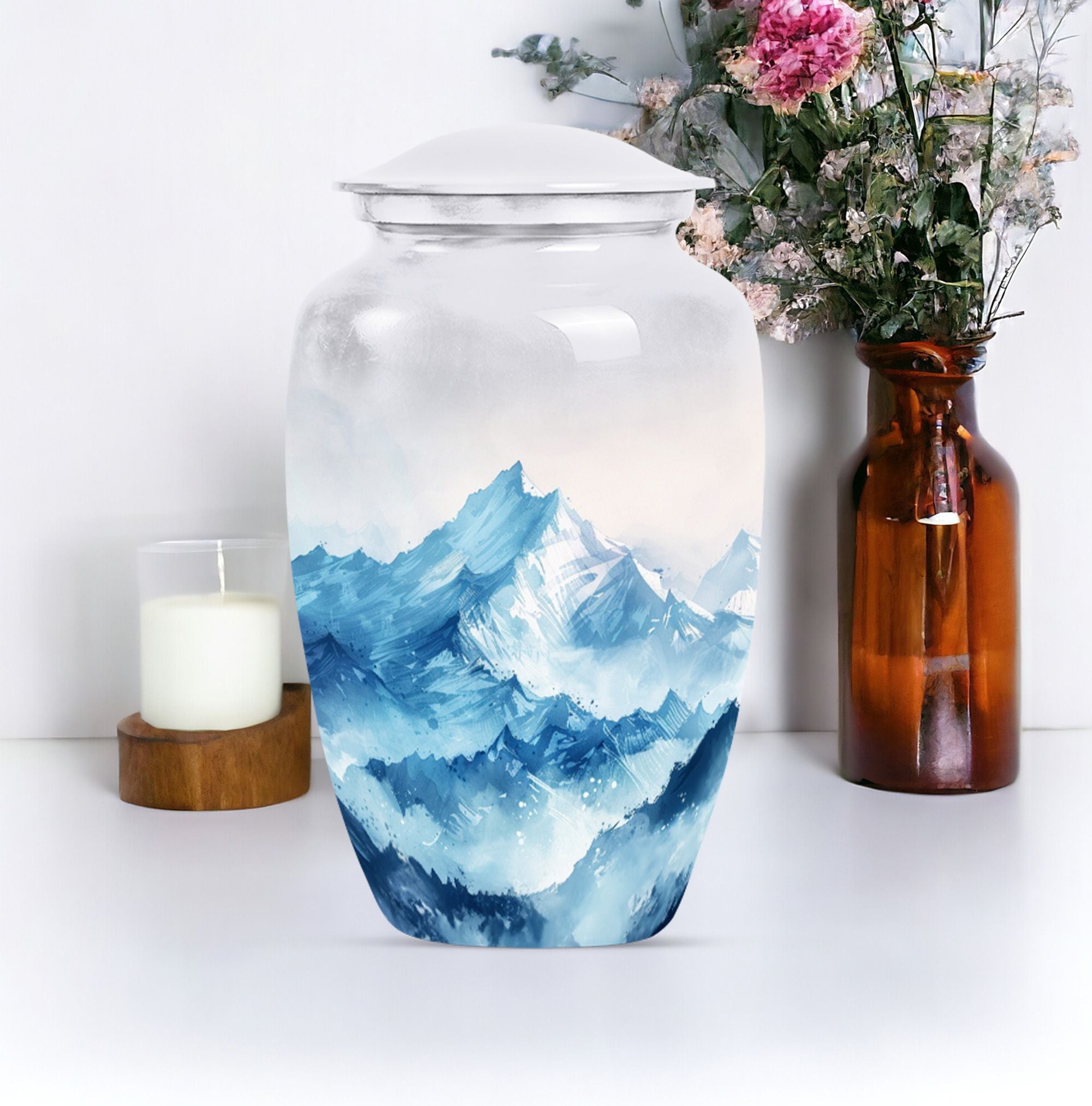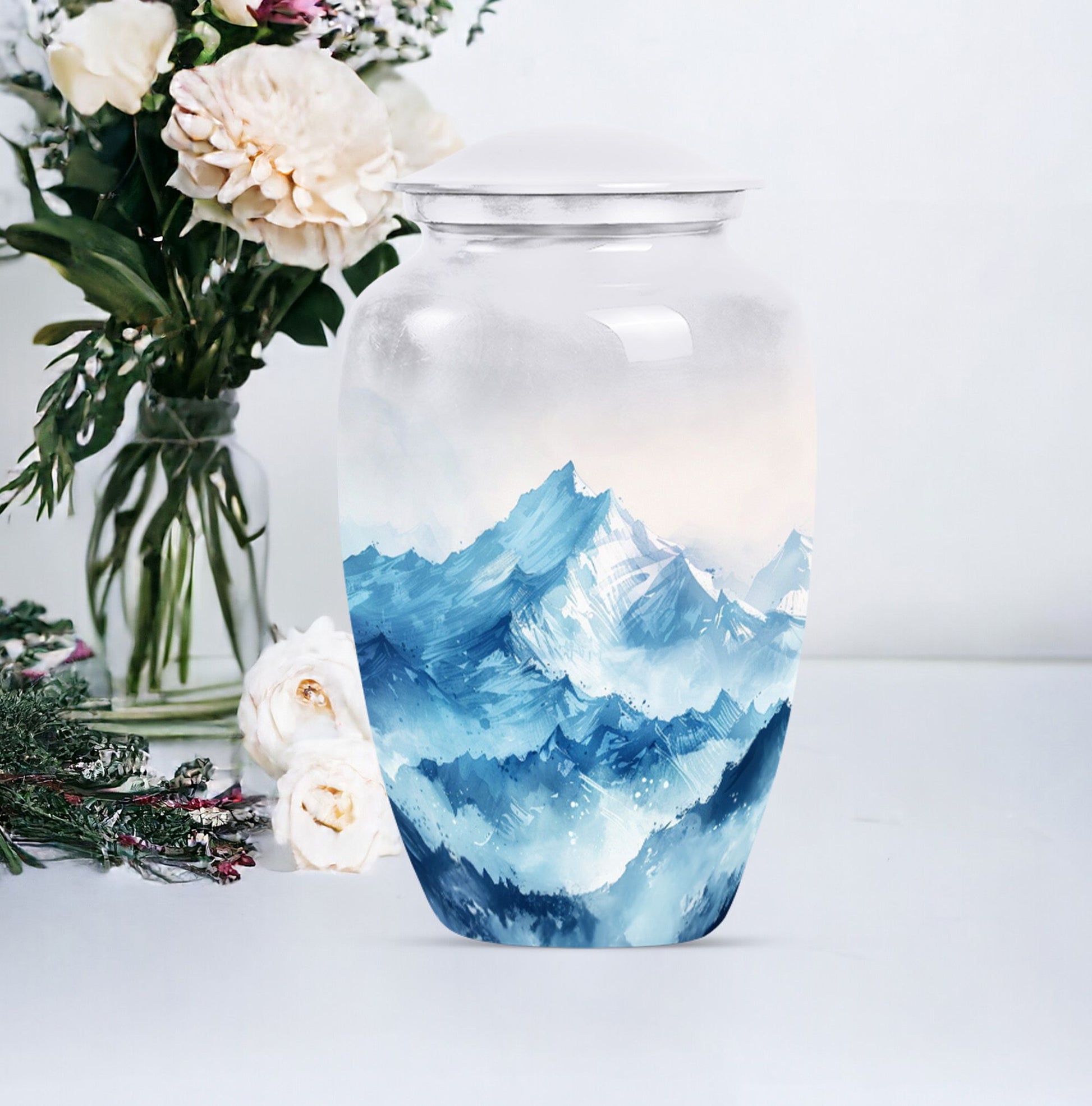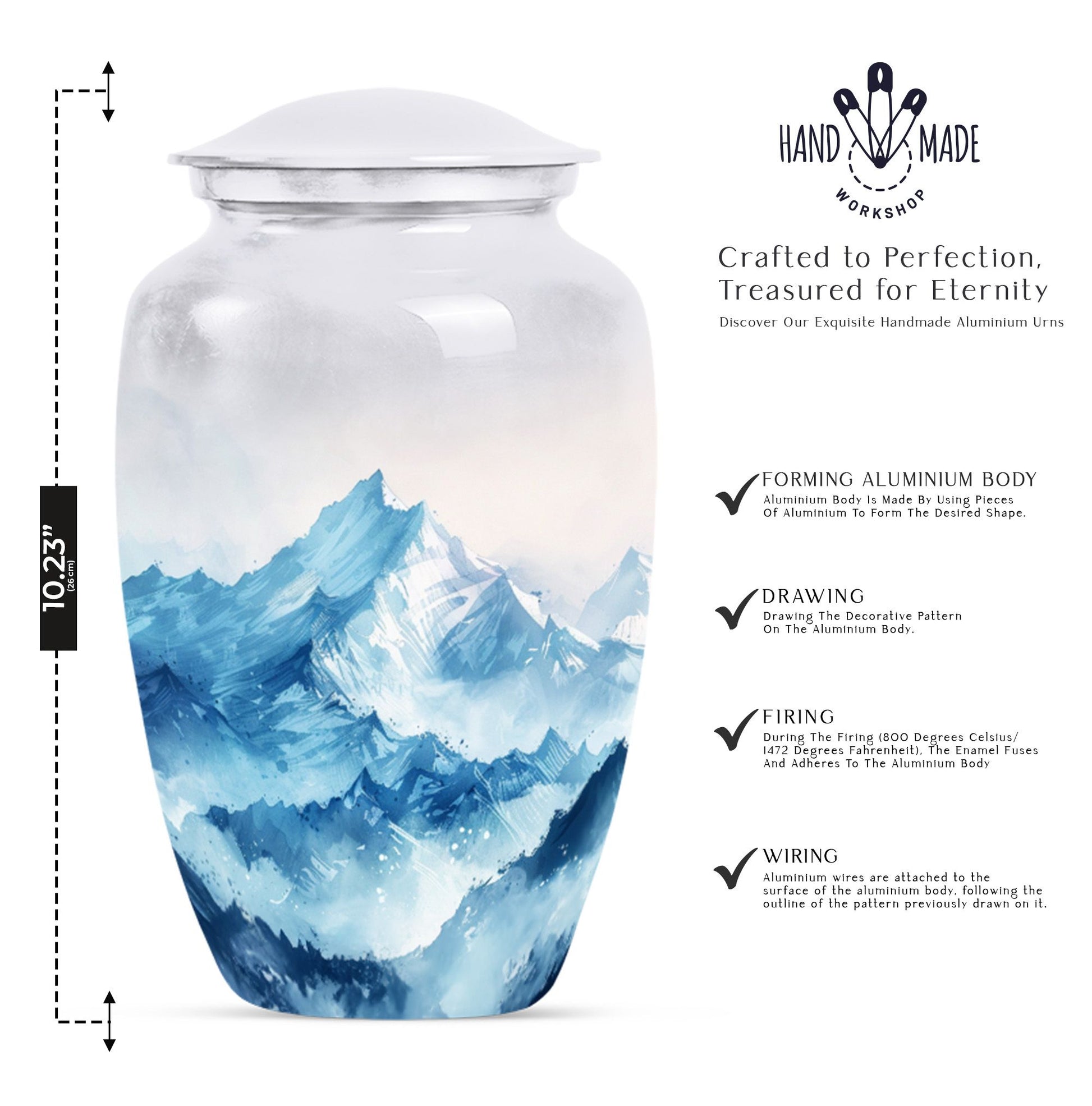 Discover an elegant resting place for your loved ones with this 10-Inch Classic Urn. This large urn is meticulously crafted from high-quality Aluminium, offering durability that sustains time. The outer layer of the urn is subtly embellished with an engaging abstract design that adds to its visual appeal. It possesses a capacity of 200 cubic inches, providing ample space for adult ashes. The urn measures 10 inches in height and has a balanced weight of 3.3 pounds. Additional accessories include a plush velvet pouch, perfect for the containment and preservation of ashes. Revamp the standard memorial urns with our mountains urn, a fitting tribute for your beloved mom, or choose to personalize it with engraved names for a more intimate touch. This large urn is an ideal choice for those searching for memorial adult urns, custom cremation urns or earns for ashes. A cherished remembrance for your loved one, an assurance of your perpetual love.