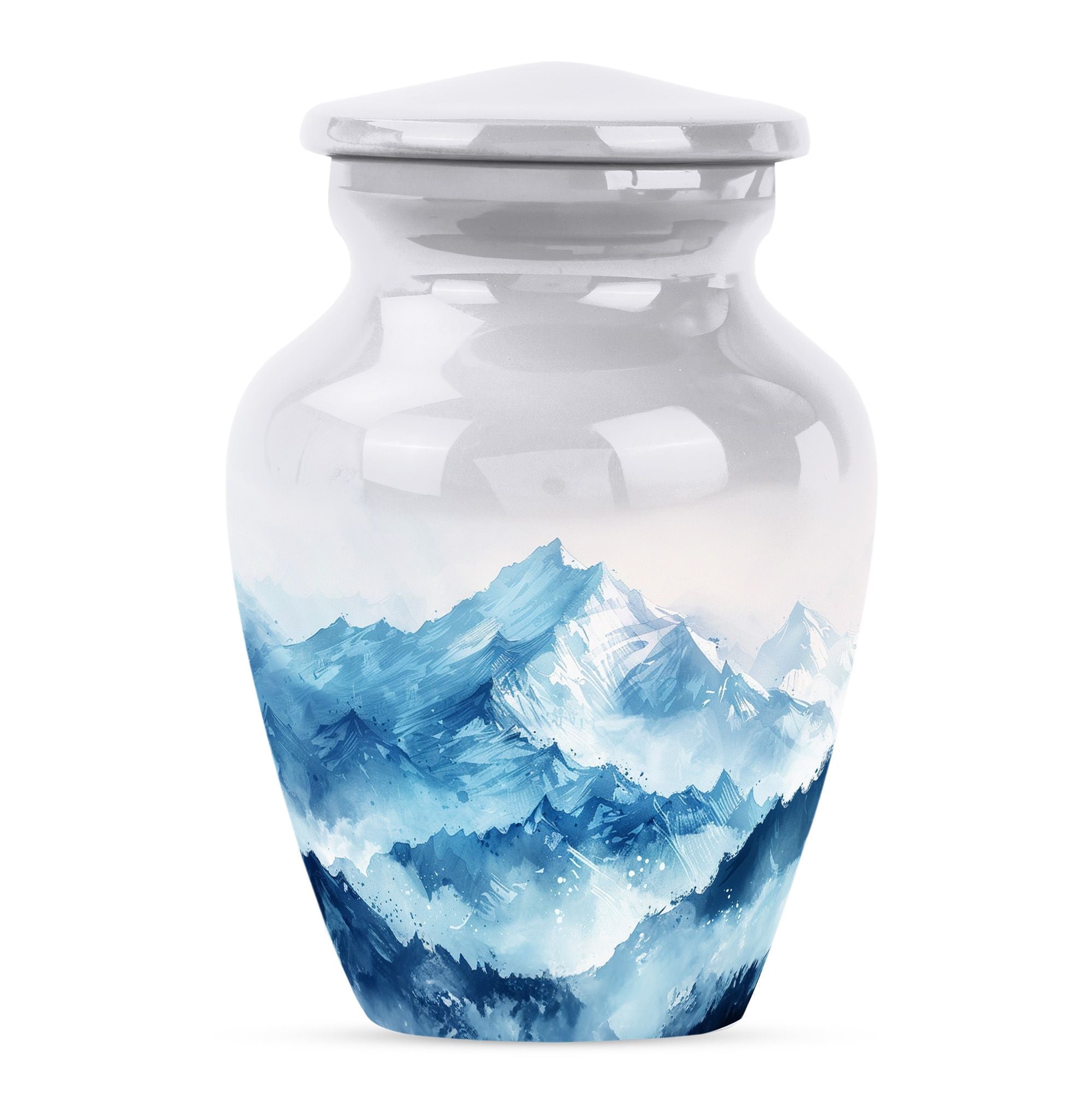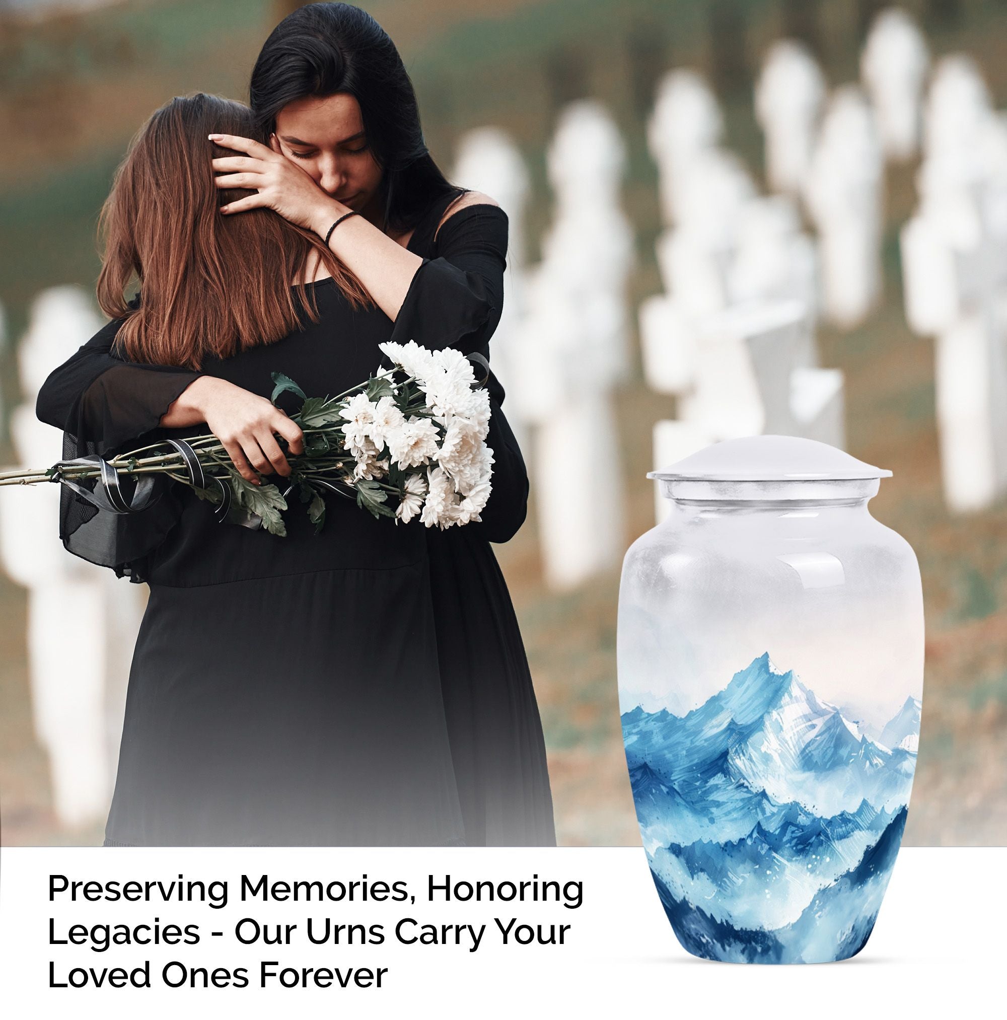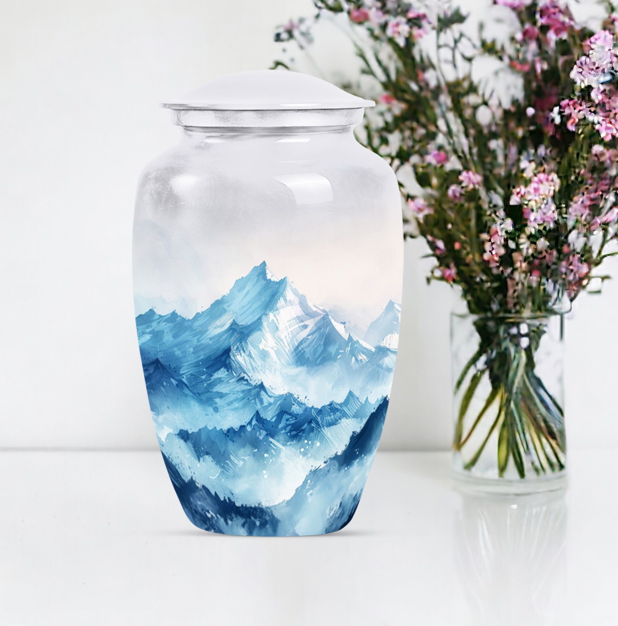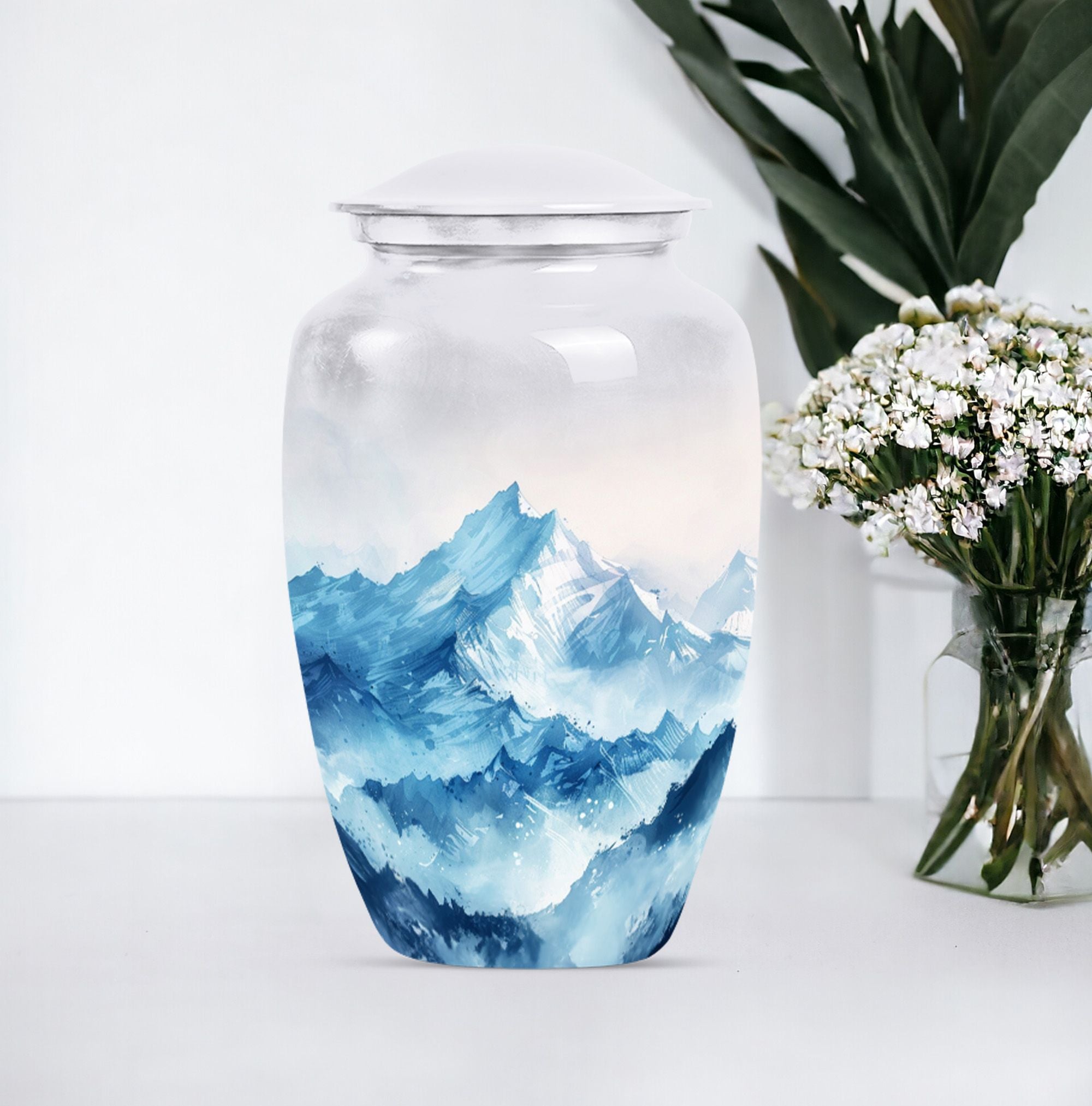 Discover an elegant resting place for your loved ones with this 10-Inch Classic Urn. This large urn is meticulously crafted from high-quality Aluminium, offering durability that sustains time. The outer layer of the urn is subtly embellished with an engaging abstract design that adds to its visual appeal. It possesses a capacity of 200 cubic inches, providing ample space for adult ashes. The urn measures 10 inches in height and has a balanced weight of 3.3 pounds. Additional accessories include a plush velvet pouch, perfect for the containment and preservation of ashes. Revamp the standard memorial urns with our mountains urn, a fitting tribute for your beloved mom, or choose to personalize it with engraved names for a more intimate touch. This large urn is an ideal choice for those searching for memorial adult urns, custom cremation urns or earns for ashes. A cherished remembrance for your loved one, an assurance of your perpetual love.