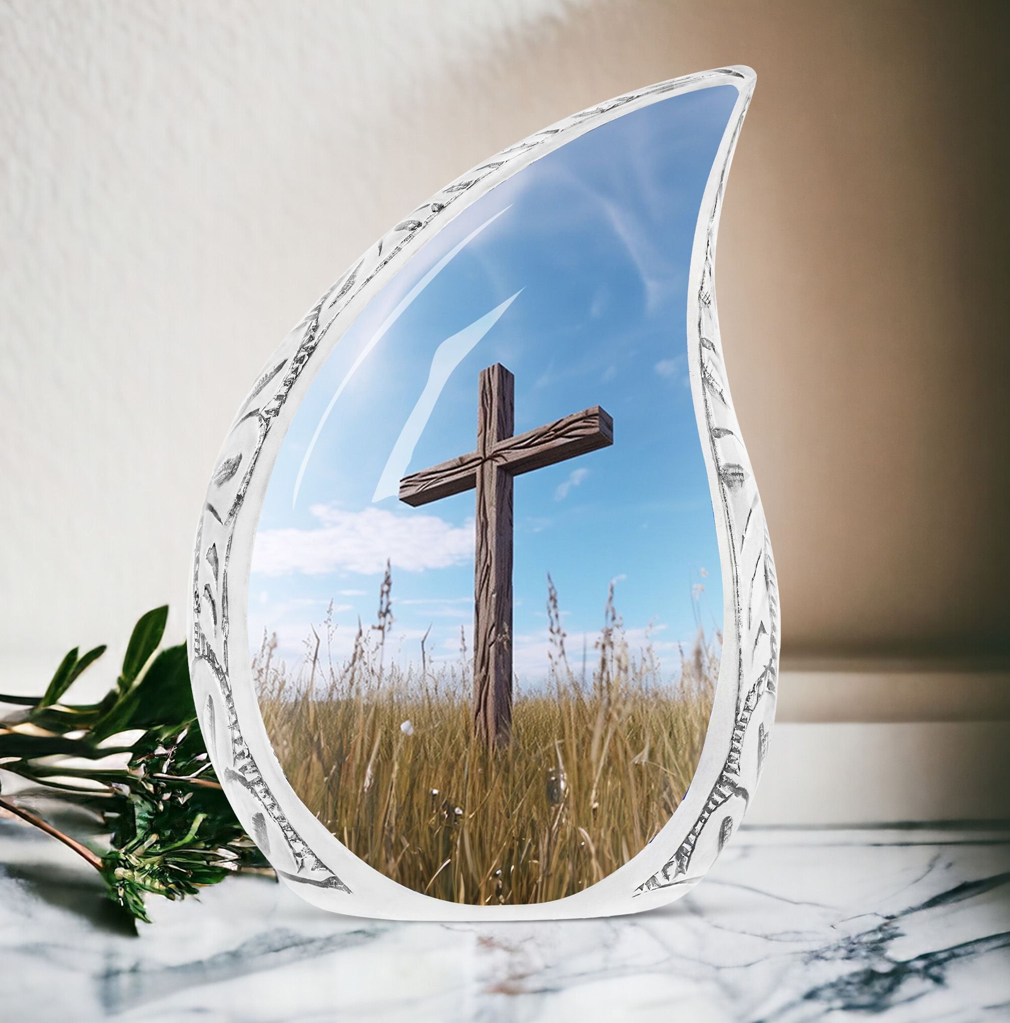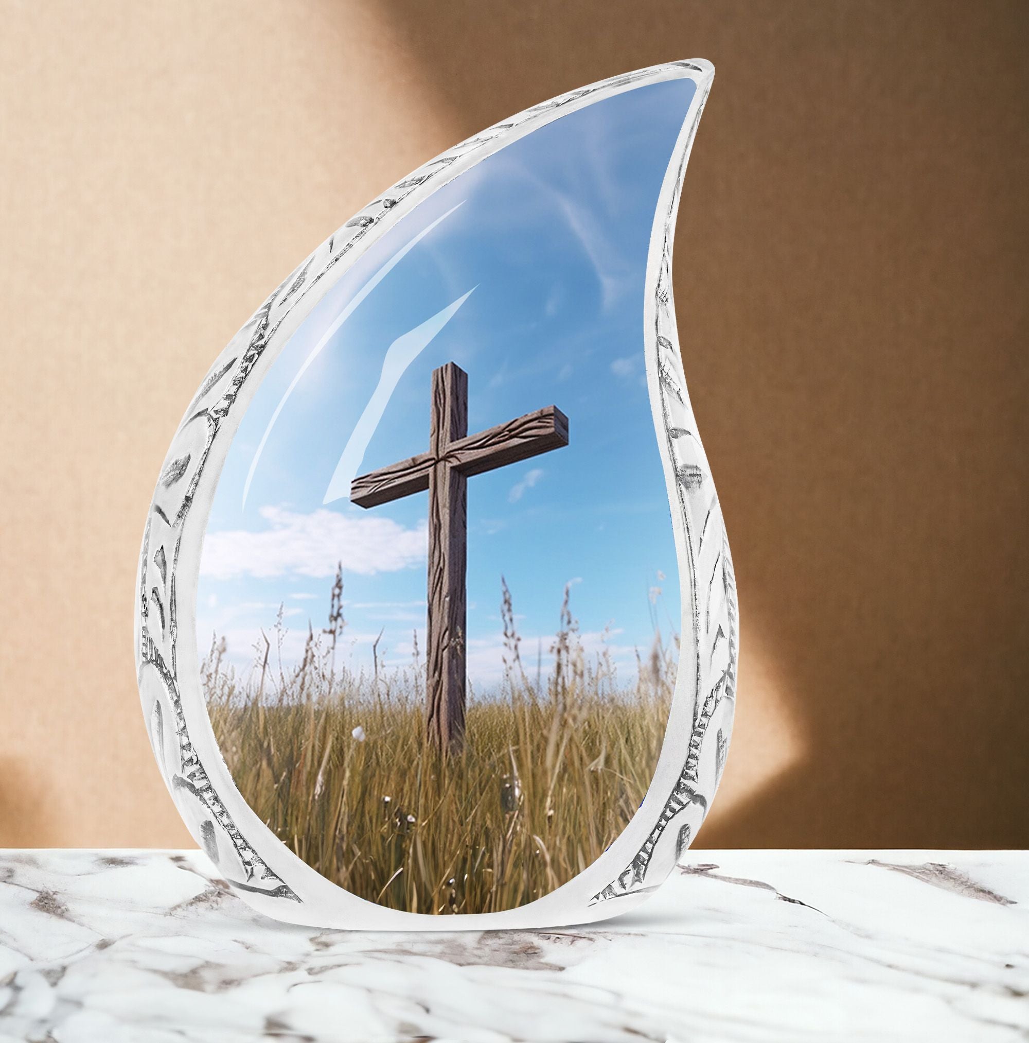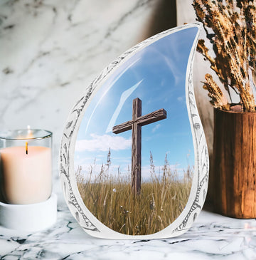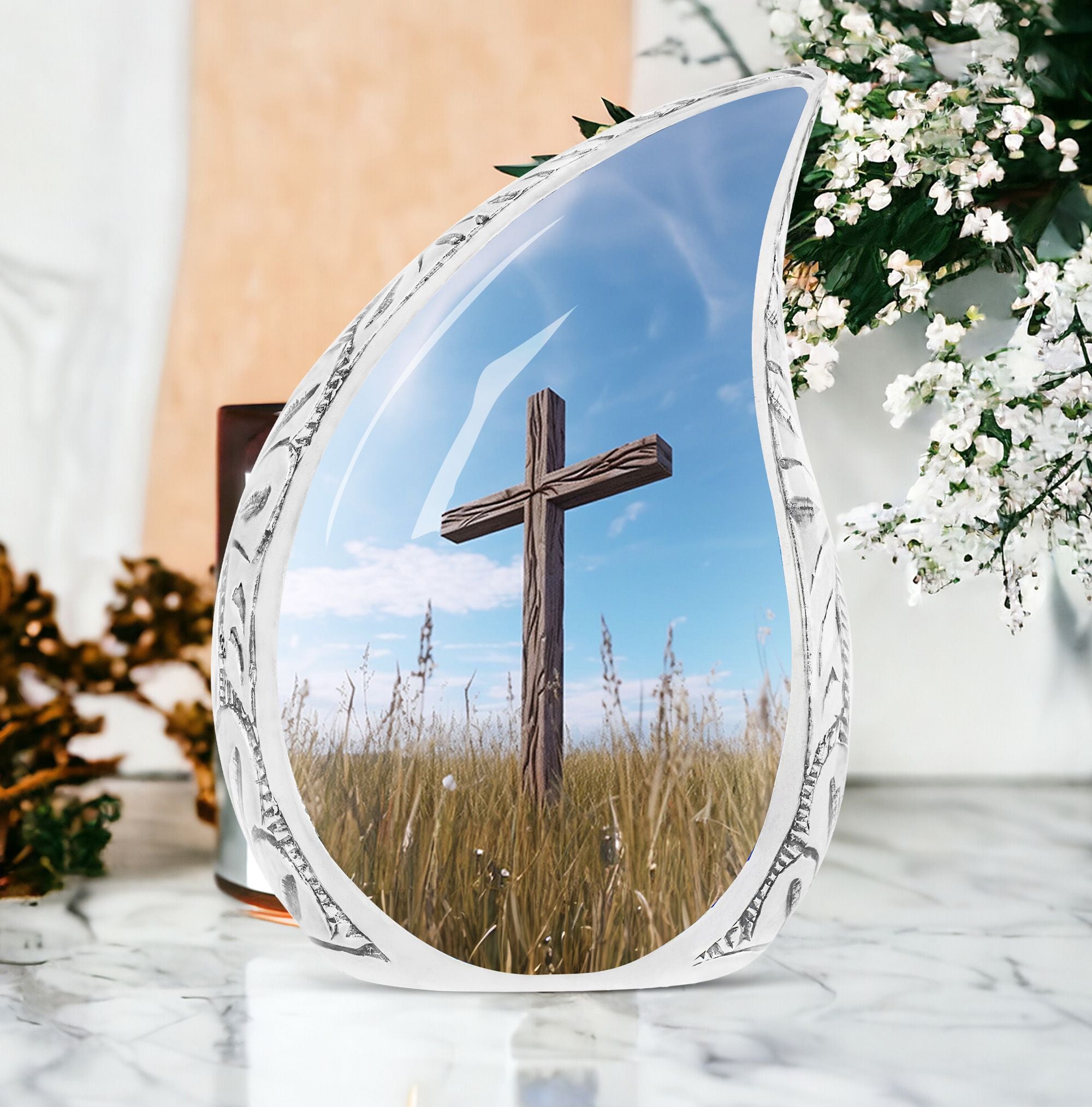 Discover peace and comfort with the Christ Urn in blue sky Cremation Urn, a thoughtfully engineered 3 Inch large urn that encapsulates the sentiments of love and remembrance. Crafted from durable and sophisticated aluminium, this classic urn defies overused designs, offering a unique alternative for your memorial ceremony considerations. With dimensions standing at 10 inches in height, and a weight of 3.3 pounds, this urn radiates substantial presence capable of securely storing up to 200 cubic inches of ashes. Customize the urn by engraving names, adding a personal touch to this respectful shrine. The package also includes a velvet pouch, ensuring safe containment of the encapsulated ashes. Whether you are seeking large urns for ashes, metal urns for ashes, or unique urns for dad, this cremation urn promises to capture your needs with an exceptional blend of quality, design, and sentiment. If cremation containers for ashes are your search preference, you'd find this unique urn to be a fitting testament to the memory of your loved one.