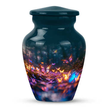 Bring honor to a loved one with our stunning Butterfly Urn, an elegant and fitting tribute for funerals or memorial ceremonies. Our product is exclusively sized at a height of 10 inches and crafted from high-quality Aluminium, rendering it a durable and timeless choice. The Abstract theme adds a unique touch to its appearance. With a capacity of 200 cubic inches, this large urn can comfortably contain the ashes of the deceased. To enhance your remembrance, we offer the service to personalize the urn with engraved names, making it a truly individual commemoration of your loved one. The urn weighs a sturdy 3.3 pounds and ensures safe storage of cremated remains, shipping with a lavish velvet pouch for guardianship of the ashes. Whether you're considering funeral urns for human ashes adult, looking for memorial urns for burial in the ground, or require cremation rings for ashes, our meticulously designed Butterfly Urn serves all your needs. The terms 'human ash urn adult' or 'large metal urn for ashes' are perfect to find our urn online, offering beauty and refinement in remembrance of those we hold dear.