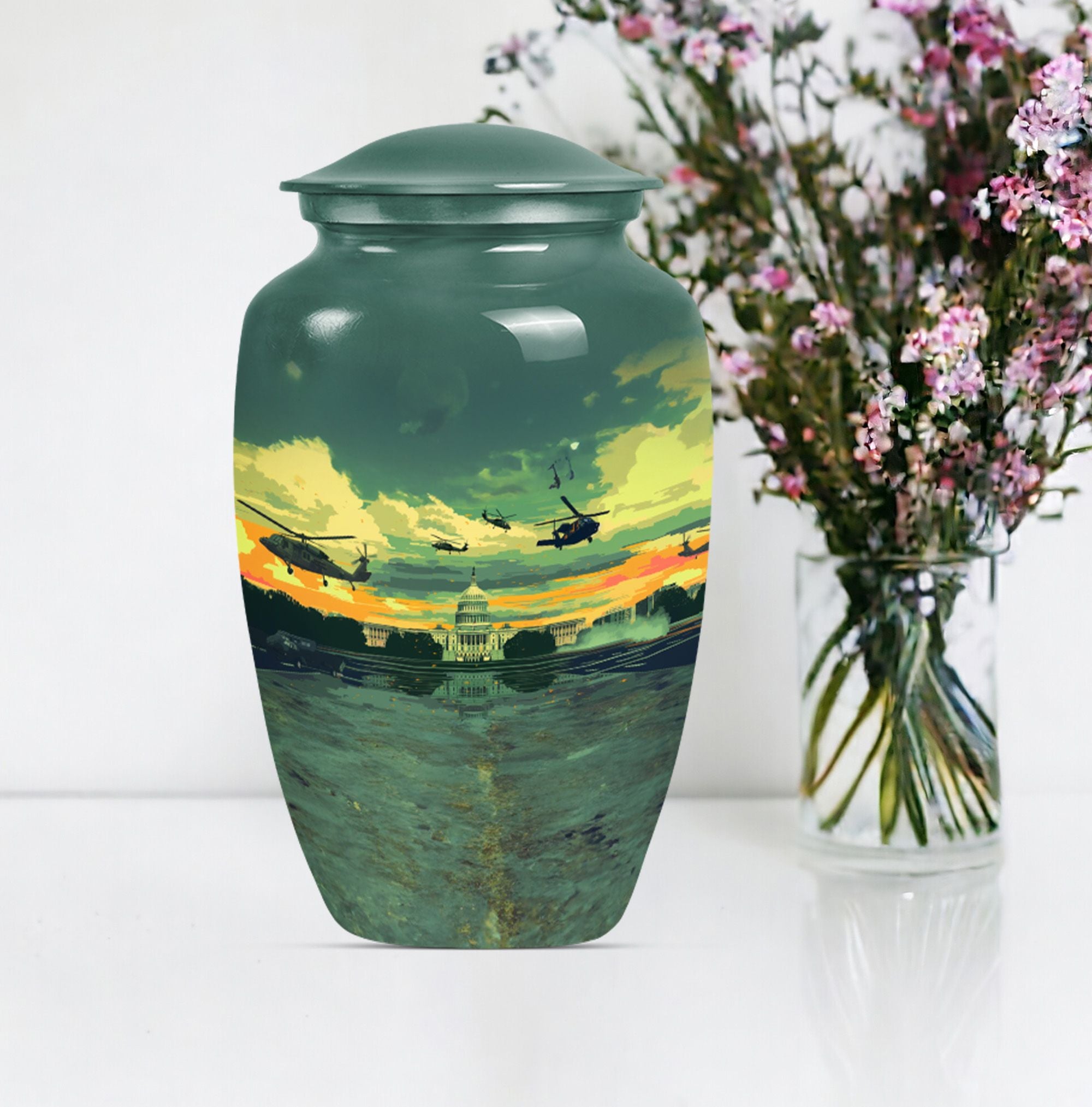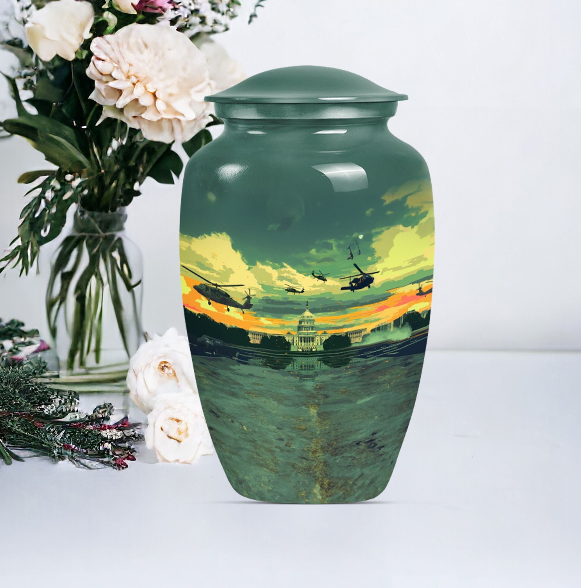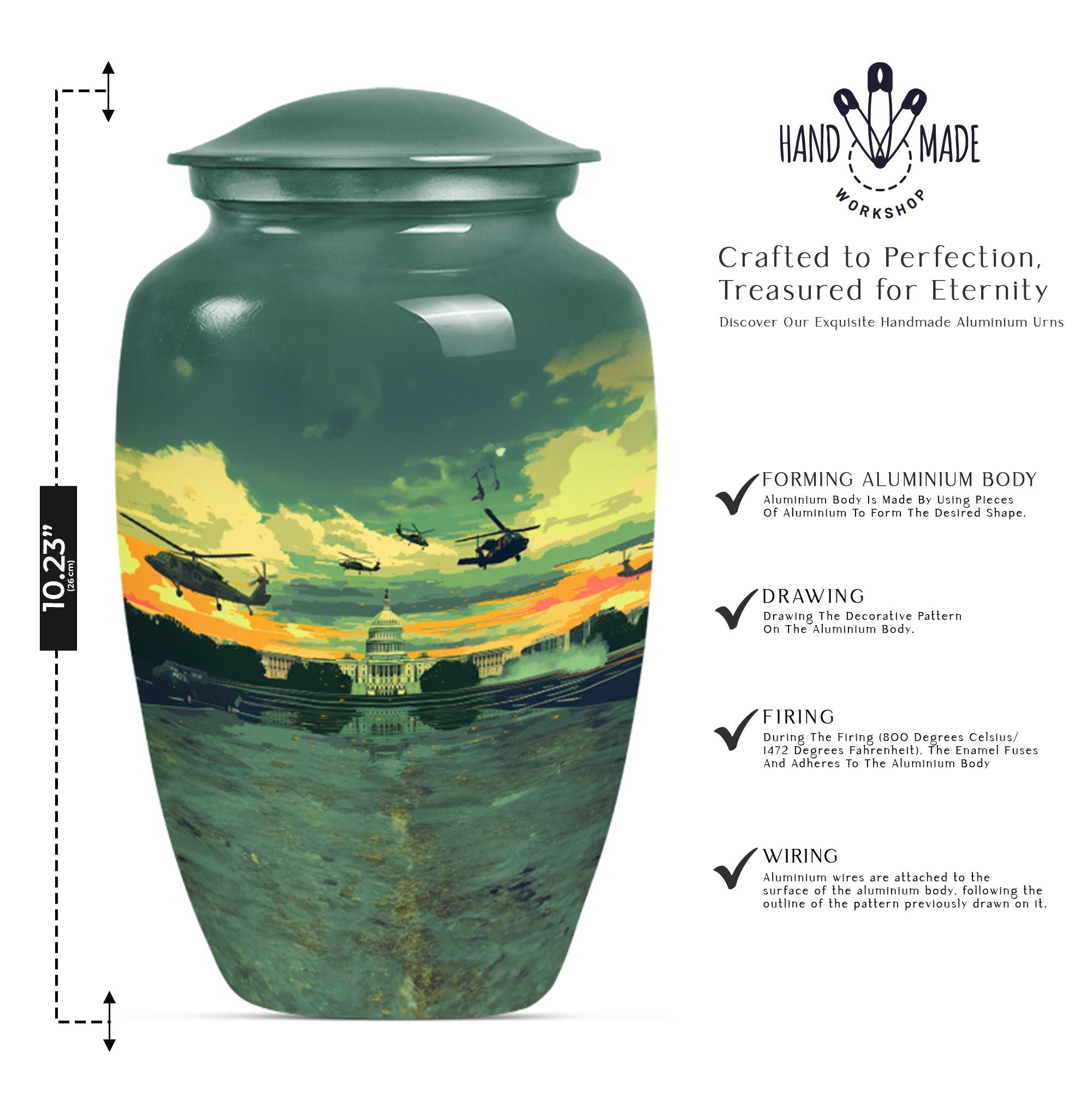 Honor the memory of your departed loved ones with our classic 10-Inch Military Urn. Crafted meticulously from high-quality, enduring Aluminium, this large urn is specifically designed to provide a dignified resting place. Featuring a weight of 3.3 pounds and dimensions of 10 inches in height, the urn offers ample space with its 200-cubic inch capacity, making it a suitable choice among memorial adult urns. The abstract theme doesn't impose a specific sense of style, making it a respectful choice for any individual. Each purchase also includes a lovely velvet pouch, providing a safe and respectable containment for the ashes. Elevate the personal touch with customization options that allow for engraved names. This memorial urn aligns perfectly with those seeking military urns or cremation urns for burial in the ground. Appreciate the remembrance of your loved ones with this quintessential symbol of commemoration.