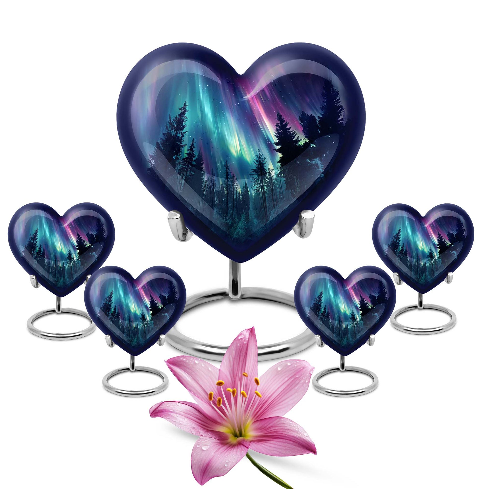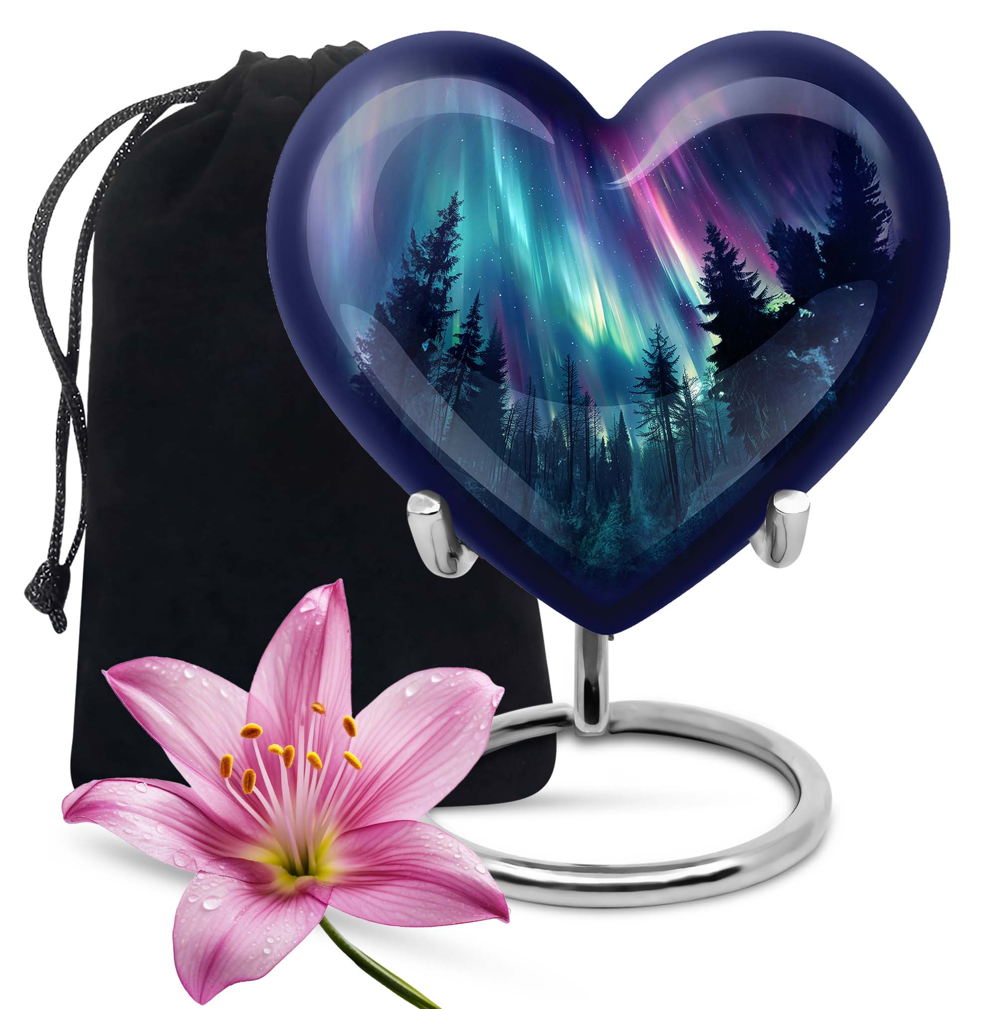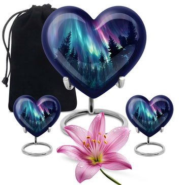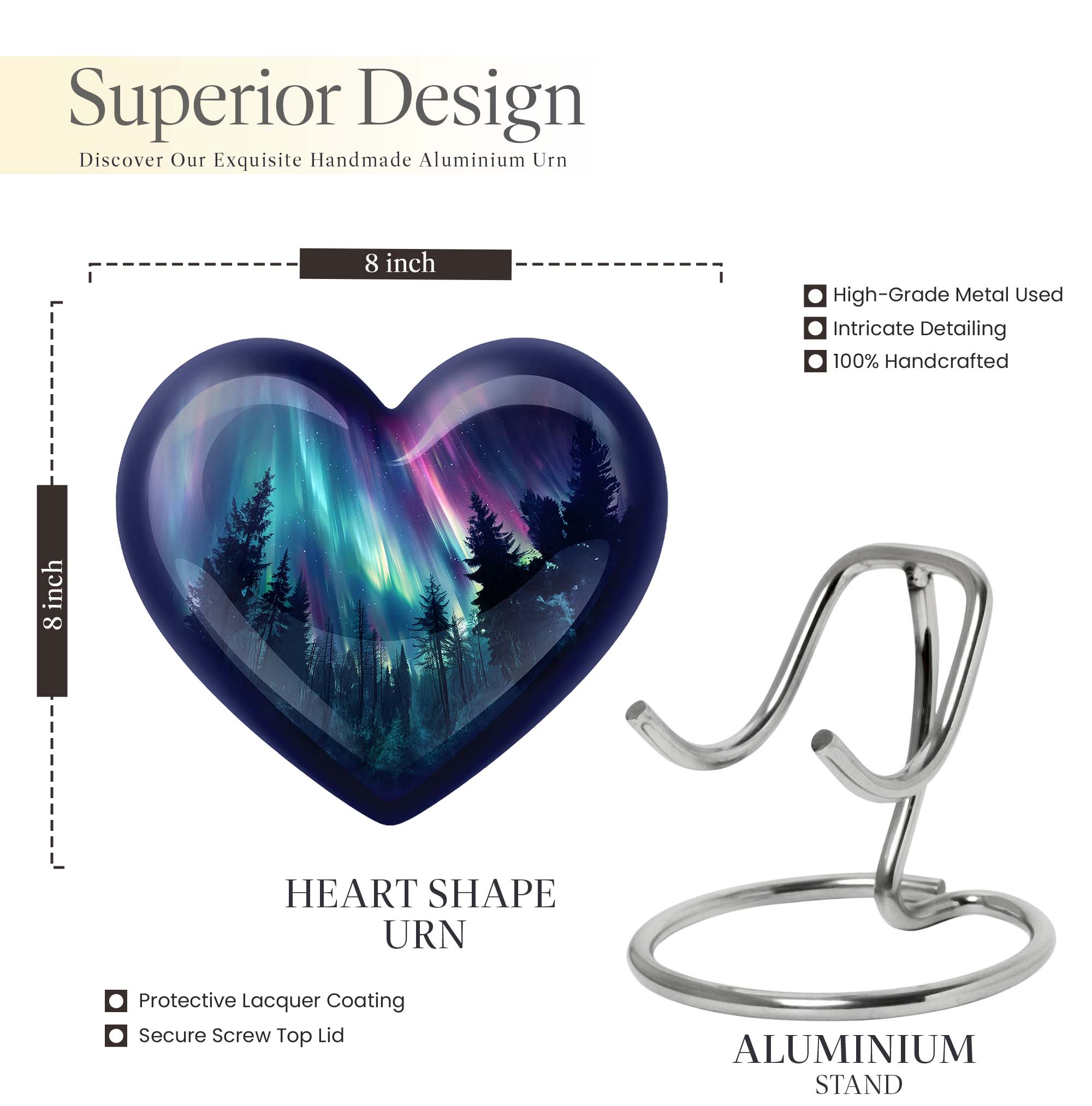 Embrace a unique way to remember your loved ones with the AURORA Urn. Crafted from quality aluminium, this monumental burial urn for human ashes stands tall at 10 inches, displaying an intriguing abstract theme that beautifully embodies a heartfelt message of eternal love and peace. It tips the scale at 3.3 pounds, providing a substantial capacity of 200 cubic inches, ample space for adult ashes. The AURORA Urn features an endearing heart motif, enhancing the emotional connection to your departed ones. For a more personalized touch, make use of the urn's customization option and engrave names on it, making it a timeless testament to their memory. This sizeable urn comes with a velvet pouch that offers graceful containment of the ashes, adding dignity and respect to your memorial essentials. Whether you're seeking funeral urns for mom or other loved ones, our burial urn sets an honorable stage for remembrance. Take a step towards closure, choose AURORA for your memorial urn needs.