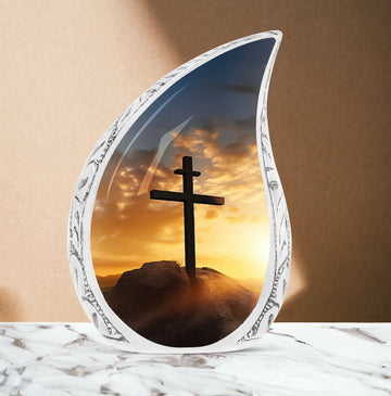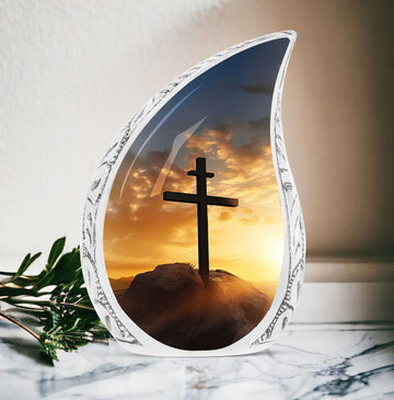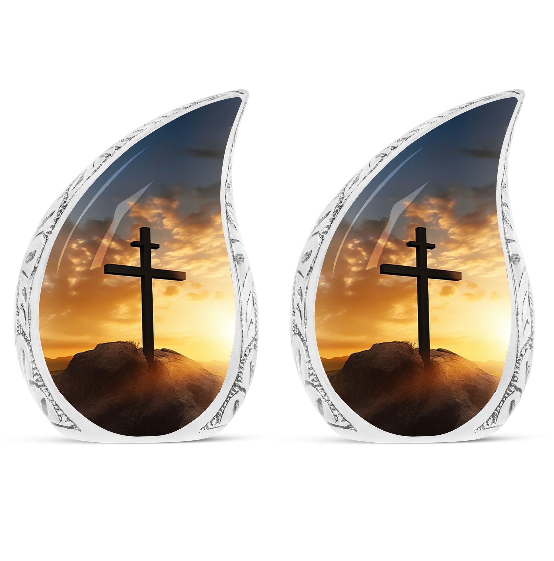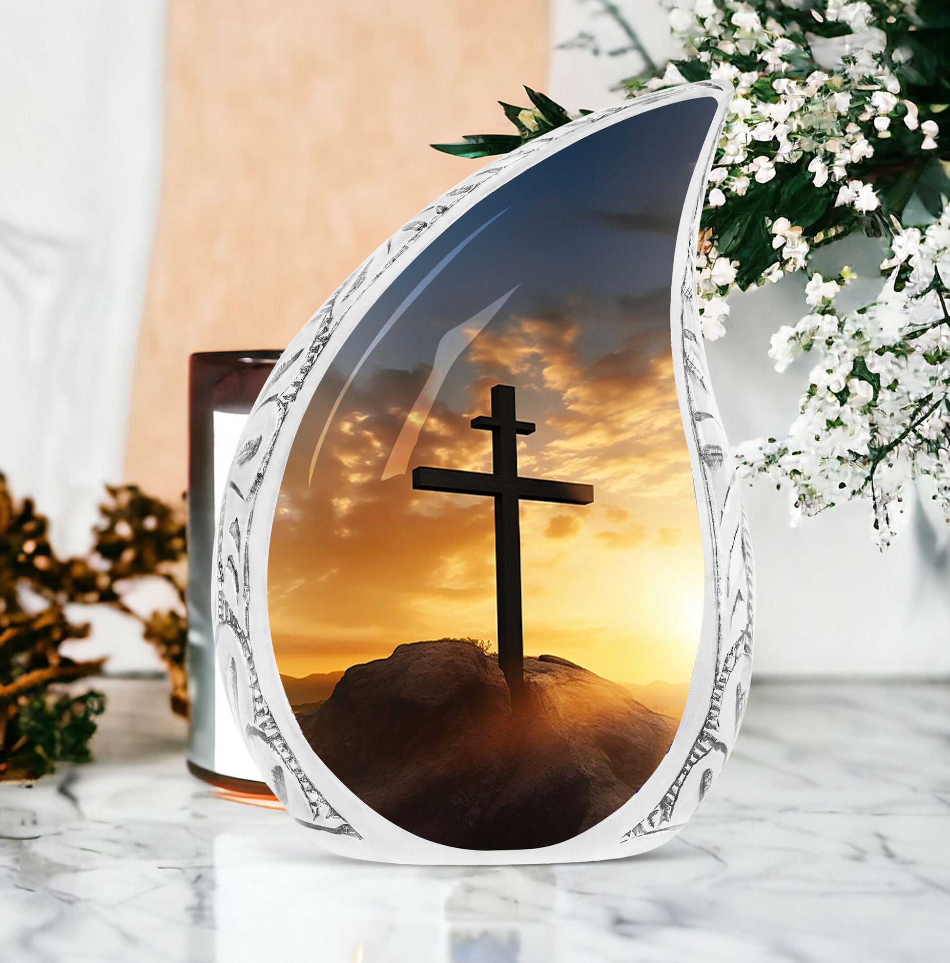 Honor and remember your departed loved one with our meticulously crafted 'Crucifixion of Jesus Christ Urn for Human Ashes.' Evoking a deeply spiritual motif, this exquisite keepsake urn is constructed from high-grade aluminium, giving it both a visual and physical weight that is both comforting and substantial. With a size of 3-inches, the urn weighs a reassuring 3.3 pounds and stands 10 inches tall, offering ample space with a capacity of 200 cubic inches. Our package includes a tastefully crafted velvet pouch, offering a dignified final dwelling for the ashes of the dearly departed. Customization with personalized, engraved names is available, establishing a profound connection with the departed. This large, classic urn is designed to be a reverent, enduring memorial for cremated remains.