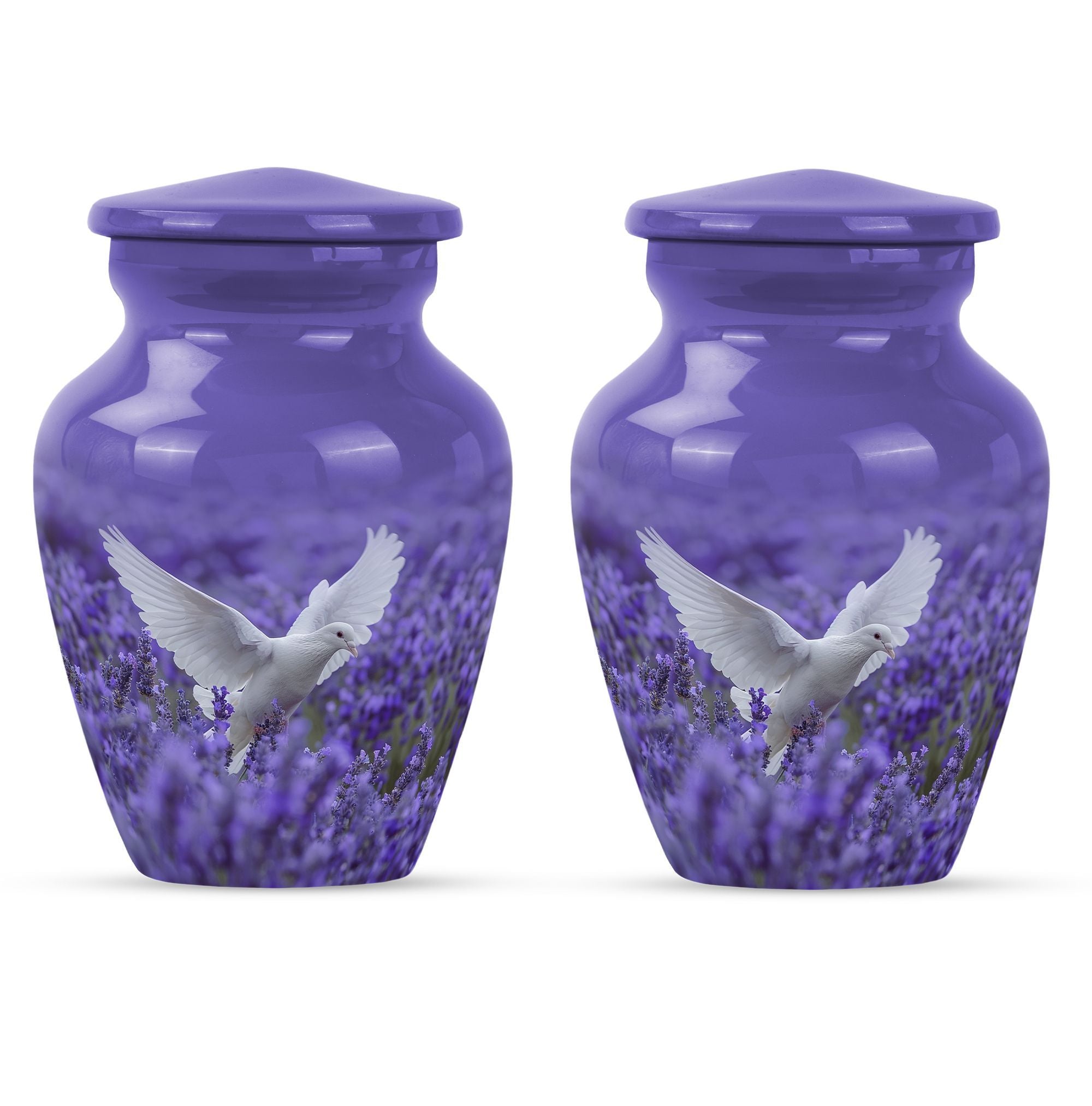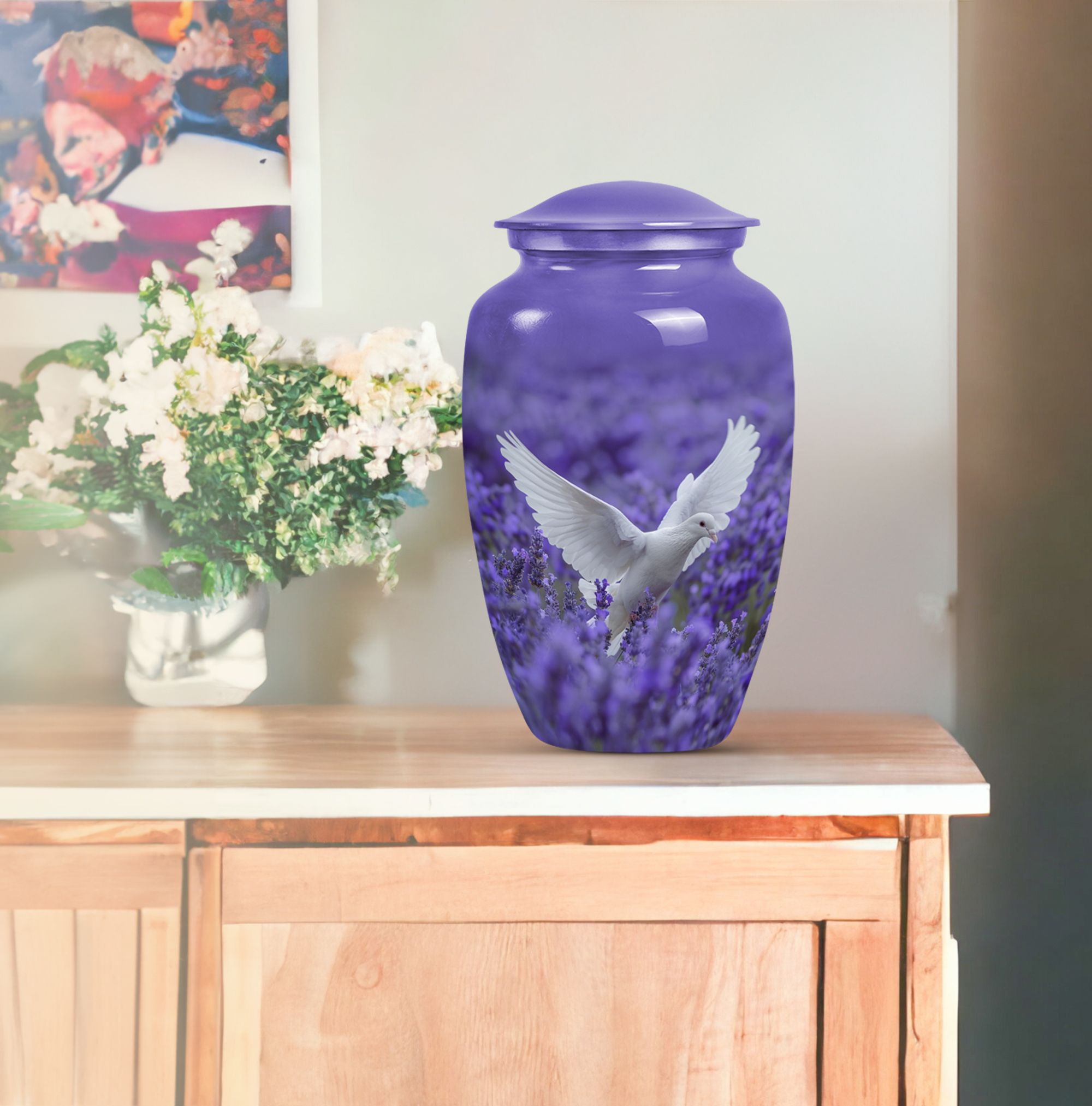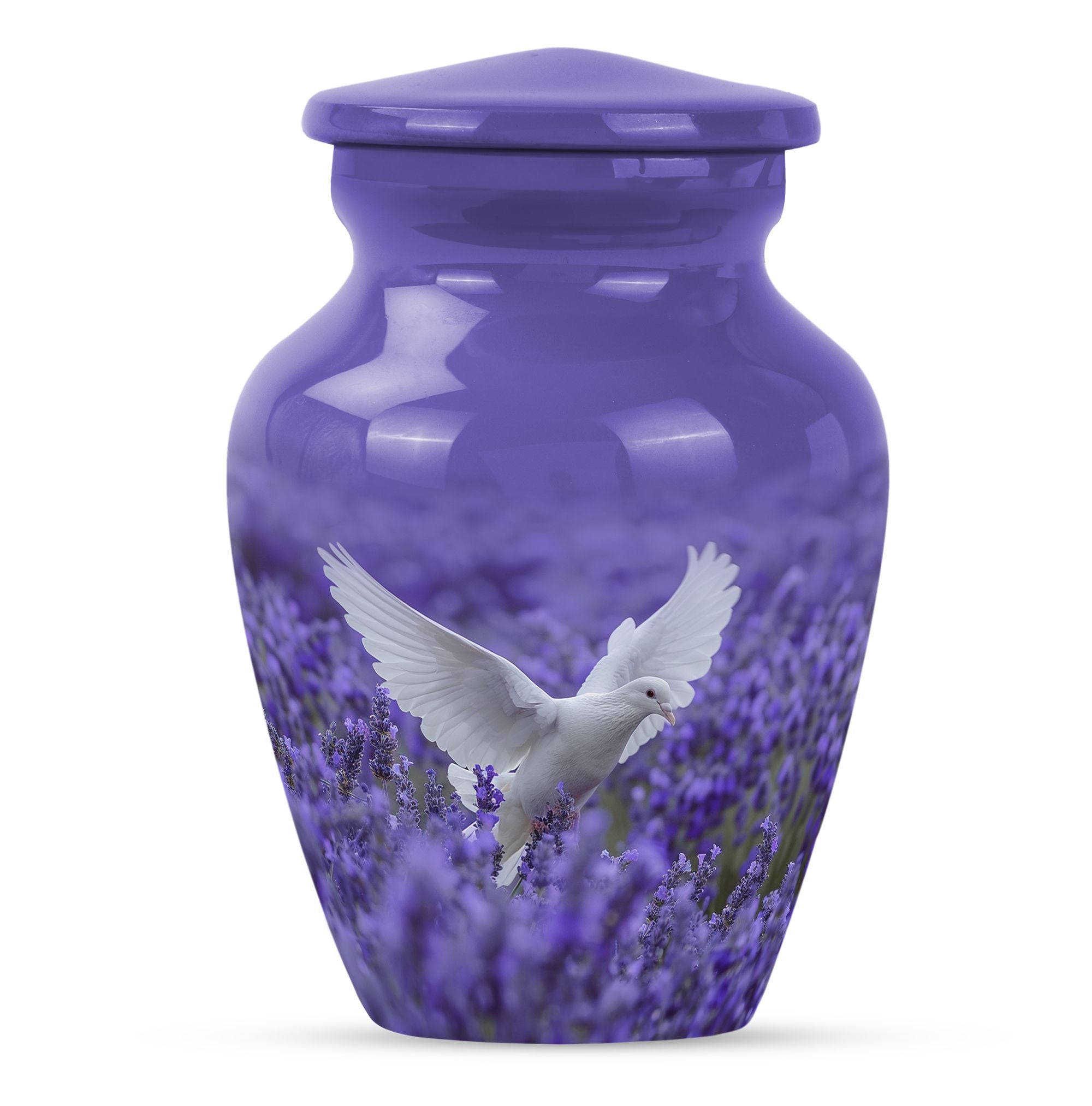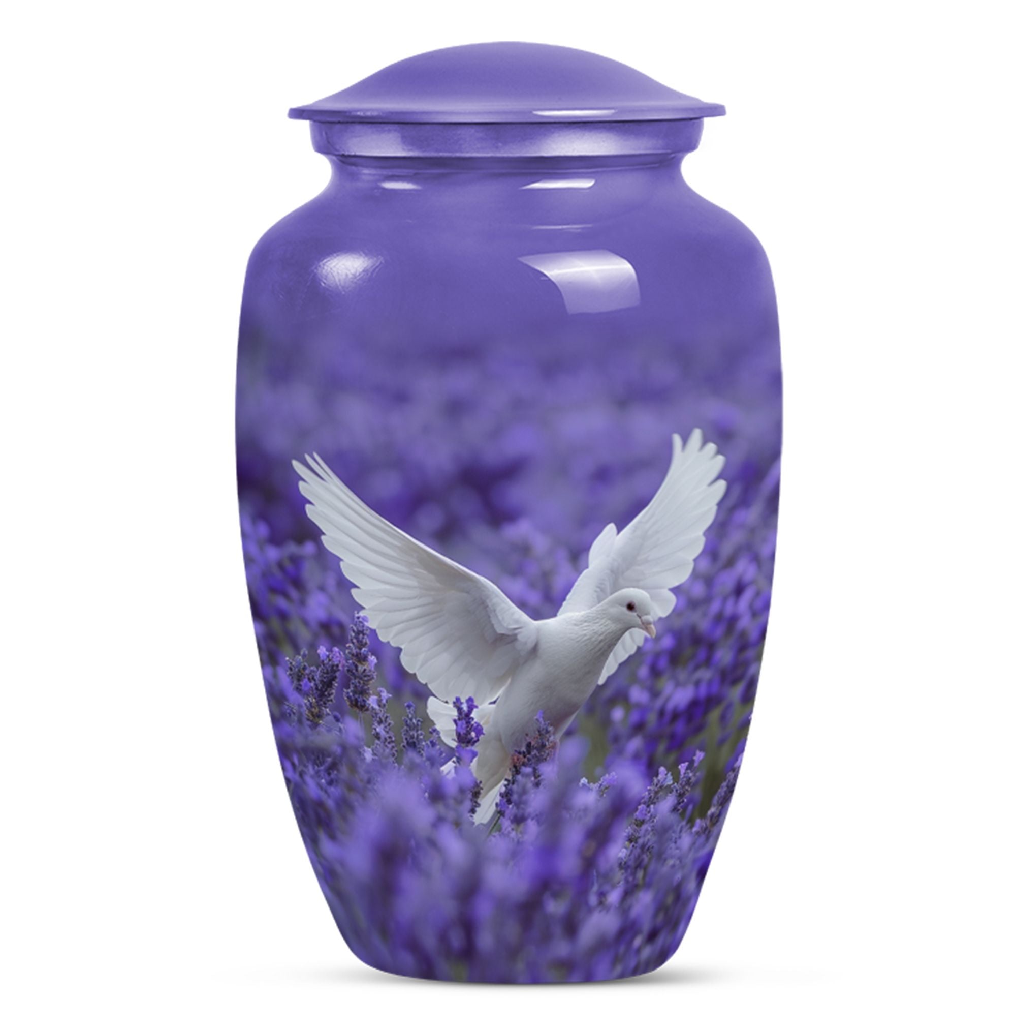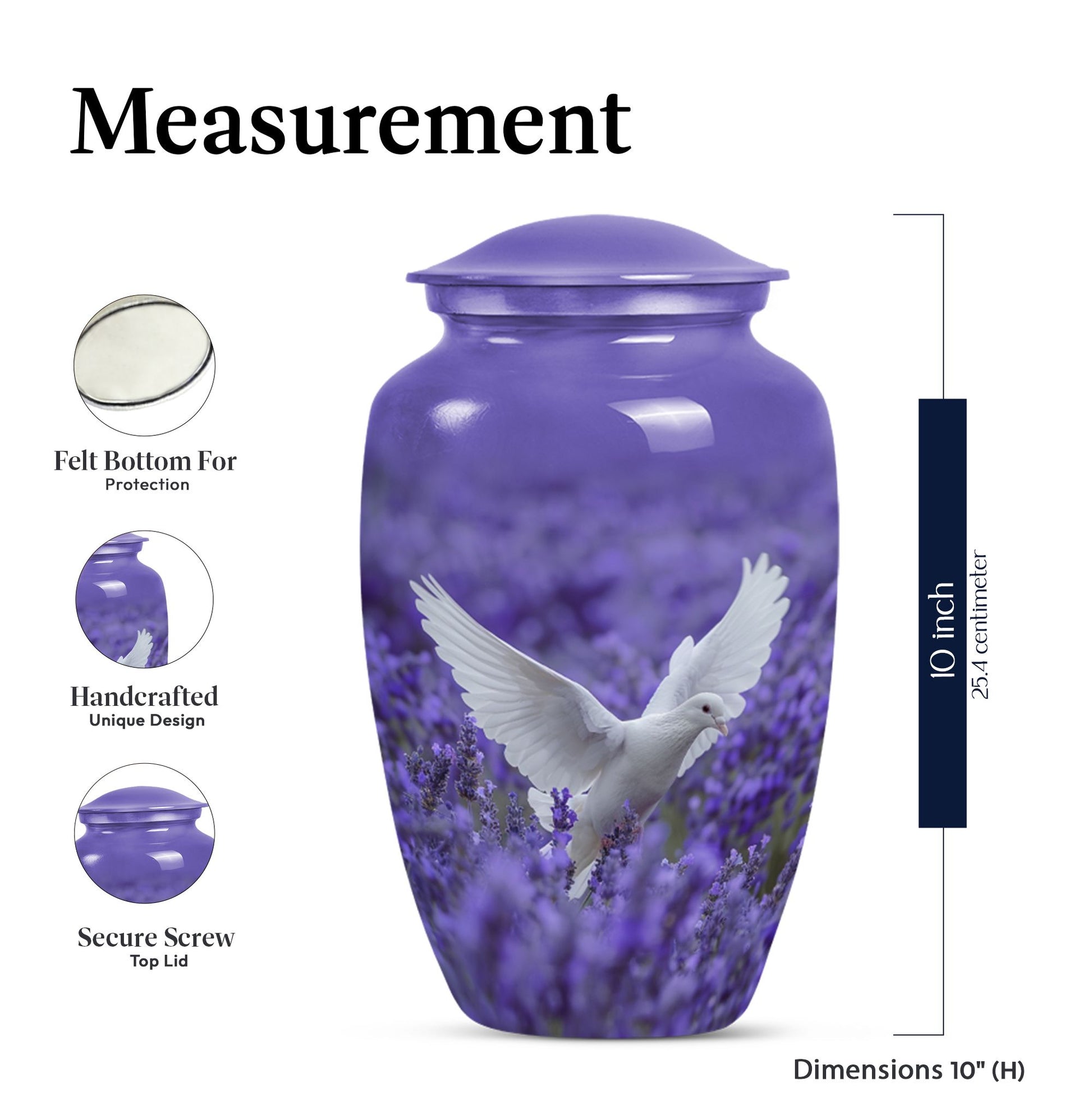 Express your undying love and respect for your departed loved one with the 10-inch white dove on purple Urn. Etched in a classic urn pattern, this burial piece is an elegant choice for adult females. This large urn is skillfully crafted from high-quality Aluminium, making it durable and long-lasting. Weighing just 3.3 pounds, it possesses a capacity of 200 cubic inches, substantial for containing the ashes of your beloved one. Our package also provides you with a velvet pouch, an exquisite means of enclosing the ashes. Irrevocably unique in design, it features an endearing Butterfly theme, giving an even more personalised touch to your memorial artifact. Personalize the urn with engraved names, creating a heartfelt liaison with your lost one. Our memorial urn is a poignant memorial gift, making it an apt choice as you search for 'cremation urn funeral urn adult ash'. Thus, it stands as one of the best options in the catalogue of 'memorial urns'.