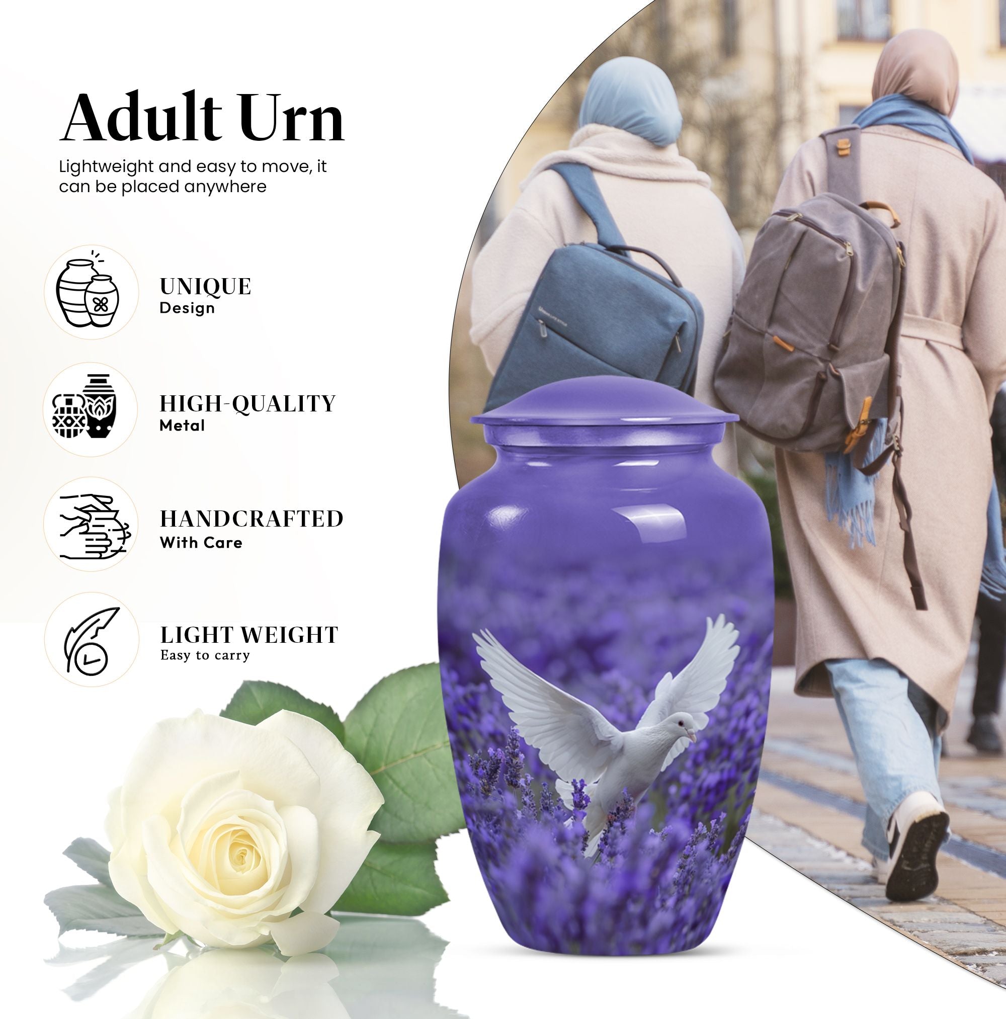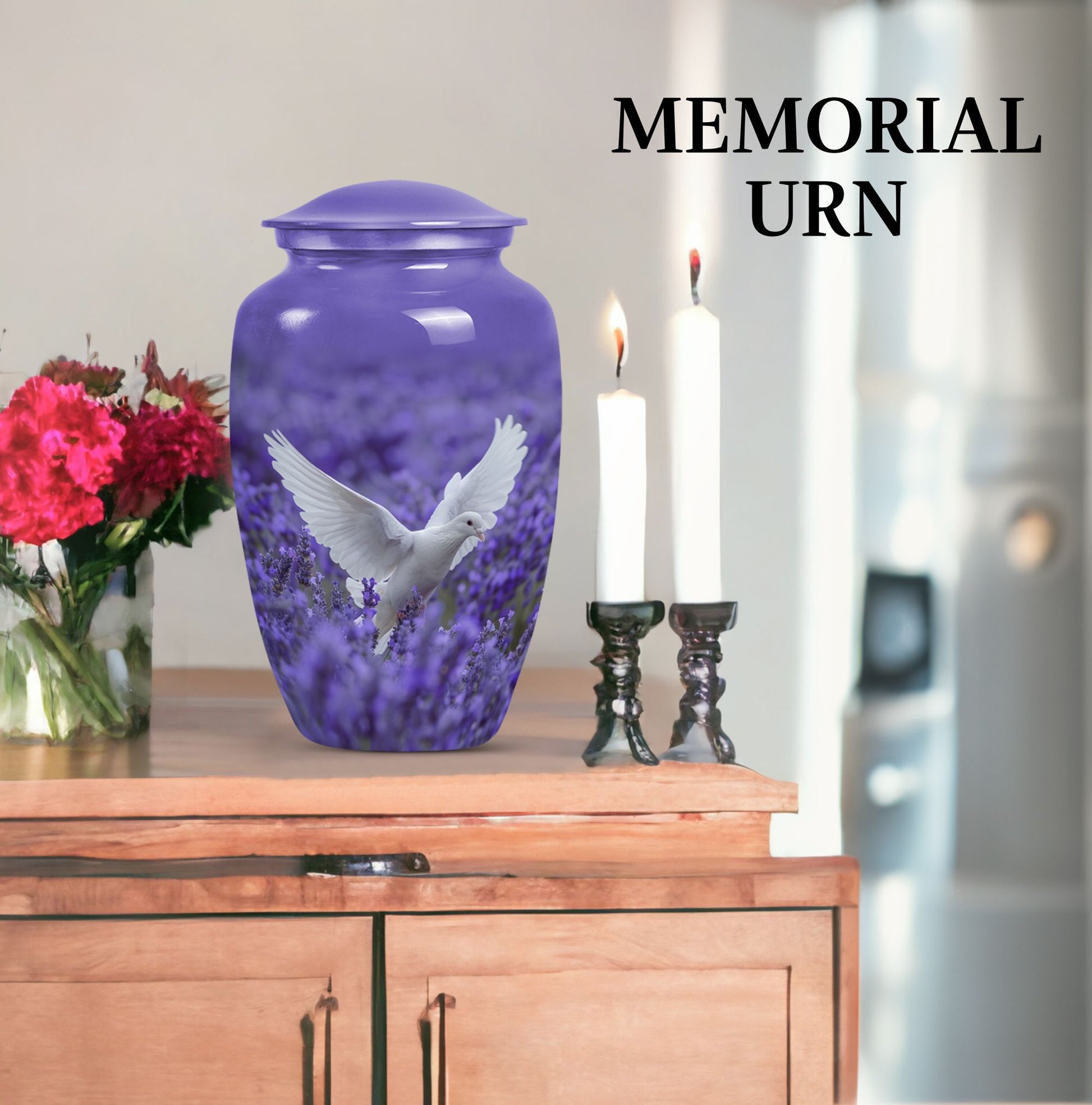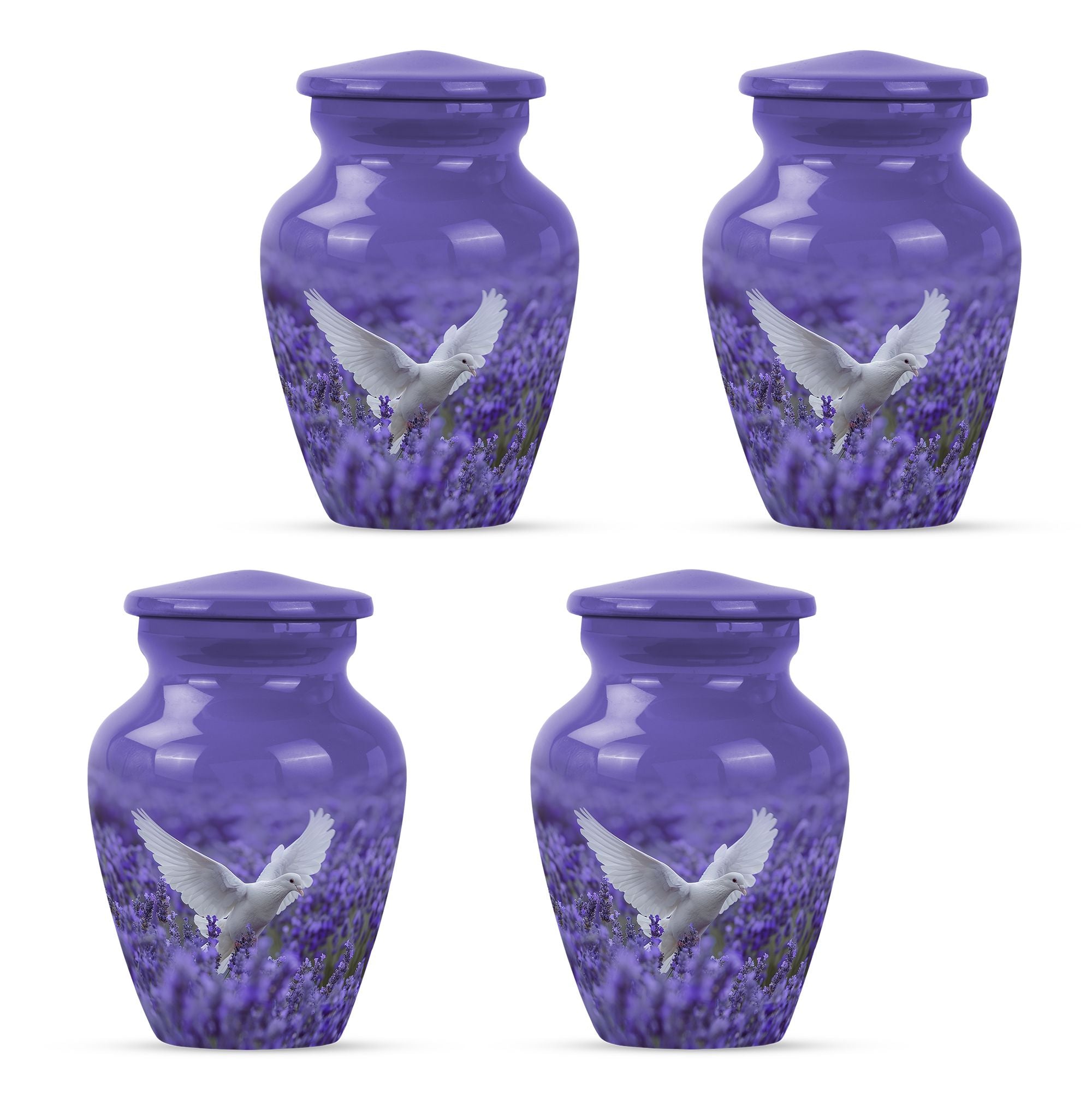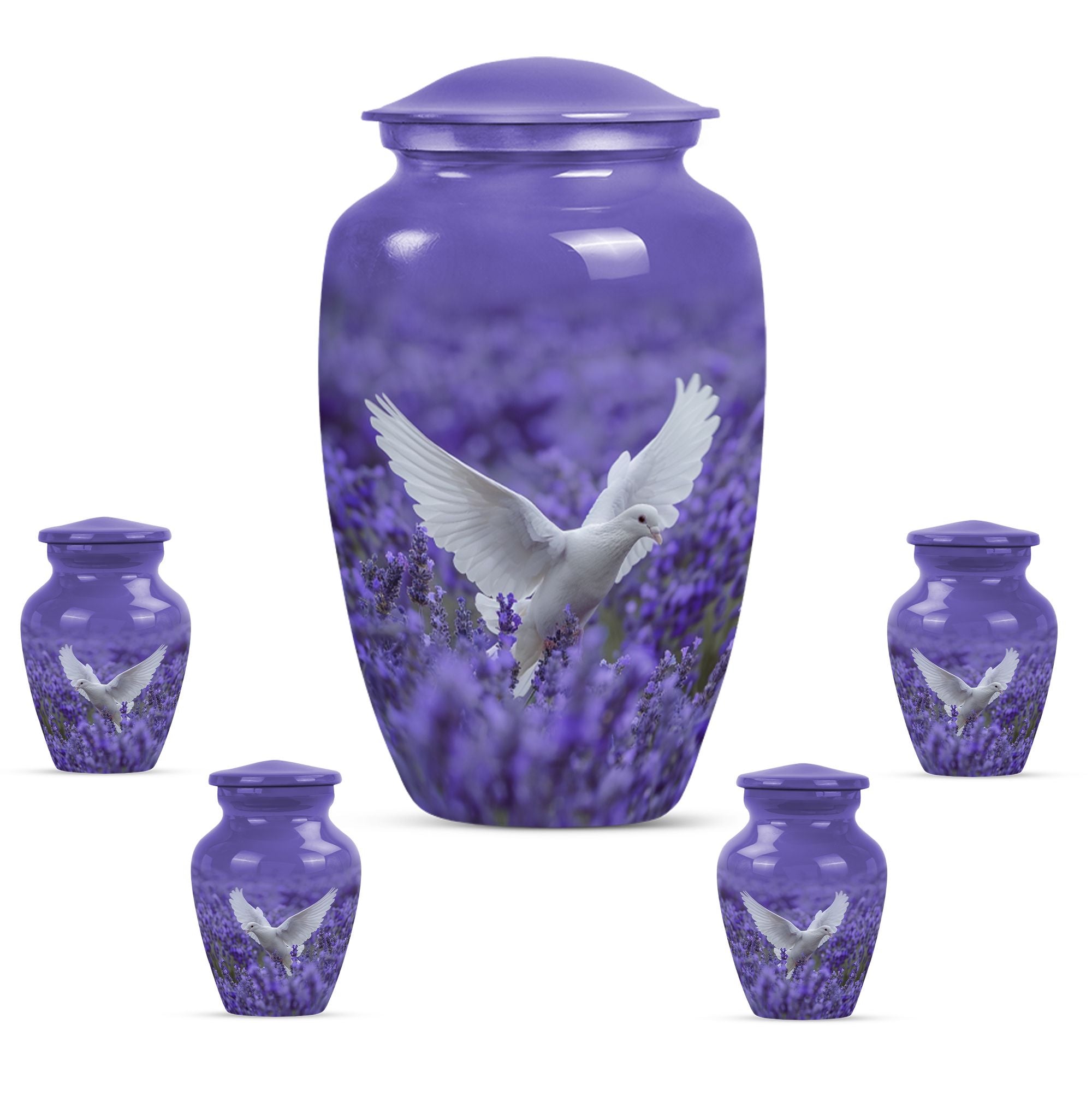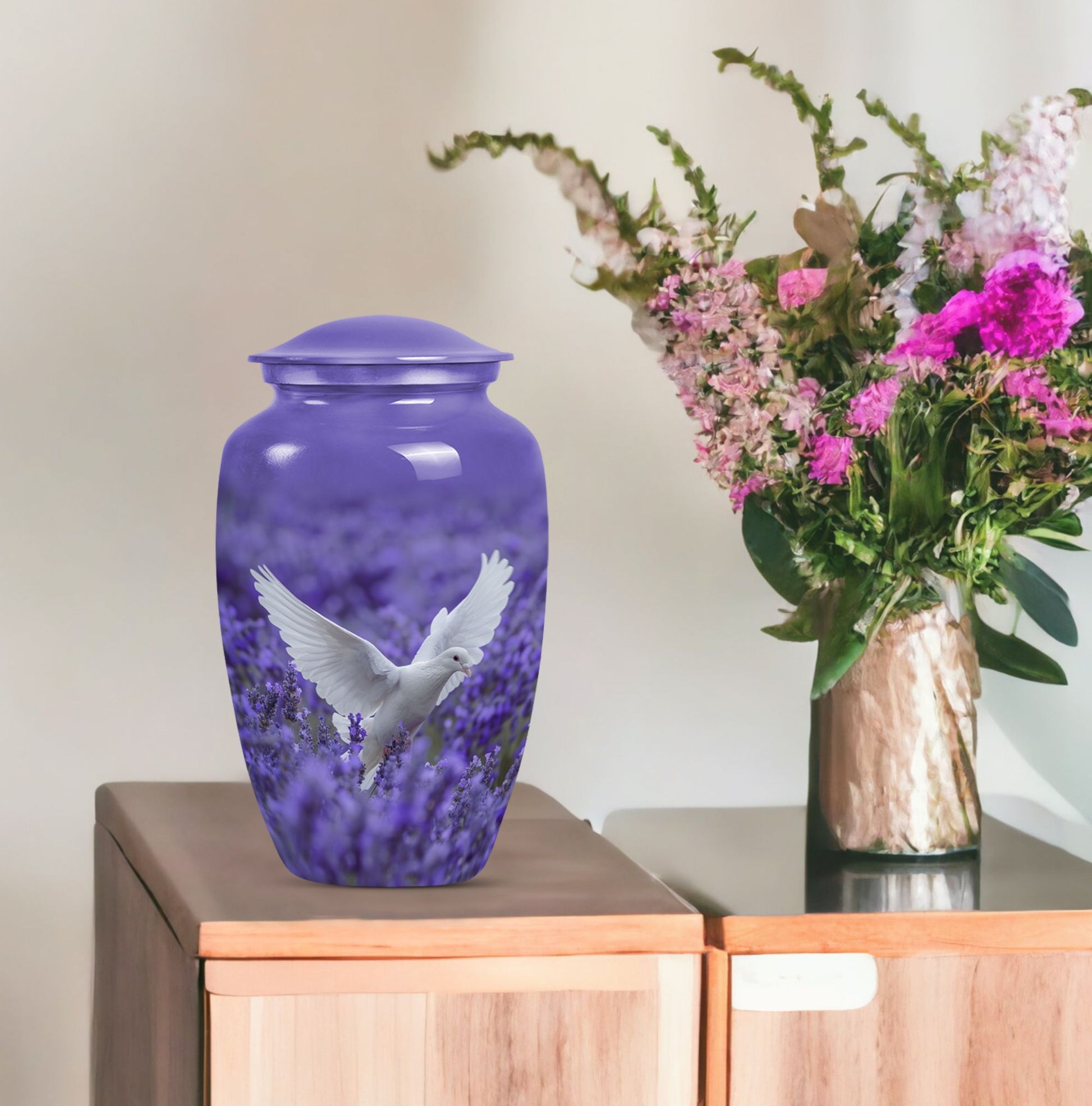 Express your undying love and respect for your departed loved one with the 10-inch white dove on purple Urn. Etched in a classic urn pattern, this burial piece is an elegant choice for adult females. This large urn is skillfully crafted from high-quality Aluminium, making it durable and long-lasting. Weighing just 3.3 pounds, it possesses a capacity of 200 cubic inches, substantial for containing the ashes of your beloved one. Our package also provides you with a velvet pouch, an exquisite means of enclosing the ashes. Irrevocably unique in design, it features an endearing Butterfly theme, giving an even more personalised touch to your memorial artifact. Personalize the urn with engraved names, creating a heartfelt liaison with your lost one. Our memorial urn is a poignant memorial gift, making it an apt choice as you search for 'cremation urn funeral urn adult ash'. Thus, it stands as one of the best options in the catalogue of 'memorial urns'.