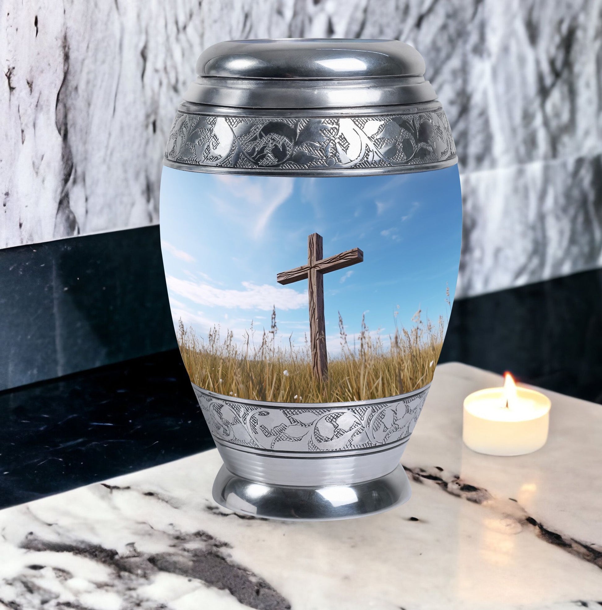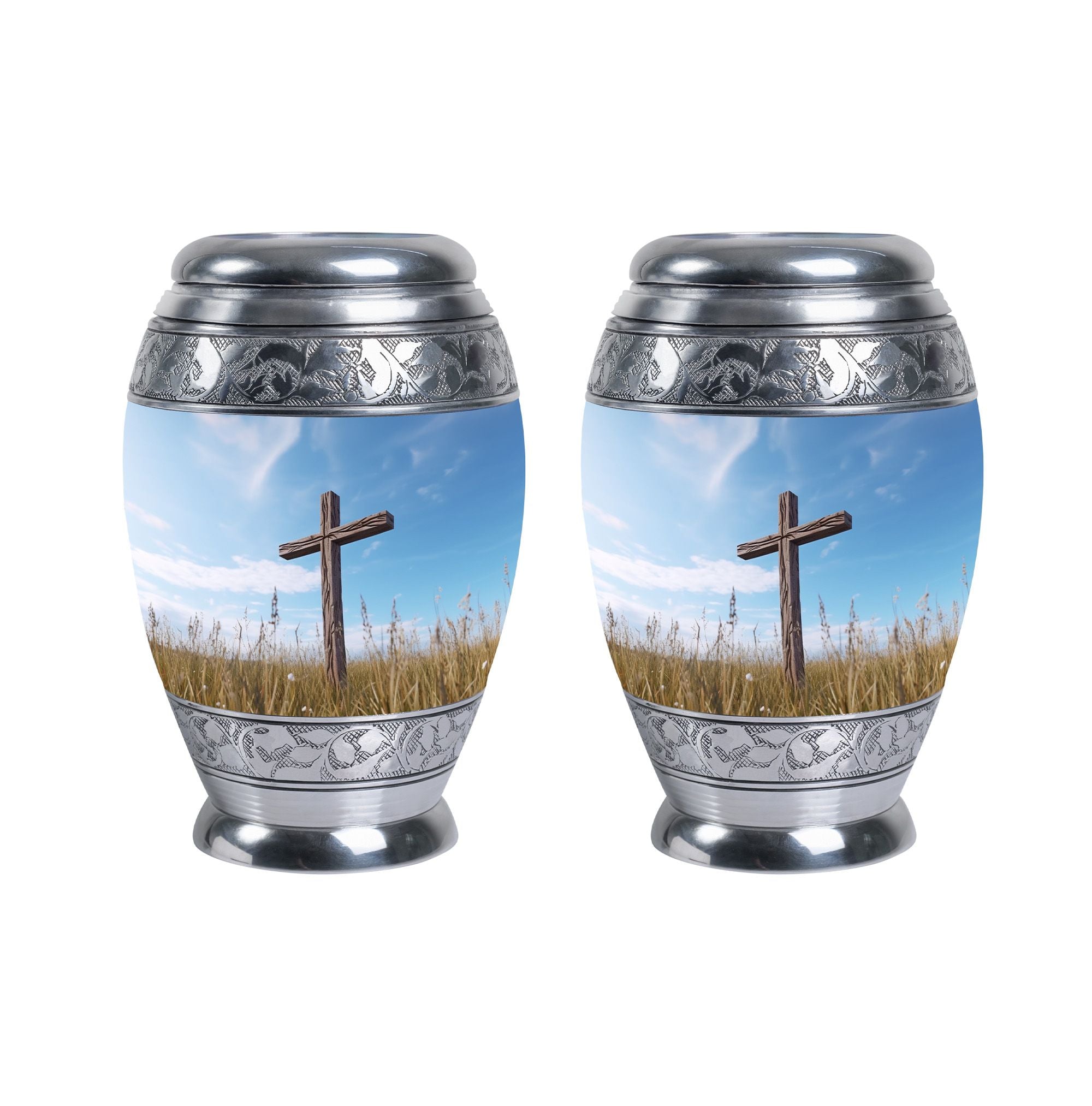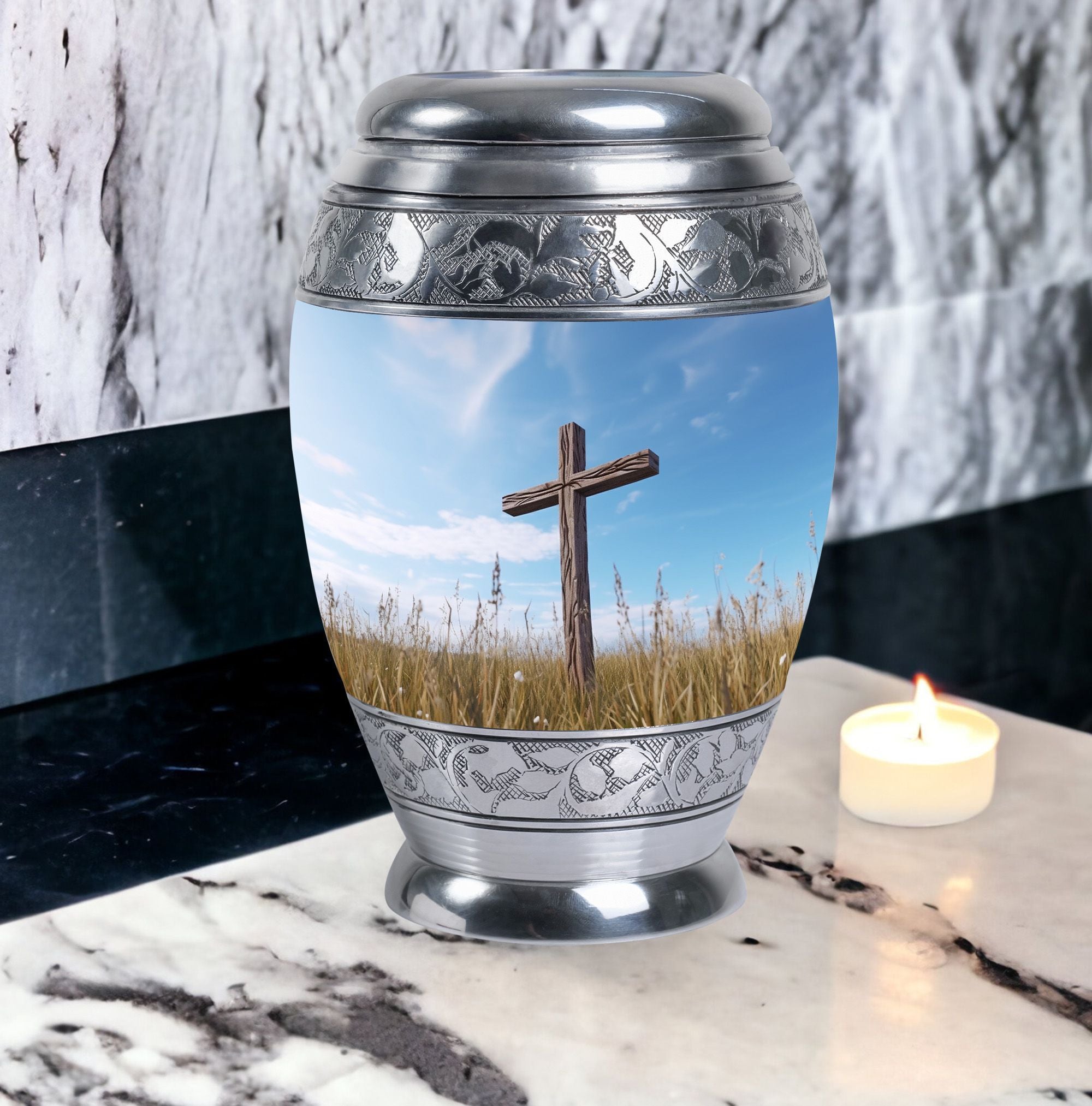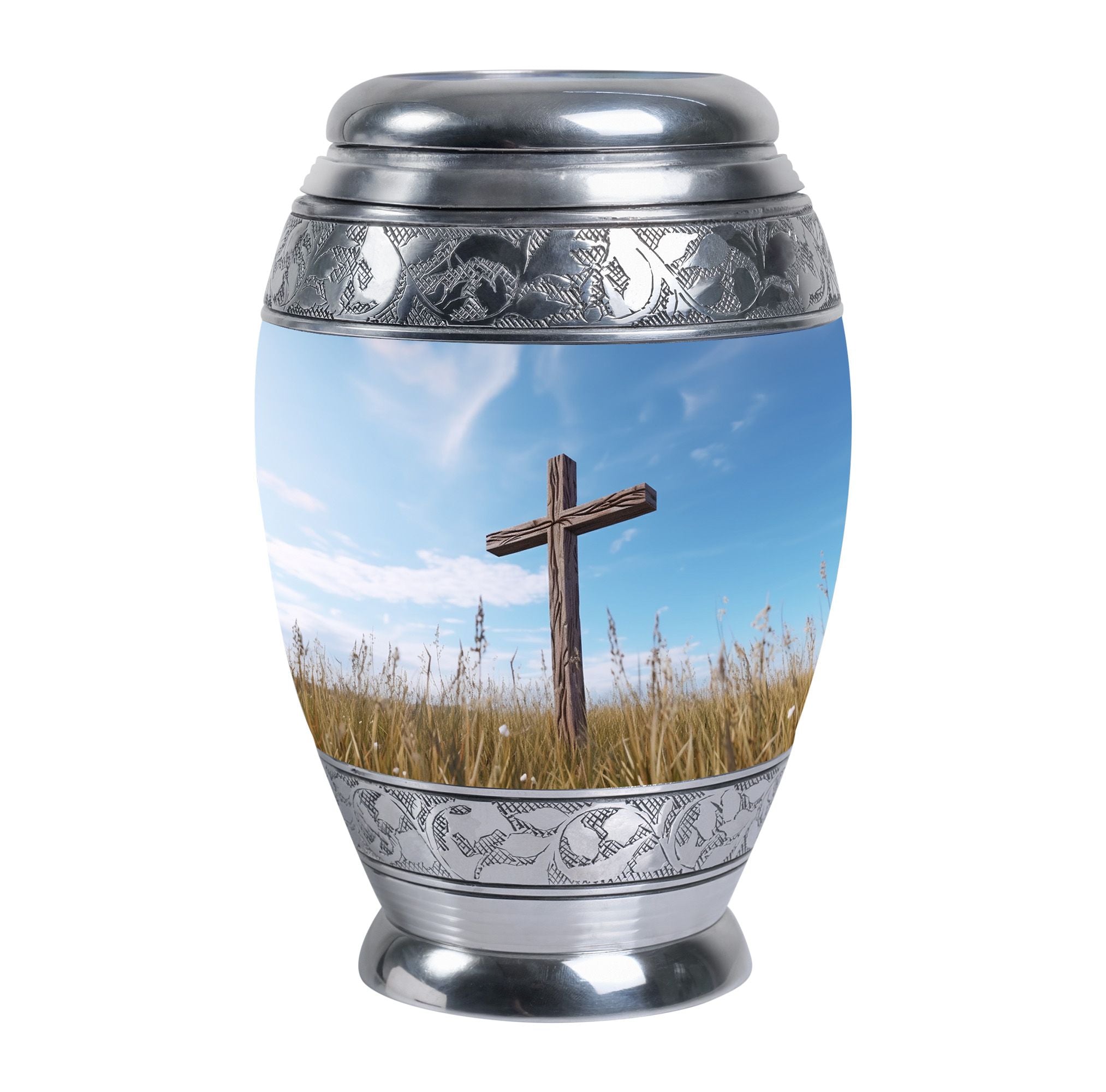 Crafted for respect and remembrance, our 3-inch 'Christ Urn in Blue Sky Cremation Urn' encapsulates the honoring of a precious life in an elegant way. The uniqueness of this size (a compact and easily manageable 3 inches) makes it a discreet yet meaningful tribute to your dear departed. Made from robust aluminium, this large urn features classic undertones, encapsulating a timeless mourning ceremony tradition. The urn is easy to handle, with a mere weight of 3.3 pounds and standing tall at 10 inches in height. It offers a commodious capacity of 200 cubic inches, proving roomy for collected ashes. Your purchase comes with a velvet pouch, ensuring dignified protection and containment of the ashes. Add an extra touch of sentiment by availing our customization feature, where you can personalize your urn with engraved names.