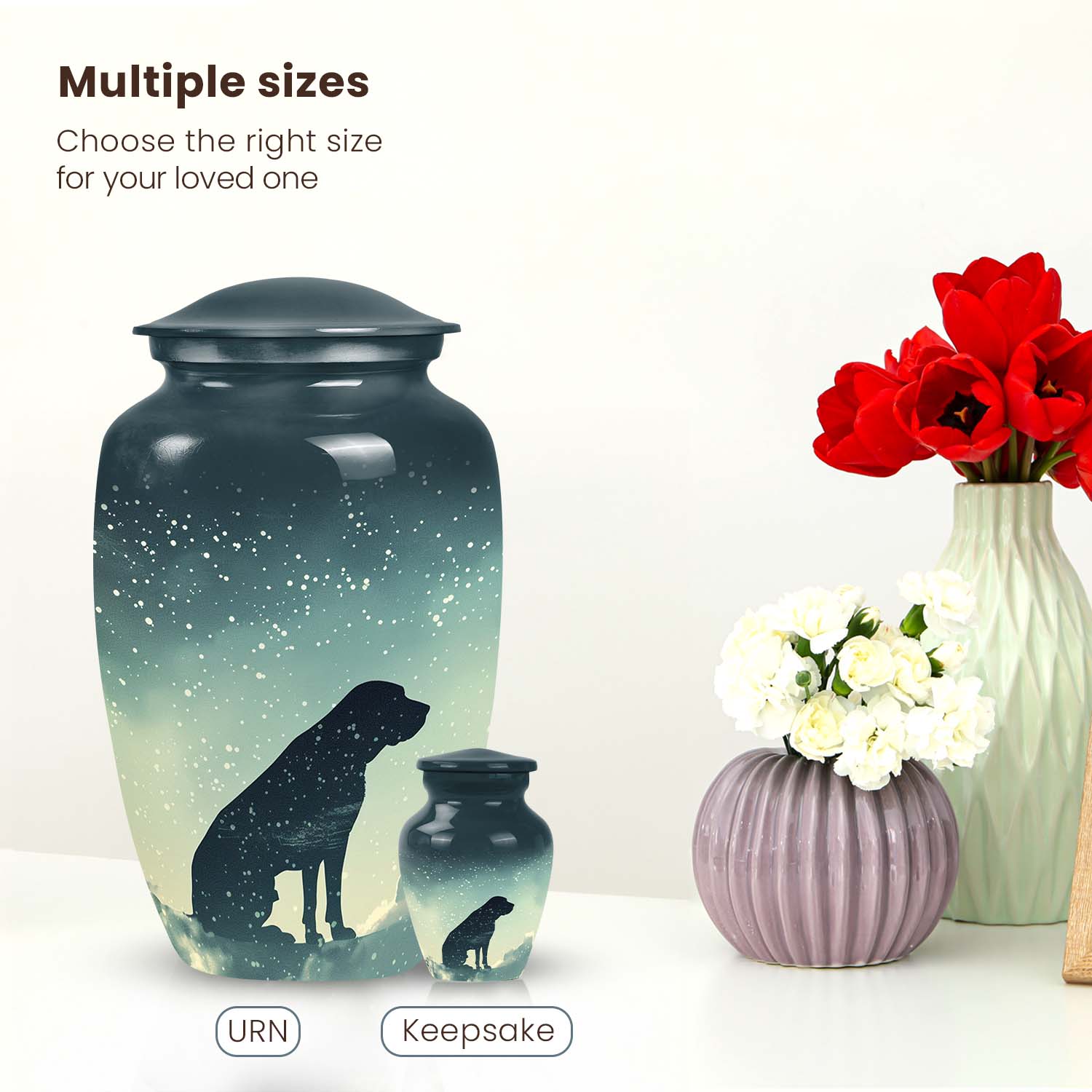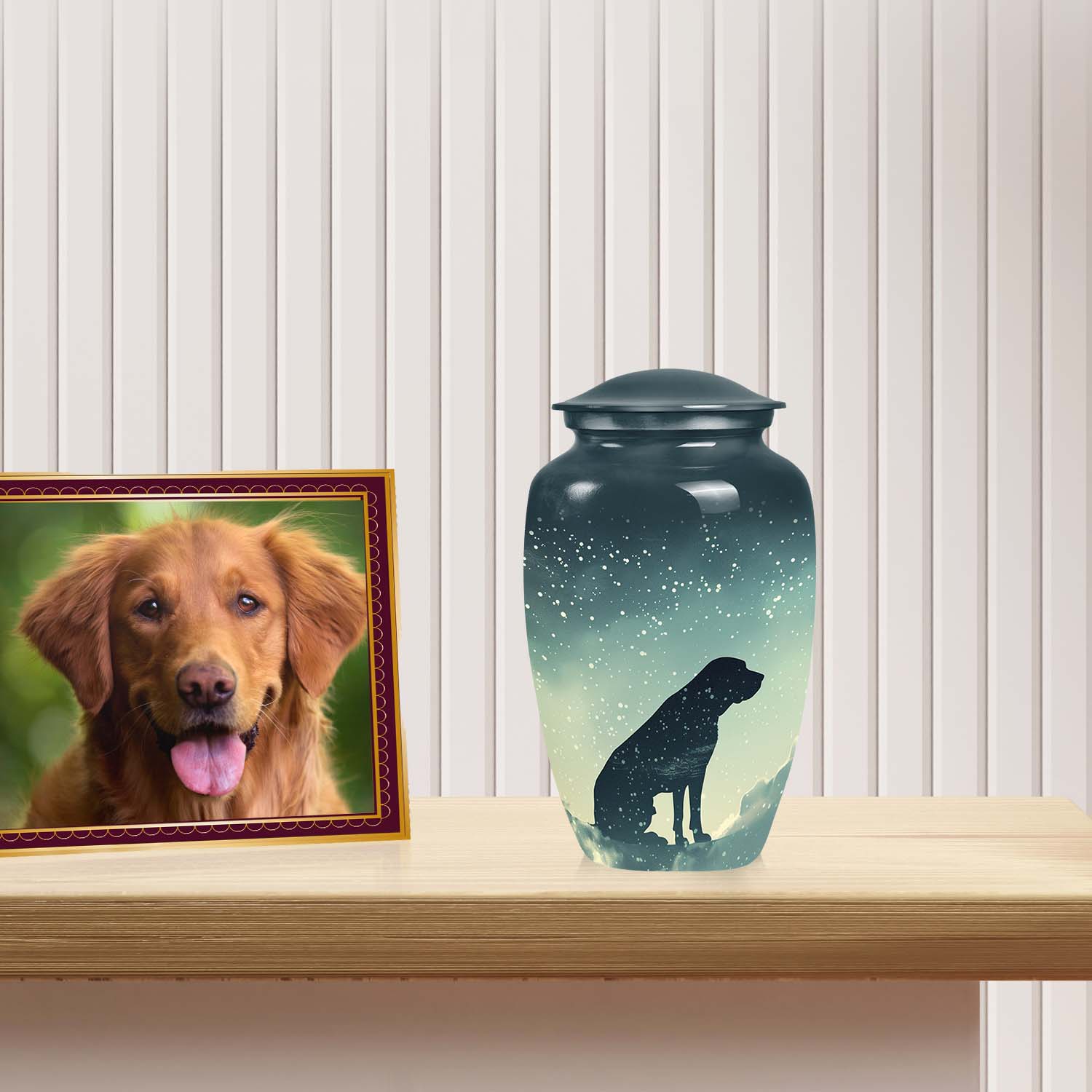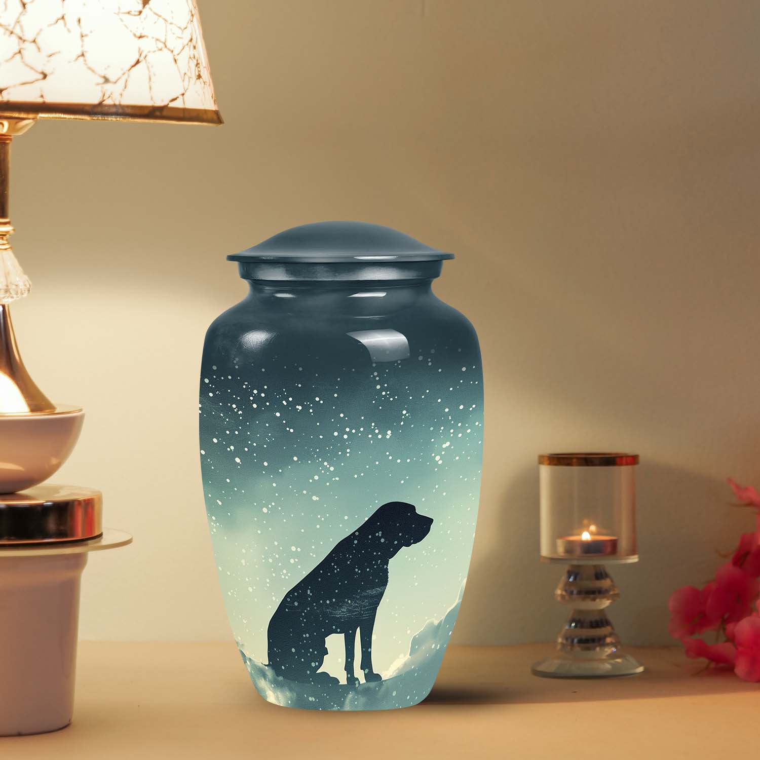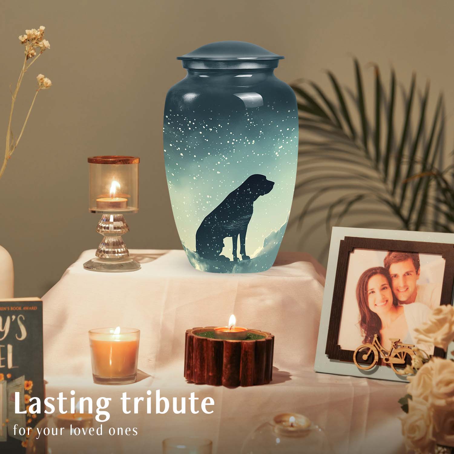 Expertly handcrafted from durable materials, this urn features a deep blue finish accented with a delicate dog silhouette under a constellation of stars — representing love that never fades. With its secure lid and refined shape, it’s a meaningful choice among personalized pet urns, ideal for display as a pet keepsake box or as part of a memorial space. Whether chosen as a small pet urn or larger tribute, it provides comfort and serenity to any home.