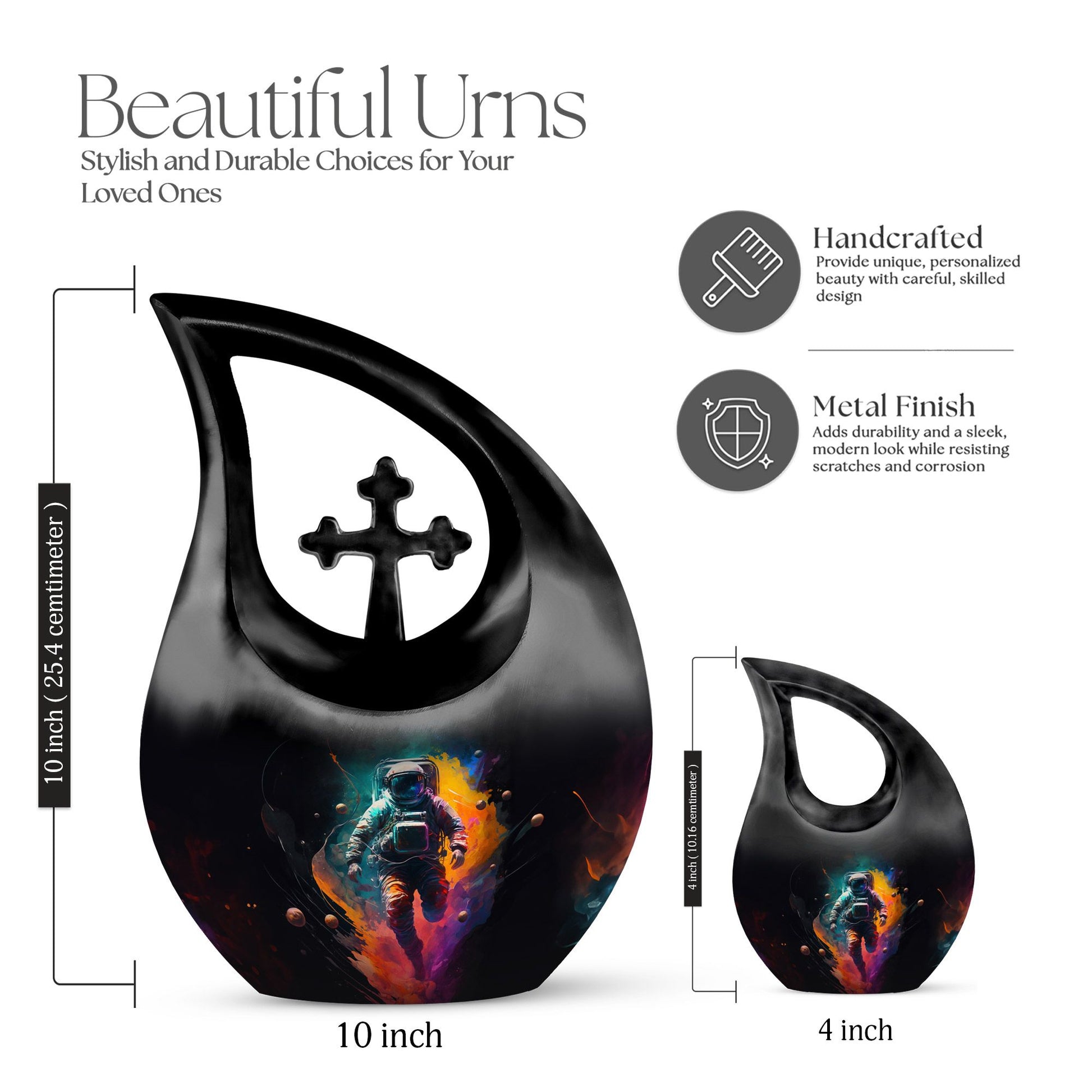 Each urn is meticulously handcrafted from high-quality aluminum, ensuring strength, longevity, and elegance. The deep black enamel surface is accented with radiant neon hues and a cosmic astronaut motif — symbolizing exploration, courage, and everlasting love. The secure screw-top lid keeps ashes protected, while the urn’s refined teardrop shape makes it ideal for home display or memorial ceremonies. Families seeking adult urns for men & women or urn for women ashes will find this design a perfect blend of beauty and significance.