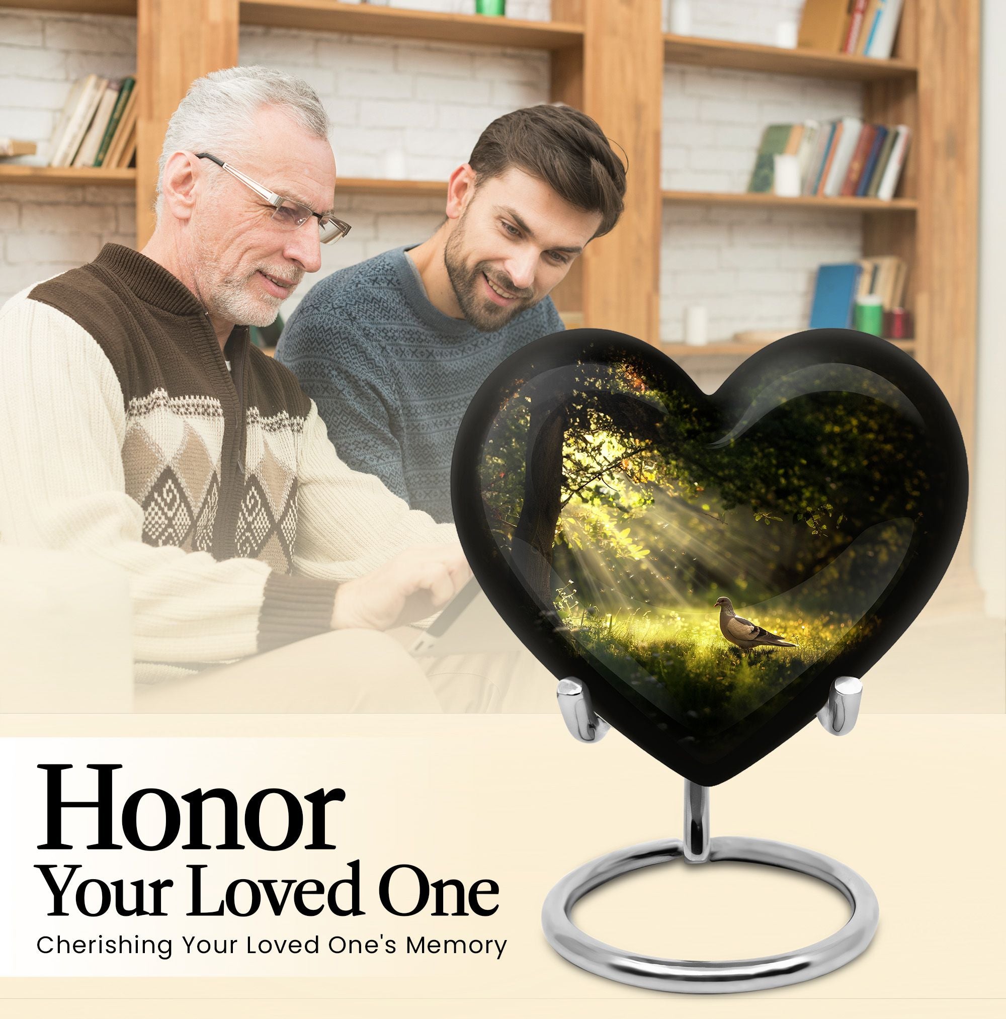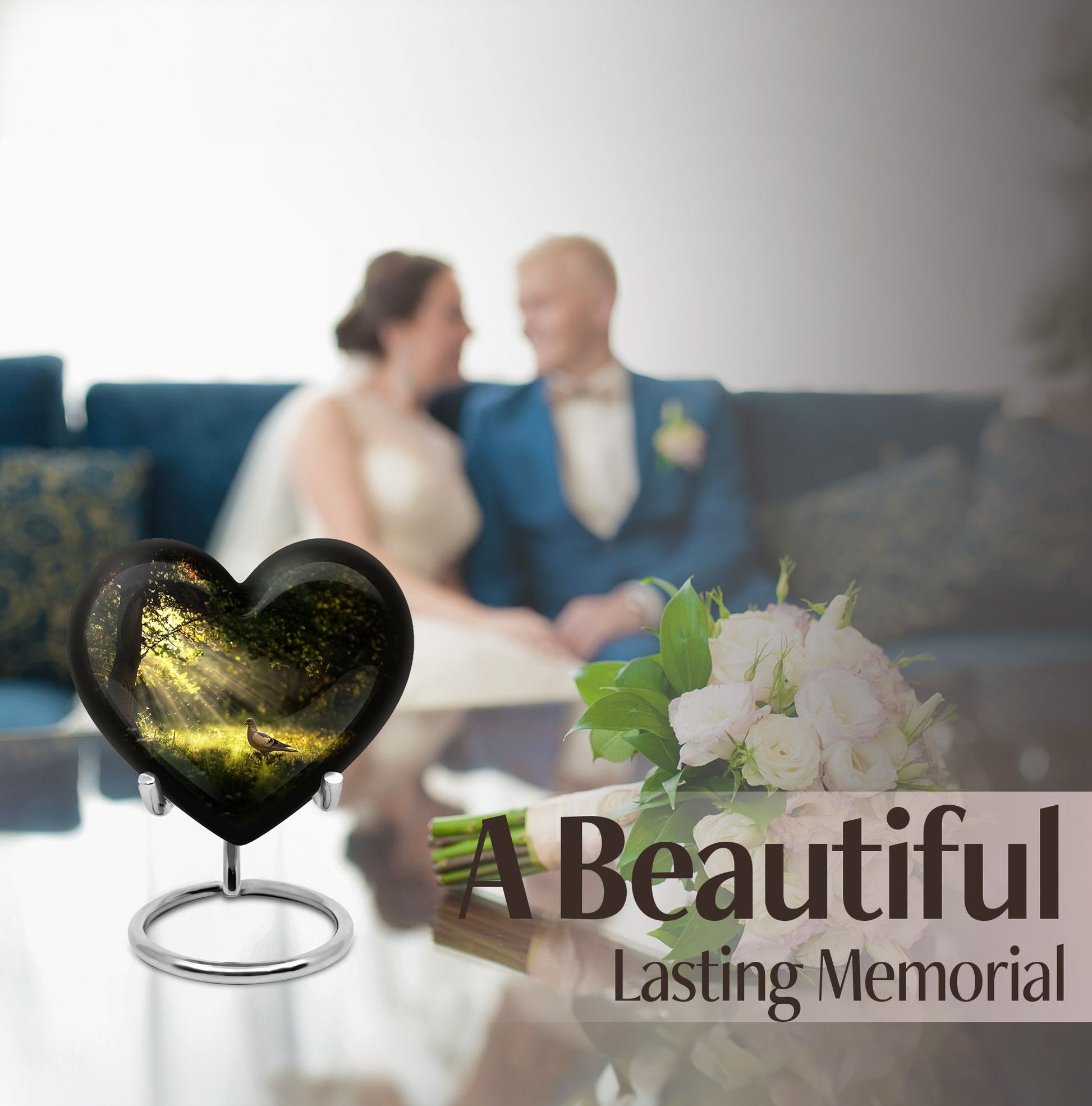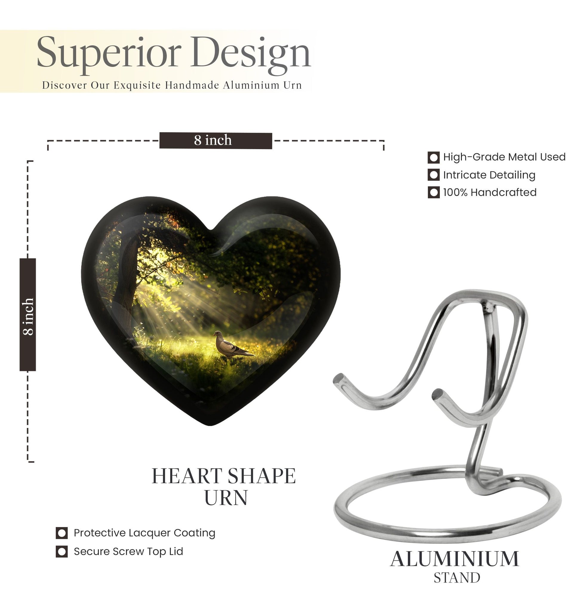 Celebrate the life of your beloved one with this beautifully crafted Dove Urn, an exceptional tribute to their loving memory. With a size of 10 inches, shaped like a heart, this eye-catching aluminum cremation urn is large enough to hold 200 cubic inches of human ashes. Weighing 3.3 pounds, its substantial yet elegant presence is comforting, underlined by the high-quality finish that reflects light compassionately. The Dove Urn comes with a velvet pouch, ensuring the containment of ashes with respect and dignity. Its customization feature allows you to personalize it with engraved names, making it a unique keepsake. This urn seamlessly blends into your ceremonial setup, ideal for both men and women. Primarily associated with keywords like 'Dove Urn', 'cremation cremation urn human ashes,' this item also relates to 'funeral urns for women, funeral urns ashes, metal, cremation urns for men'. May this sublime piece offer solace in commemorating the journey of your loved one.