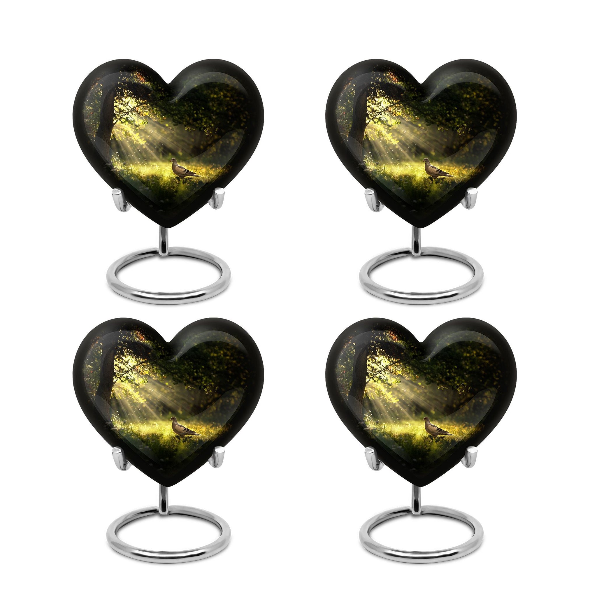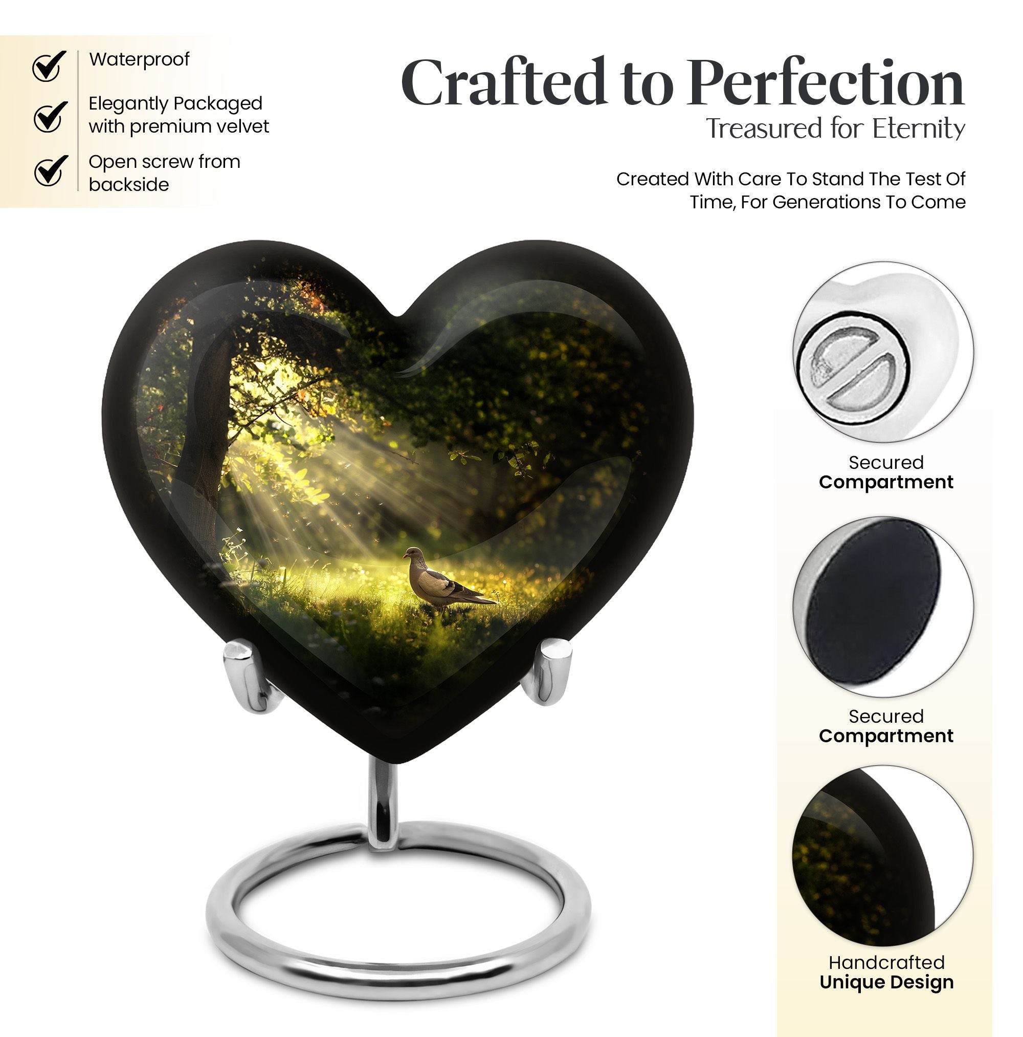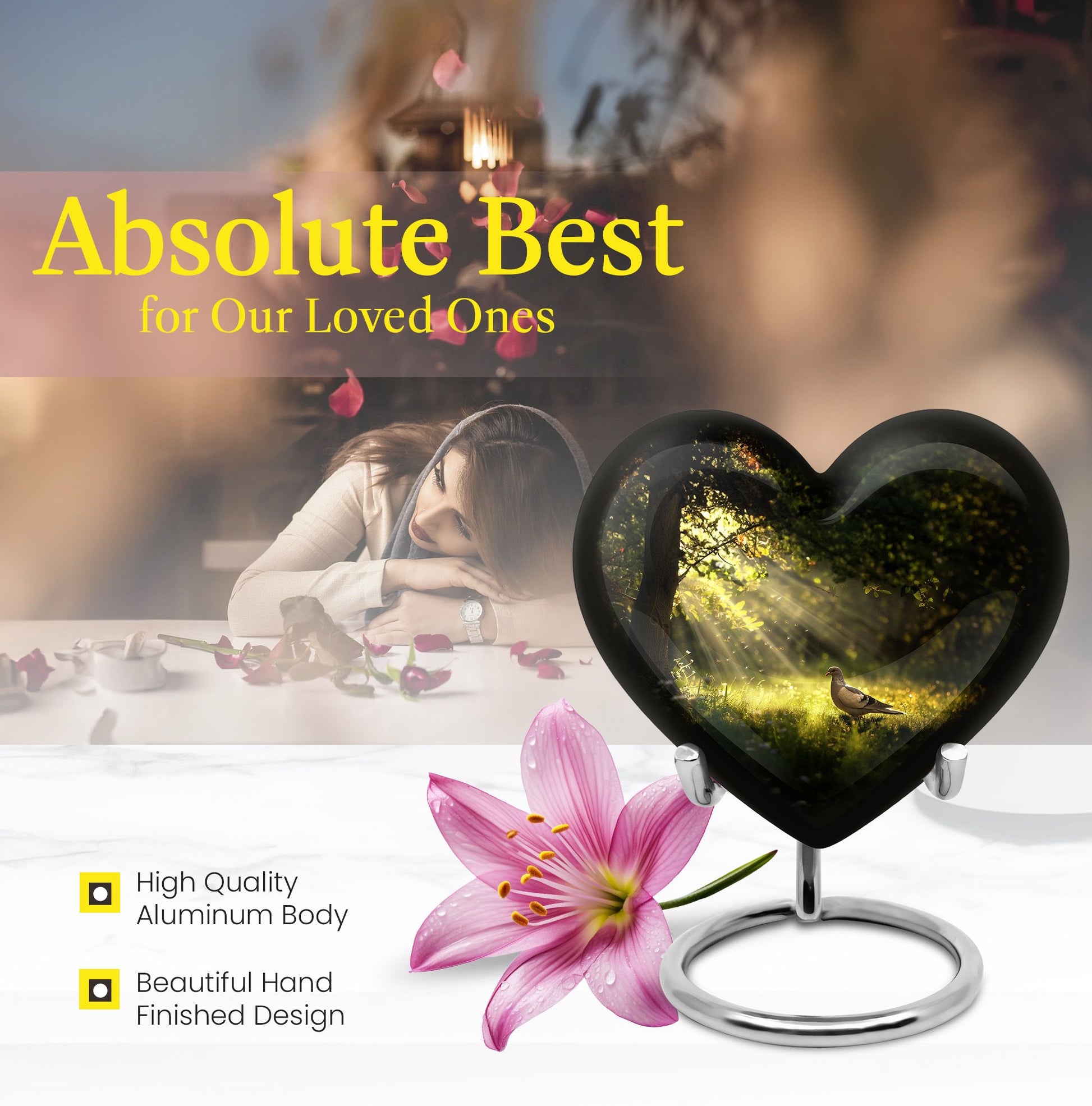 Celebrate the life of your beloved one with this beautifully crafted Dove Urn, an exceptional tribute to their loving memory. With a size of 10 inches, shaped like a heart, this eye-catching aluminum cremation urn is large enough to hold 200 cubic inches of human ashes. Weighing 3.3 pounds, its substantial yet elegant presence is comforting, underlined by the high-quality finish that reflects light compassionately. The Dove Urn comes with a velvet pouch, ensuring the containment of ashes with respect and dignity. Its customization feature allows you to personalize it with engraved names, making it a unique keepsake. This urn seamlessly blends into your ceremonial setup, ideal for both men and women. Primarily associated with keywords like 'Dove Urn', 'cremation cremation urn human ashes,' this item also relates to 'funeral urns for women, funeral urns ashes, metal, cremation urns for men'. May this sublime piece offer solace in commemorating the journey of your loved one.