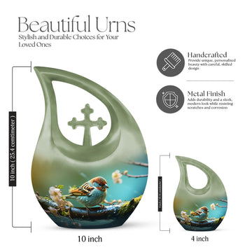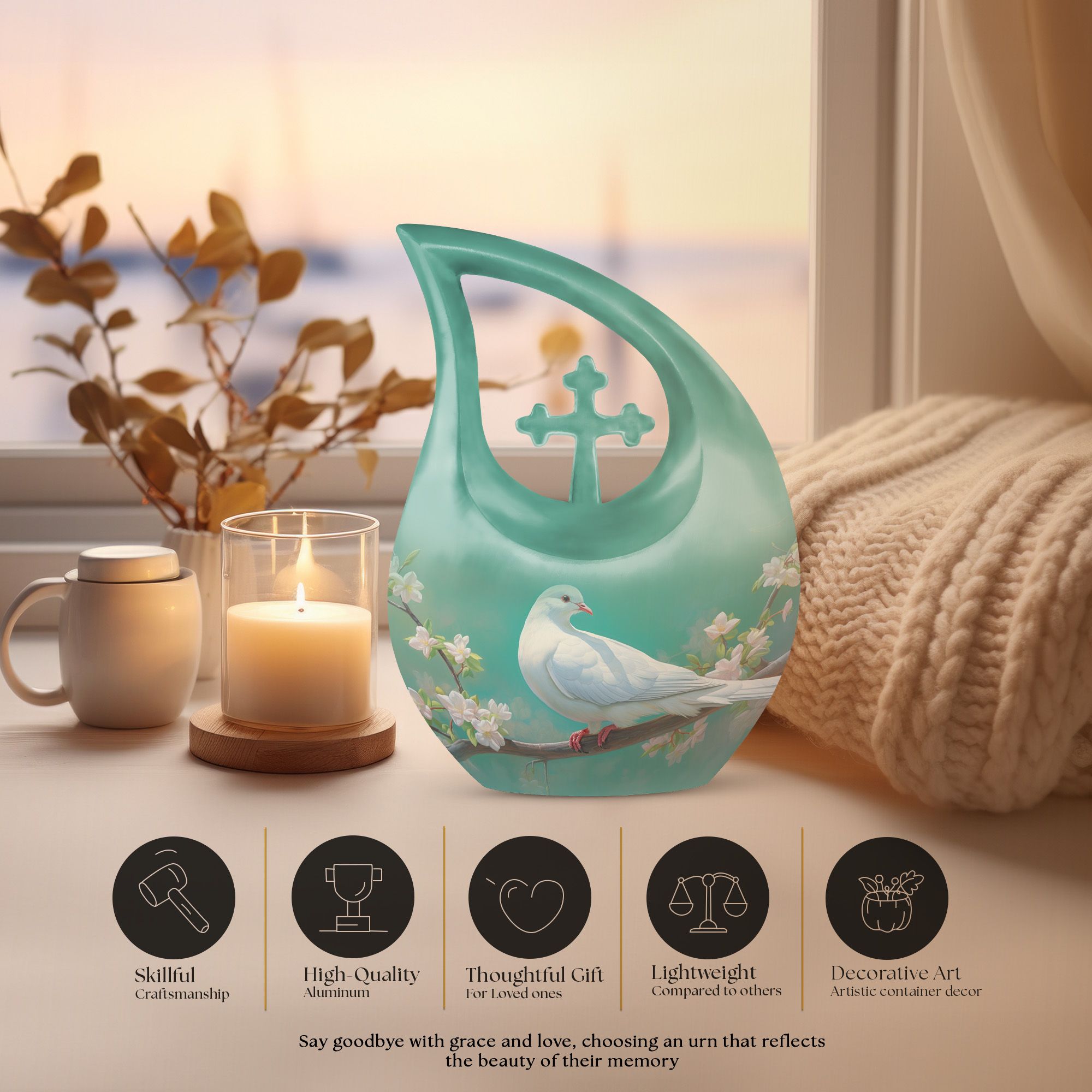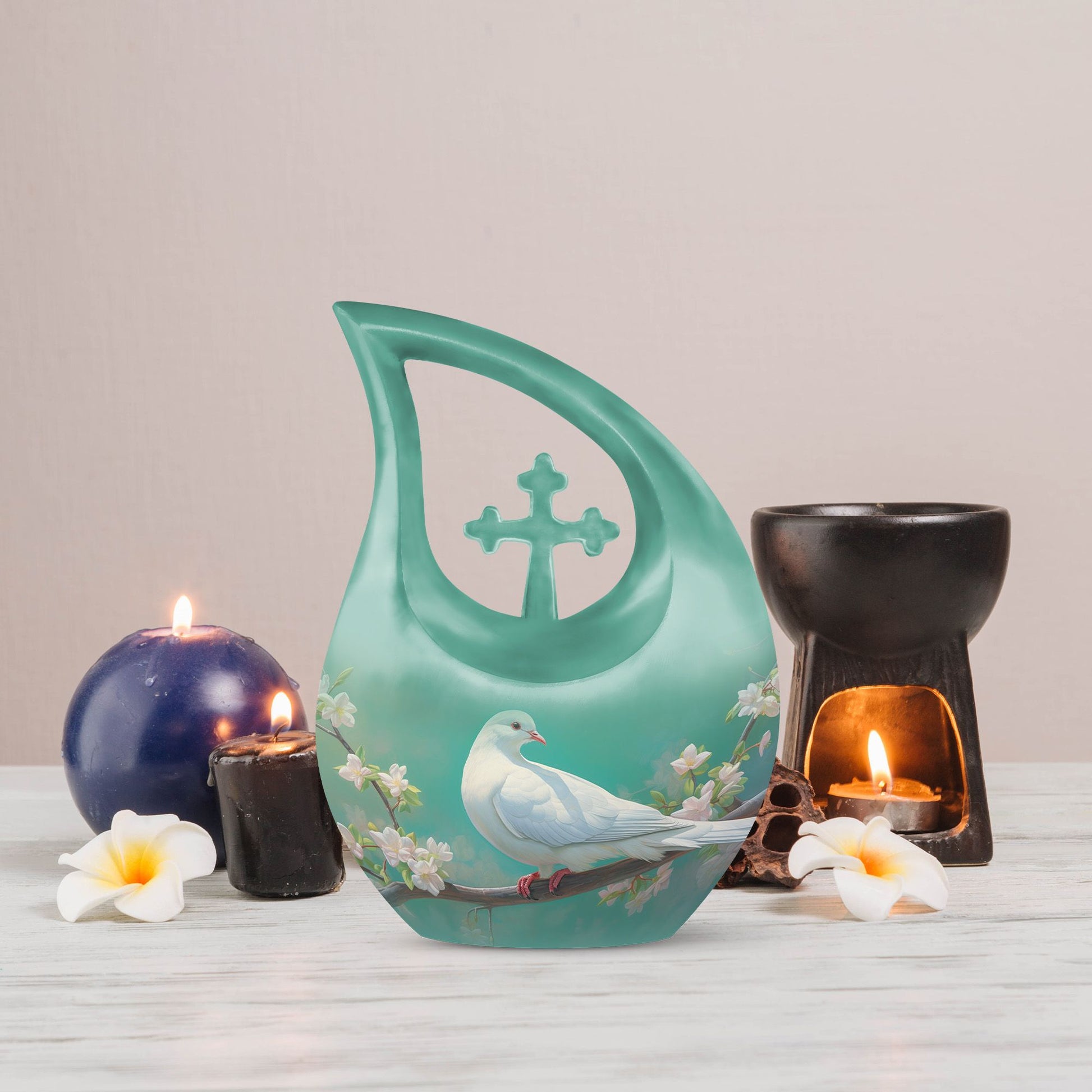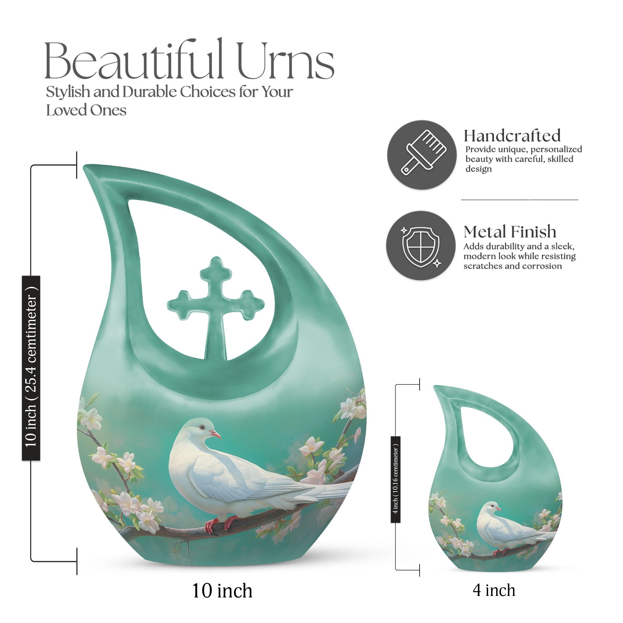 Expertly handcrafted from premium aluminum, this urn features a smooth white finish adorned with a graceful dove in flight. The secure screw-top lid ensures ashes remain protected, making it suitable as a burial urn men or funeral urns women. Its minimalist elegance complements both traditional and contemporary memorial settings, creating a peaceful focal point in any space.