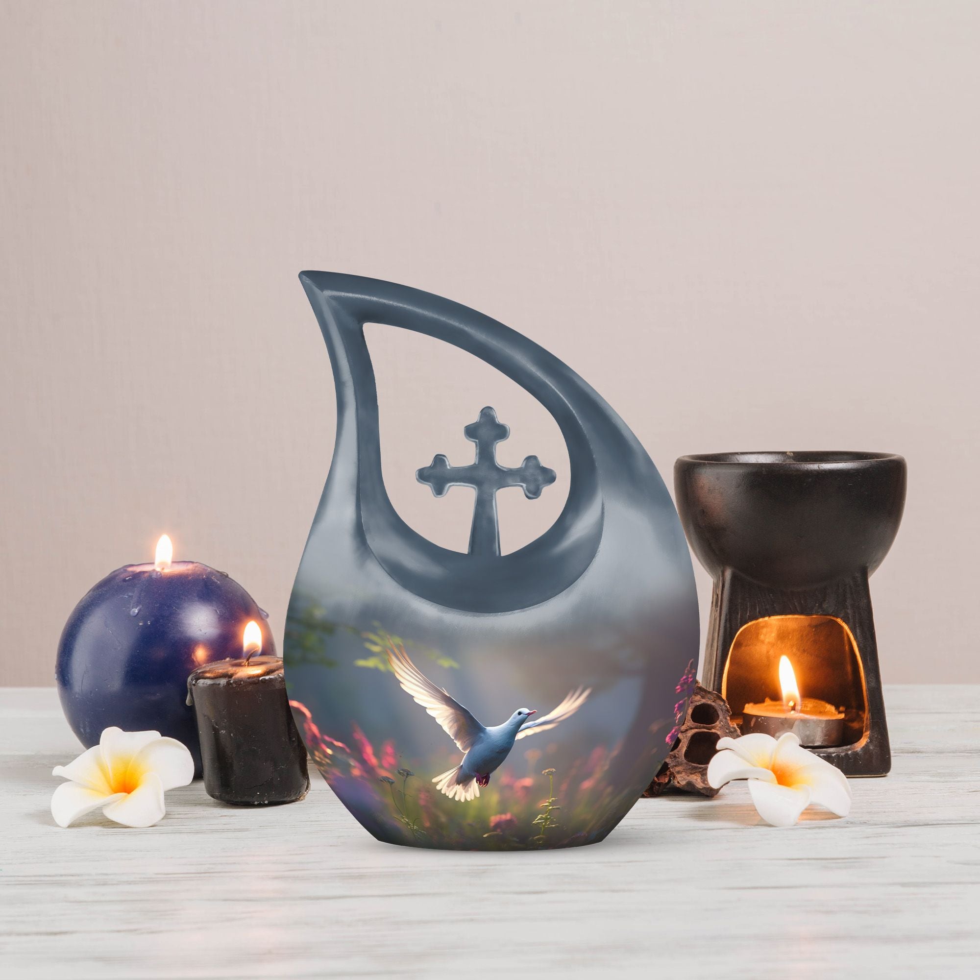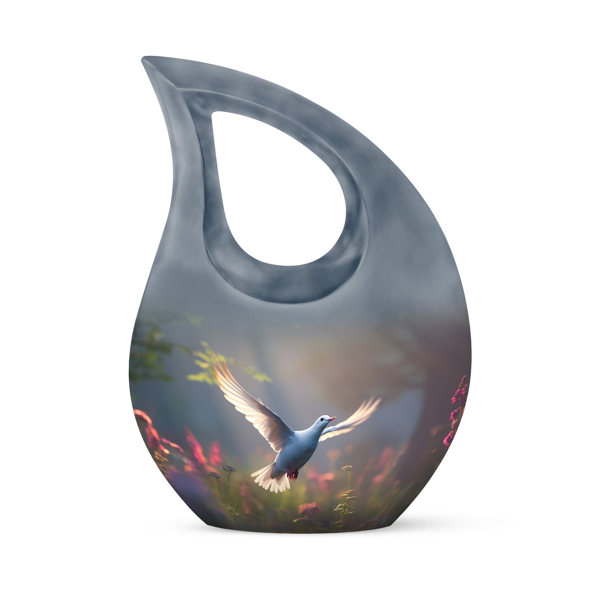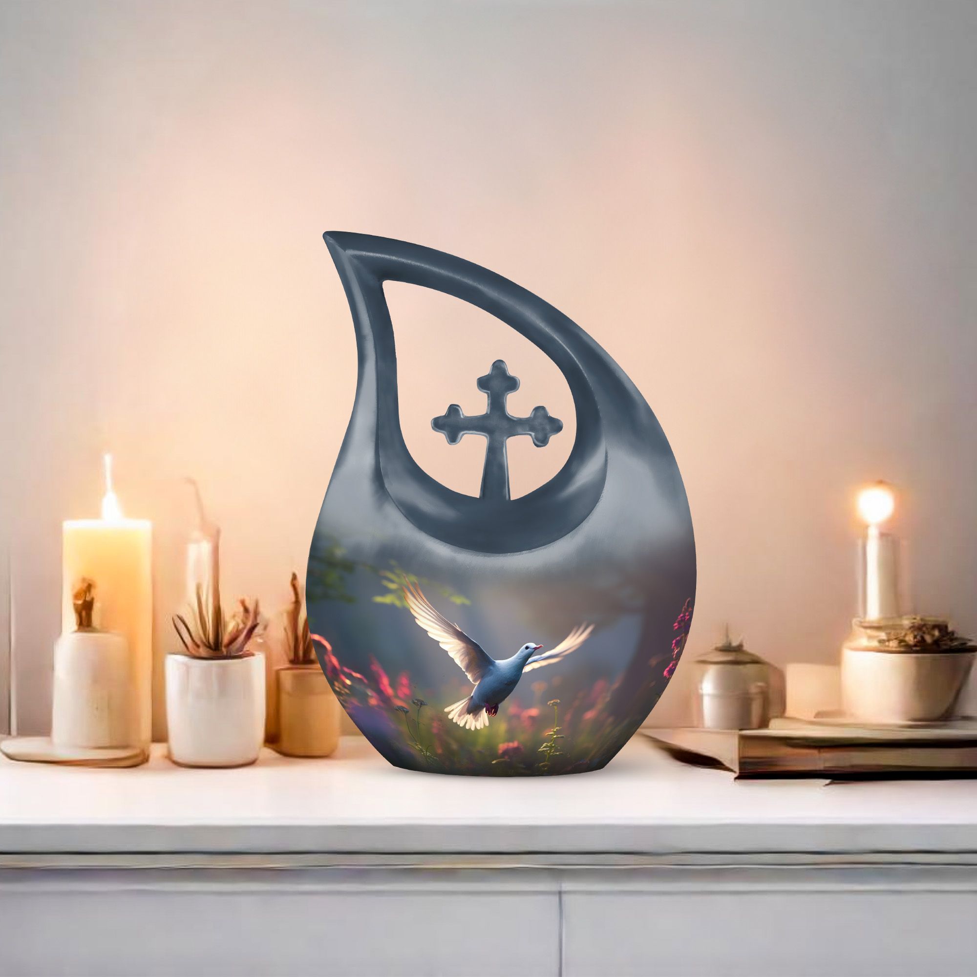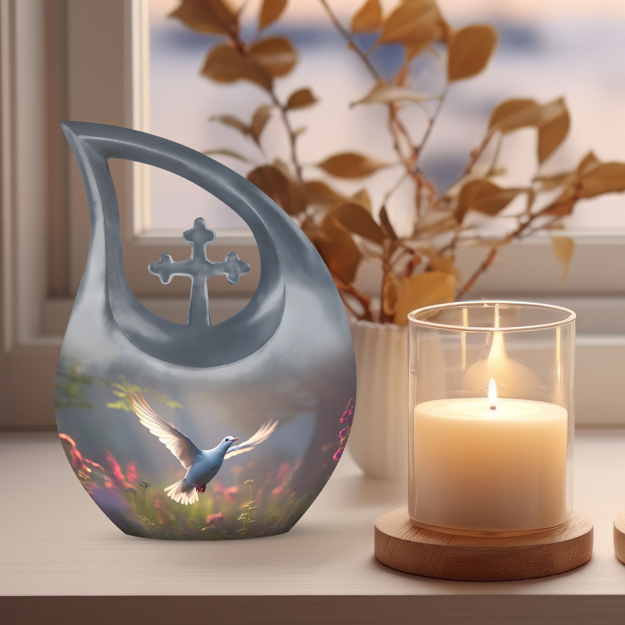 The dove embodies everlasting peace, symbolizing that love transcends life itself. This large urn for human ashes stands not only as a vessel of remembrance but as a comforting emblem of light, unity, and eternal serenity.
