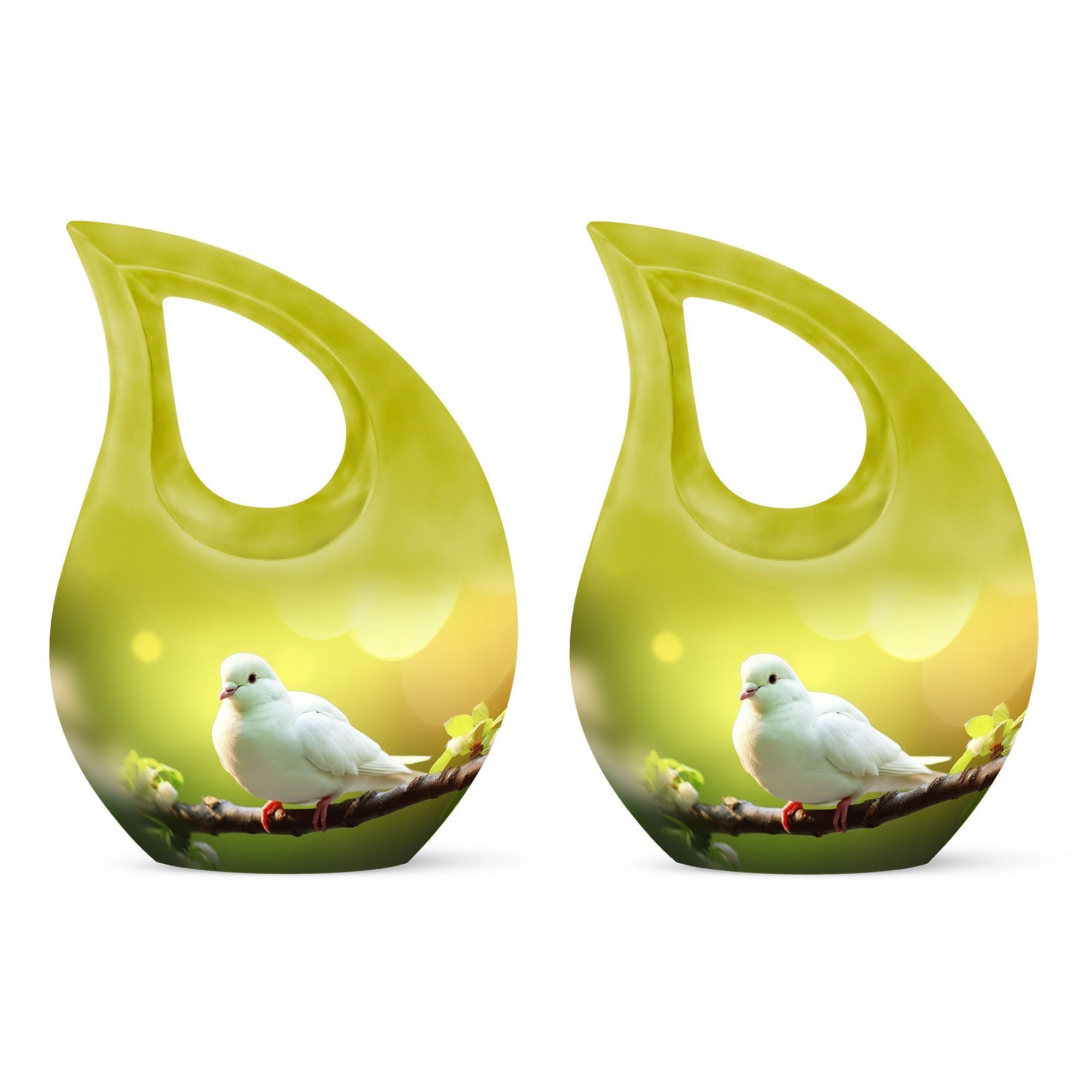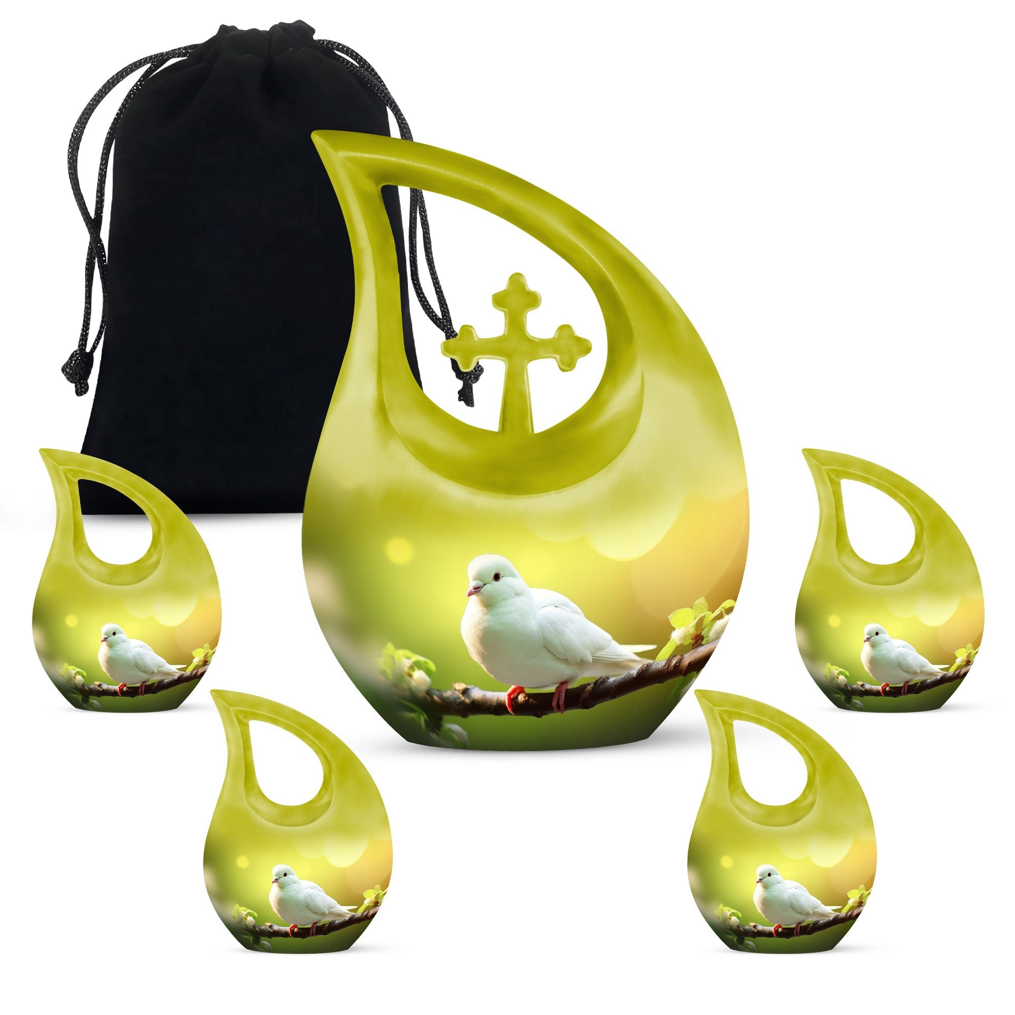 Expertly handcrafted from durable aluminum, this funeral urn adult features a polished green body accented by a serene white dove — a universal emblem of hope and tranquility. The secure screw-top lid ensures ashes remain safe, while its elegant contours make it ideal for display or burial. This cremation urns large & small combo includes matching mini keepsake funeral urns, allowing family members to share ashes as cherished mementos of love and connection.
