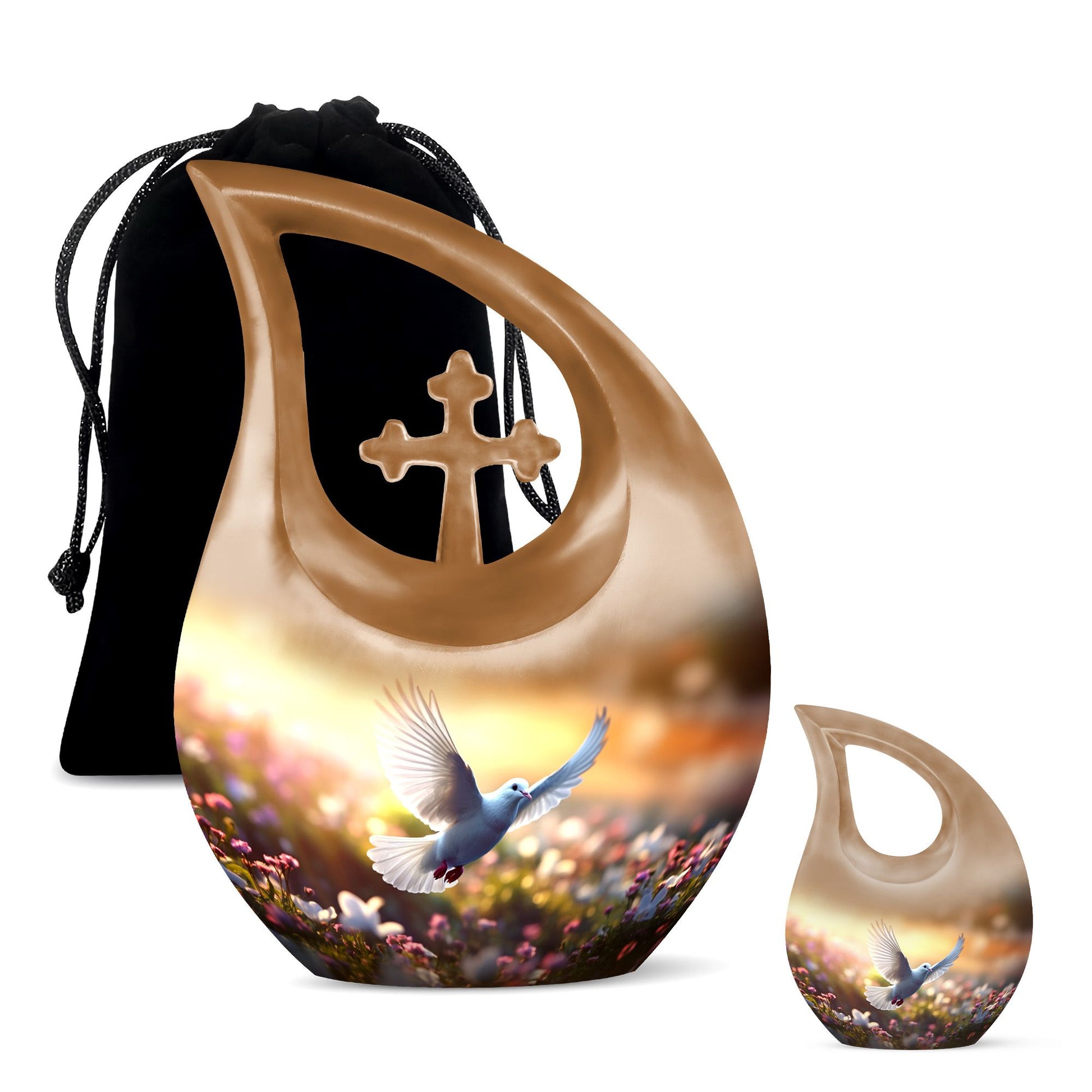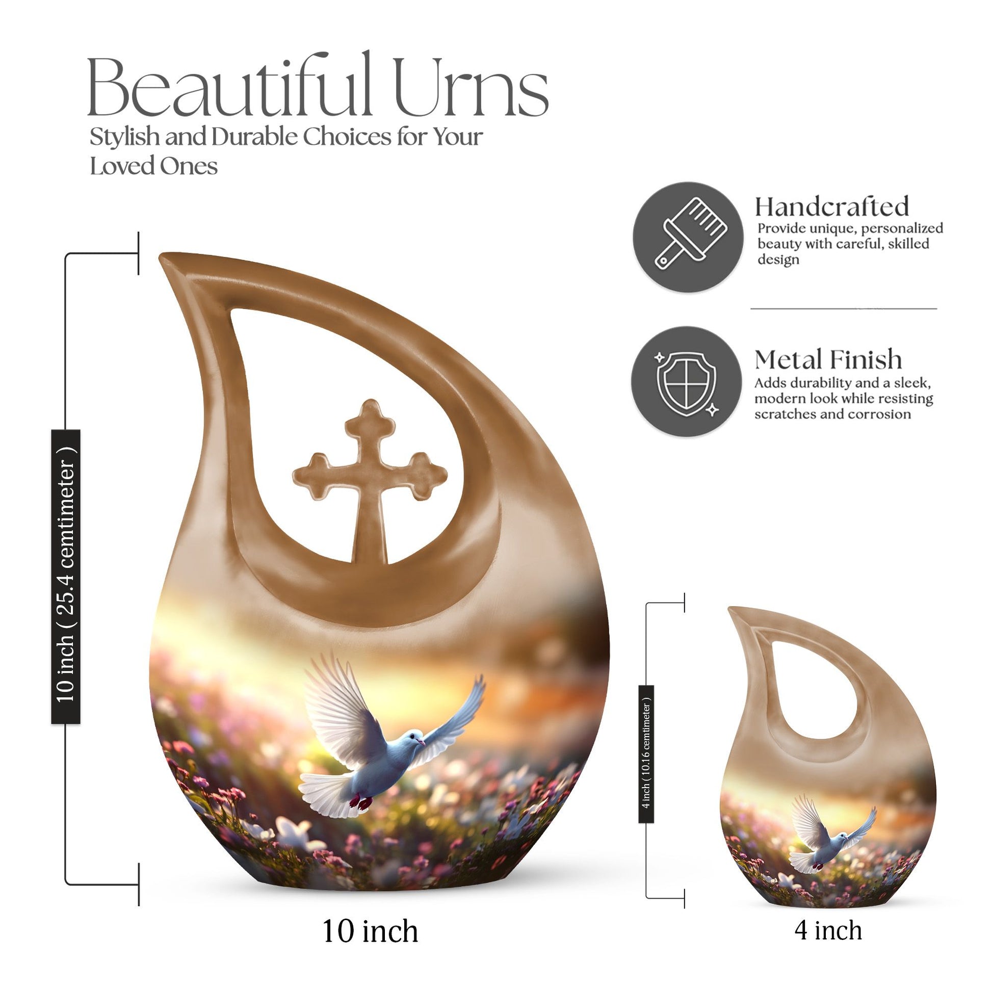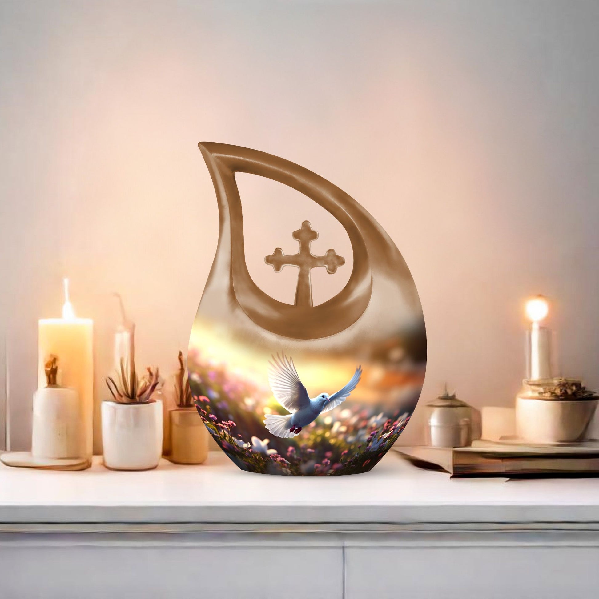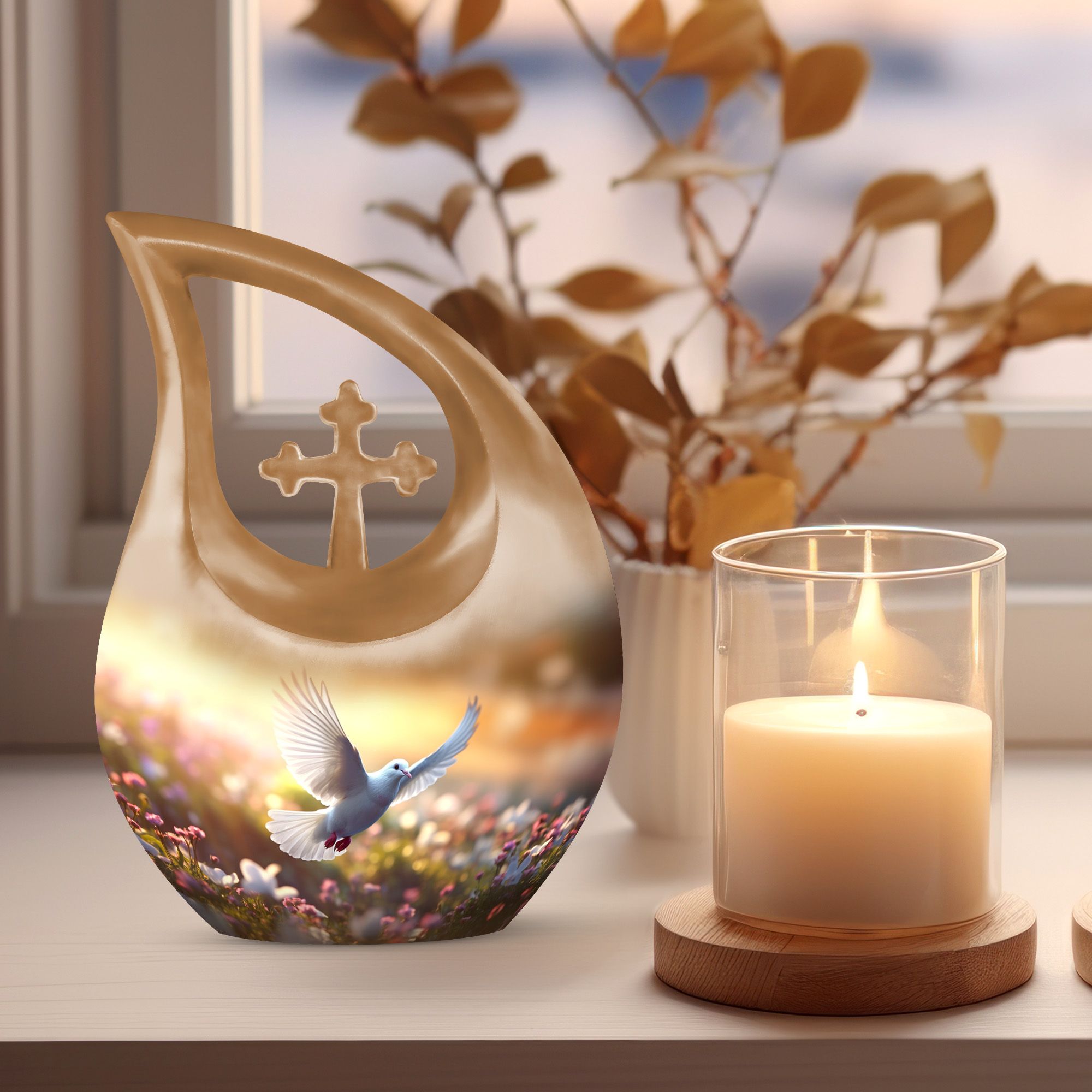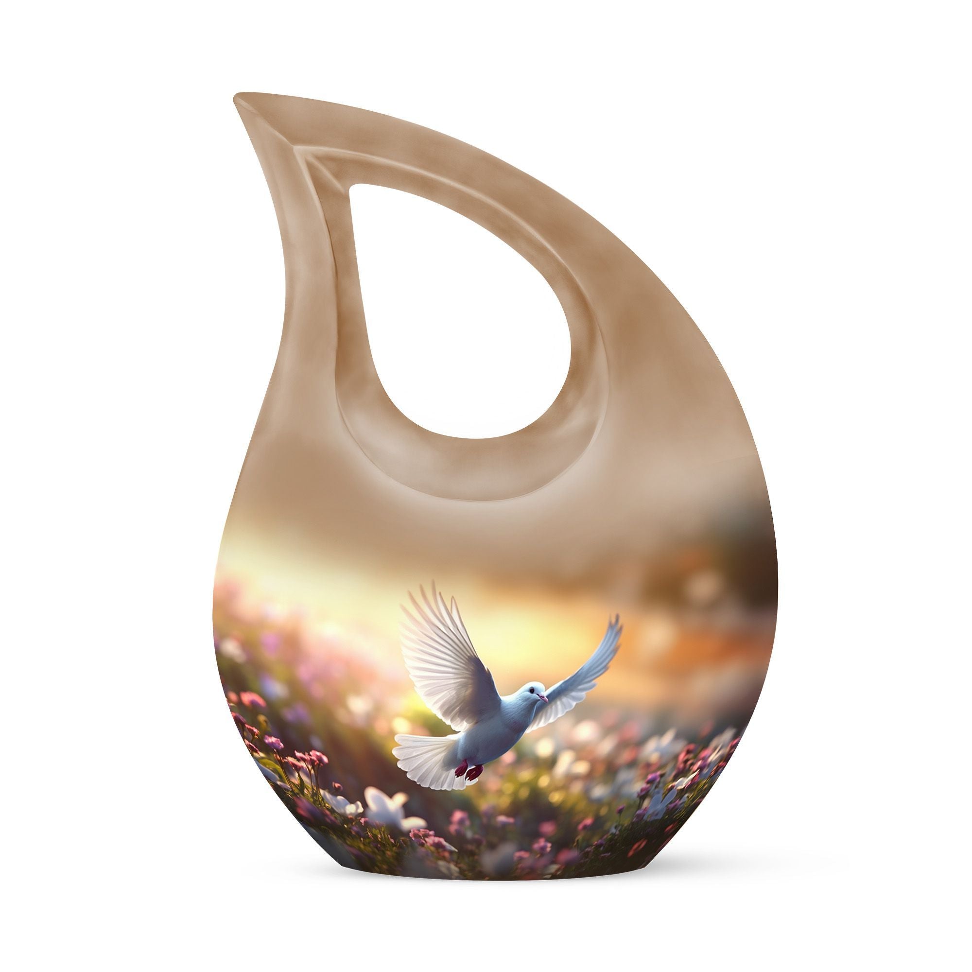The Dove Bird Memorial Urn for Funeral embodies serenity, love, and eternal peace. Featuring a white dove gracefully surrounded by floral engravings, this urn symbolizes the soul’s peaceful flight into eternity. Designed as both a keepsake urn for human ashes and memorial urn for human ashes keepsake, it offers a heartfelt way to honor and remember your loved one.