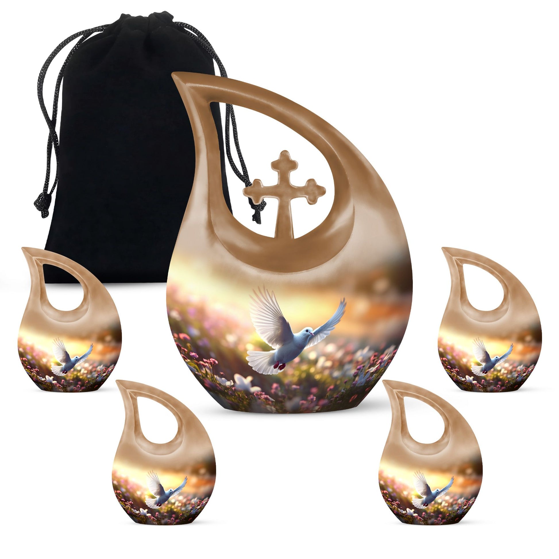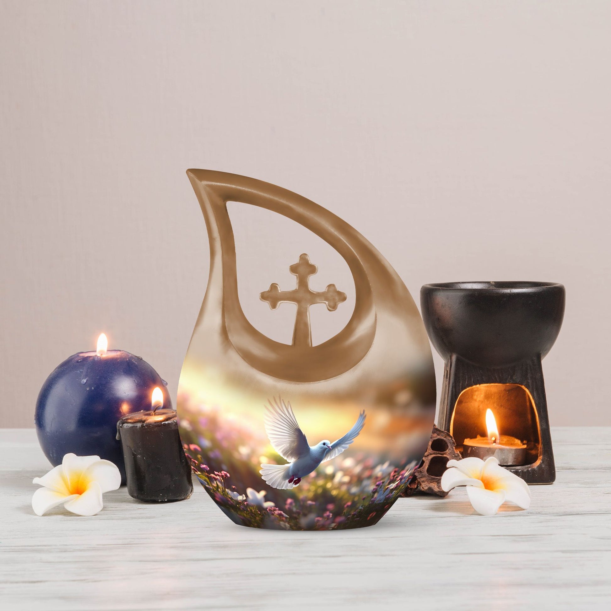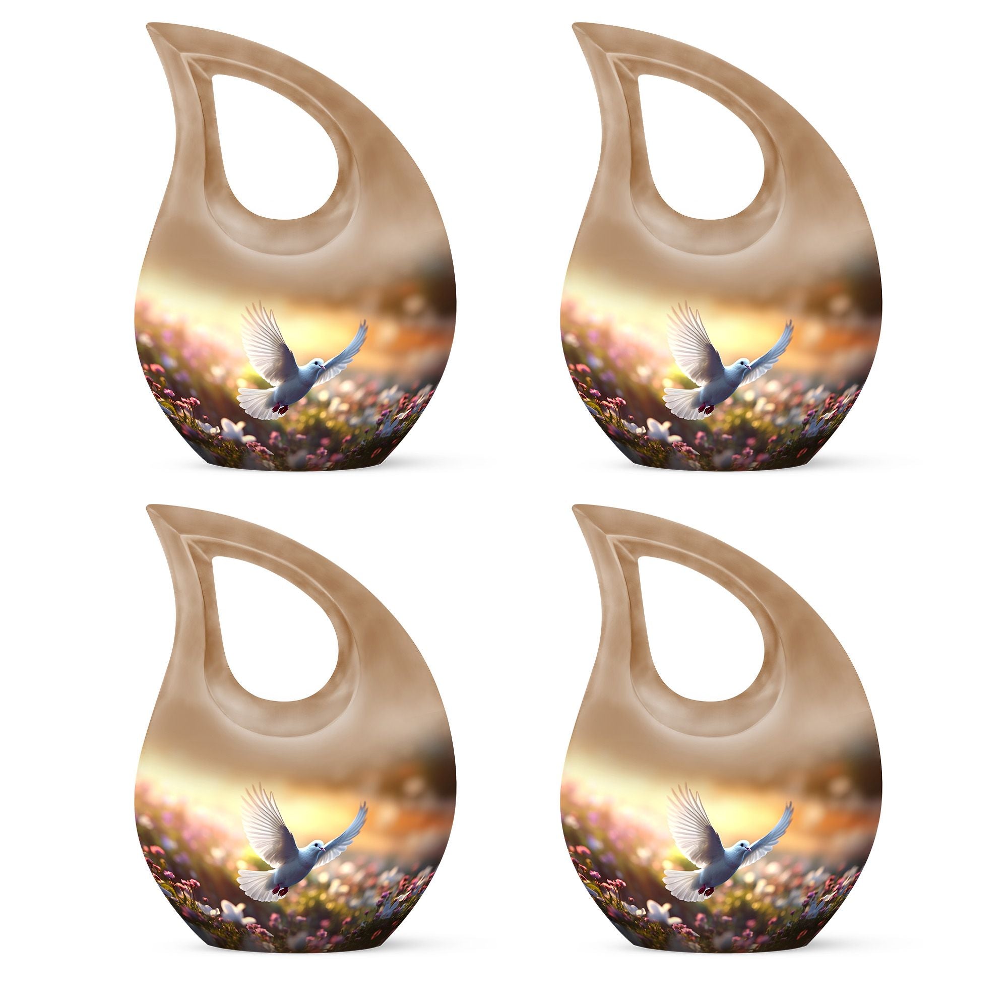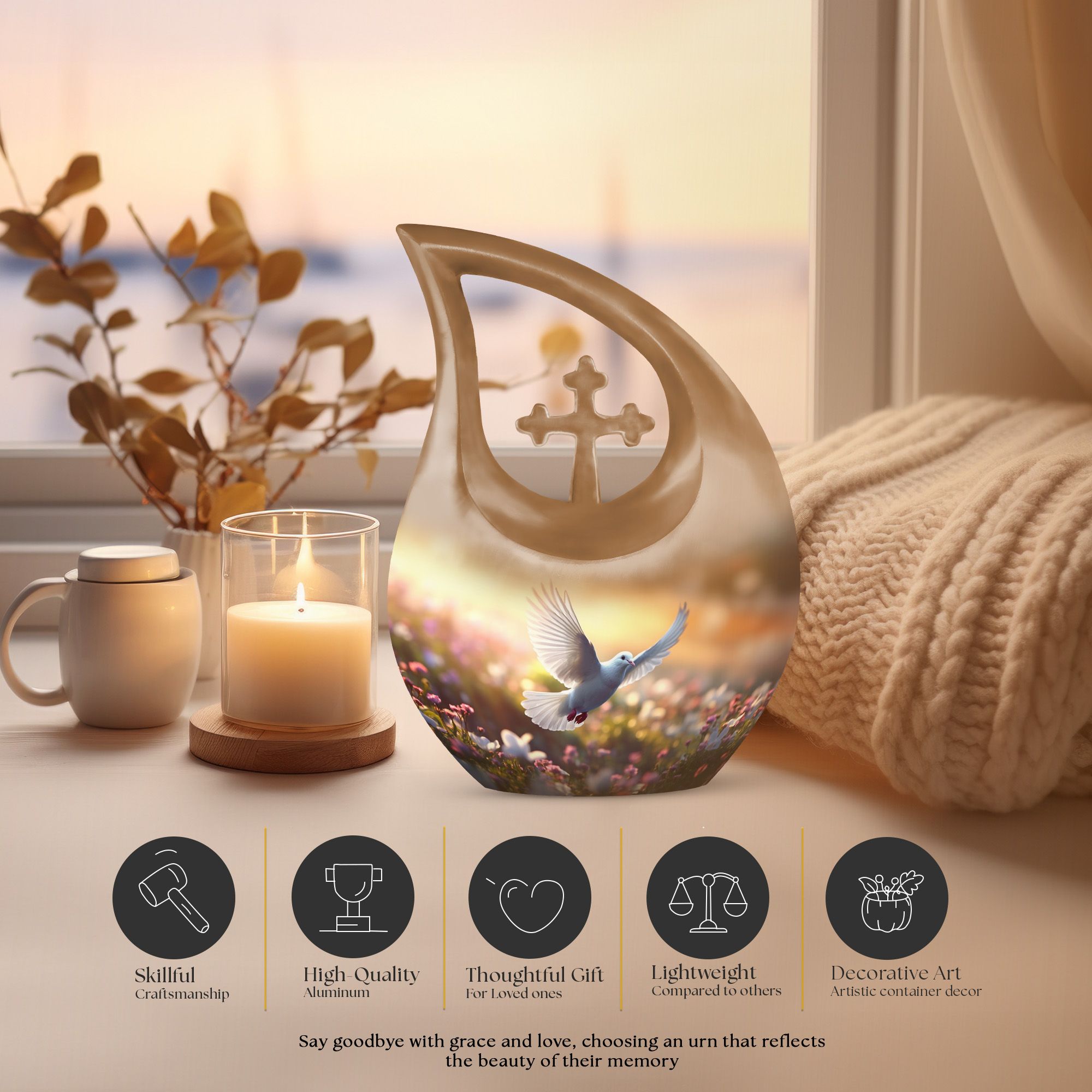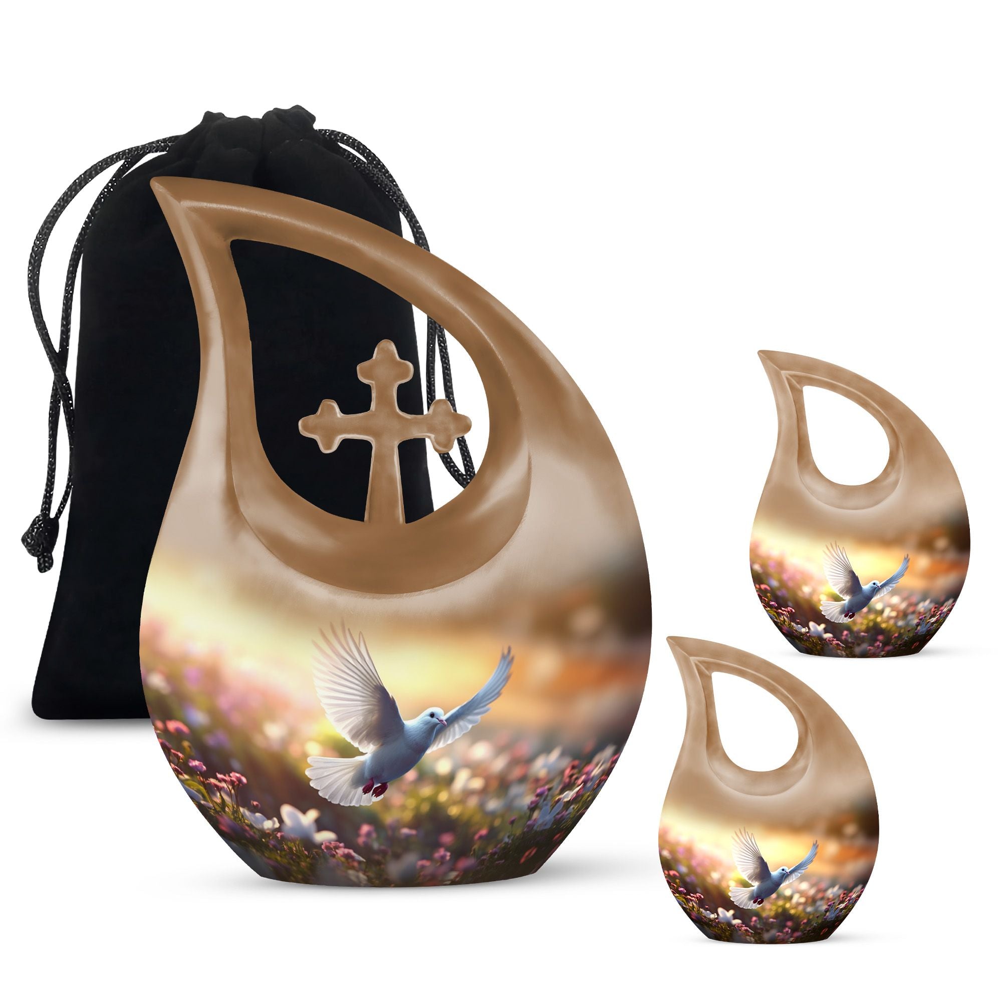 The Dove Bird Memorial Urn for Funeral embodies serenity, love, and eternal peace. Featuring a white dove gracefully surrounded by floral engravings, this urn symbolizes the soul’s peaceful flight into eternity. Designed as both a keepsake urn for human ashes and memorial urn for human ashes keepsake, it offers a heartfelt way to honor and remember your loved one.