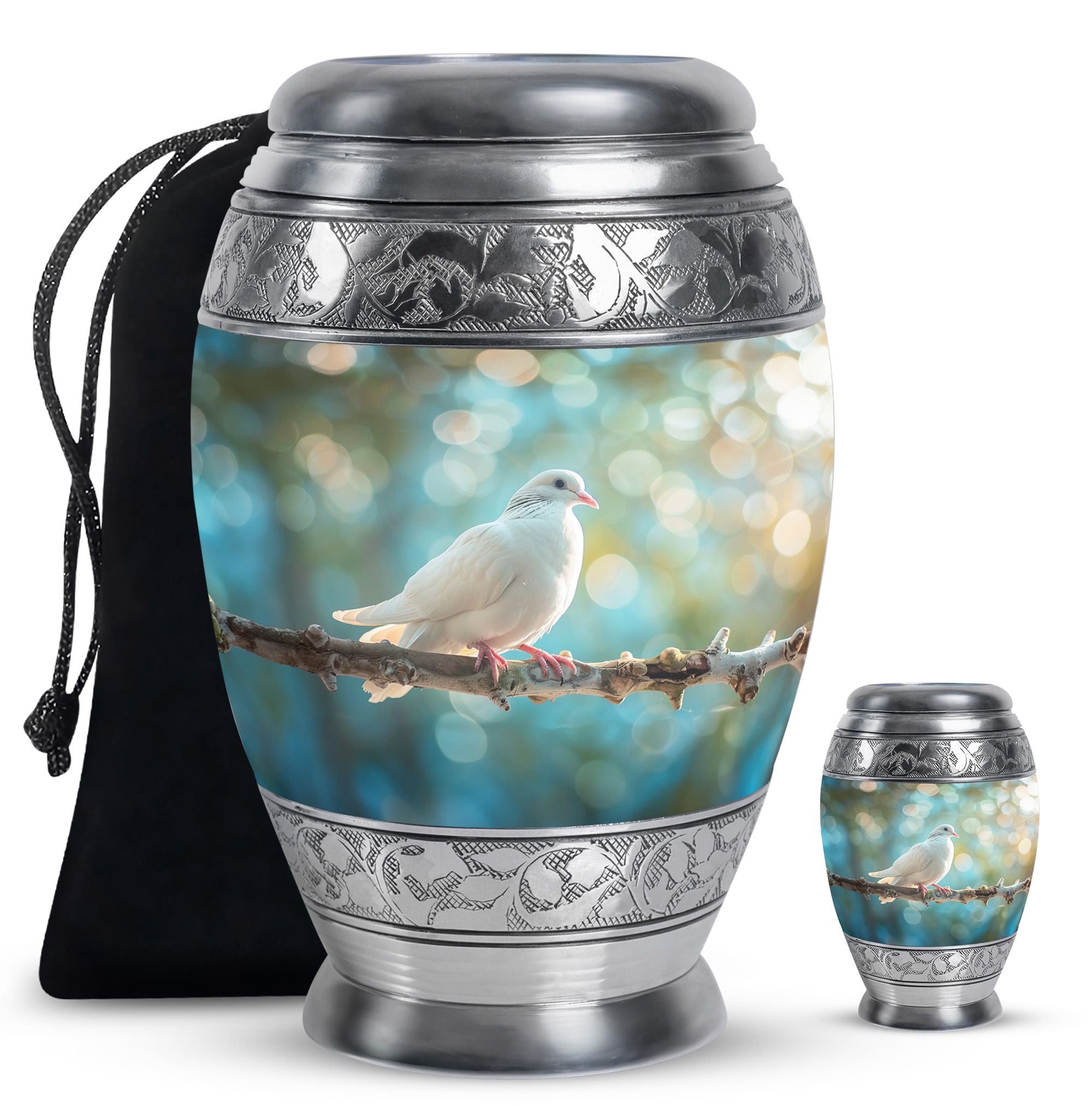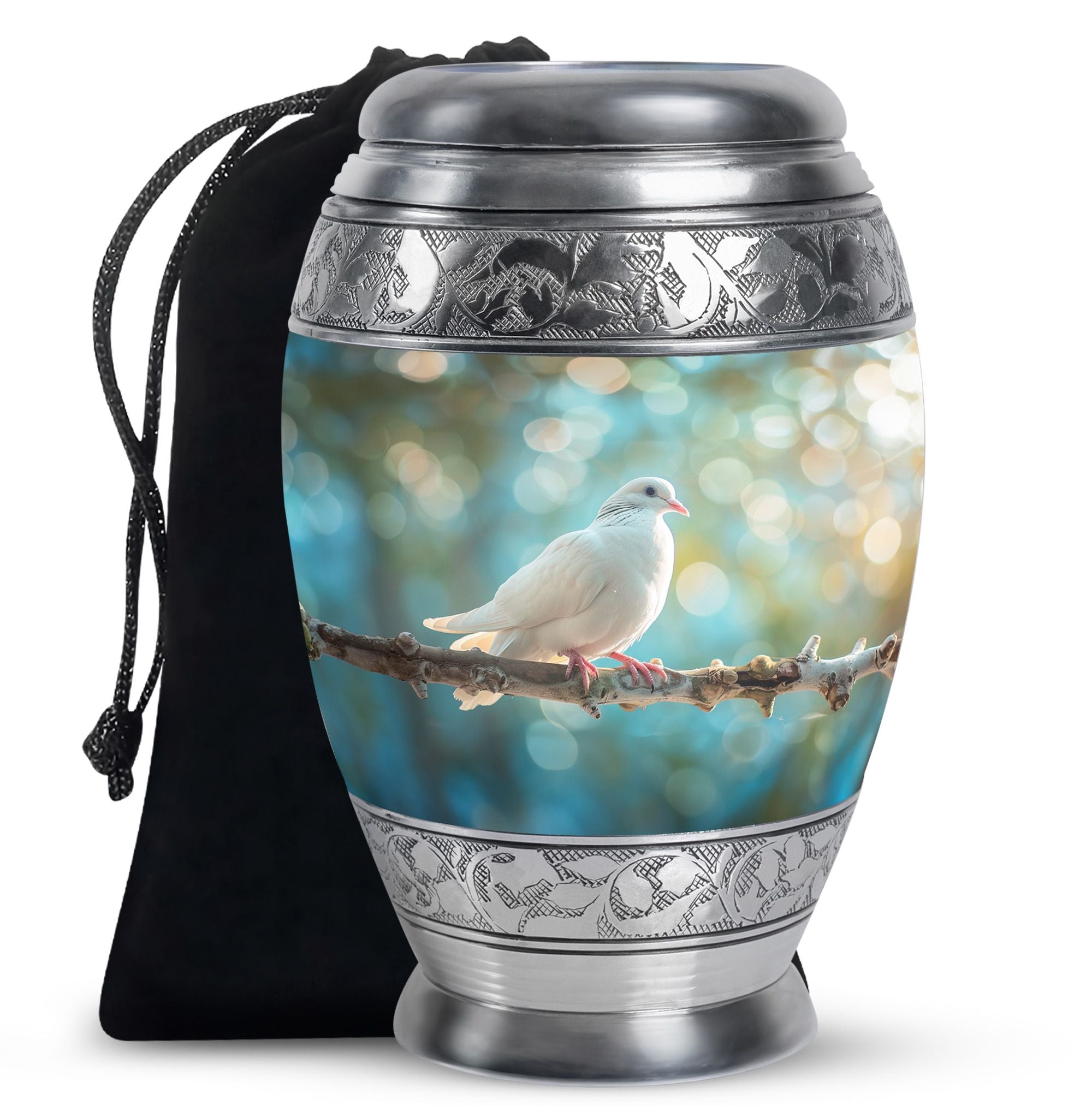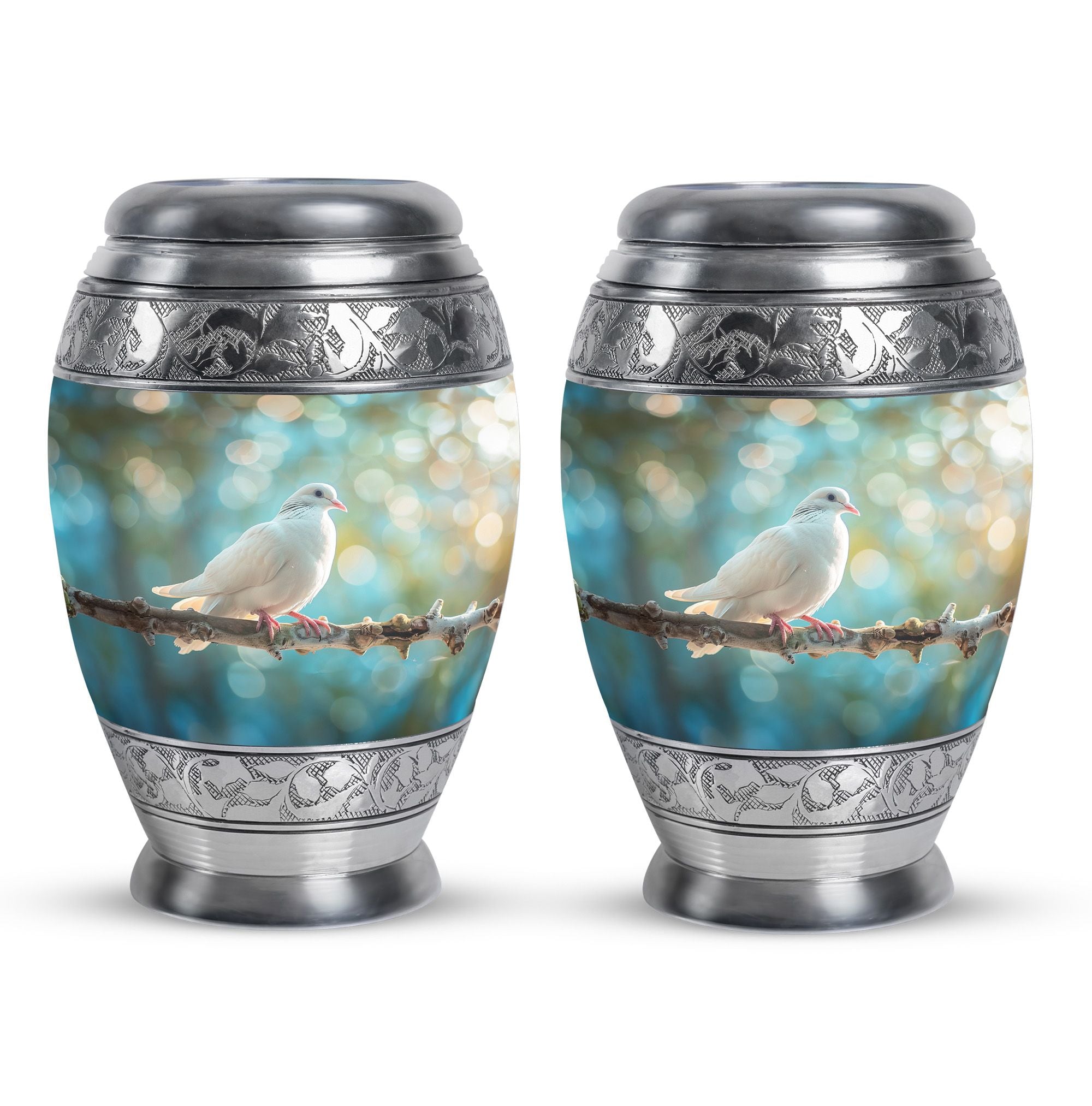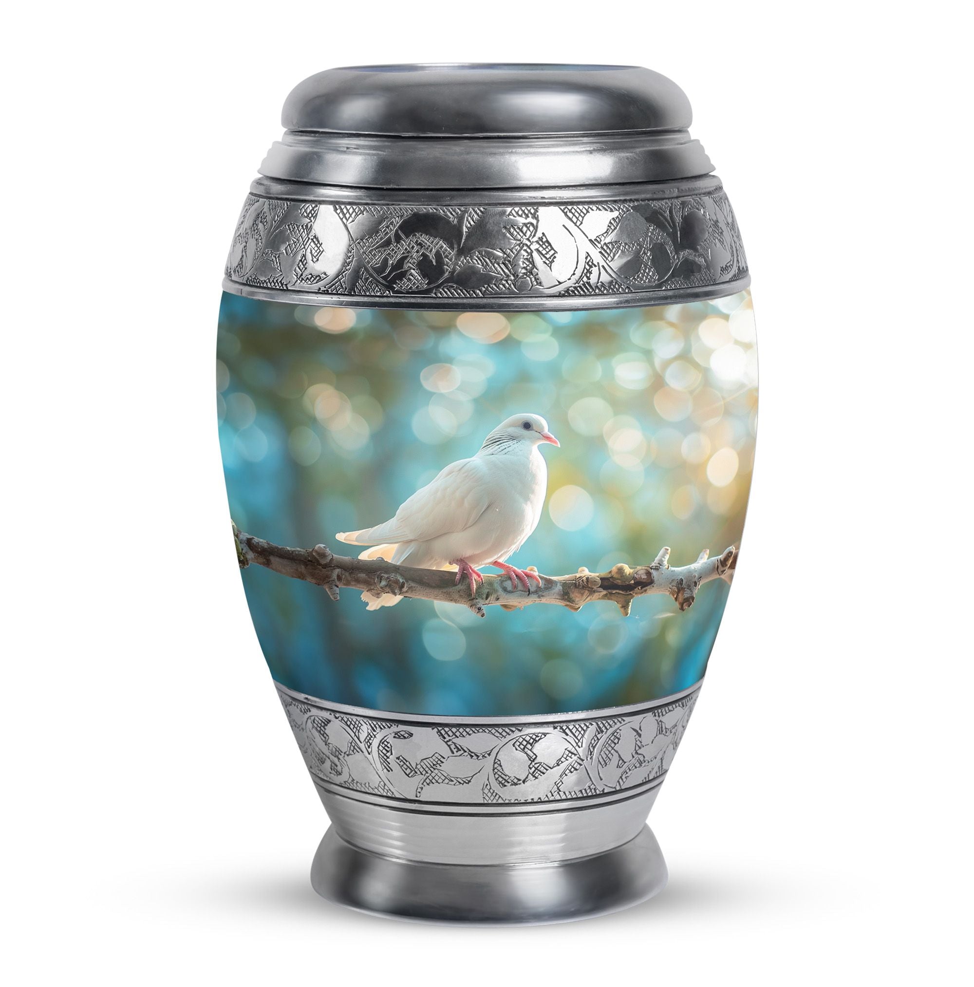 Crafted from durable aluminium, this metal urn combines elegance with lasting strength. Its secure screw-top lid and 10-inch height with 200-cubic-inch capacity make it suitable as a mini urns for ashes, perfect memorials urns, or perfect memorials cremation urns. The graceful white dove design embodies peace and remembrance, making it perfect for display in home memorials or graveside ceremonies, also doubling as keepsake cremation urns.