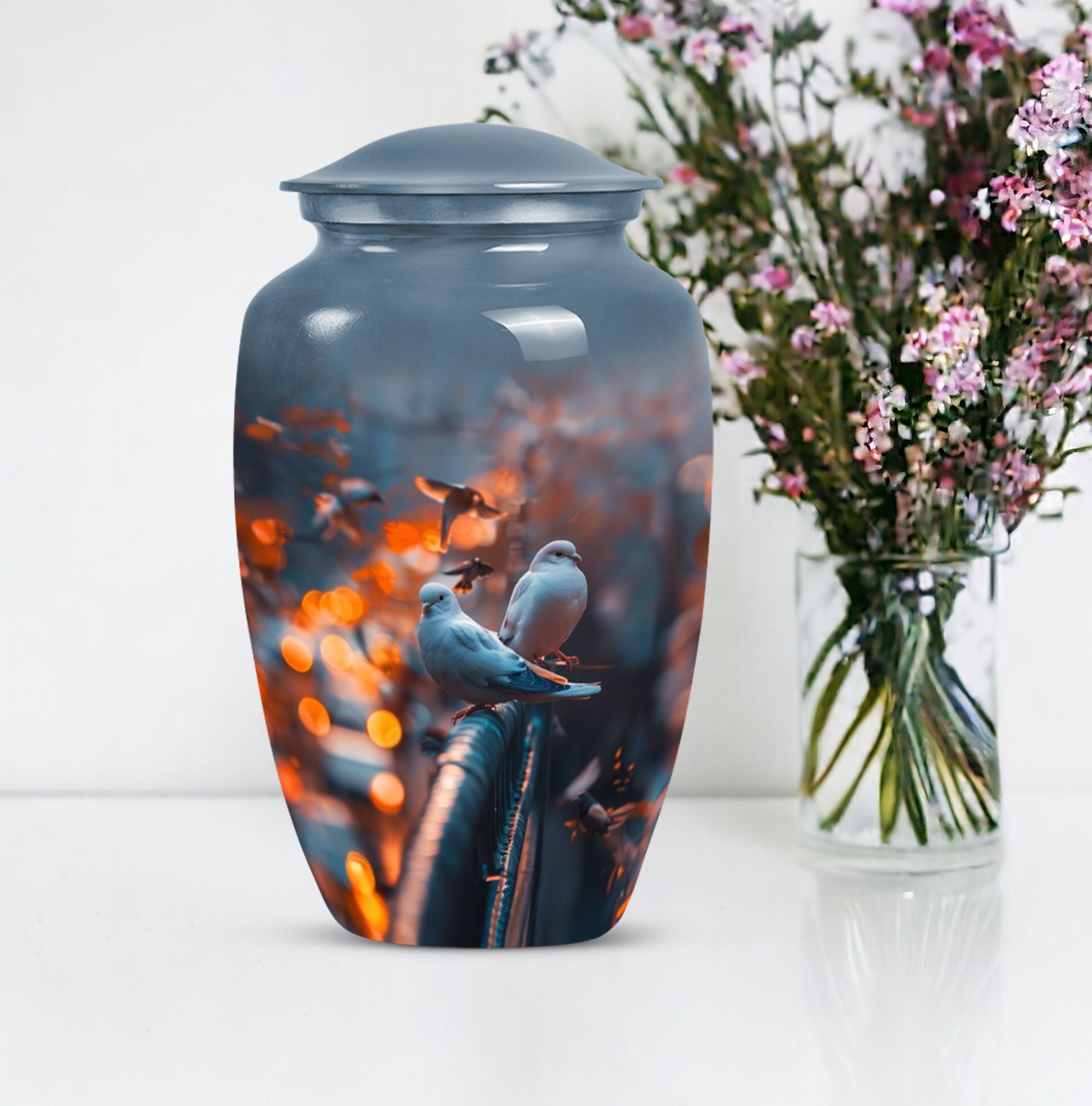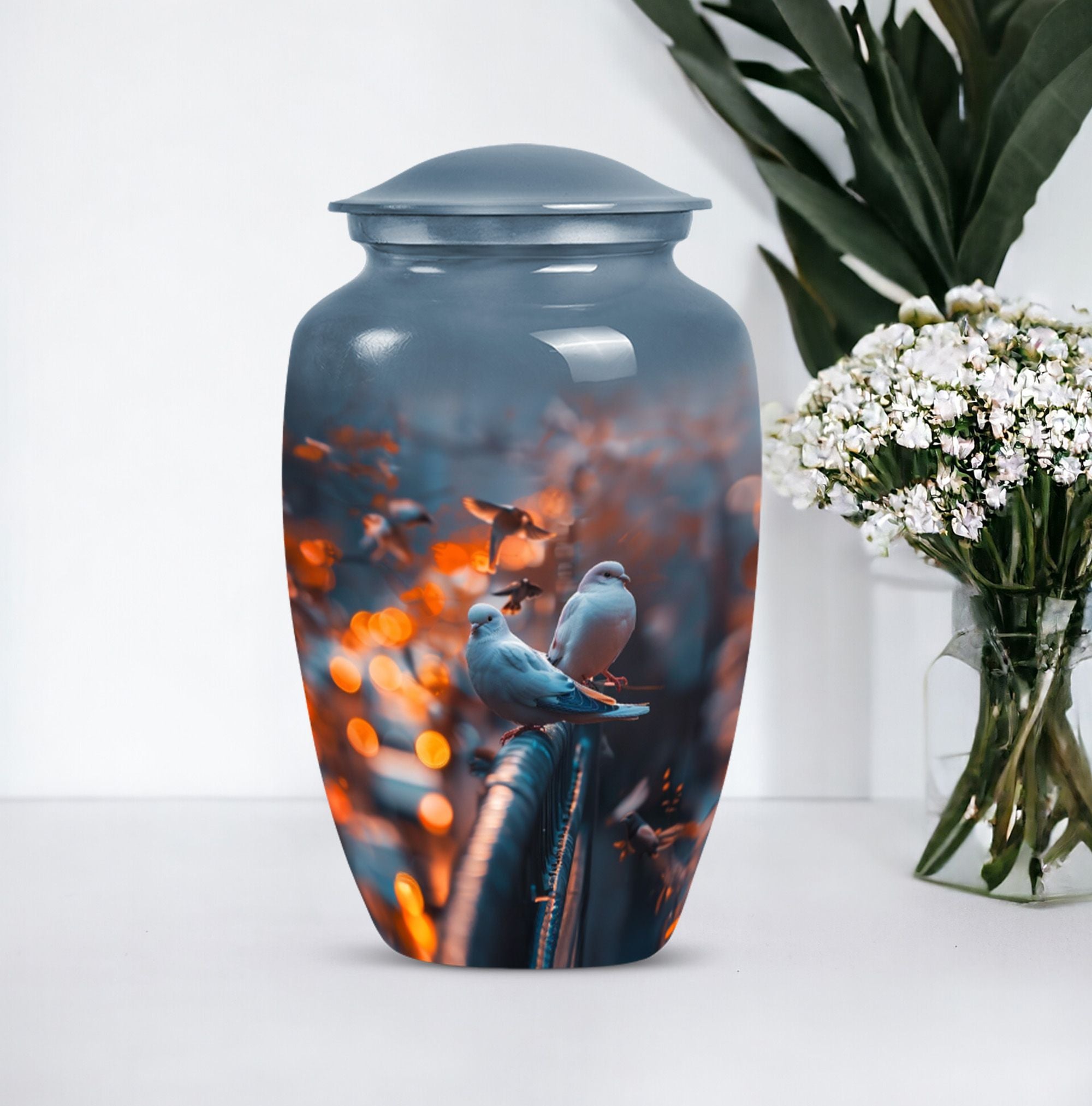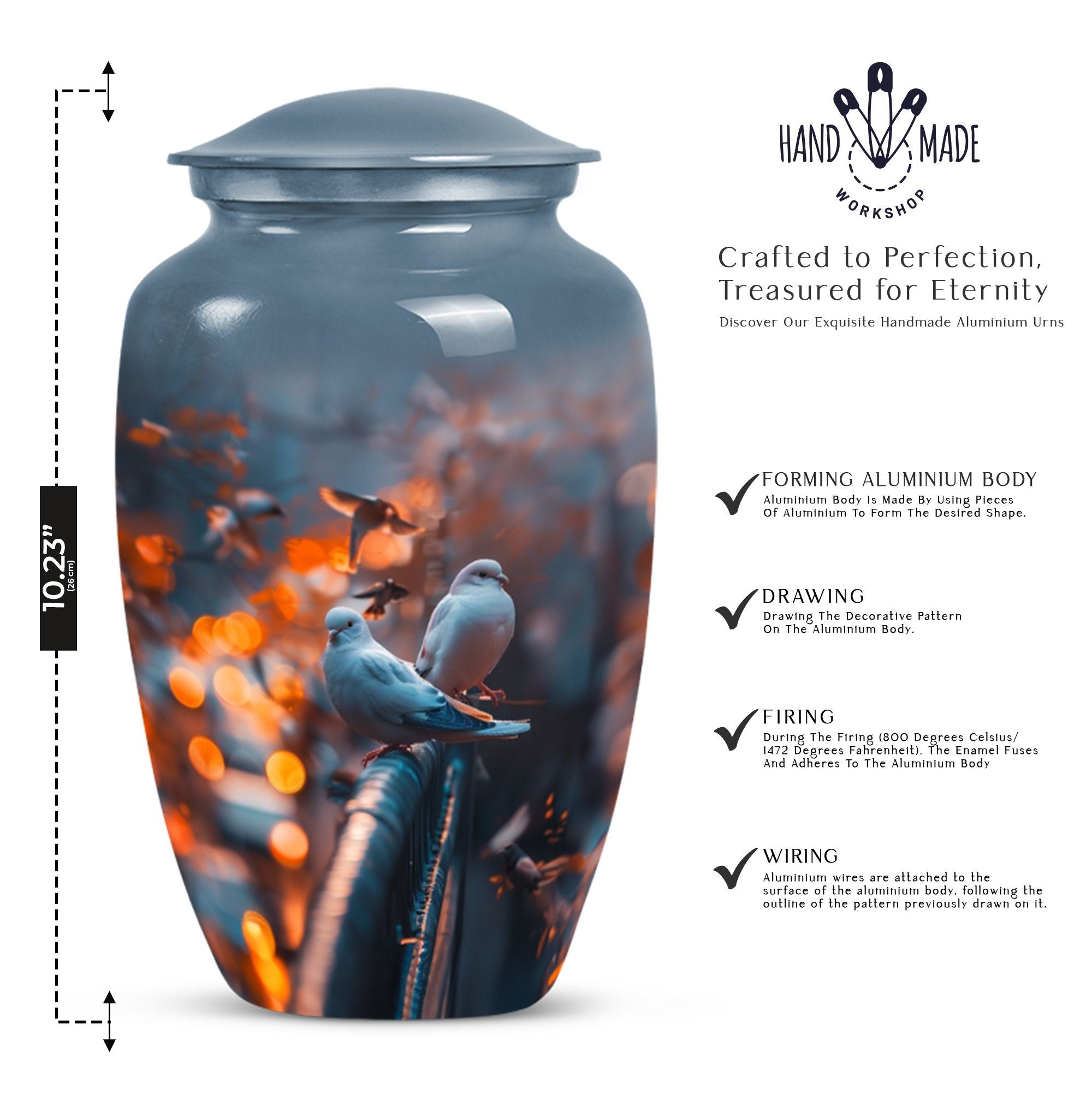 Experience the peace and tranquility that comes with the perfect memorial piece, a symbol of enduring love and spiritual solace. The 10 Inch Classic Urn is a magnificent testament to the beauty that lies within each farewell. Crafted from Aluminium, this large urn carries a significant weight of 3.3 pounds, bearing with it a palpable presence of the departed. Its timeless design is accentuated by the floral theme, adding an engaging element of charm and sanctity. This urn offers a capacity of 200 cubic inches, safeguarding those precious remains with reverence. The provision of personalization by engraving names makes this urn even more special, serving as the ideal remembrance for your cherished ones. Along with the urn, you will receive a velvet pouch for the sacred containment of ashes. This cremation urn, commonly referred to as a 'dove urn' or 'memorial forever urn', is fitting for adults and seniors appealing to both their faith and aesthetic sensibility. It is an excellent choice for those searching for funeral urns for human ashes adult or urns metal. This exquisitely designed human cremation urn helps to ensure that memories live on and love stays unending.